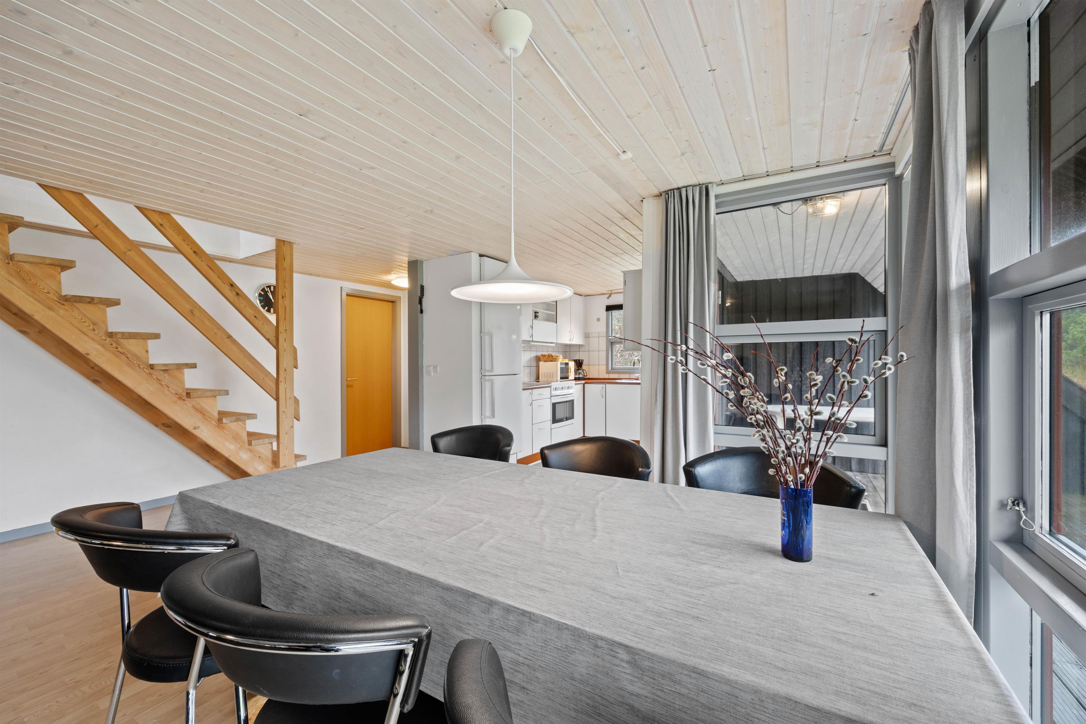 I sommerhusets stueplan finder I alrummet, hvor stue, køkken og spiseplads ligger samlet i ét. Her kan hele familien samles til hyggelige stunder, og selv når der skal laves mad, kan kokken i familien følge med i samtalen grundet den åbne planløsning.