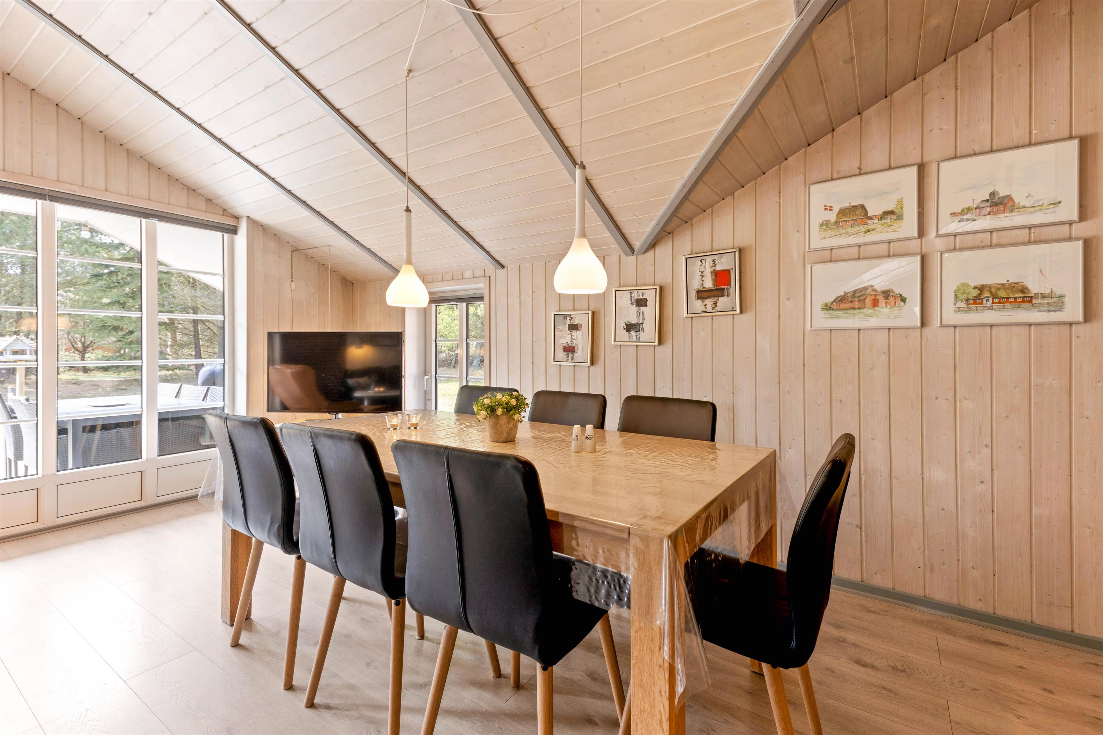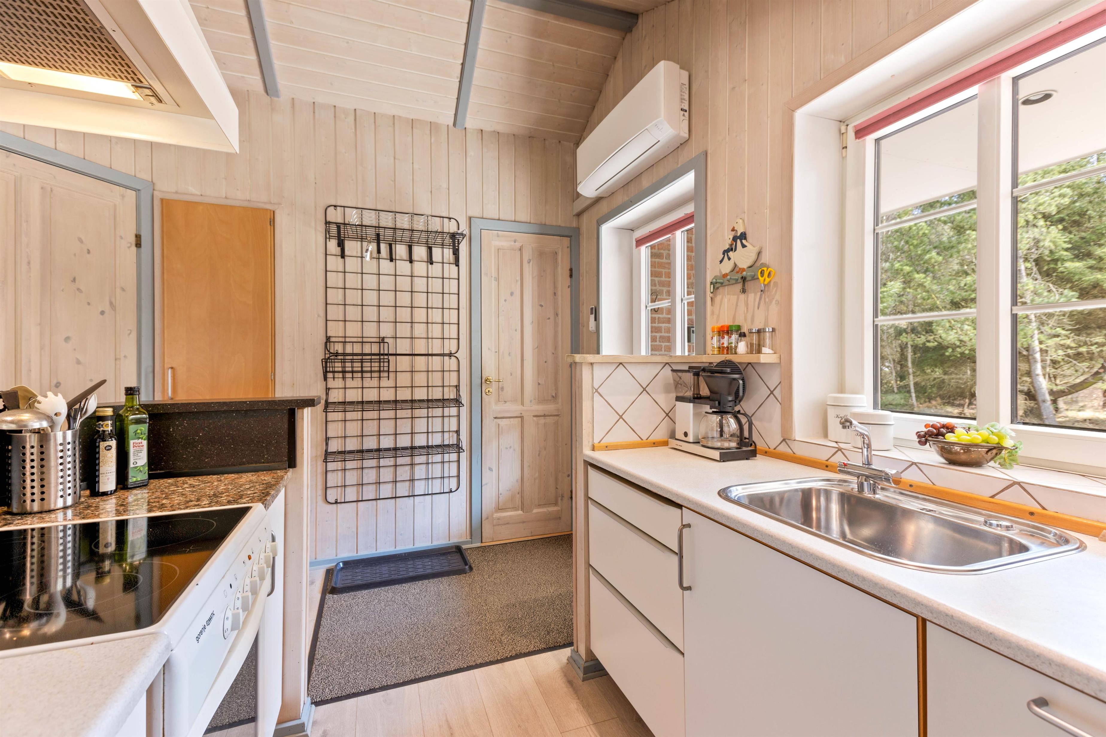 Sommerhusets køkken og spiseplads ligger i åben forbindelse med stuen, hvor der er en hyggelig brændeovn, der sætter prikken over i'et til feriestemningen. Her kan I samles til et spil kort, inden sengen kalder. Desuden er der en energibesparende varmepumpe i sommerhuset, som I med fordel kan benytte.