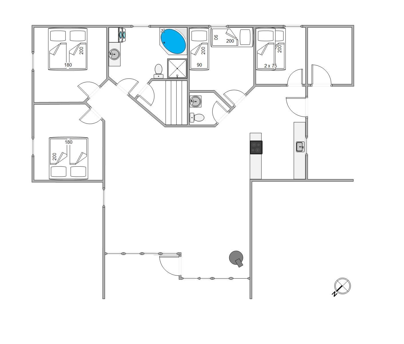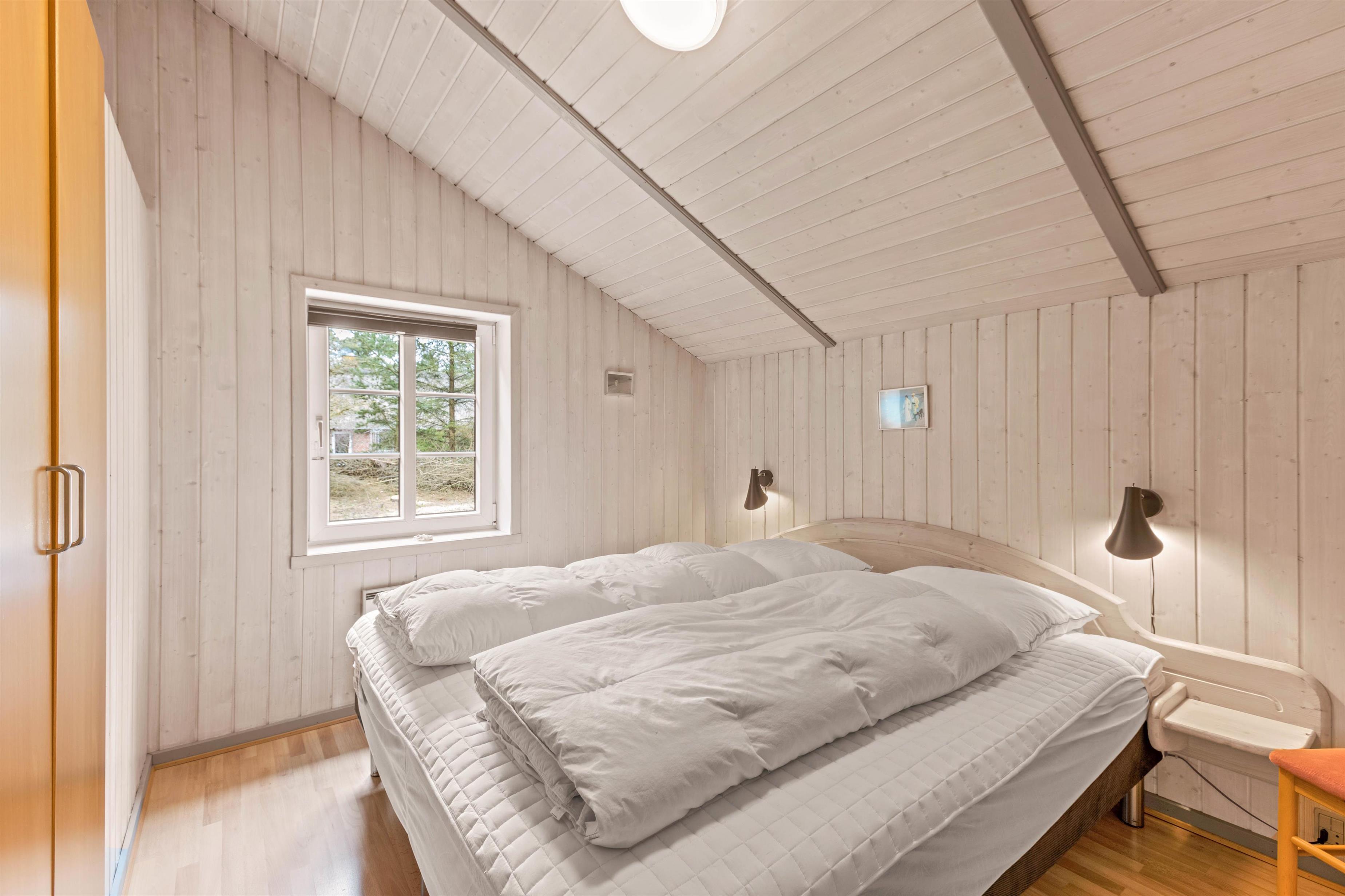 Sommerhuset til 8 personer er praktisk indrettet med 4 gode soveværelser, 1 badeværelse samt 1 gæstetoilet. I 2 af sommerhusets soveværelser finder I dobbeltsenge, mens der i det tredje soveværelse er 2 enkeltsenge. I det sidste soveværelse er der en køjeseng, som børnene uden tvivl vil elske.
