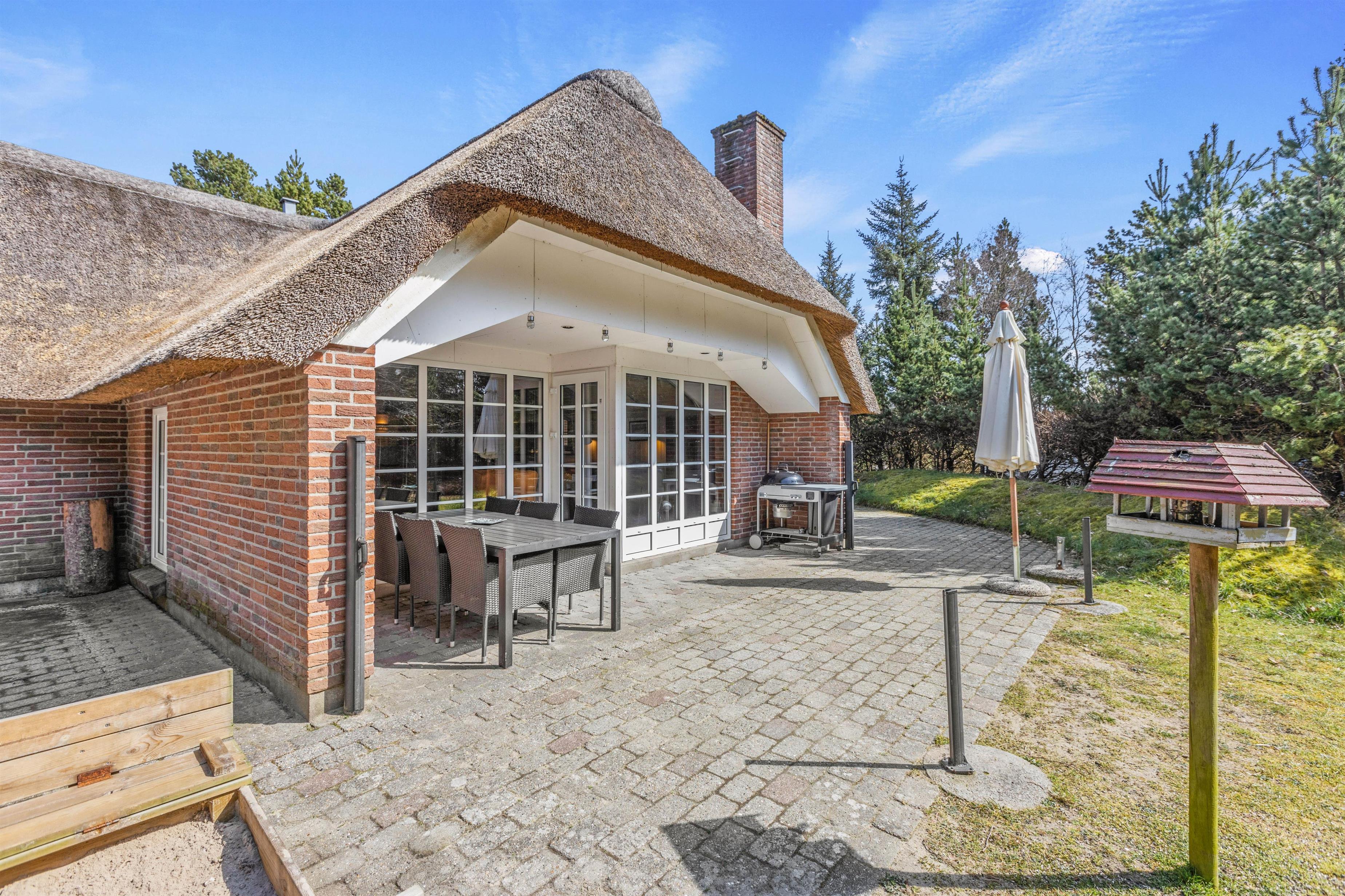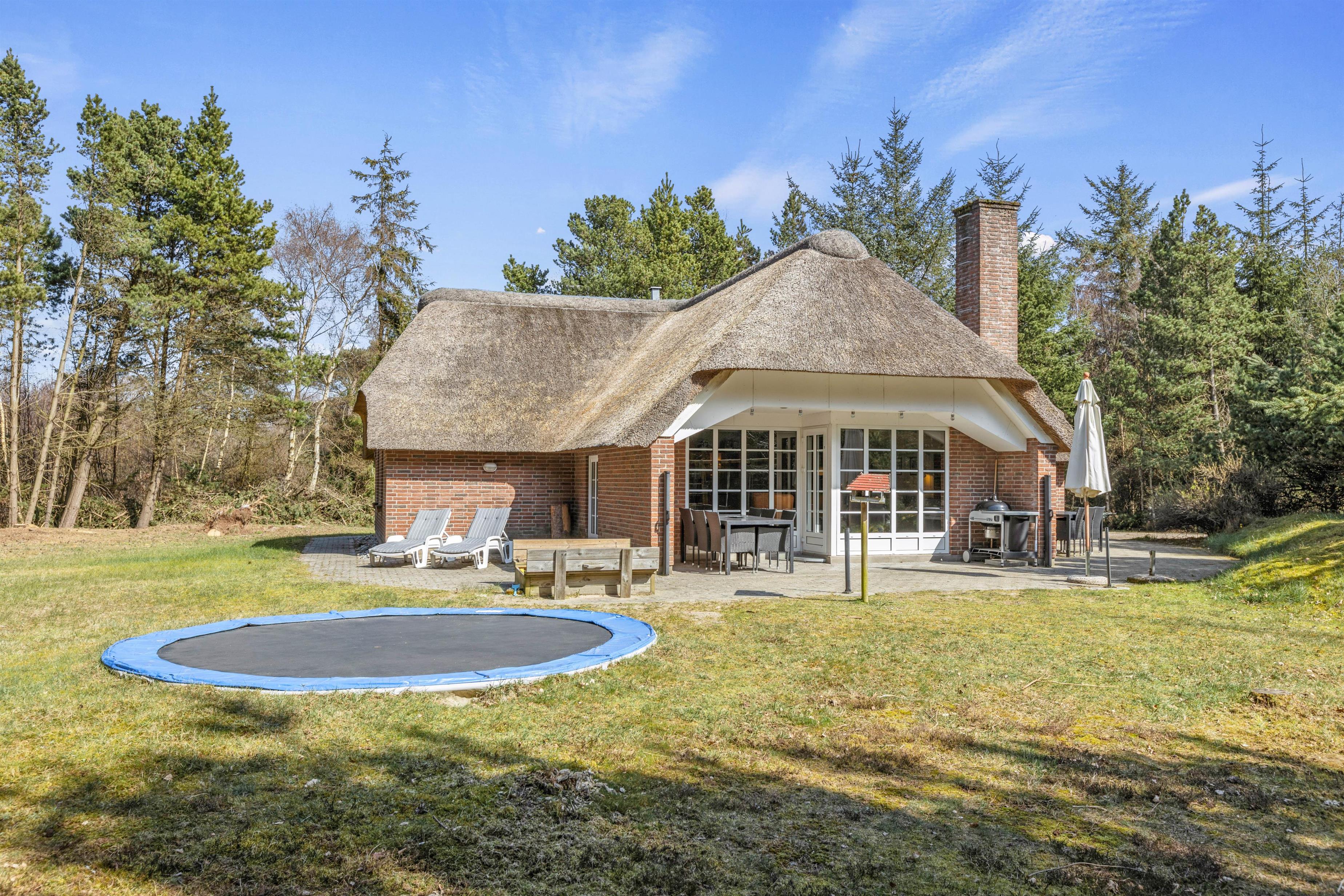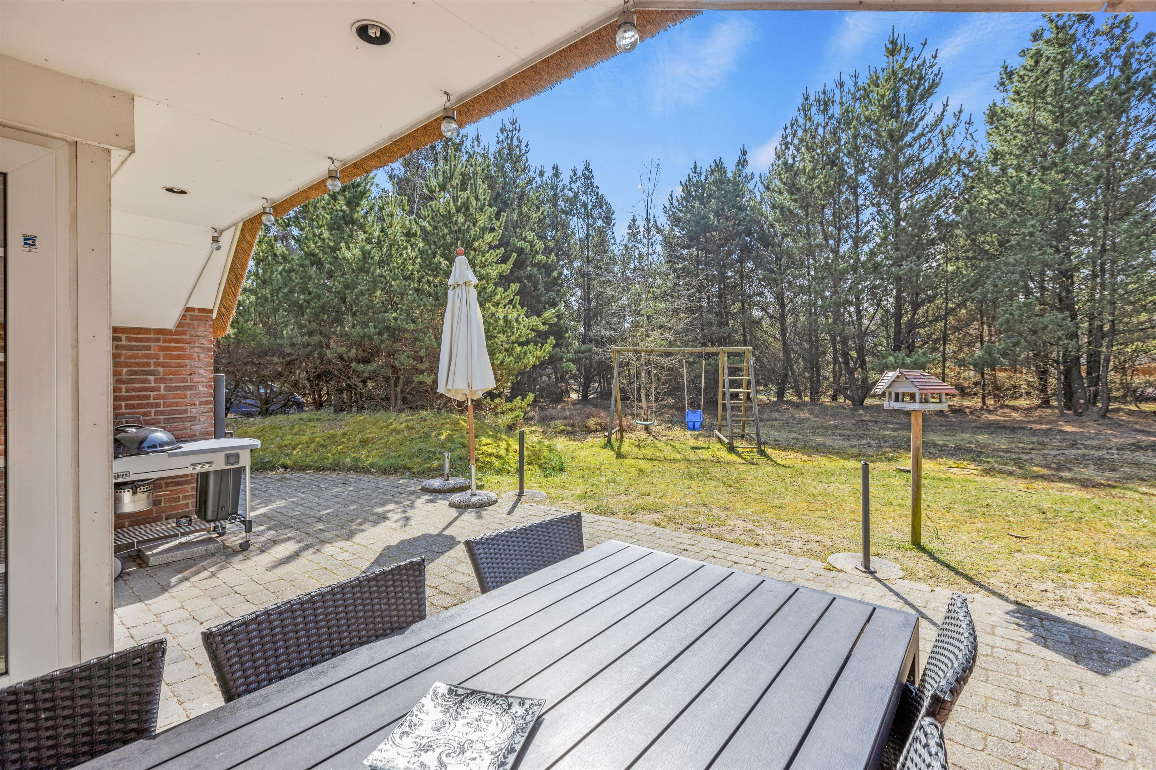 Rundt om feriehuset har I flere gode terrasser, så I kan sætte jer, hvor vejret er bedst. Her kan I nyde eftermiddagskaffen eller et godt glas vin, mens børnene leger på naturgrunden. Der er både sandkasse, gyngestativ og trampolin, så de har masser af mulighed for at underholde sig selv med sjov og leg.