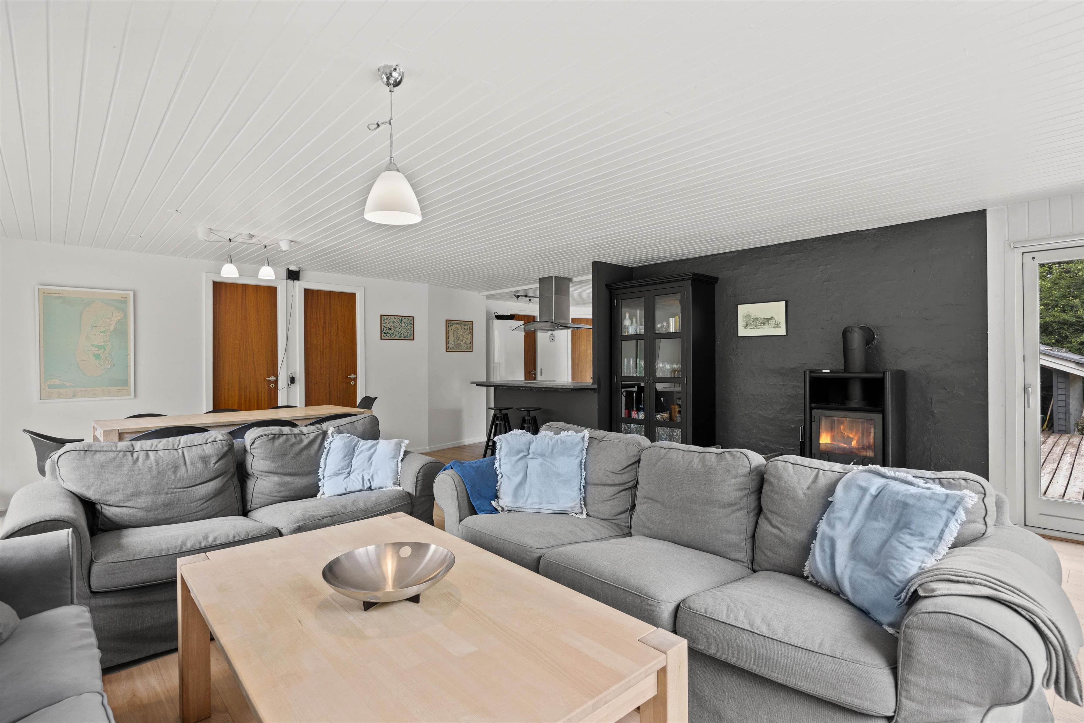 Den hyggelige opholdsstue er udstyret med brændeovn, tv og stereoanlæg.