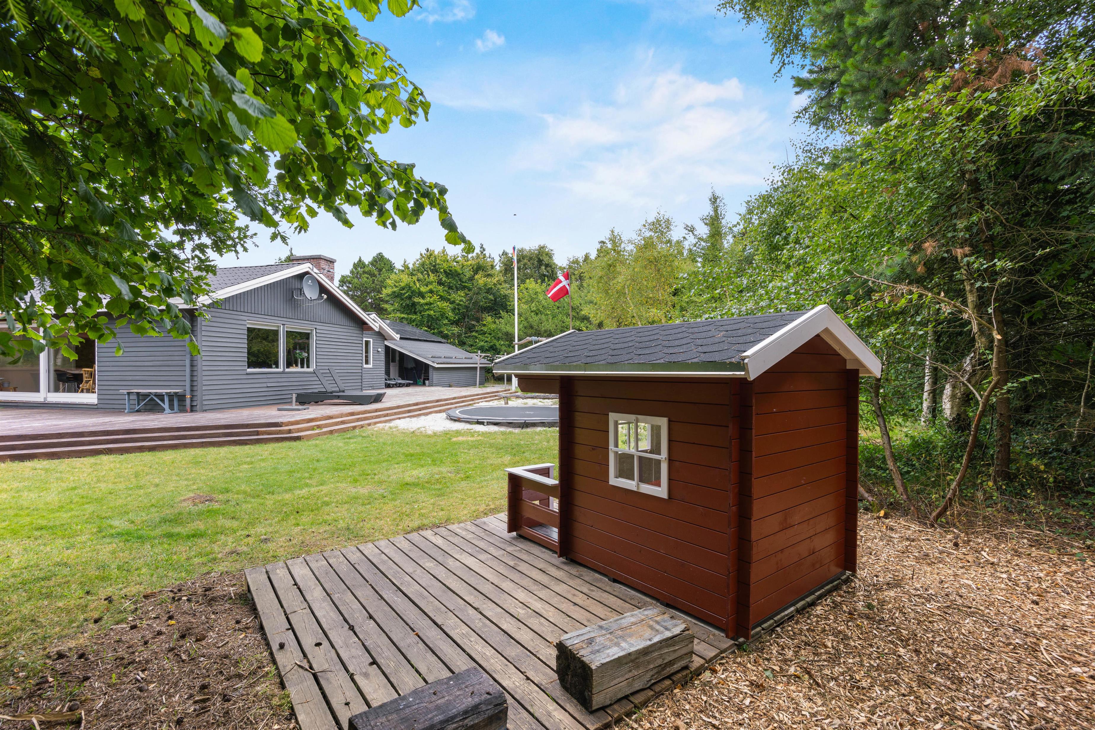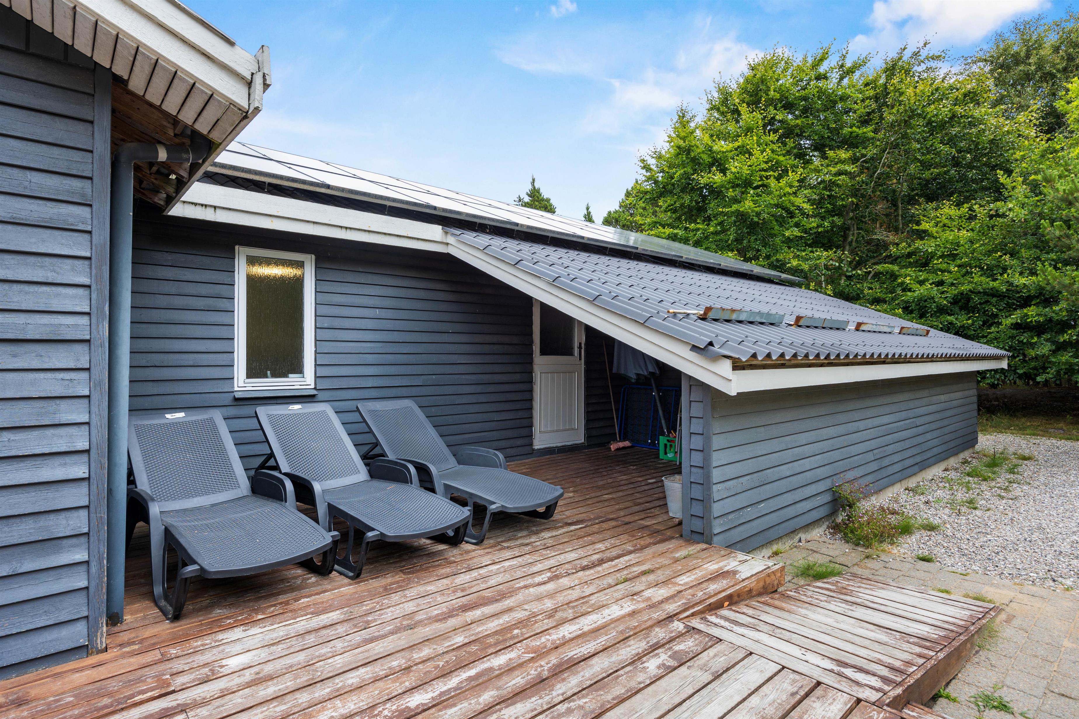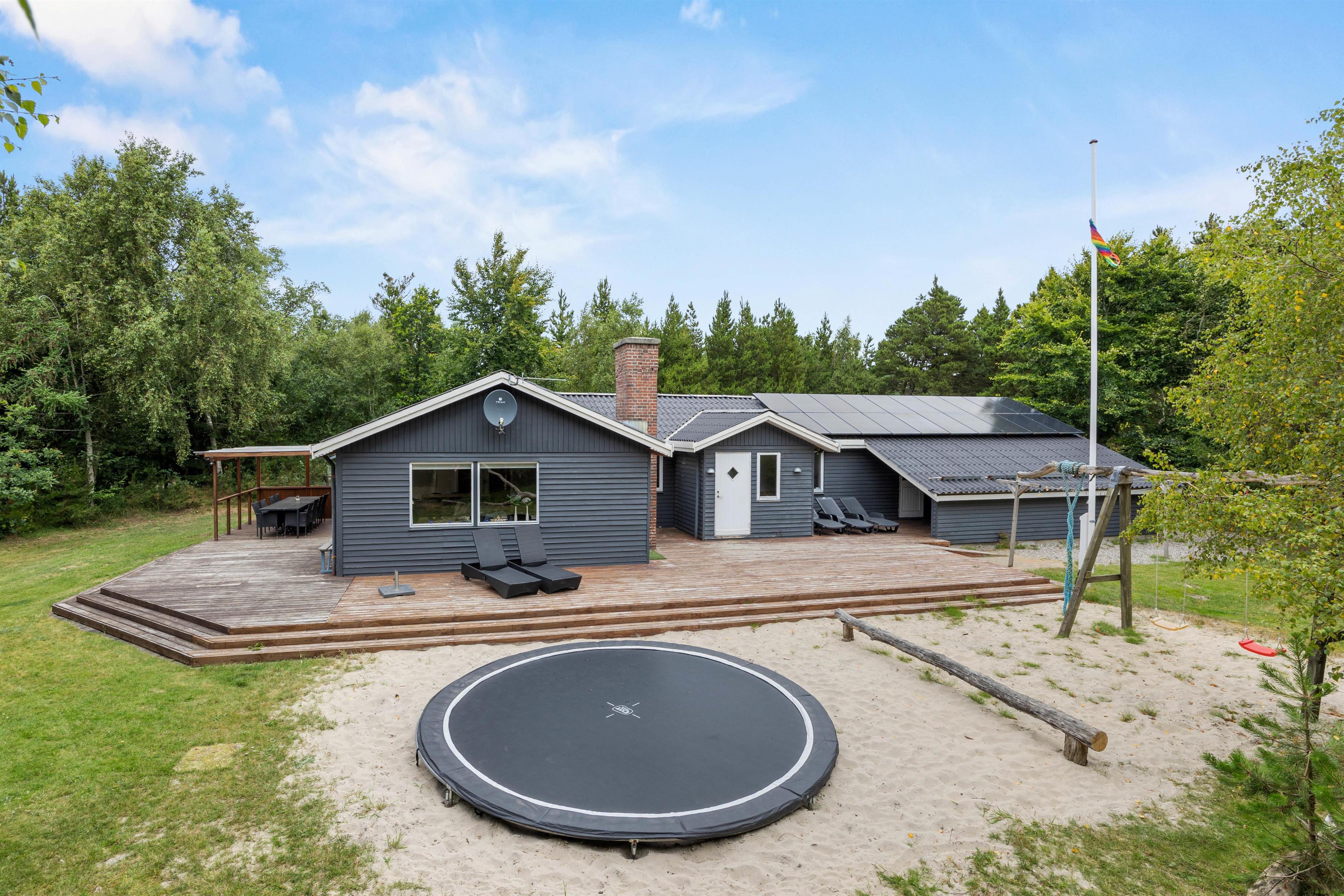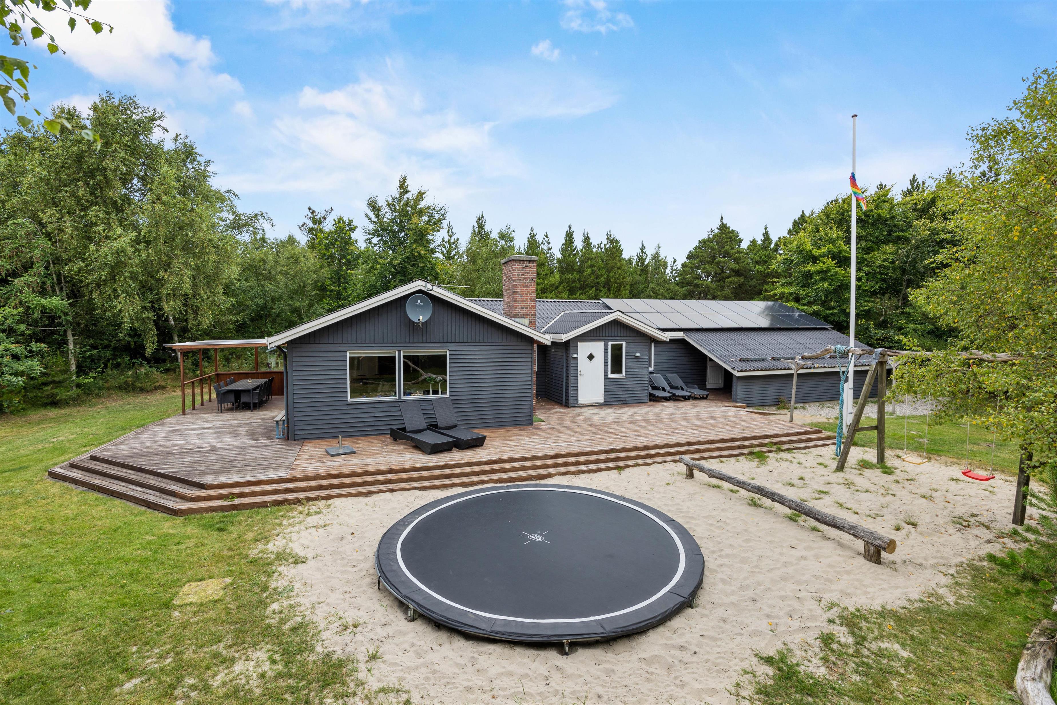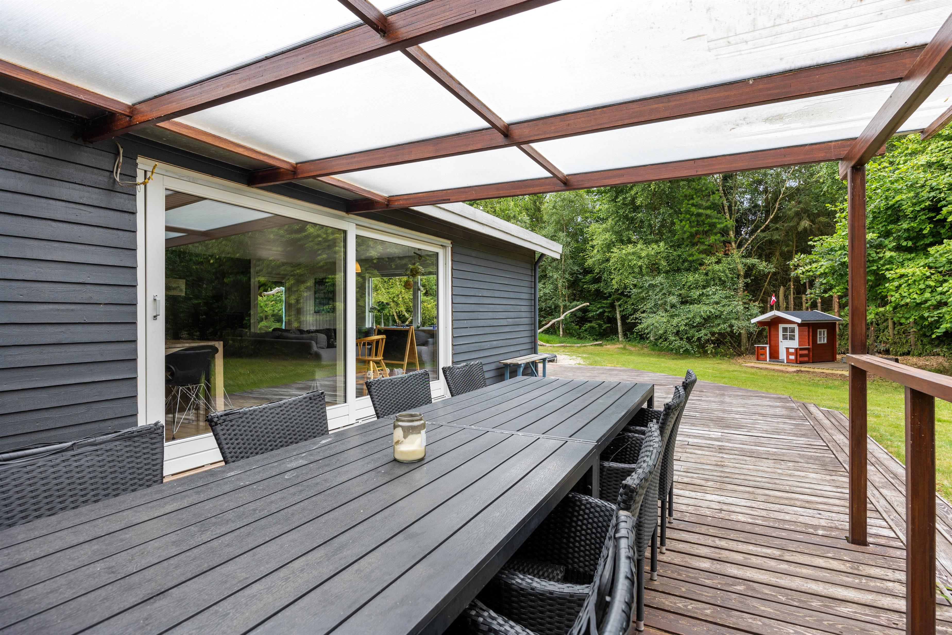 Huset ligger ugenert på en naturgrund som inviterer til mange timer i det frie i den rolige natur. Den store terrasse giver dig mulighed for at nyde den storslåede udsigt og den friske luft, mens du slapper af i de komfortable havemøbler.