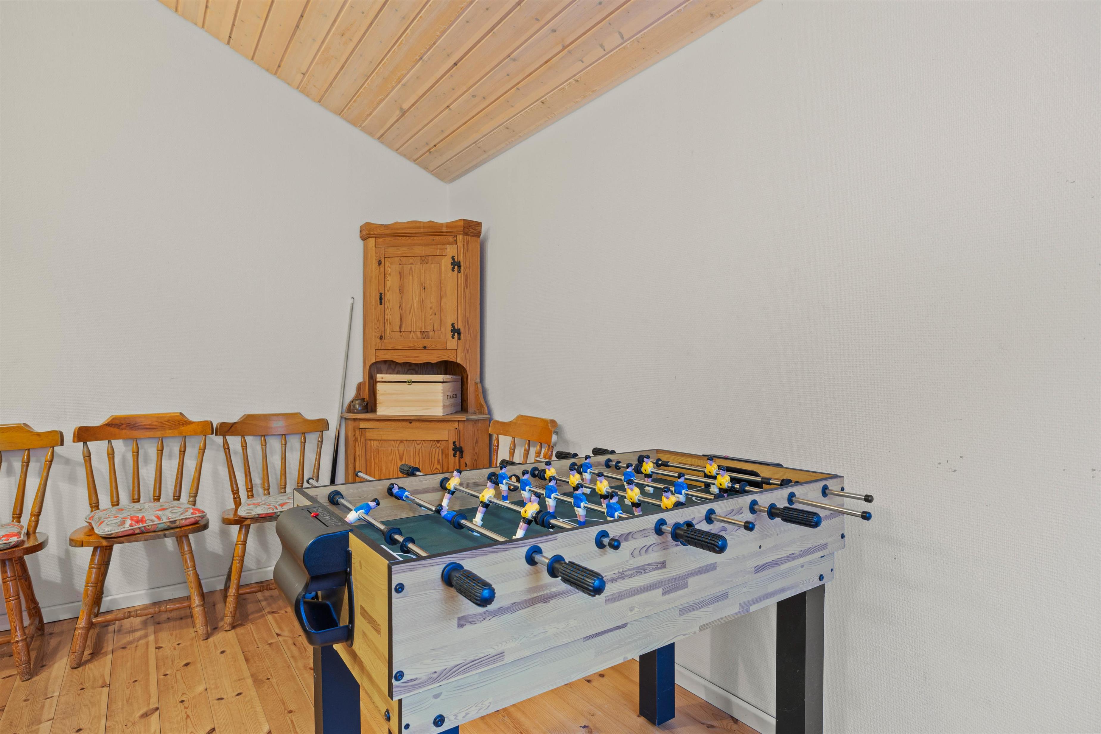 I huset er der fokus på aktiviteter og afslapning. Der er et aktivitetsrum med både billard og bordfodbold, hvor du kan udfordre dine venner og familie til sjove turneringer. Hvis du foretrækker at slappe af og forkæle dig selv, kan du tage en tur i saunaen eller spaen, der vil give dig den ultimative velvære.