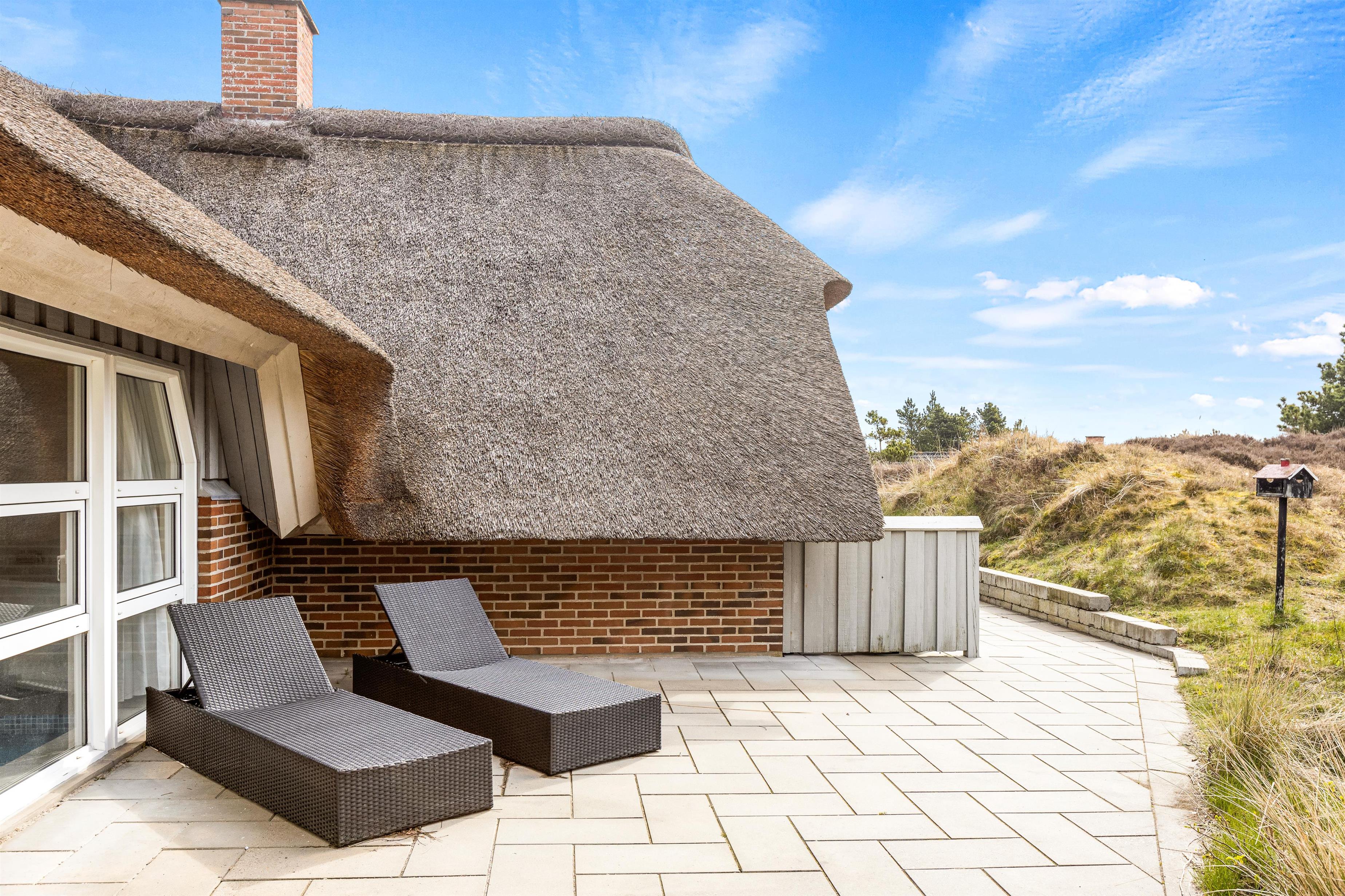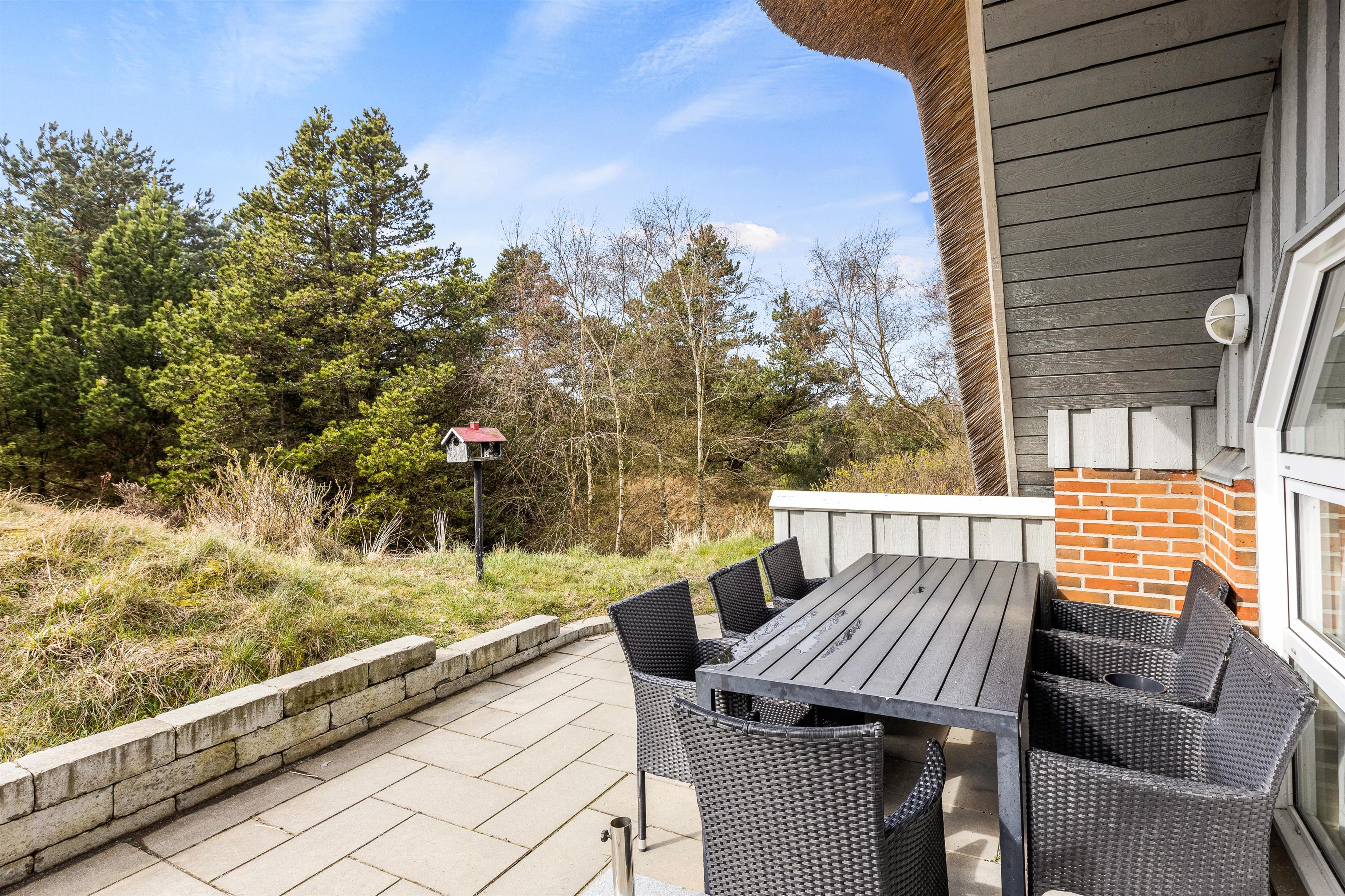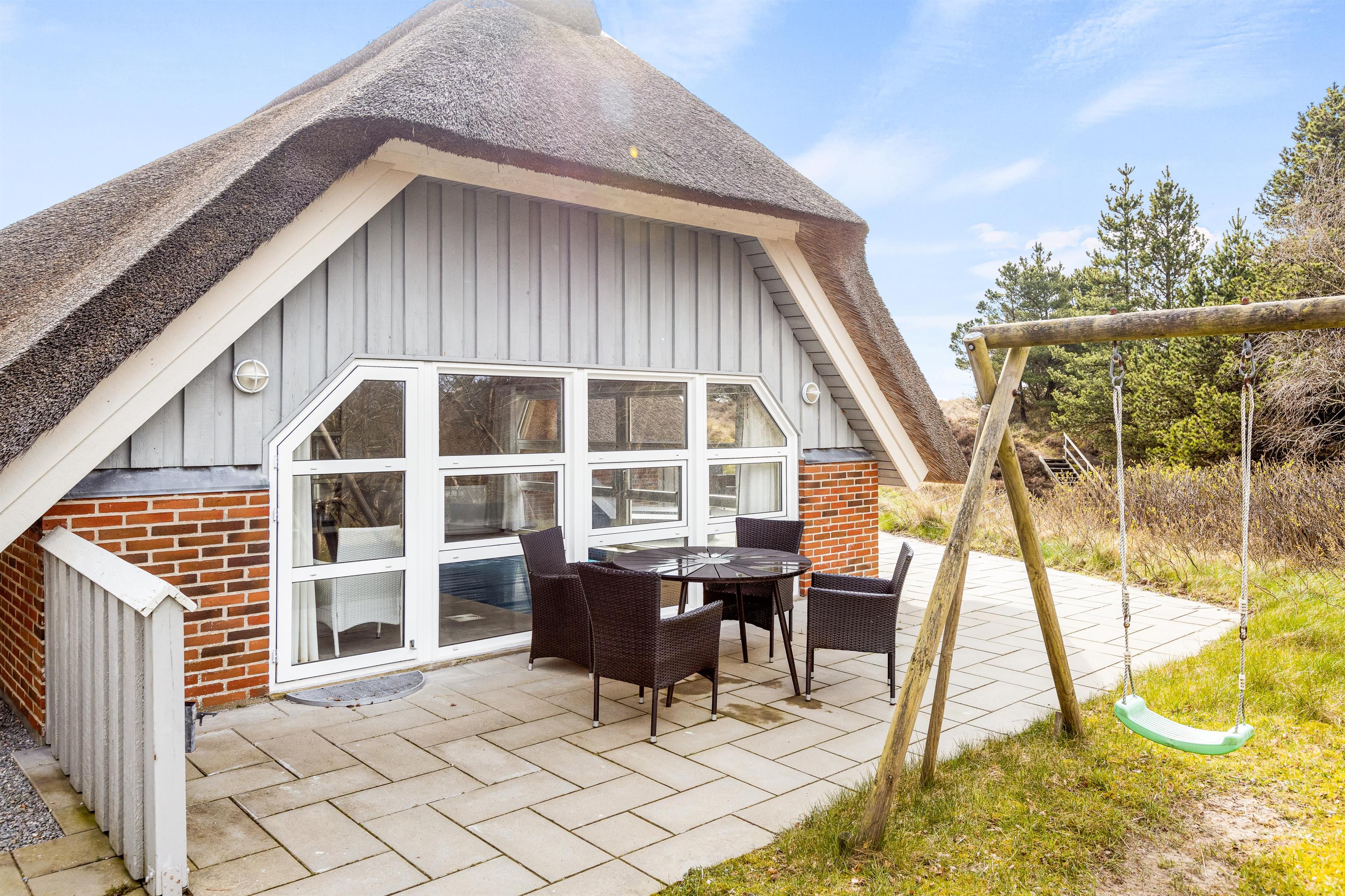 Fra opholdsrummet har I direkte udgang til den sydvendte terrasse, der indbyder til mange hyggelige timer på en solskinsdag. Mens I nyder ferien fra terrassen, kan børnene lege på naturgrunden, hvor der både er sandkasse og gyngestativ.