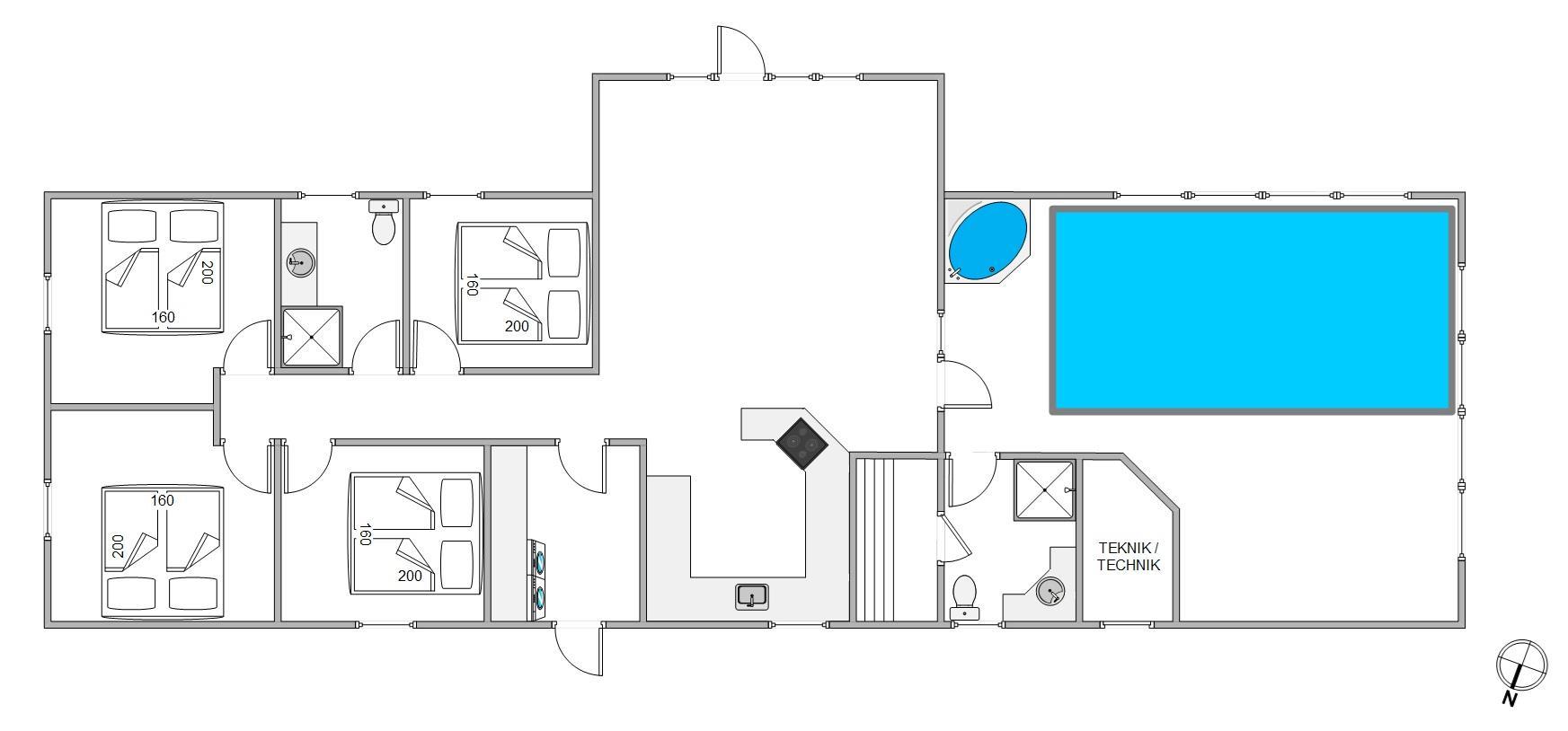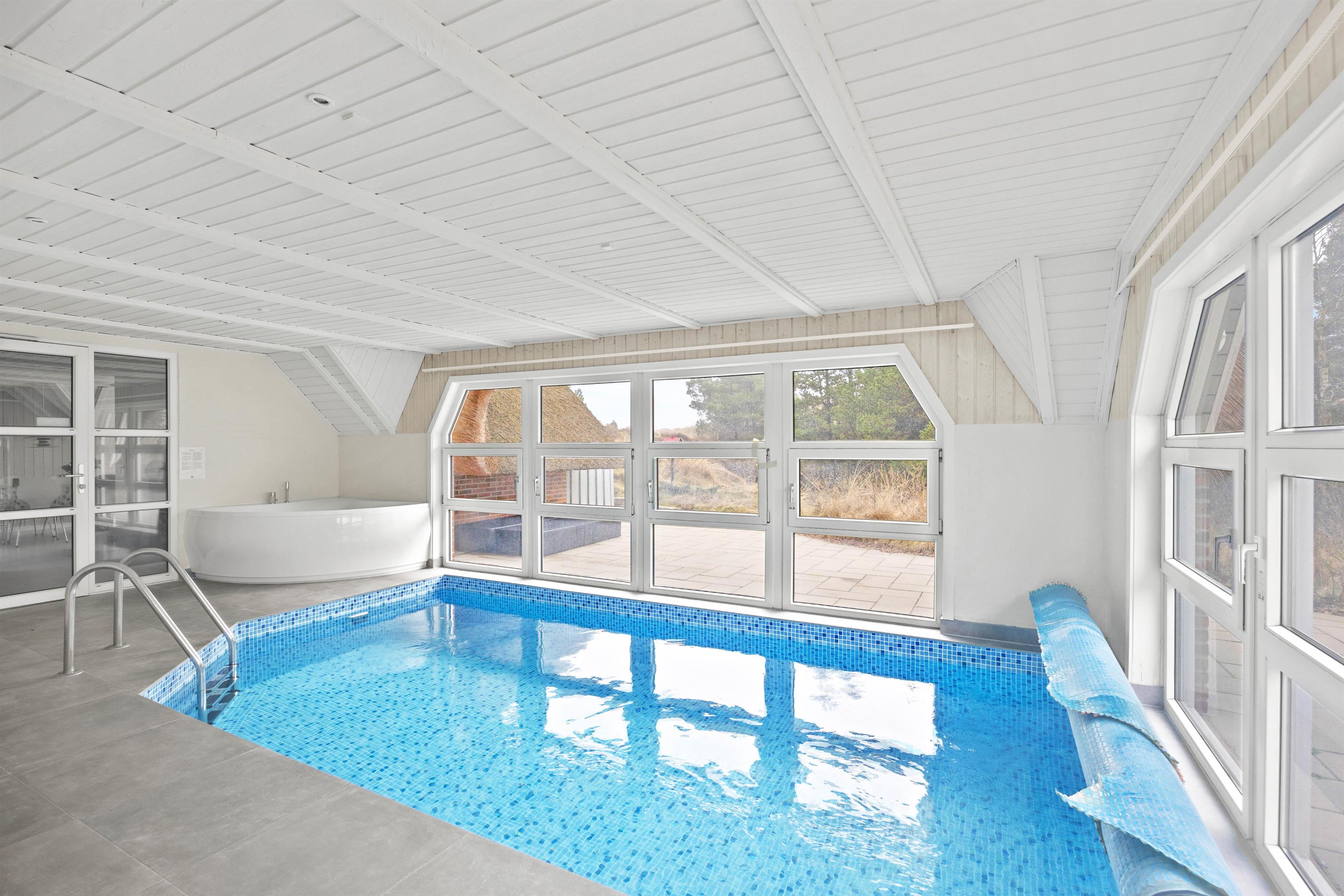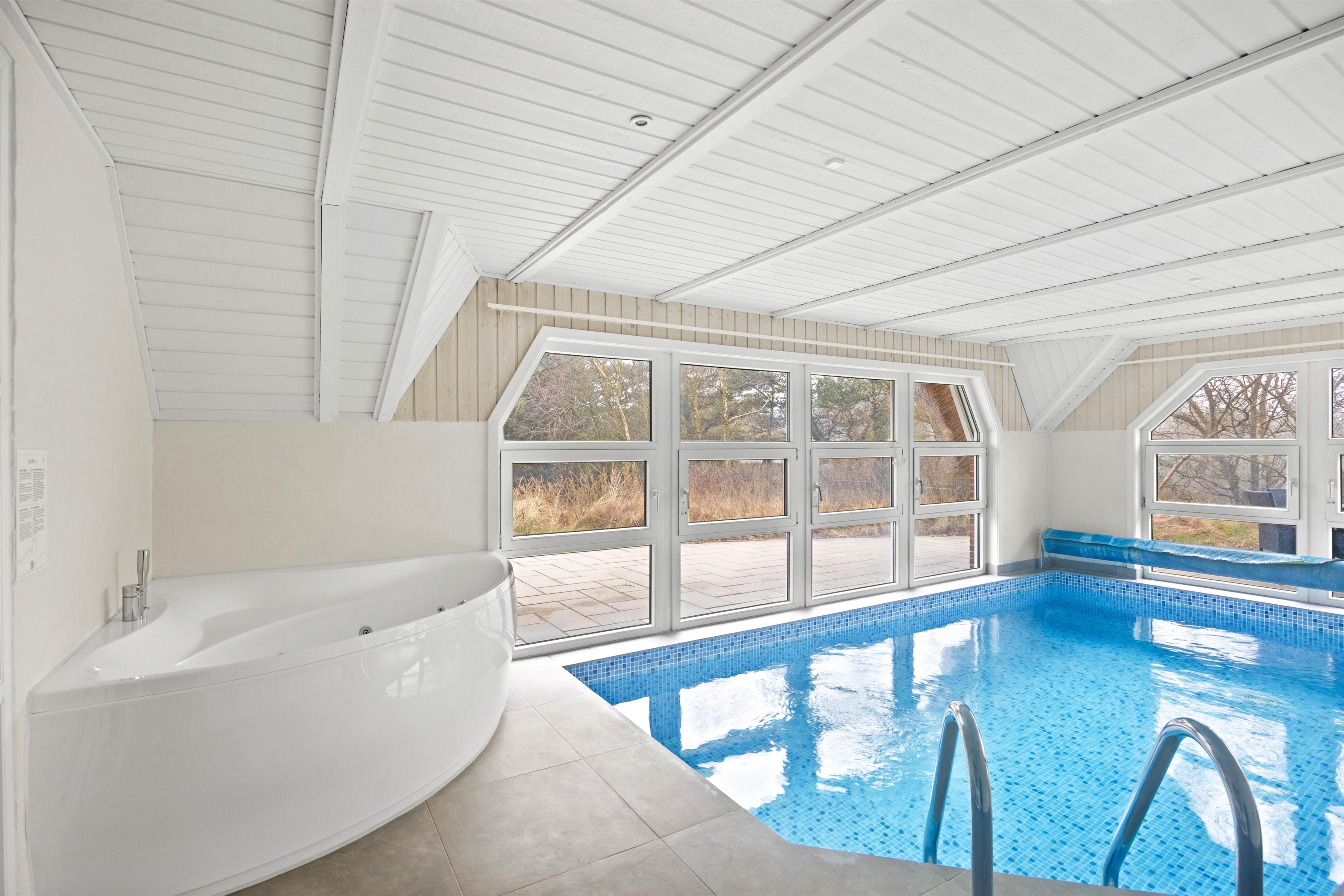 Et af sommerhusets absolutte highlights er poolrummet, hvor hele familien kan hygge sig, hvad enten I er til afslapning i spabadet eller leg i den 18 m2 store pool. I forbindelse med poolrummet ligger det ene af sommerhusets 2 badeværelser. Her finder I indgangen til saunen, som fuldender wellnessoplevelsen efter en tur i spaen.