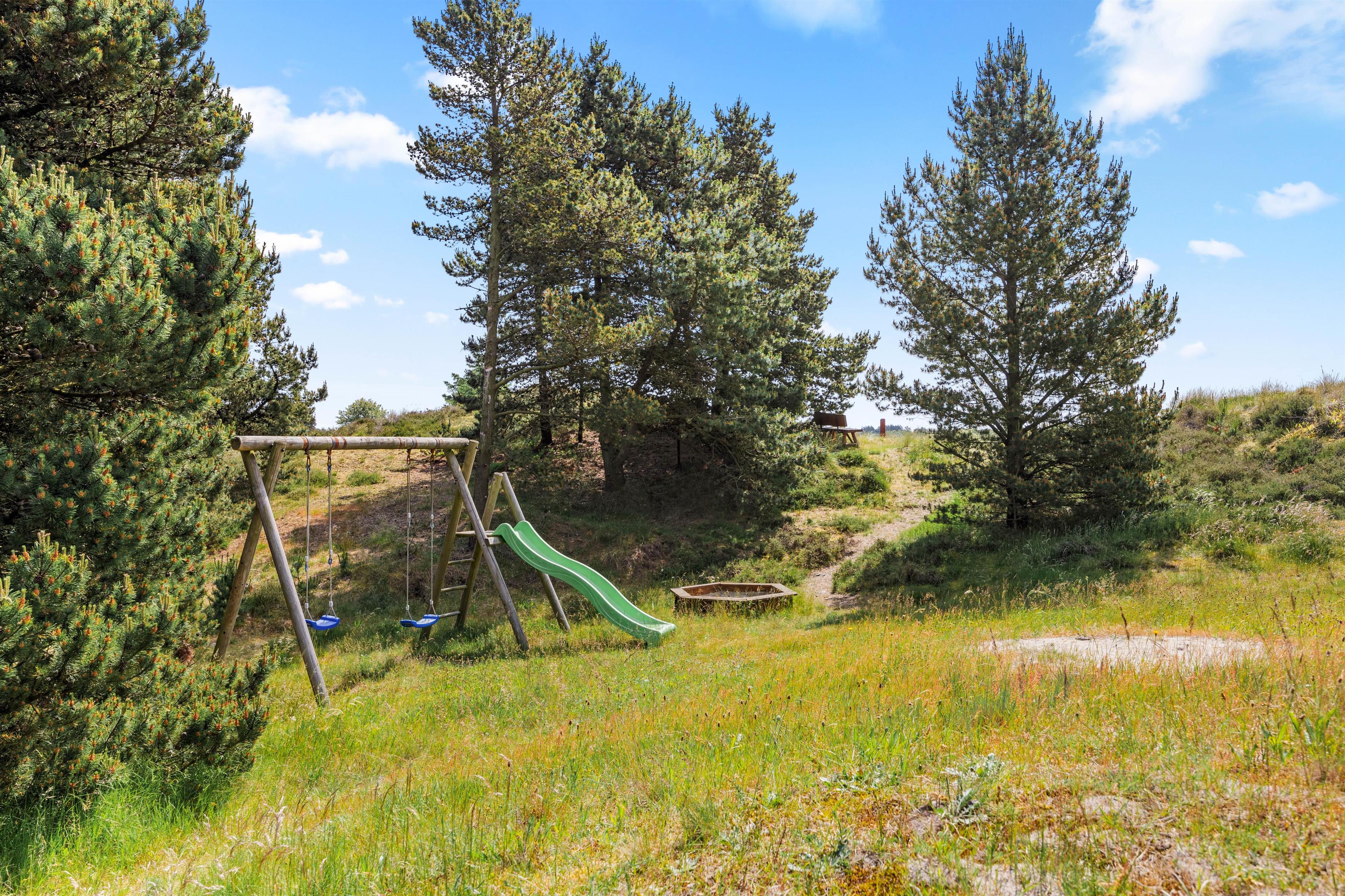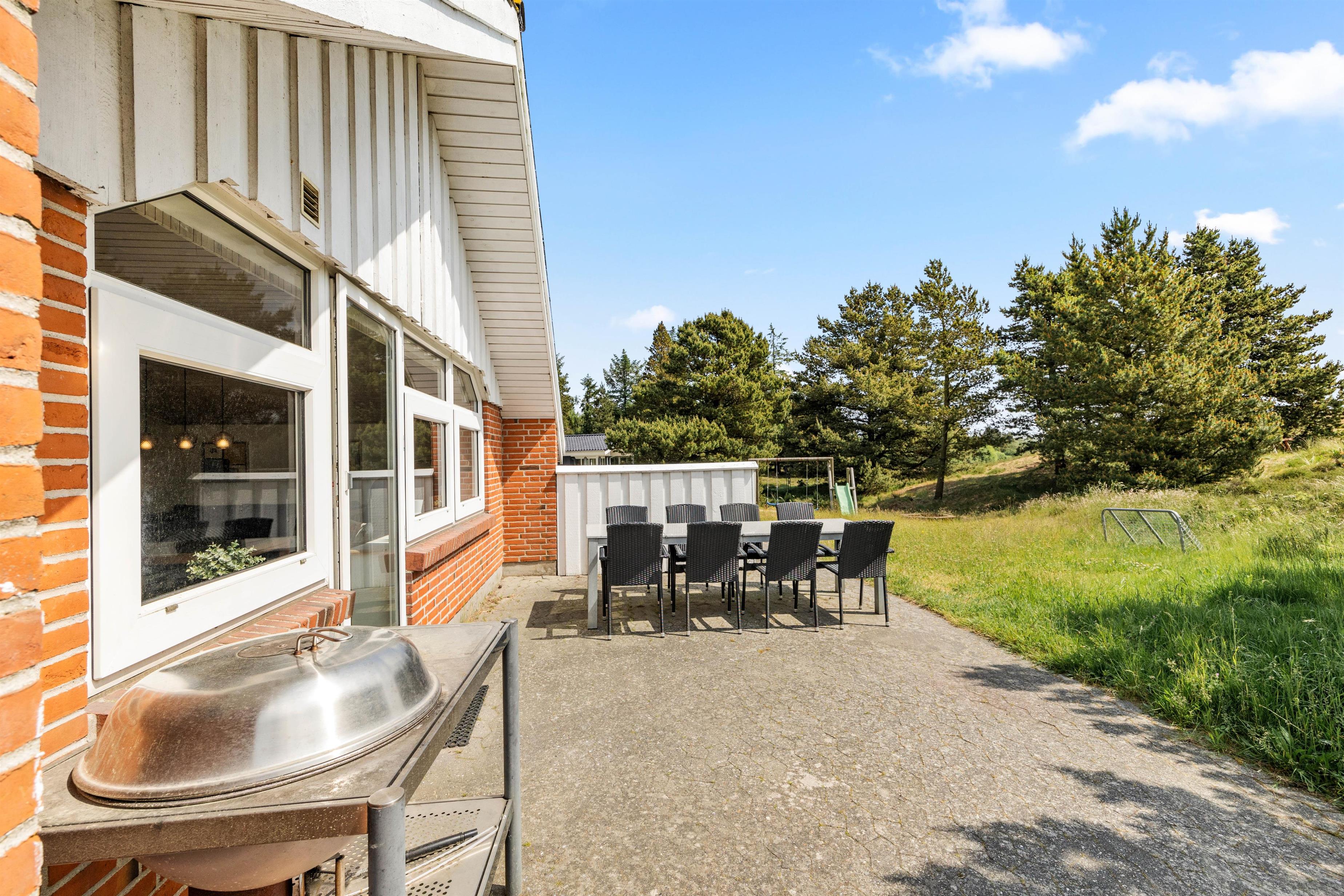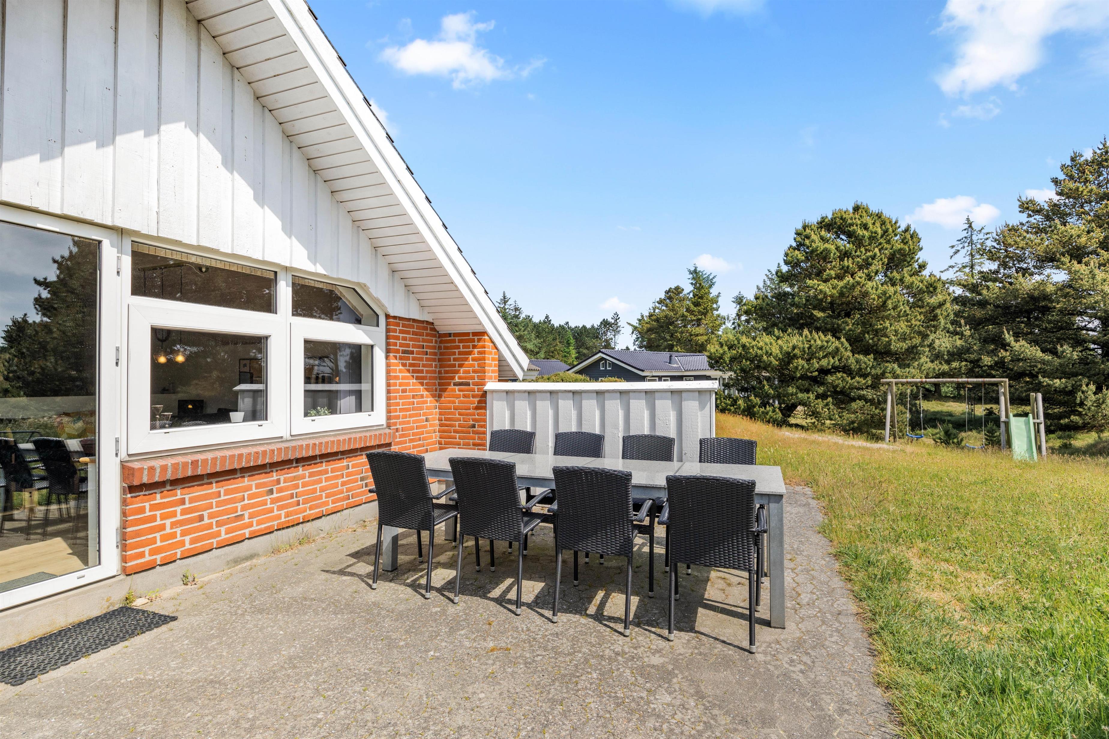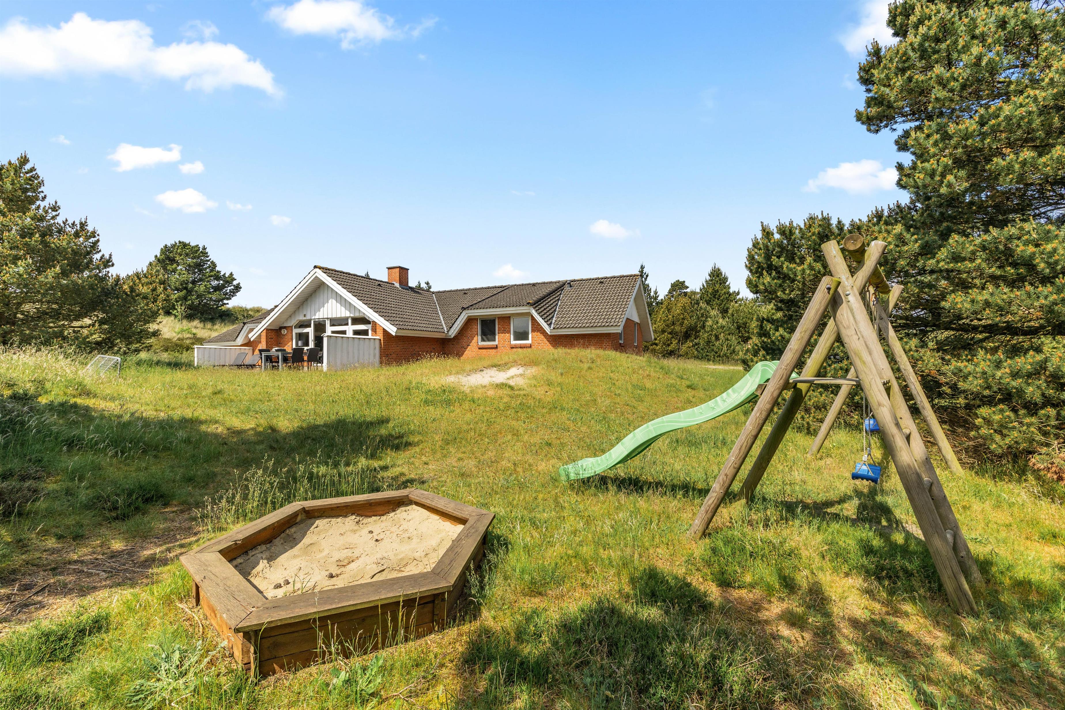 Der er skønne terrasseområder rundt om næsten hele feriehuset. Her kan man rykke rundt med solen, og nyde solskinstimerne i fulde drag, eller man kan trække sig tilbage i skyggen. Der er også et lille overdækket område uden for hoveddøren, som er perfekt til dagens første kop kaffe. I dette feriehus er der tænkt på de små gæster. De kan gå på opdagelse på den 2700m² store naturgrund, og der er gynge, rutsjebane og sandkasse til dem. Dette feriehus ligger midt i naturen, så her kan I nyde ferien i fred og ro.