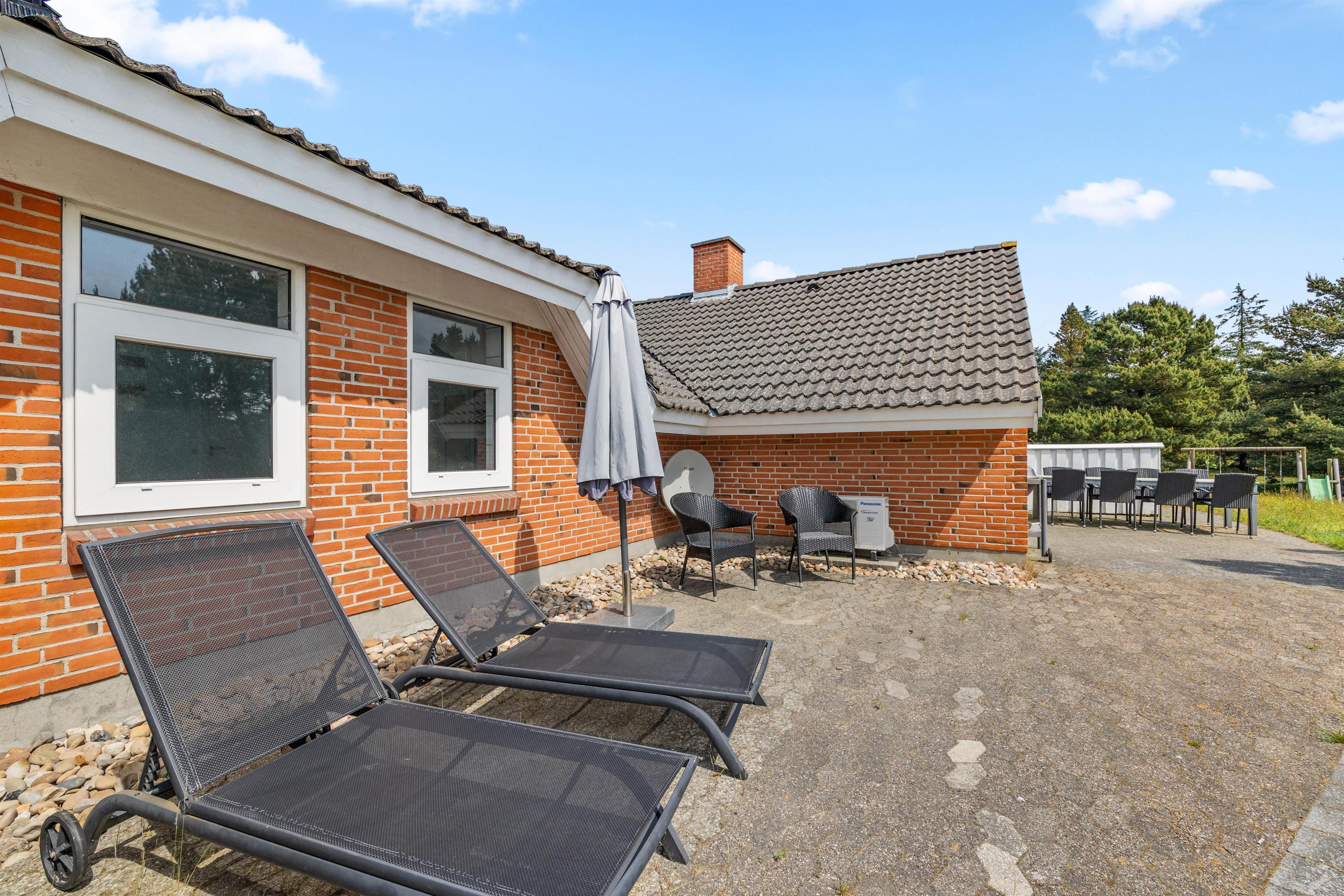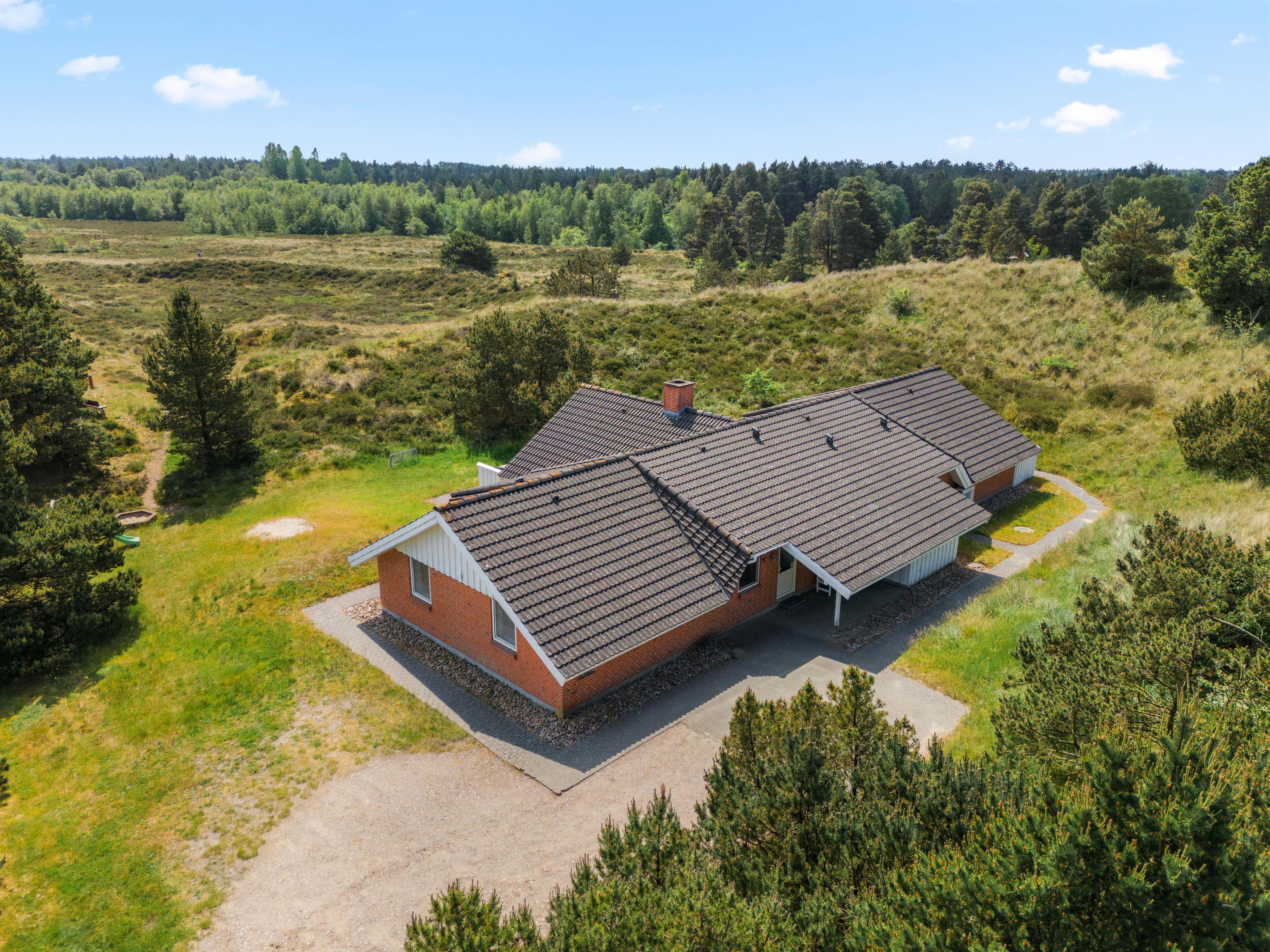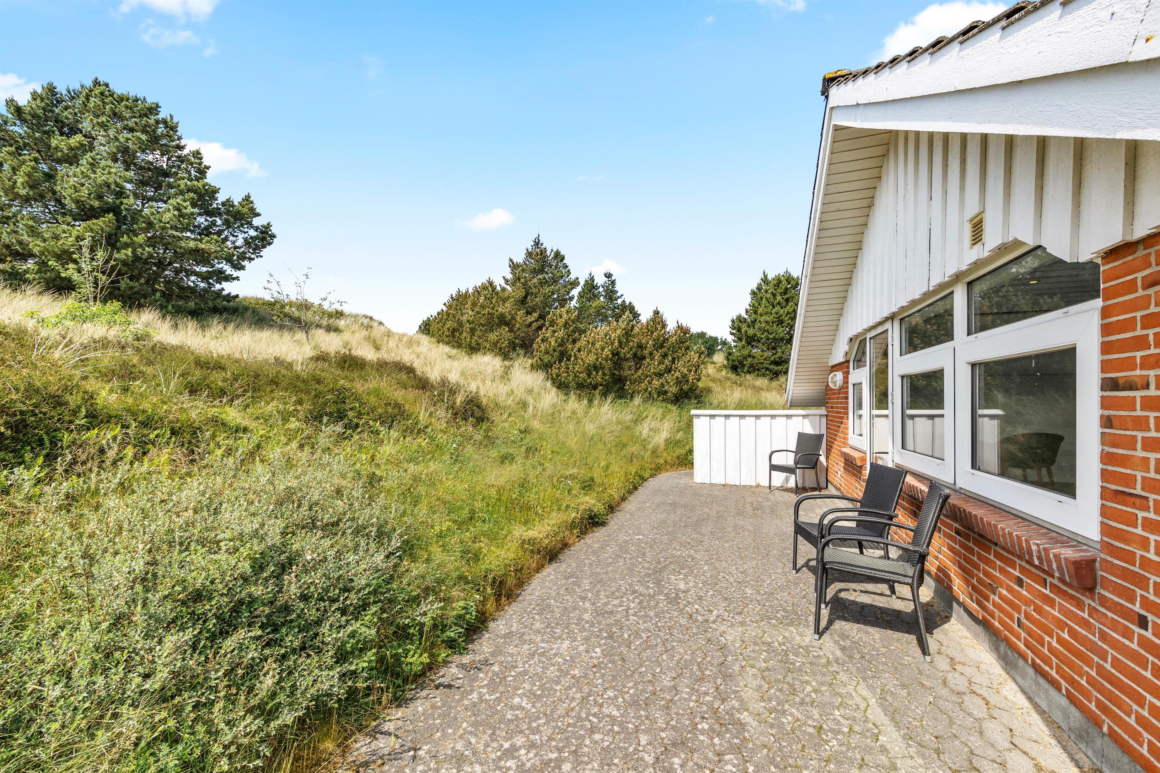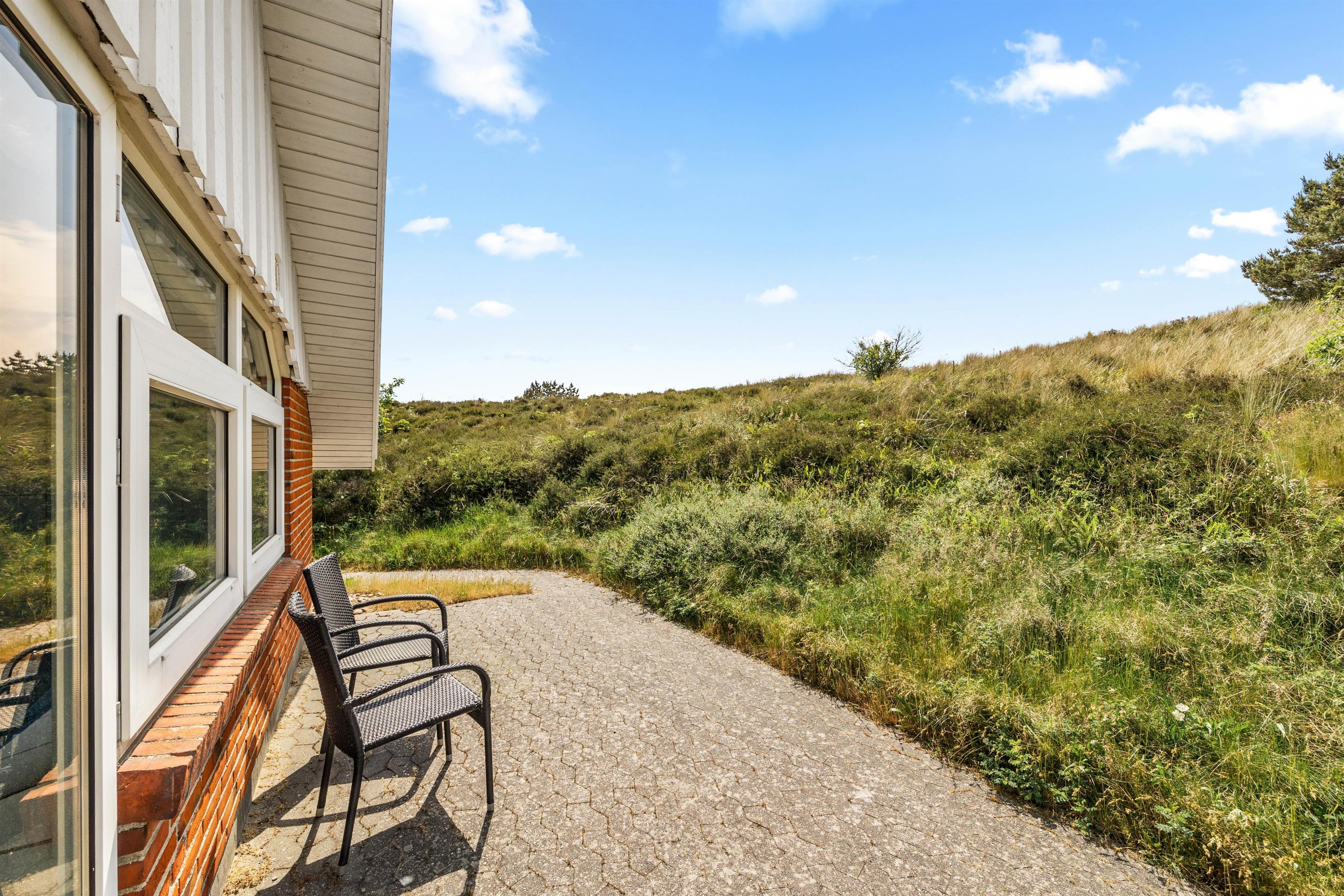 Der er skønne terrasseområder rundt om næsten hele feriehuset. Her kan man rykke rundt med solen, og nyde solskinstimerne i fulde drag, eller man kan trække sig tilbage i skyggen. Der er også et lille overdækket område uden for hoveddøren, som er perfekt til dagens første kop kaffe. I dette feriehus er der tænkt på de små gæster. De kan gå på opdagelse på den 2700m² store naturgrund, og der er gynge, rutsjebane og sandkasse til dem. Dette feriehus ligger midt i naturen, så her kan I nyde ferien i fred og ro.