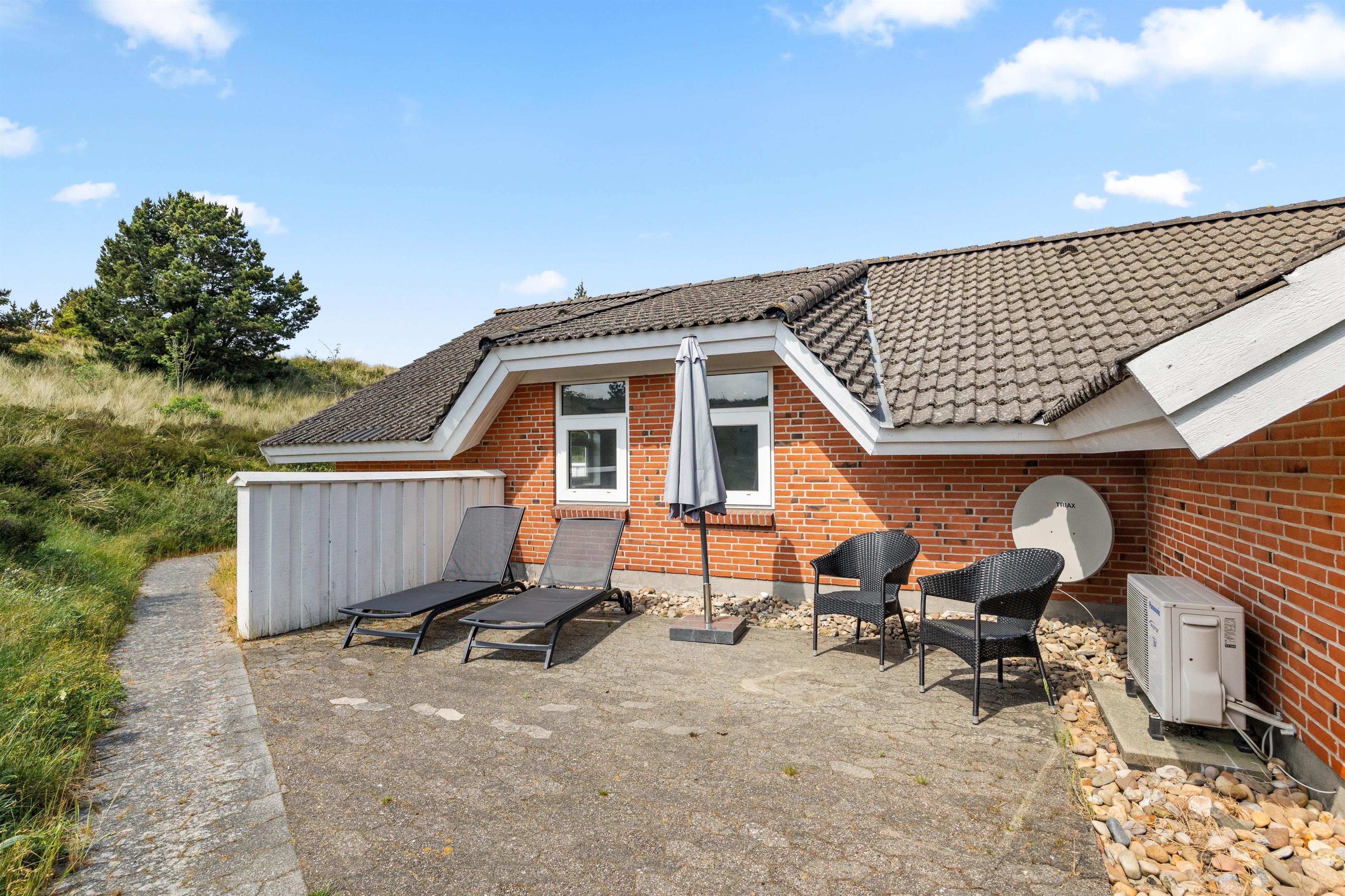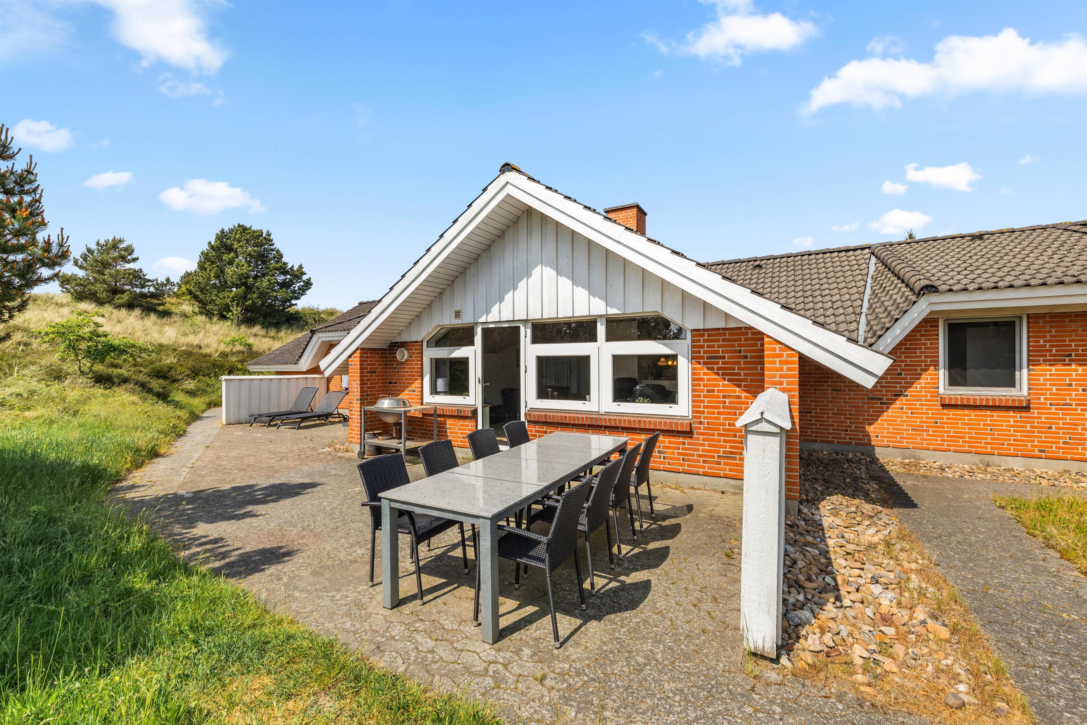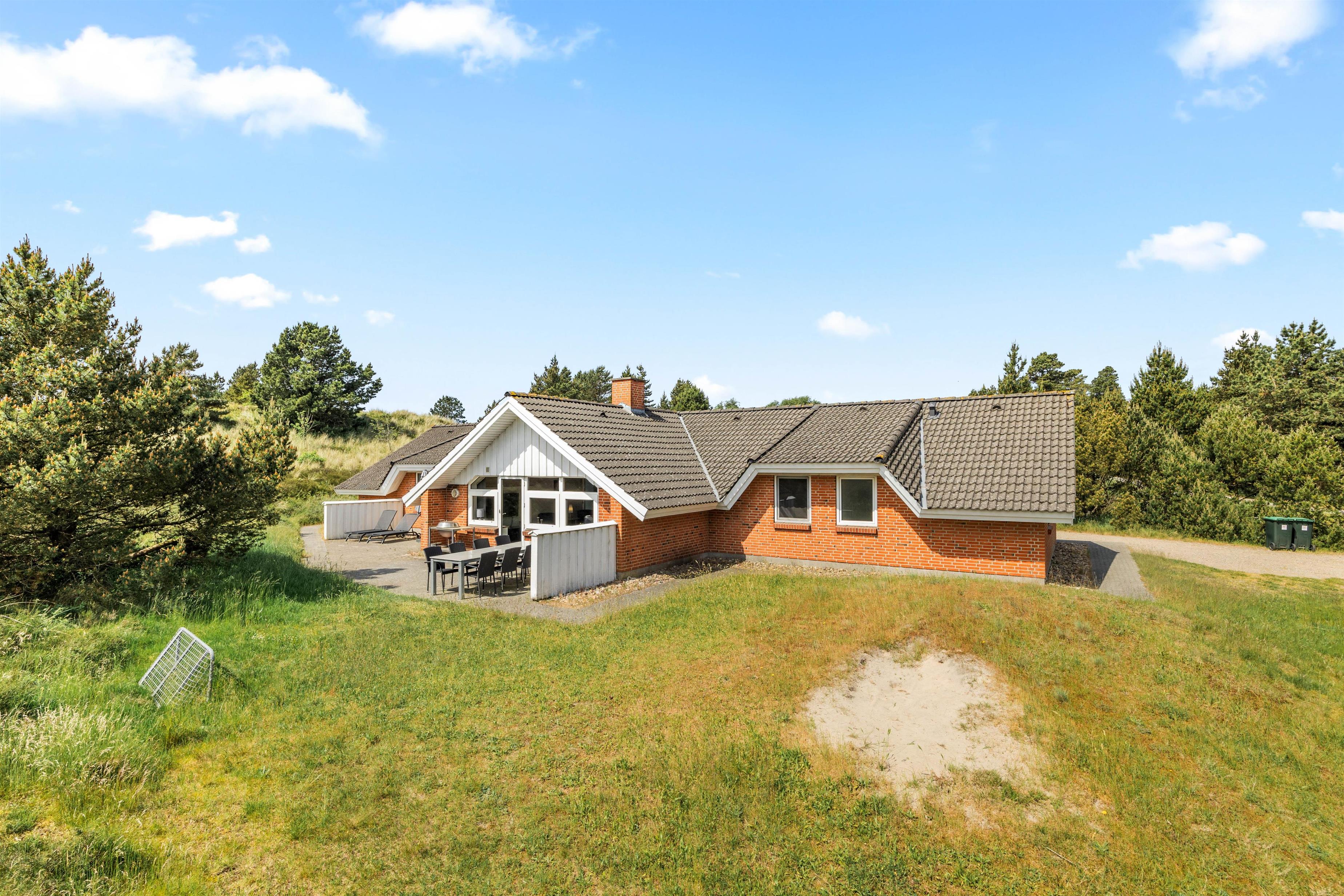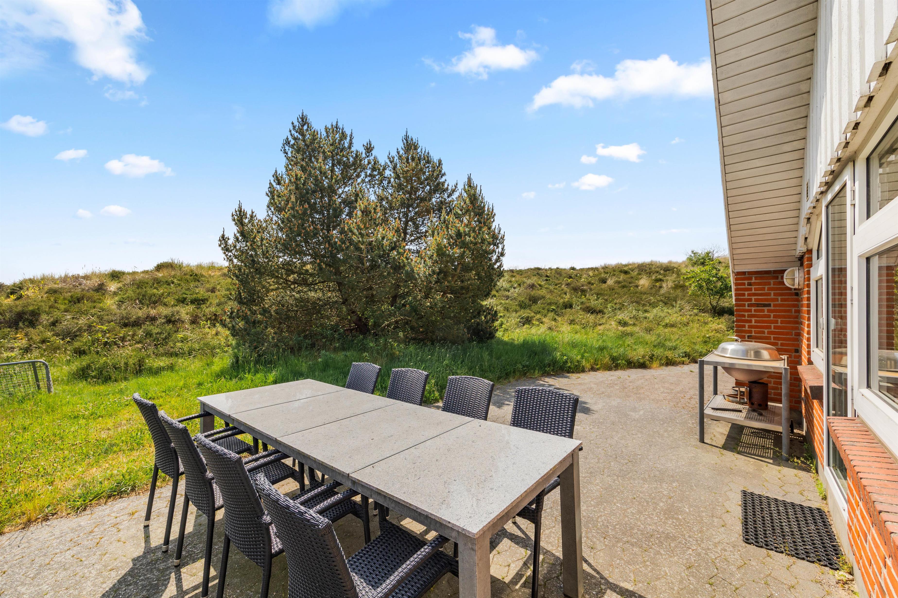 Der er skønne terrasseområder rundt om næsten hele feriehuset. Her kan man rykke rundt med solen, og nyde solskinstimerne i fulde drag, eller man kan trække sig tilbage i skyggen. Der er også et lille overdækket område uden for hoveddøren, som er perfekt til dagens første kop kaffe. I dette feriehus er der tænkt på de små gæster. De kan gå på opdagelse på den 2700m² store naturgrund, og der er gynge, rutsjebane og sandkasse til dem. Dette feriehus ligger midt i naturen, så her kan I nyde ferien i fred og ro.
