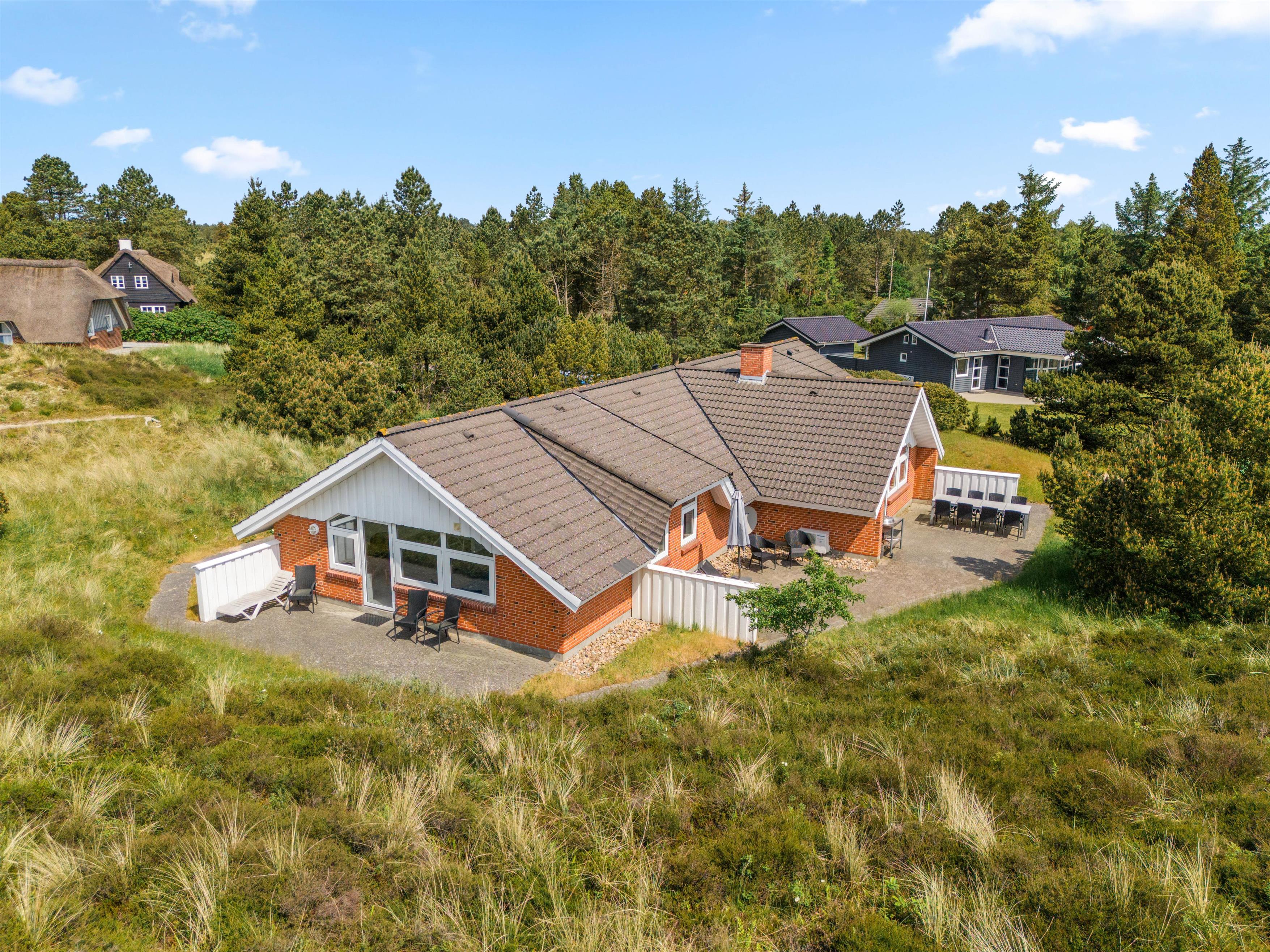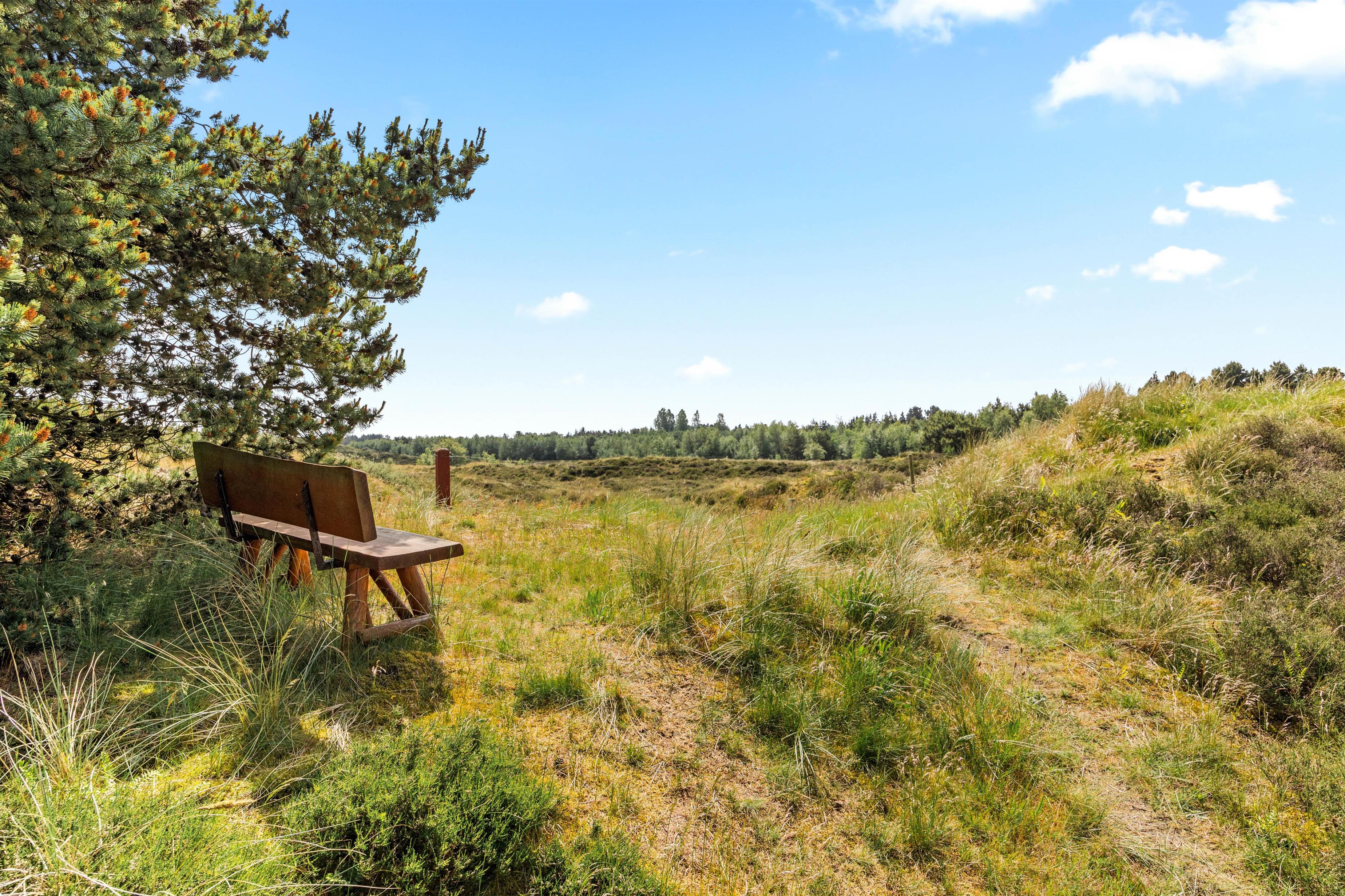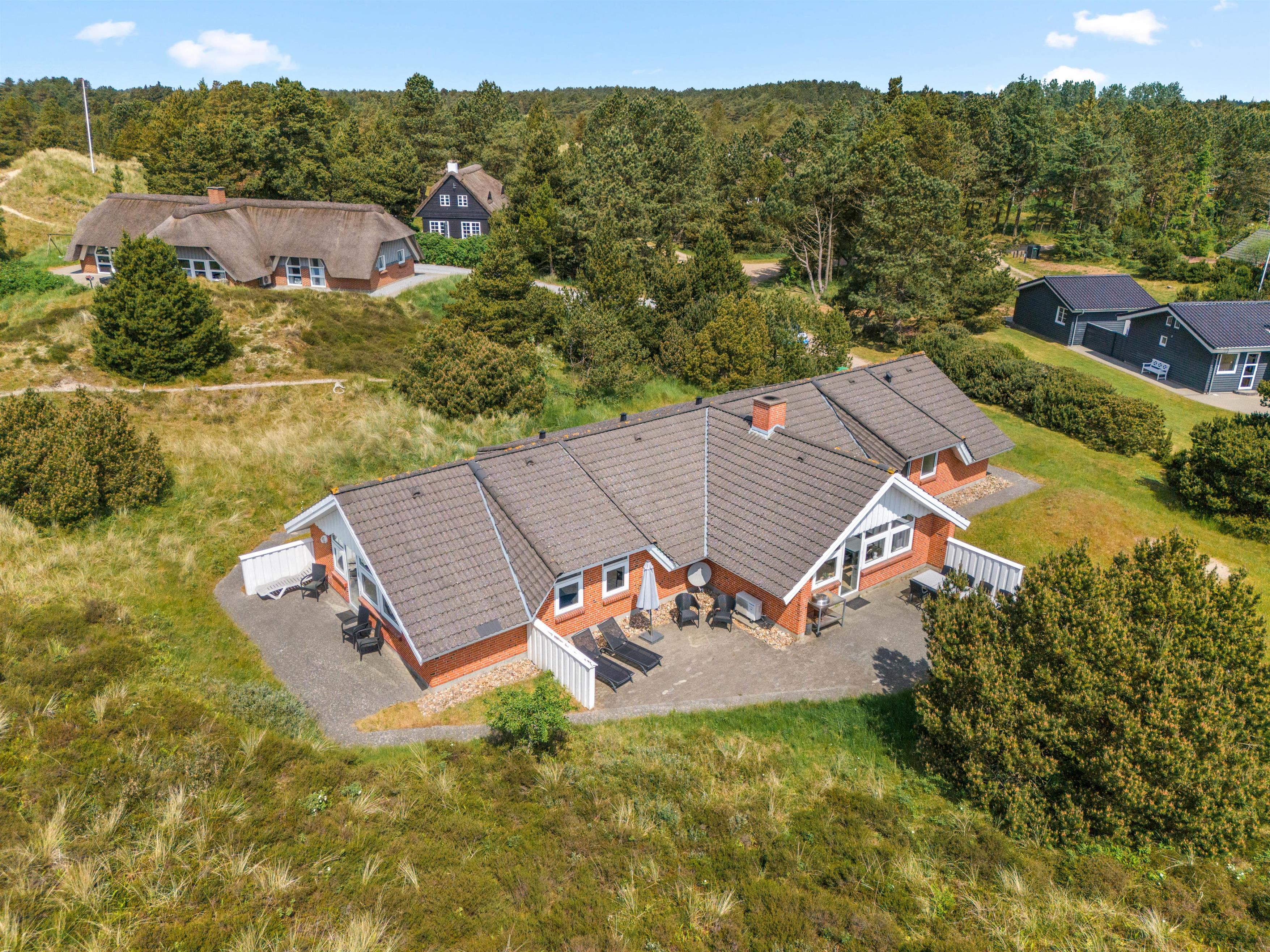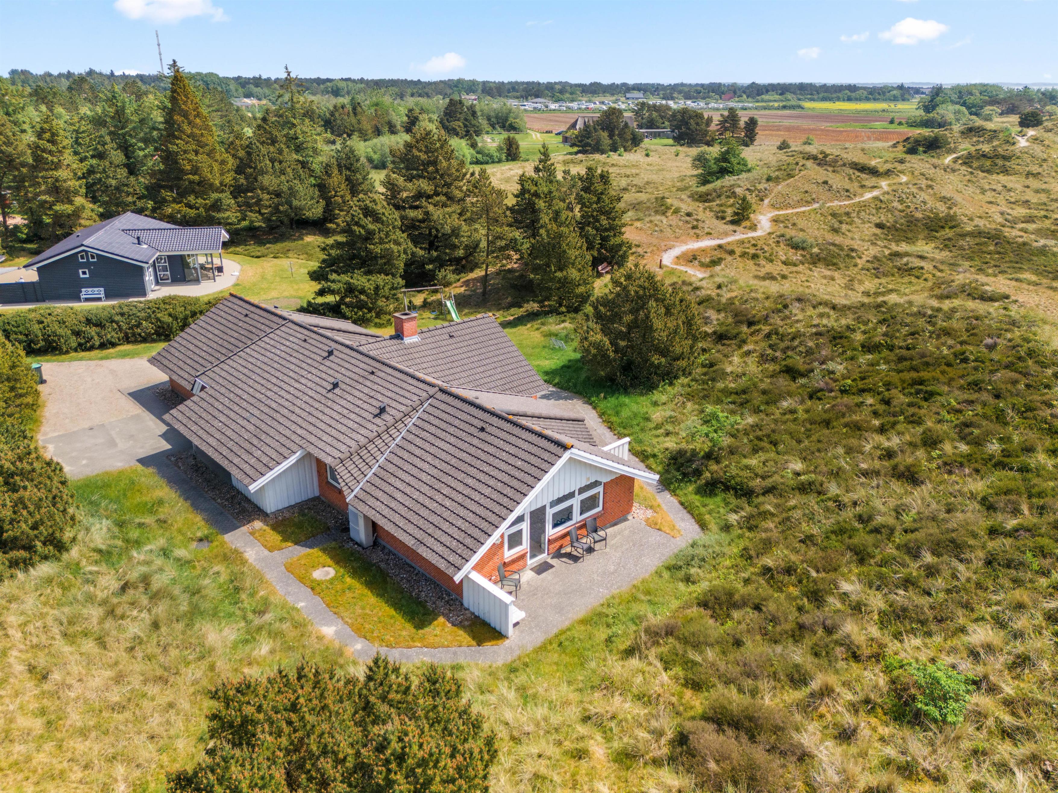Der er skønne terrasseområder rundt om næsten hele feriehuset. Her kan man rykke rundt med solen, og nyde solskinstimerne i fulde drag, eller man kan trække sig tilbage i skyggen. Der er også et lille overdækket område uden for hoveddøren, som er perfekt til dagens første kop kaffe. I dette feriehus er der tænkt på de små gæster. De kan gå på opdagelse på den 2700m² store naturgrund, og der er gynge, rutsjebane og sandkasse til dem. Dette feriehus ligger midt i naturen, så her kan I nyde ferien i fred og ro.