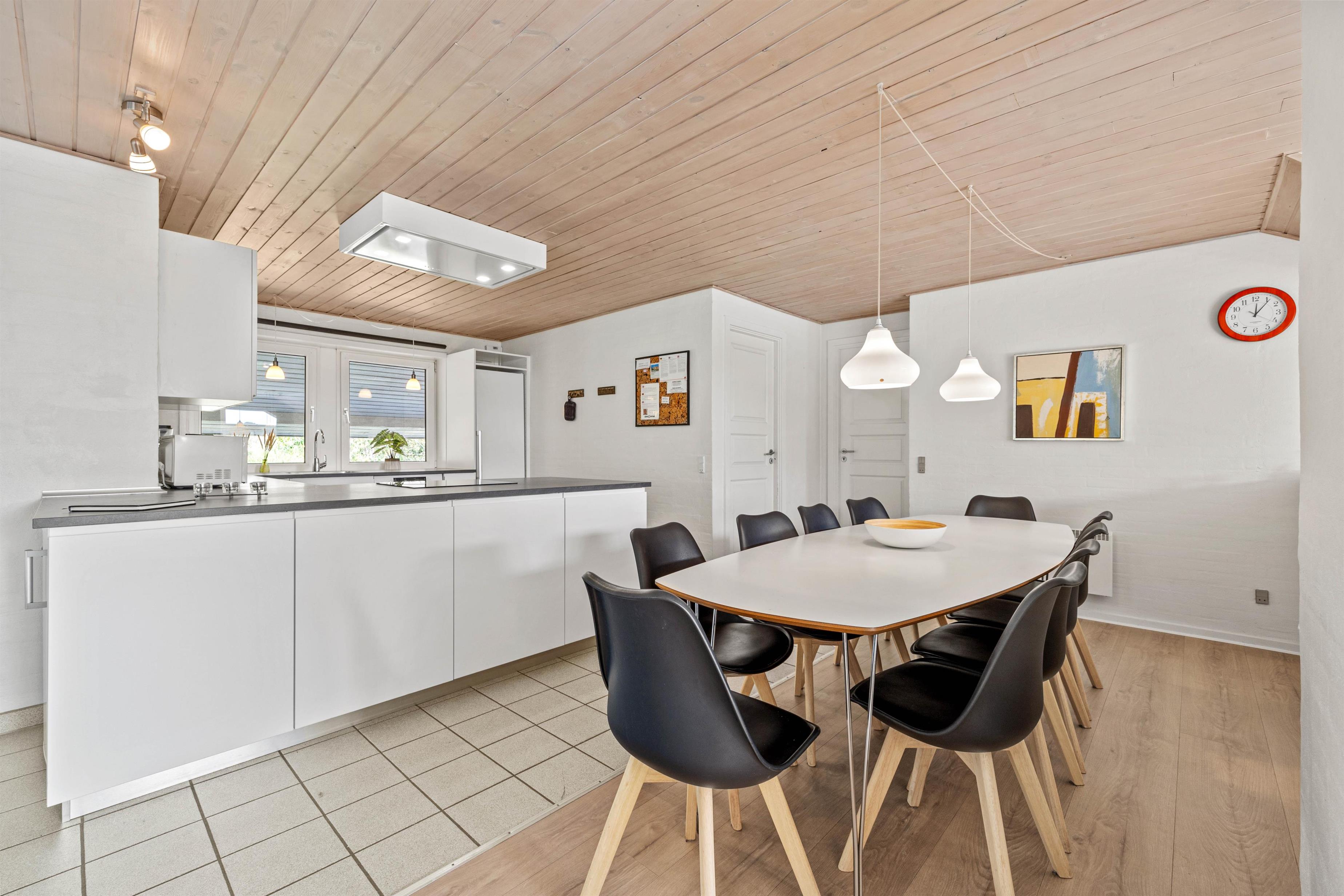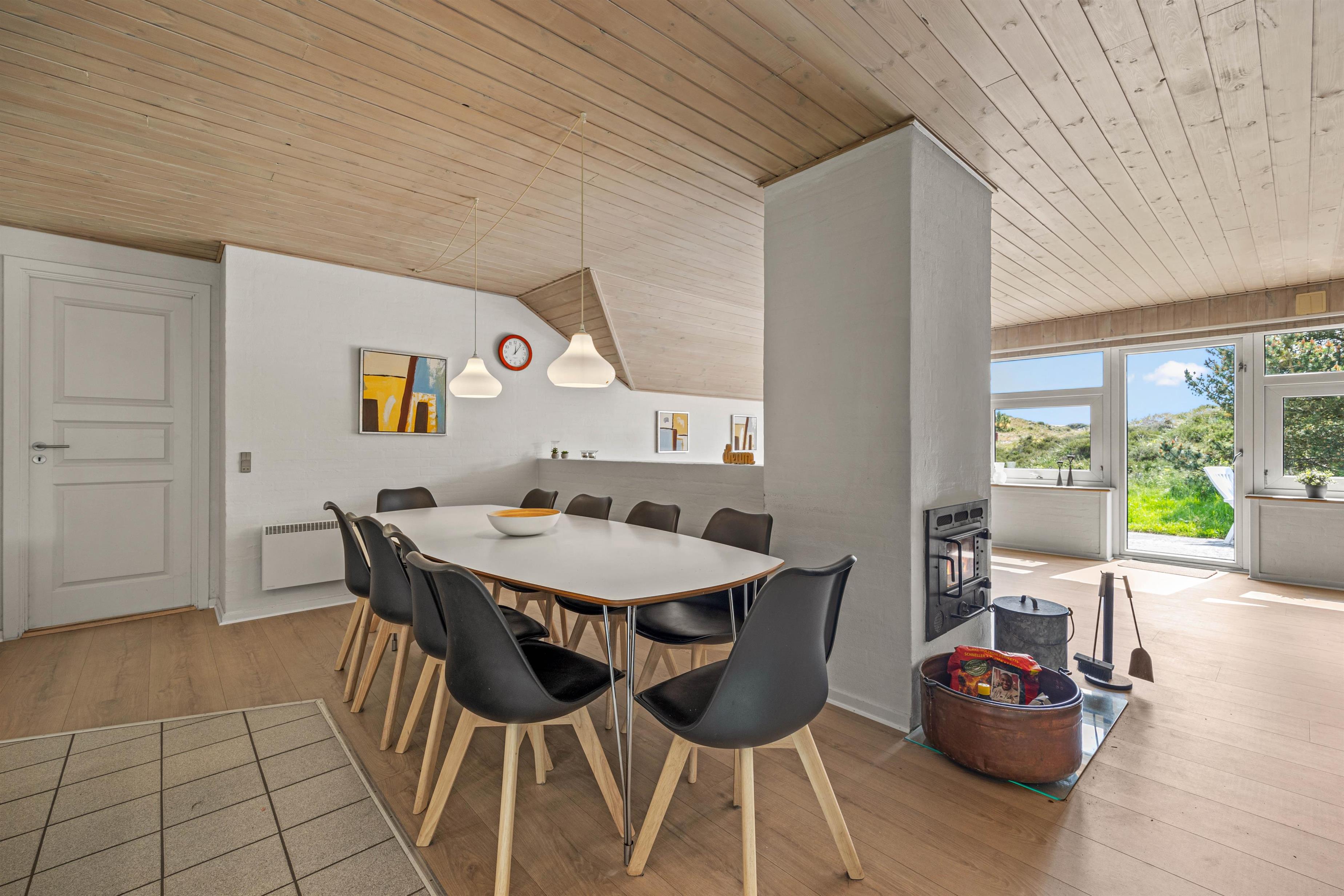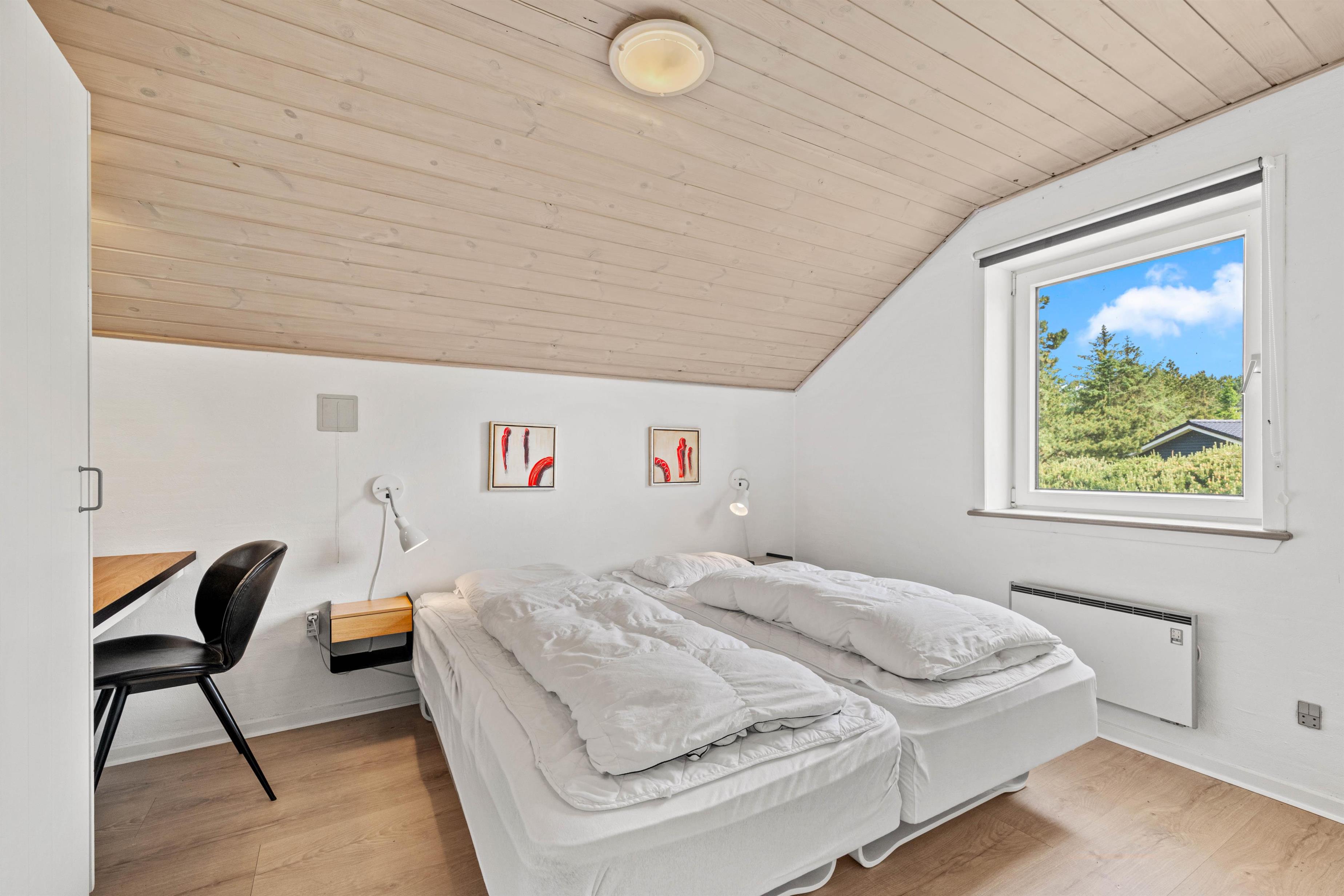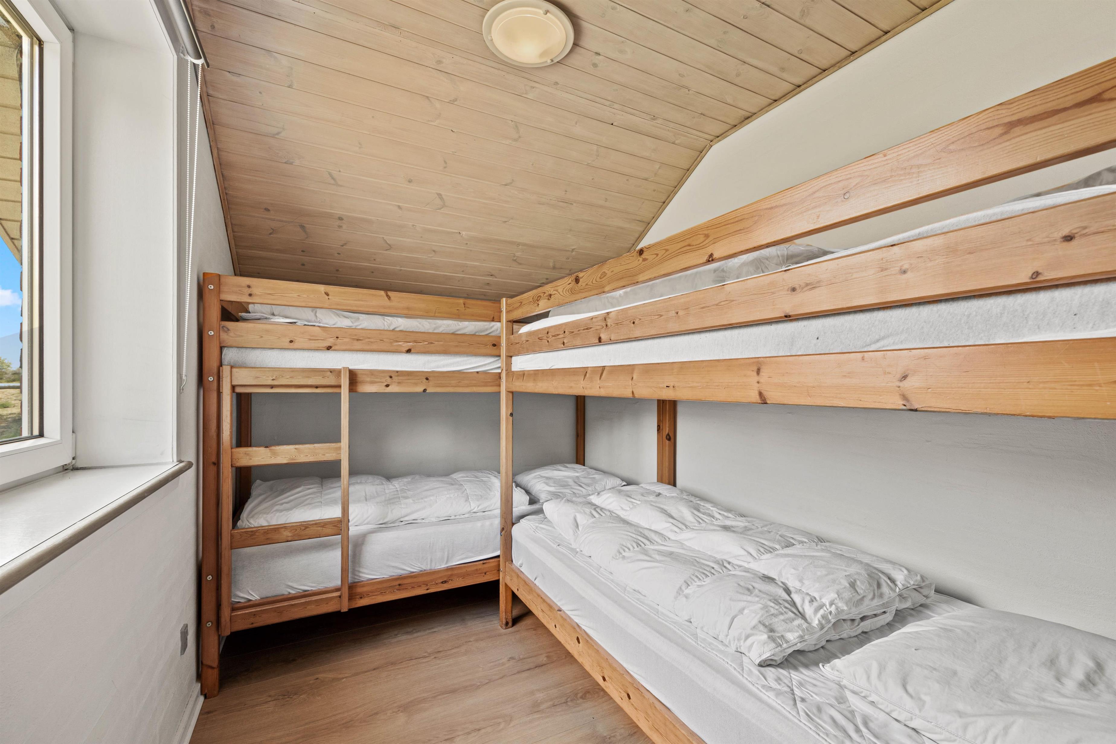 Samlingspunktet i det smukke feriehus på Vestergårdsvej 13 er det åbne plan. Med udsigt til poolområdet er stue, spisestue og køkken i åben forbindelse med hinanden. Det betyder, at I kan lave mad sammen og nyde aftenen ved spisebordet over et glas vin, mens børnene trækker sig tilbage til stuen og nyder en filmaften med friske popcorn fra mikroovnen. Den indbyggede pejs giver ekstra hygge med knitren fra ilden, og det store vinduesparti i stuen giver masser af naturligt lys ind i rummet. Hvis det er nødvendigt, kan man tænde for den energibesparende varmepumpe, som hurtigt og effektivt sørger for et behageligt indeklima og en god temperatur. De 10 feriegæster kan fordele sig på 4 soveværelser og lade batterierne op til den kommende dag. Der er i alt 3 dobbeltsenge og 2 køjesenge, som vil være et hit hos børnene.