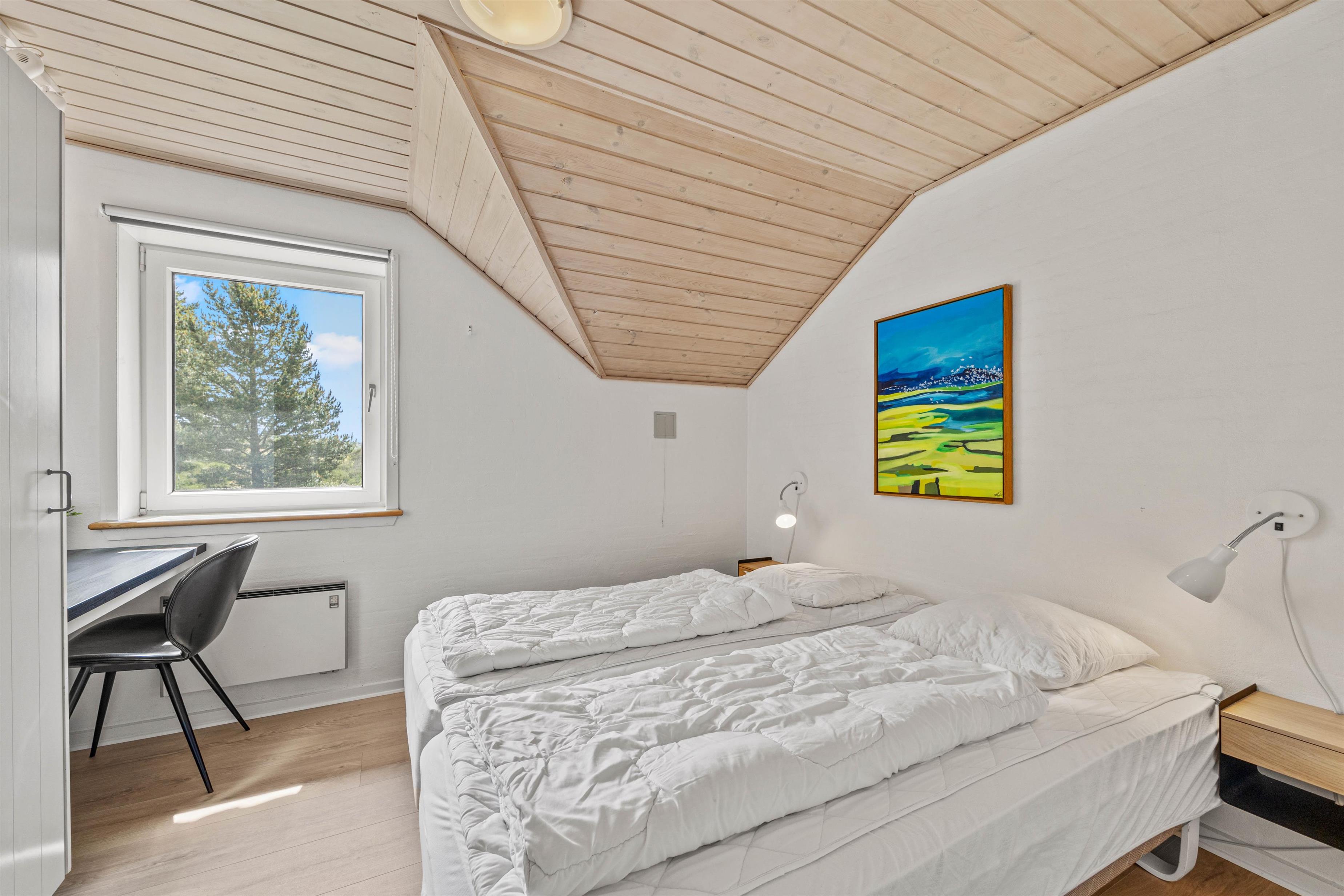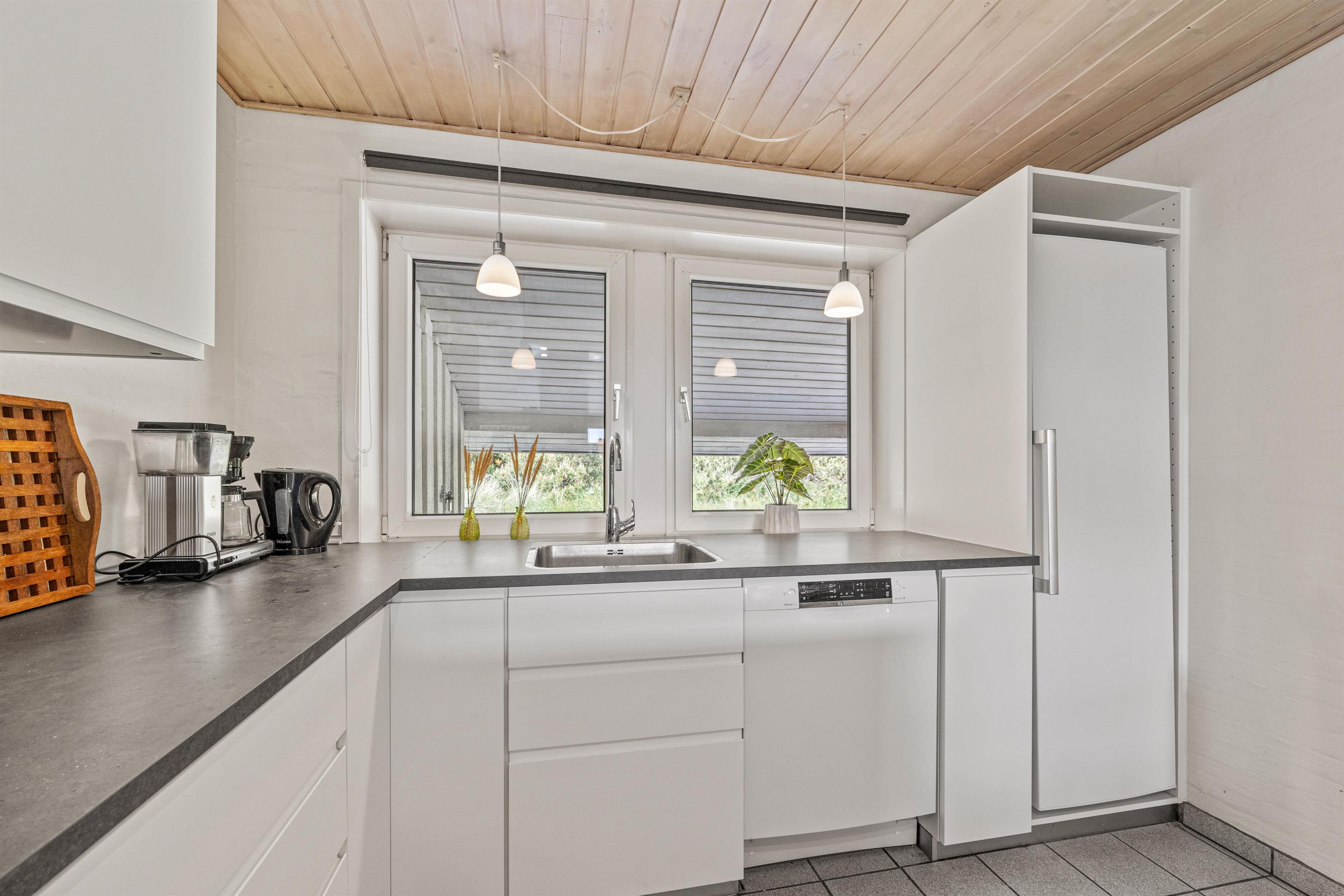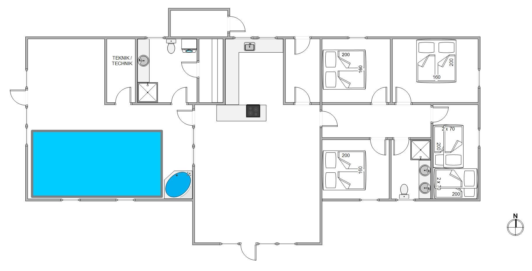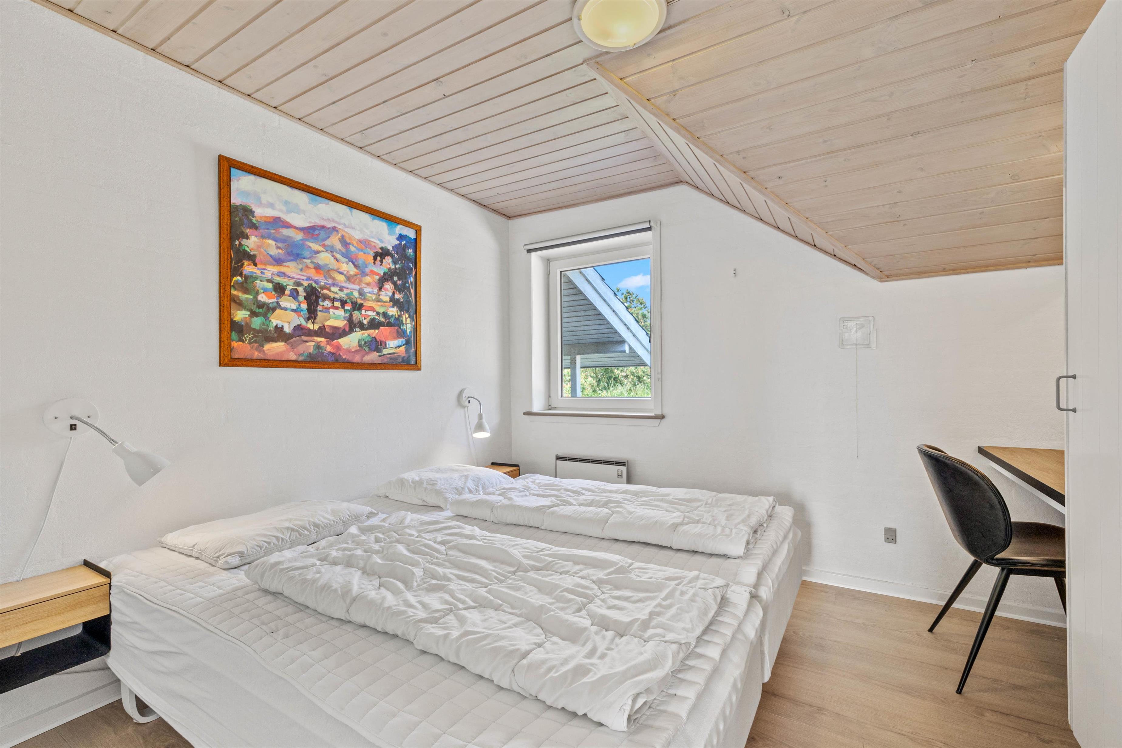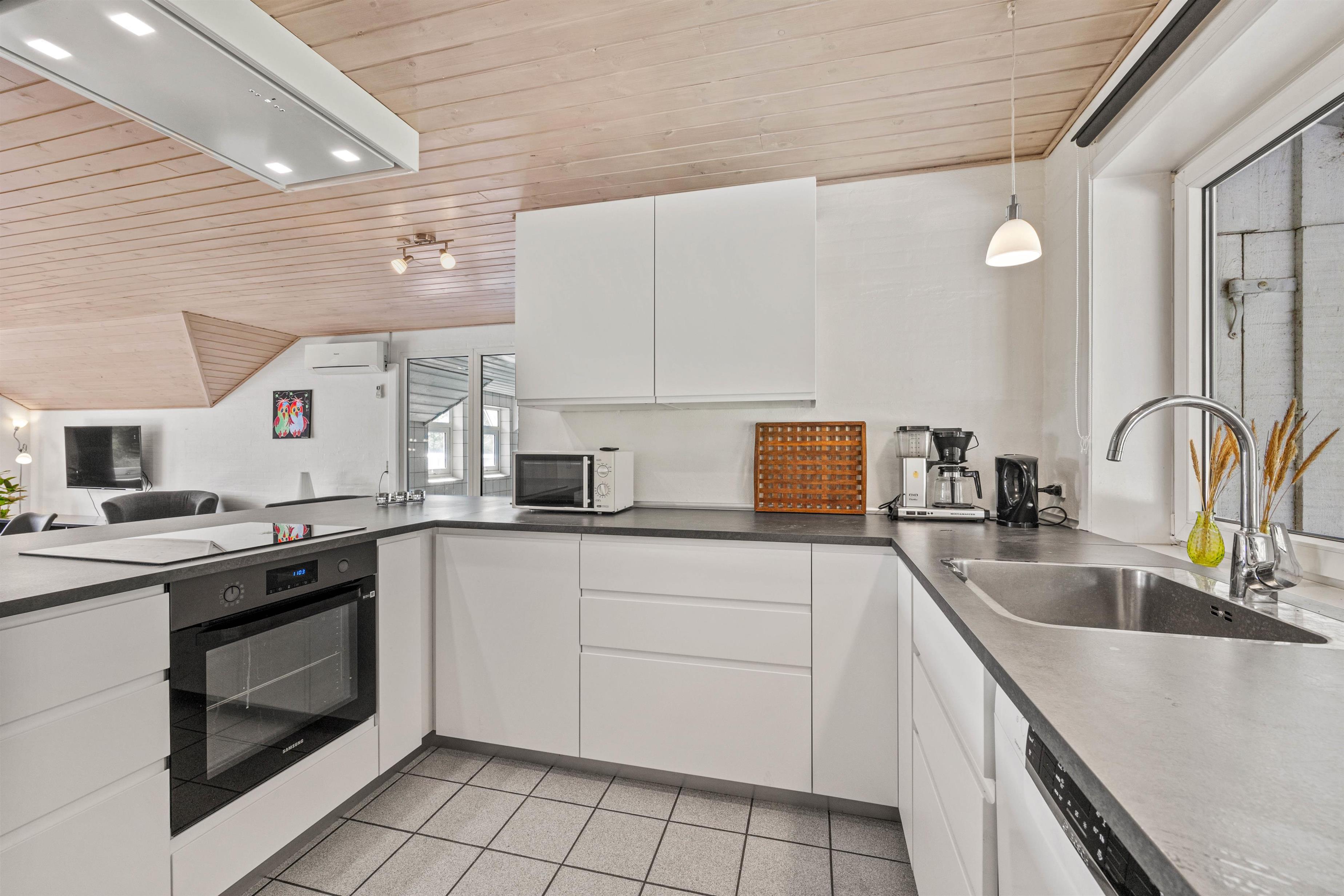 Samlingspunktet i det smukke feriehus på Vestergårdsvej 13 er det åbne plan. Med udsigt til poolområdet er stue, spisestue og køkken i åben forbindelse med hinanden. Det betyder, at I kan lave mad sammen og nyde aftenen ved spisebordet over et glas vin, mens børnene trækker sig tilbage til stuen og nyder en filmaften med friske popcorn fra mikroovnen. Den indbyggede pejs giver ekstra hygge med knitren fra ilden, og det store vinduesparti i stuen giver masser af naturligt lys ind i rummet. Hvis det er nødvendigt, kan man tænde for den energibesparende varmepumpe, som hurtigt og effektivt sørger for et behageligt indeklima og en god temperatur. De 10 feriegæster kan fordele sig på 4 soveværelser og lade batterierne op til den kommende dag. Der er i alt 3 dobbeltsenge og 2 køjesenge, som vil være et hit hos børnene.