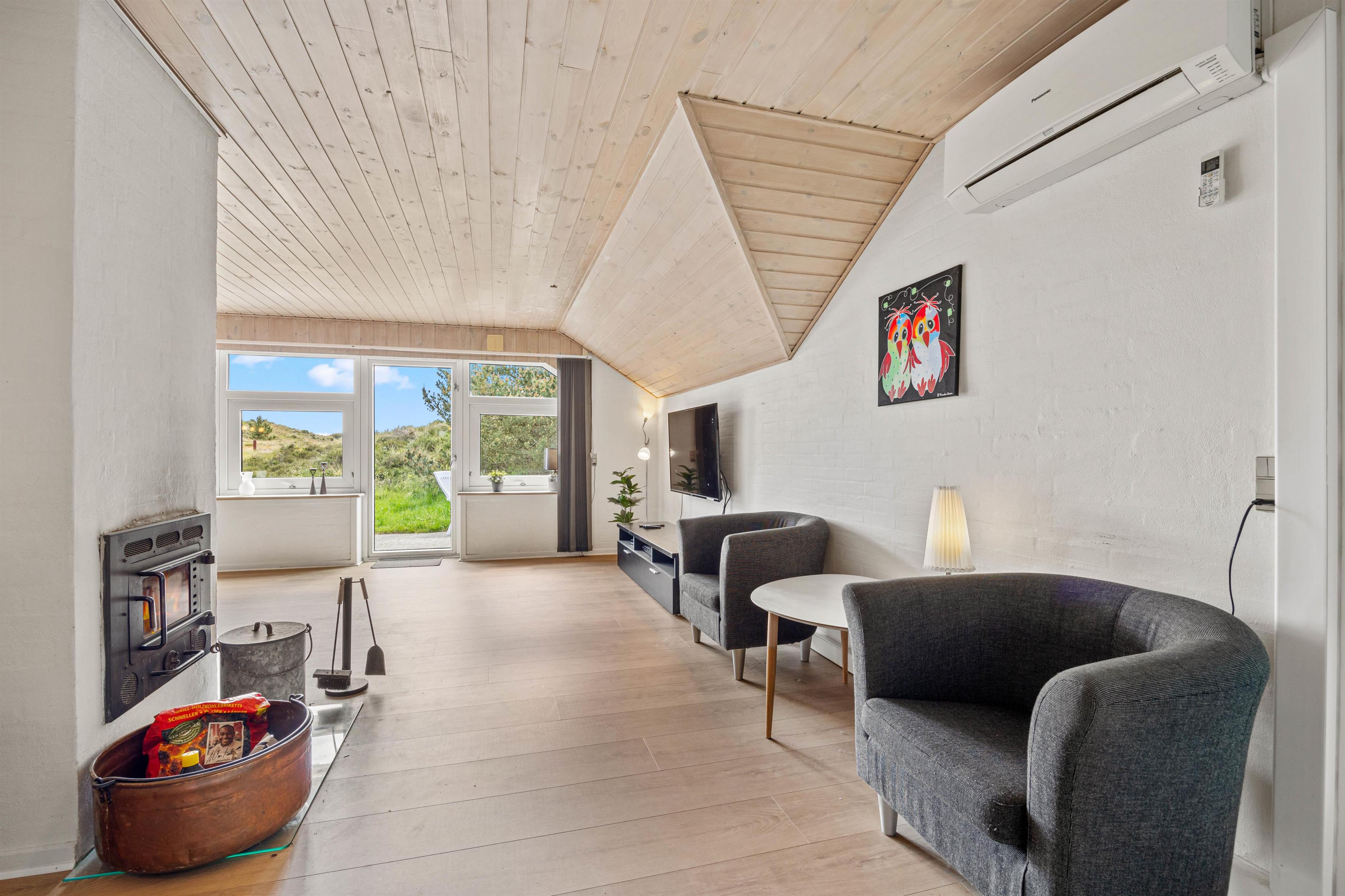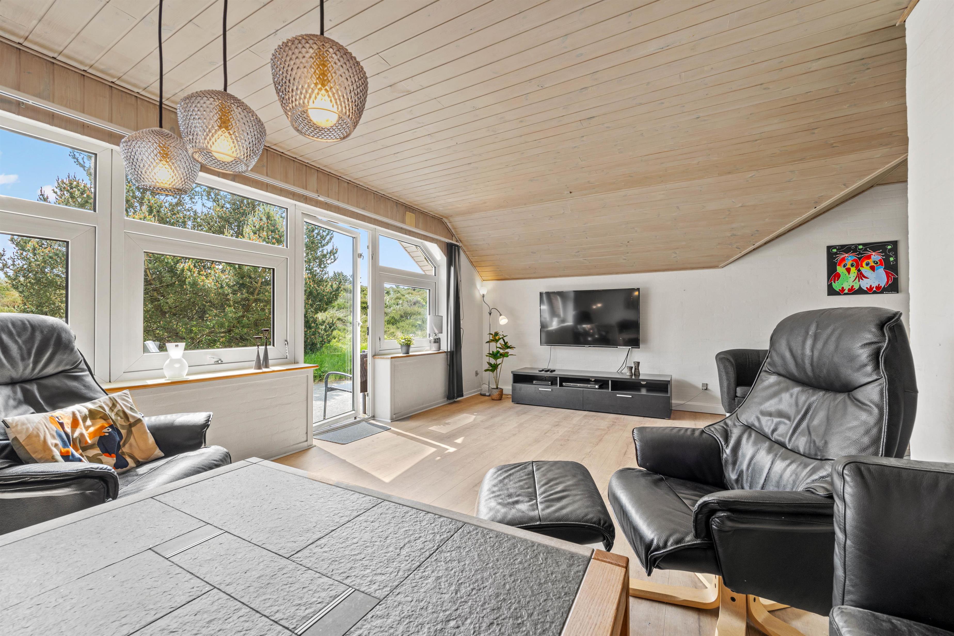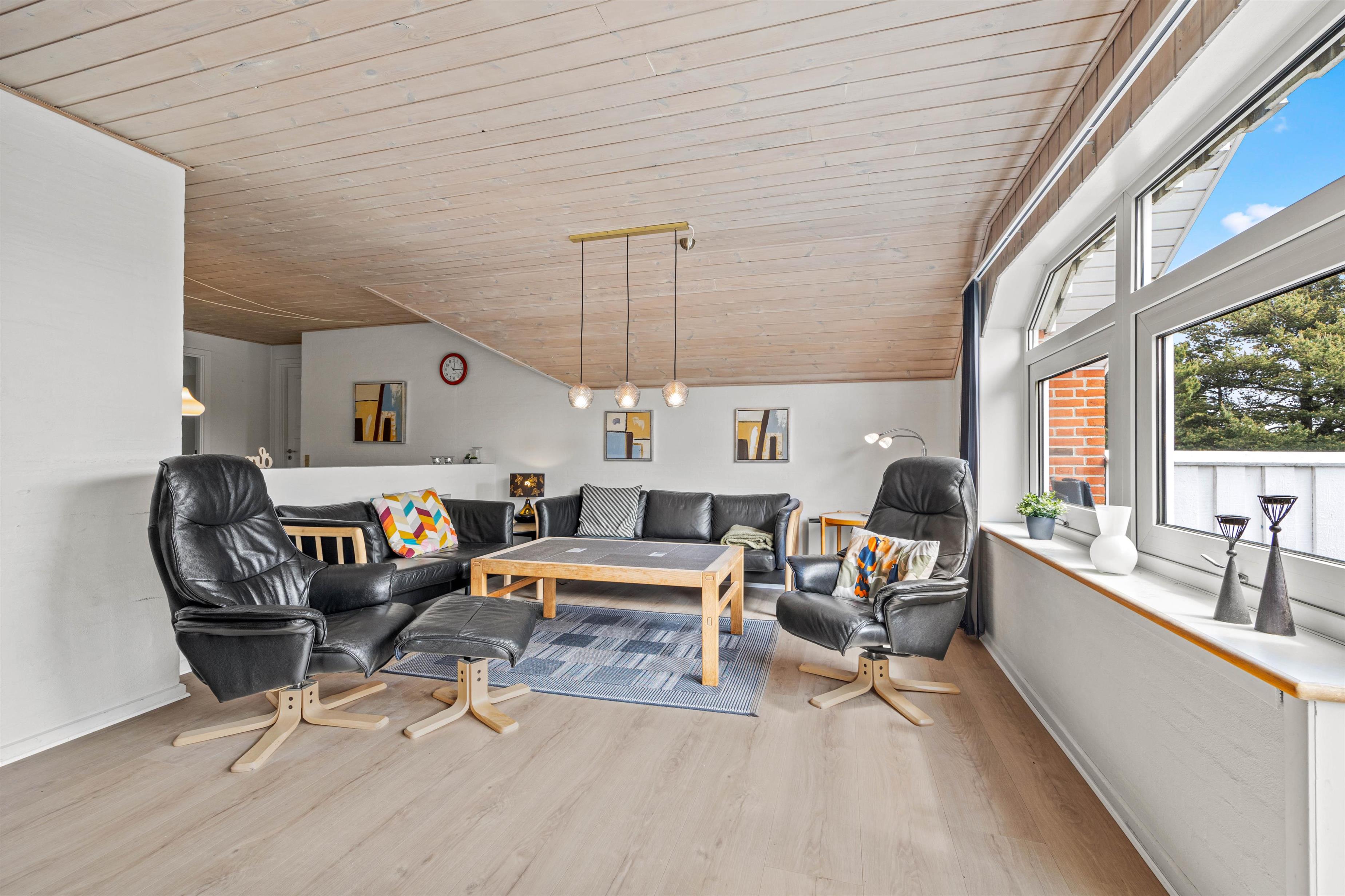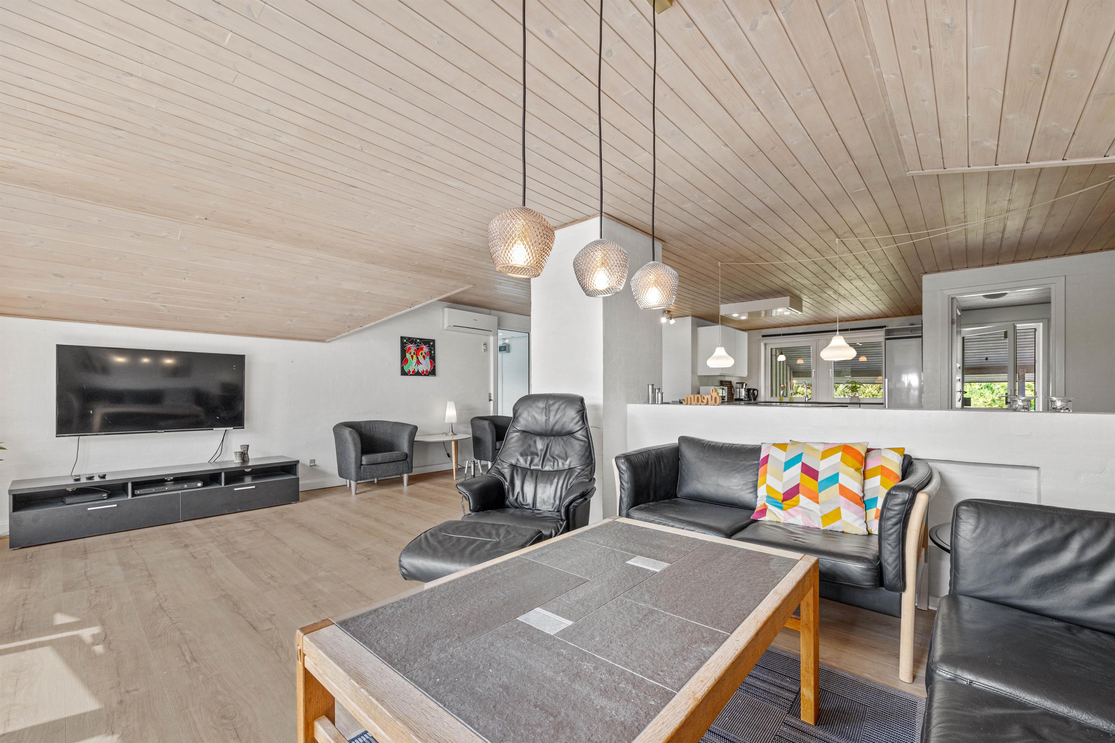 Samlingspunktet i det smukke feriehus på Vestergårdsvej 13 er det åbne plan. Med udsigt til poolområdet er stue, spisestue og køkken i åben forbindelse med hinanden. Det betyder, at I kan lave mad sammen og nyde aftenen ved spisebordet over et glas vin, mens børnene trækker sig tilbage til stuen og nyder en filmaften med friske popcorn fra mikroovnen. Den indbyggede pejs giver ekstra hygge med knitren fra ilden, og det store vinduesparti i stuen giver masser af naturligt lys ind i rummet. Hvis det er nødvendigt, kan man tænde for den energibesparende varmepumpe, som hurtigt og effektivt sørger for et behageligt indeklima og en god temperatur. De 10 feriegæster kan fordele sig på 4 soveværelser og lade batterierne op til den kommende dag. Der er i alt 3 dobbeltsenge og 2 køjesenge, som vil være et hit hos børnene.