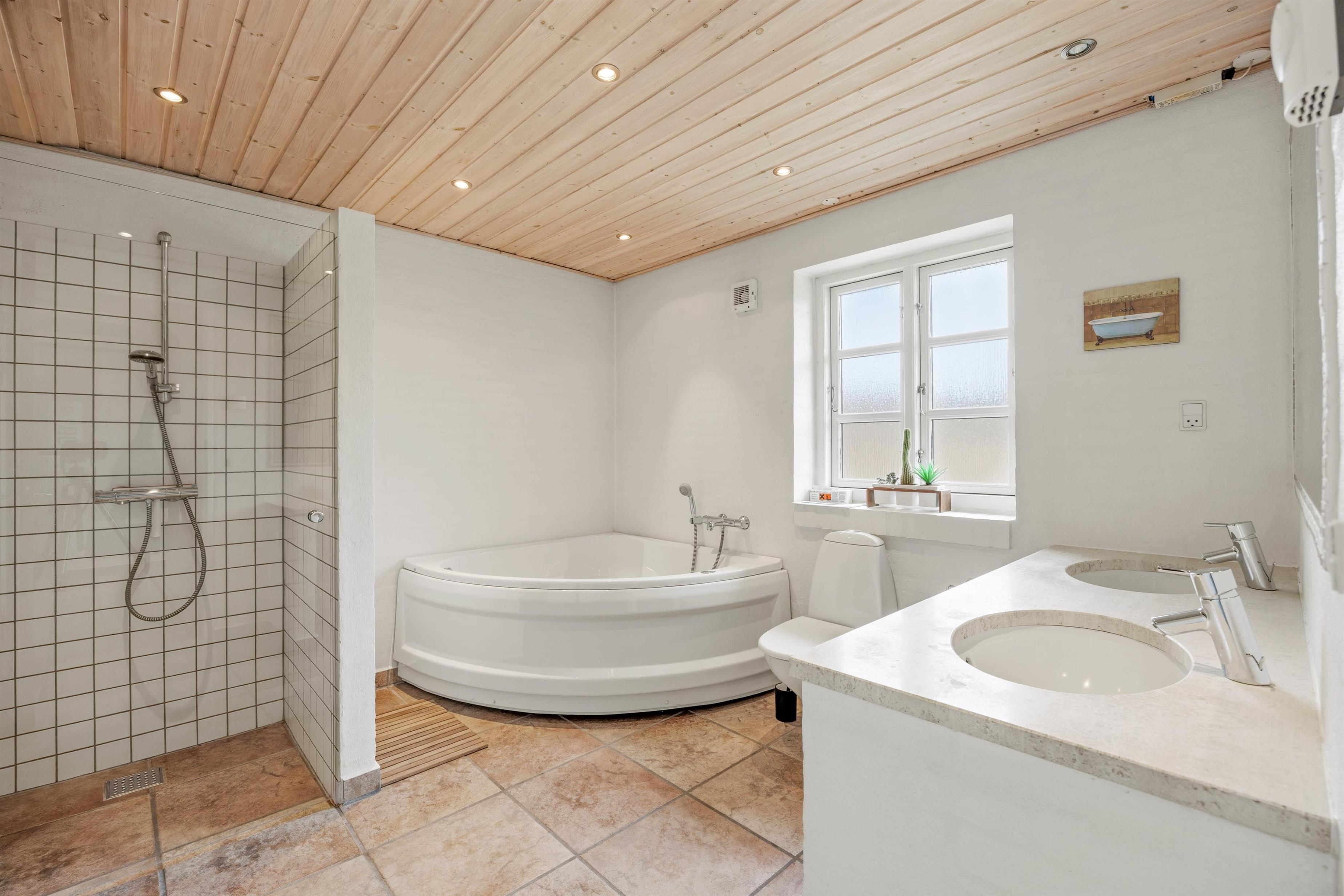 To moderne badeværelser, herunder et stort badeværelse med gulvvarme, bruseniche og indendørs spabad, indbyder til afslapning. Saunaen giver mulighed for at koble helt af. Store vinduer lukker lyset ind og giver udsigt til skov og natur – med en dejlig følelse af ro og privatliv.
