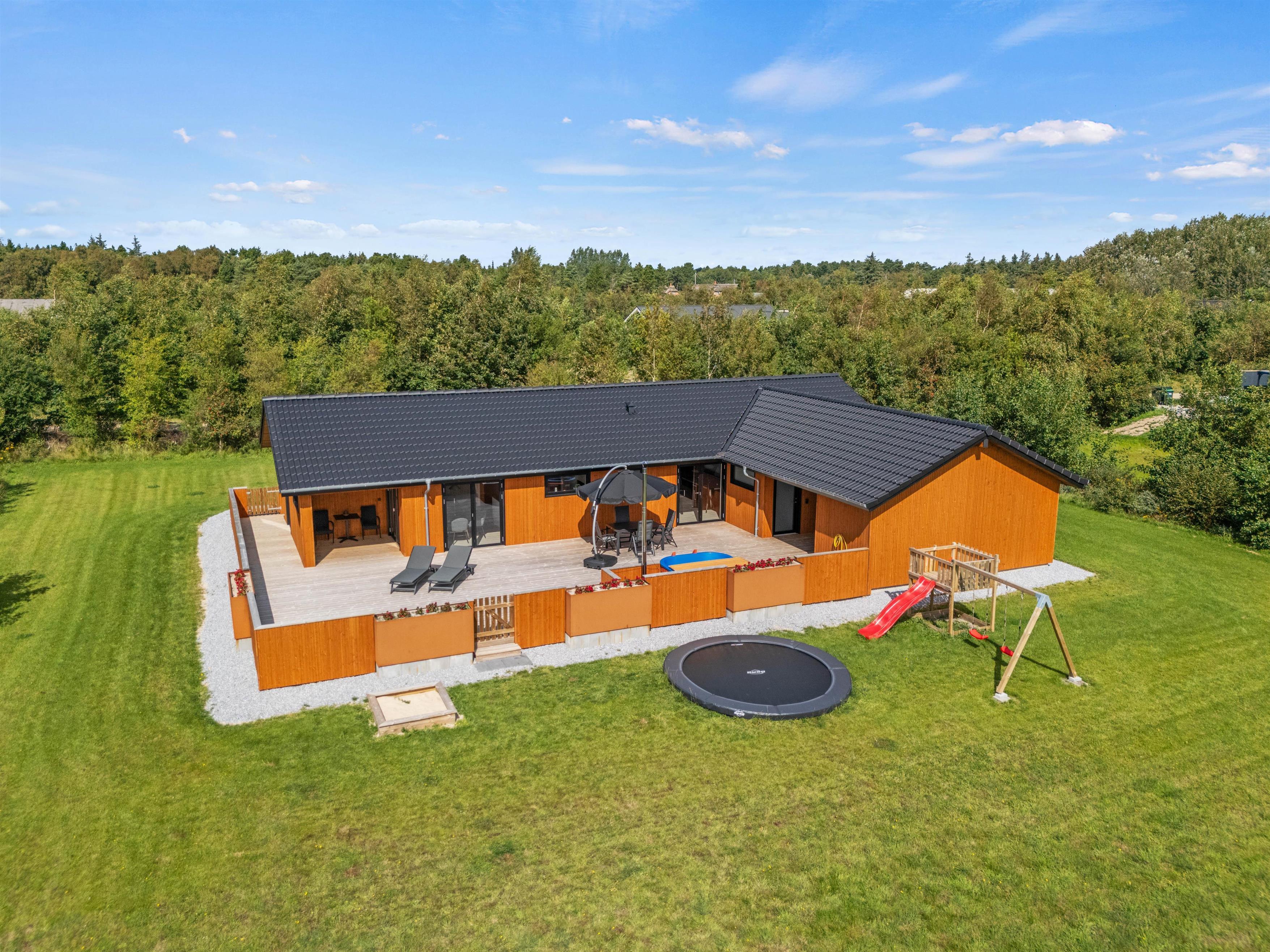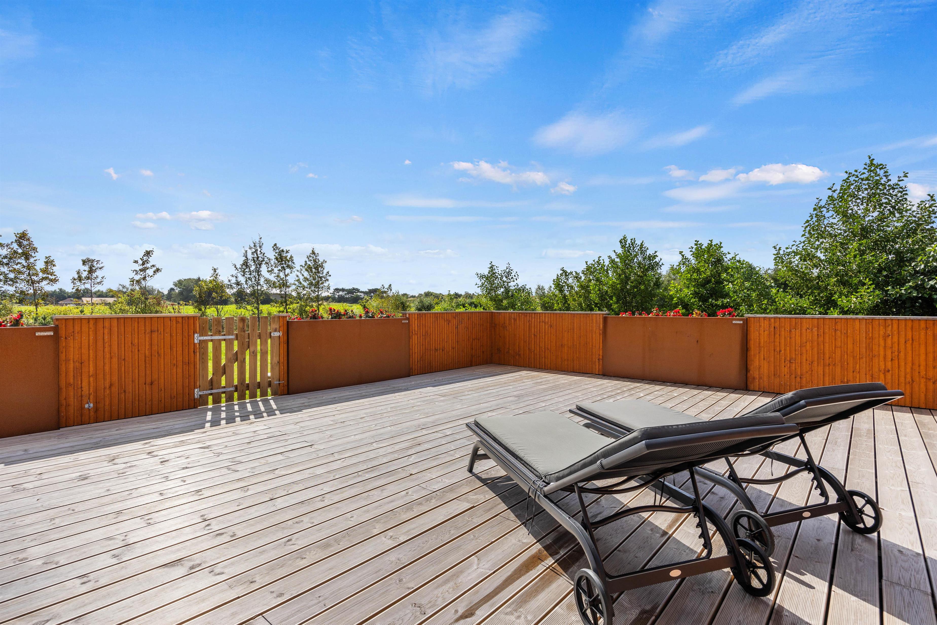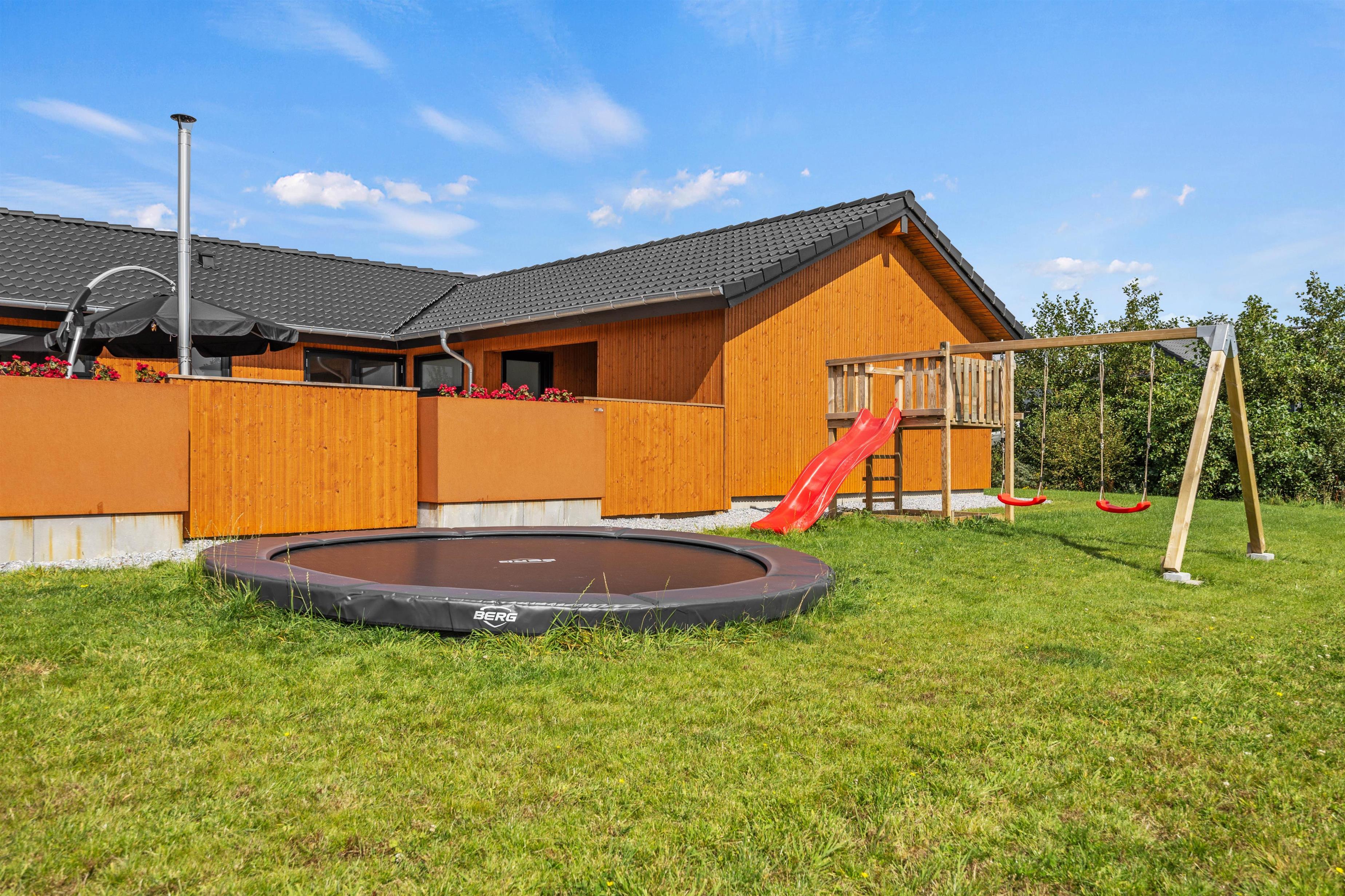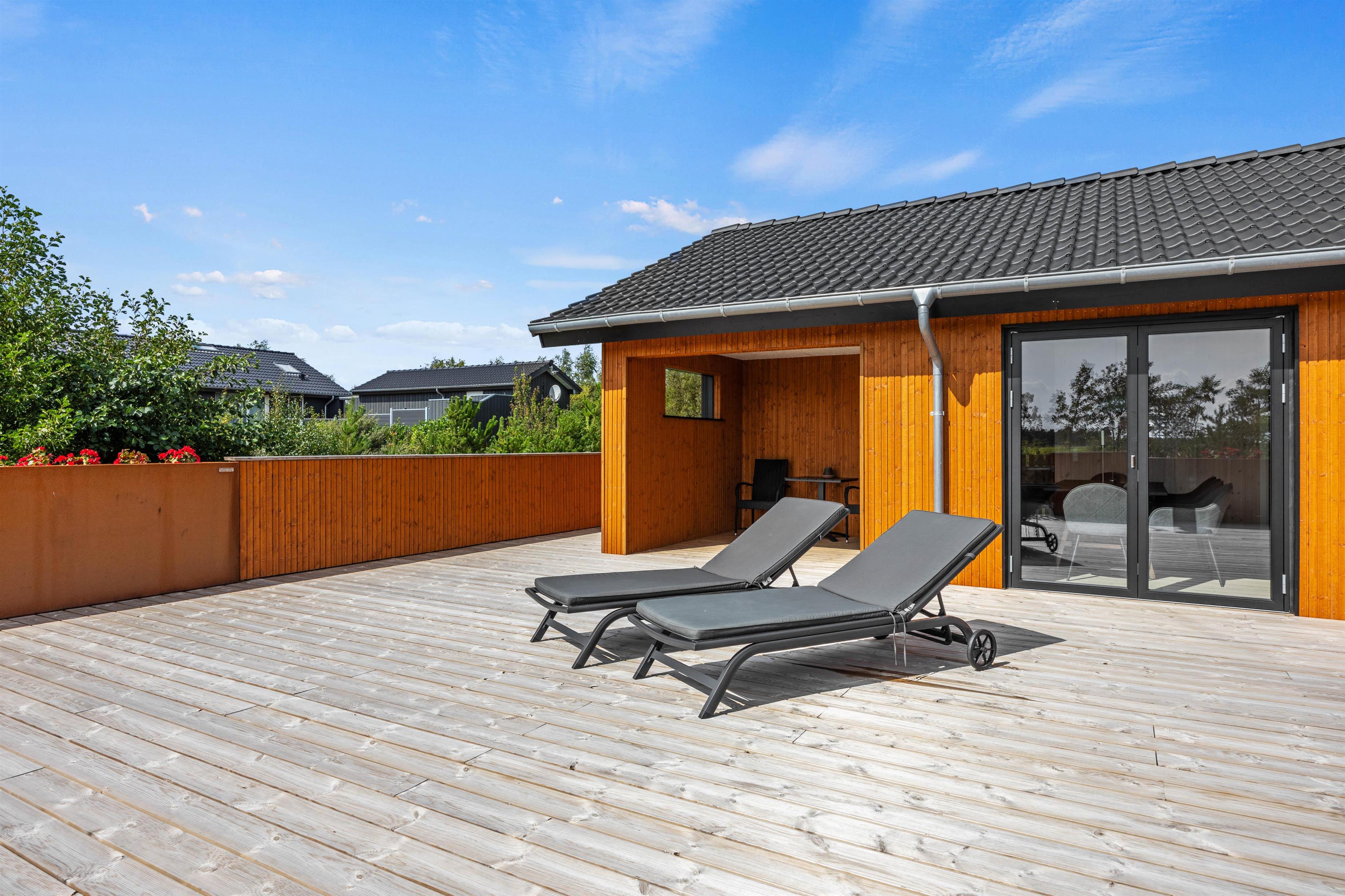 På den lukkede terrasse kan I nyde ferien i lange drag. Tag solbad i liggestolene og slå parasollen op, hvis det bliver for varmt. En opfriskning i vildmarksbadet kan I også arrangere, uanset om det er dag eller aften. Til børnene er der sandkasse, gynge og trampolin. Tænd op i gasgrillen til aften og nyd et lækkert grillmåltid sammen, imens skyggerne bliver lange. Bagefter kan I tage børn og hund med på en vandretur til Vadehavet og opleve tusmørket sammen.