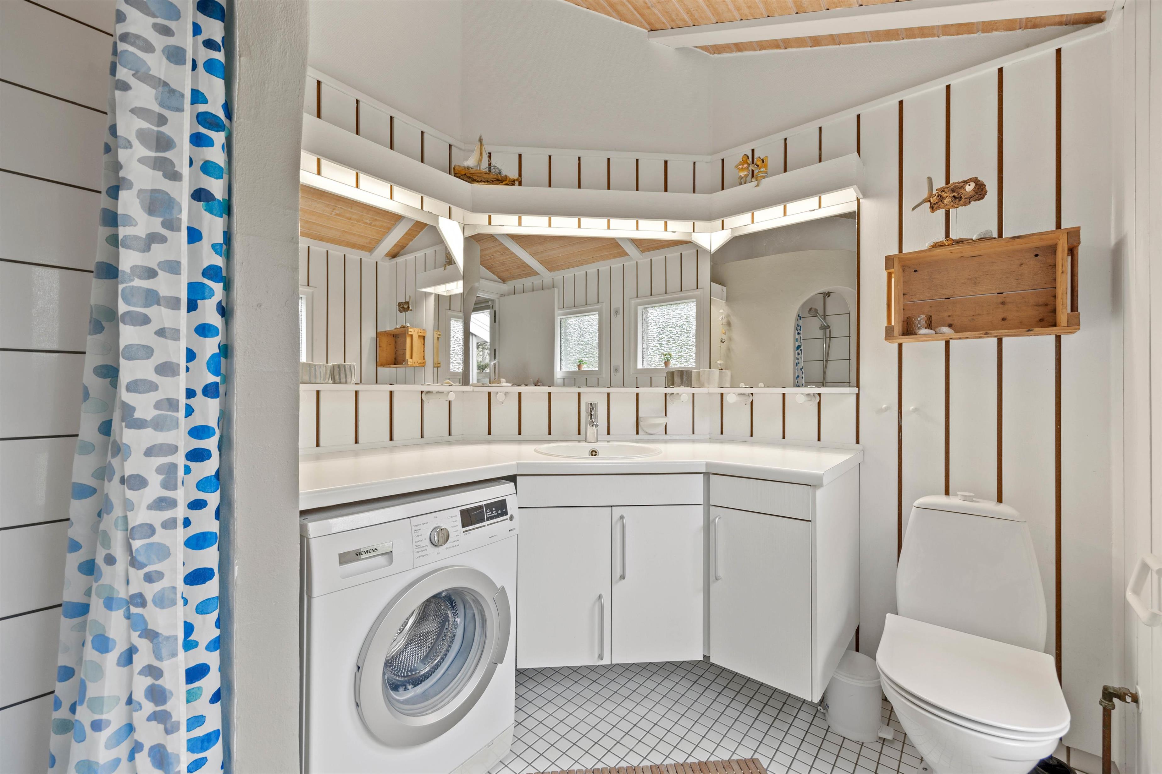 På det dejlige badeværelset, holdt i hvide farver, med en muret bruseniche, finder I også en vaskemaskine. Her er anlagt gulvvarme.