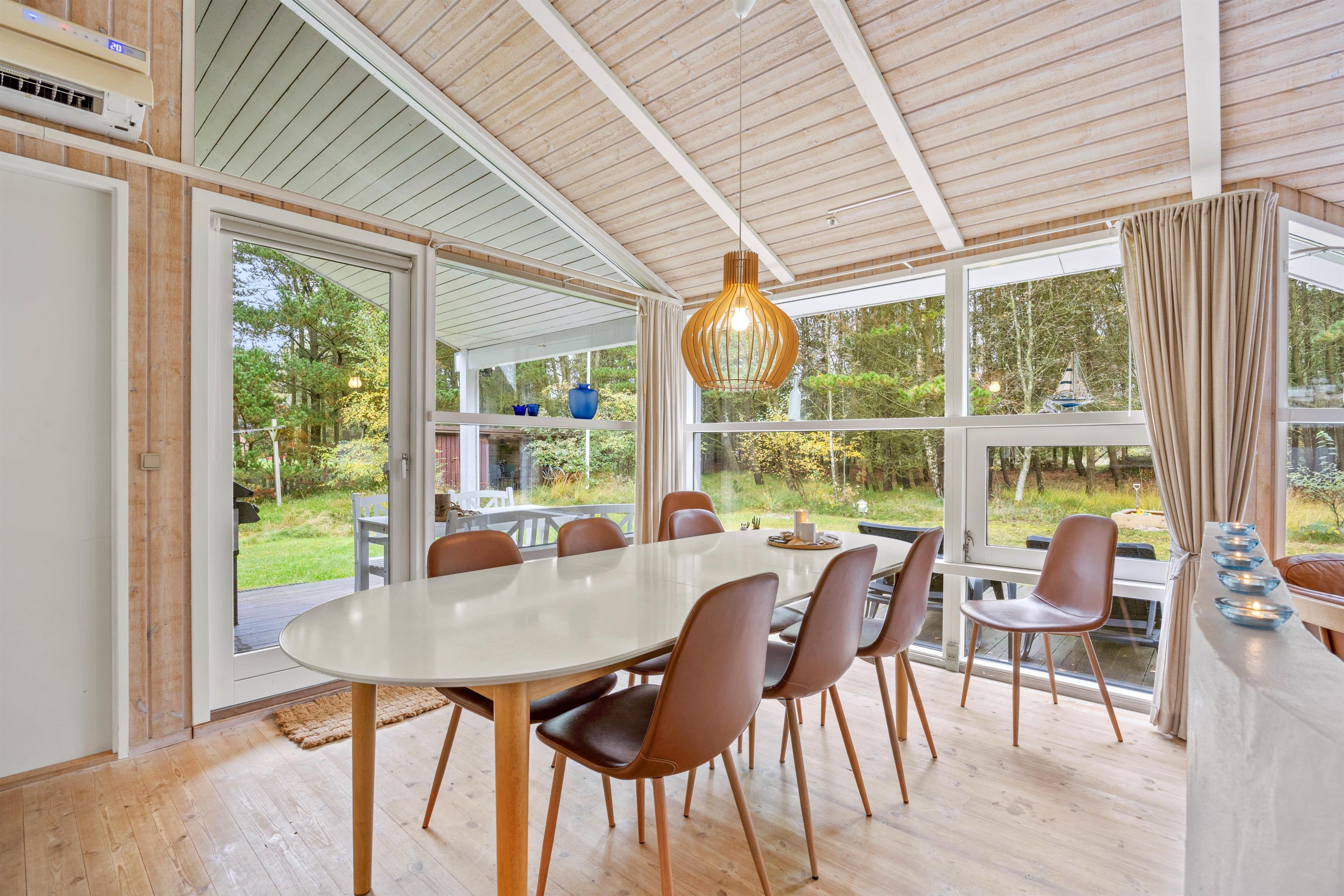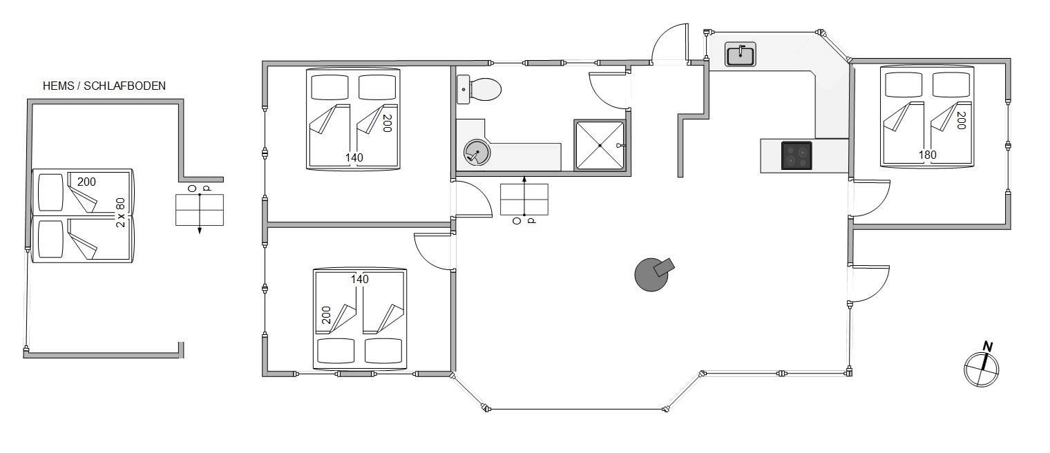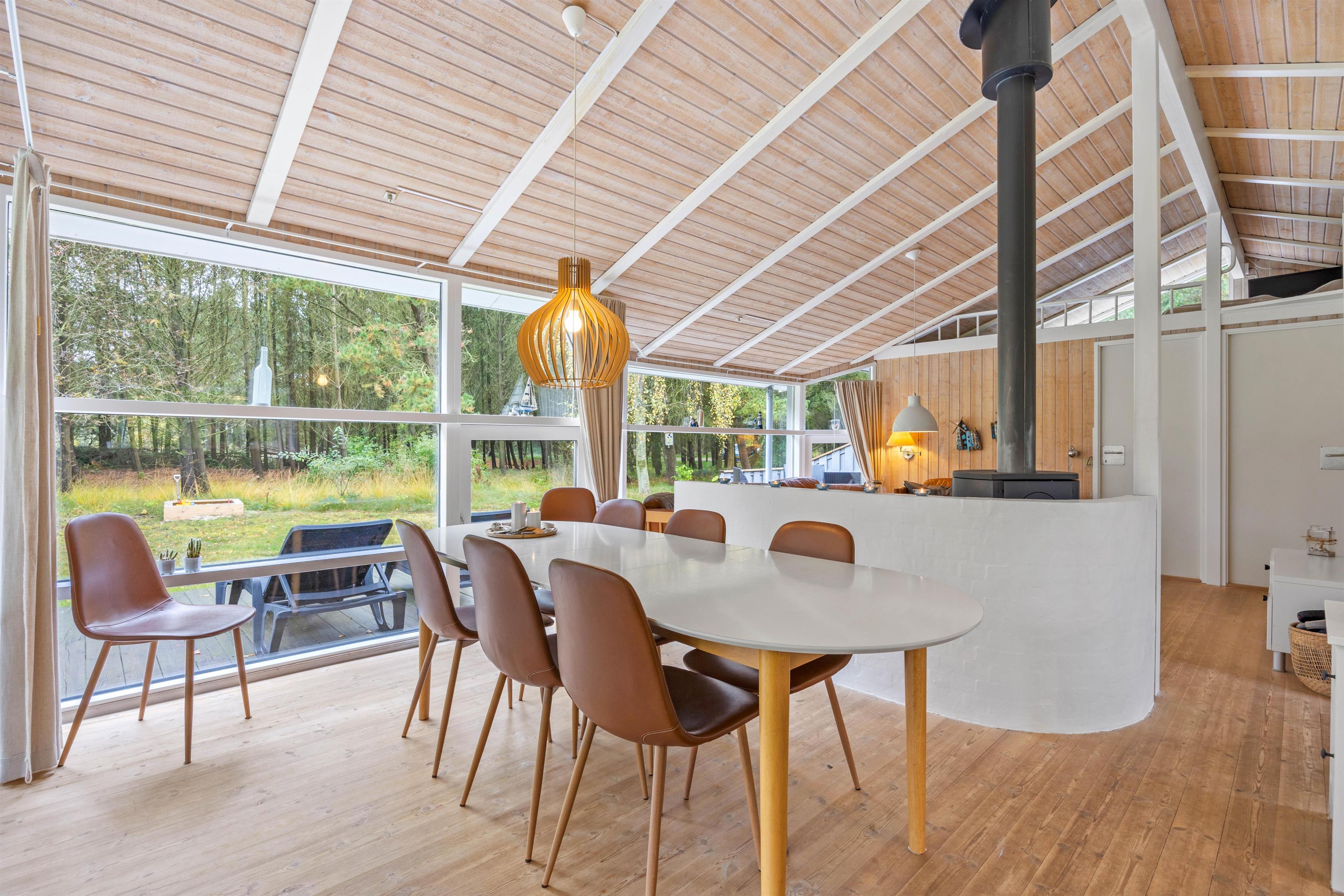 Feriehusets hjerte er stuen, der ligger i åben forbindelse med køkkenet med opvaskemaskine. Stuen er hyggeligt indrettet med komfortable møbler, og de store vinduer inviterer dagslyset indenfor. Brændeovnen er centralt placeret, og her kan I samles til afslapning på sofaen eller brætspilsaften. Den energibesparende varmepumpe sørger for et behageligt indeklima, hele året rundt.