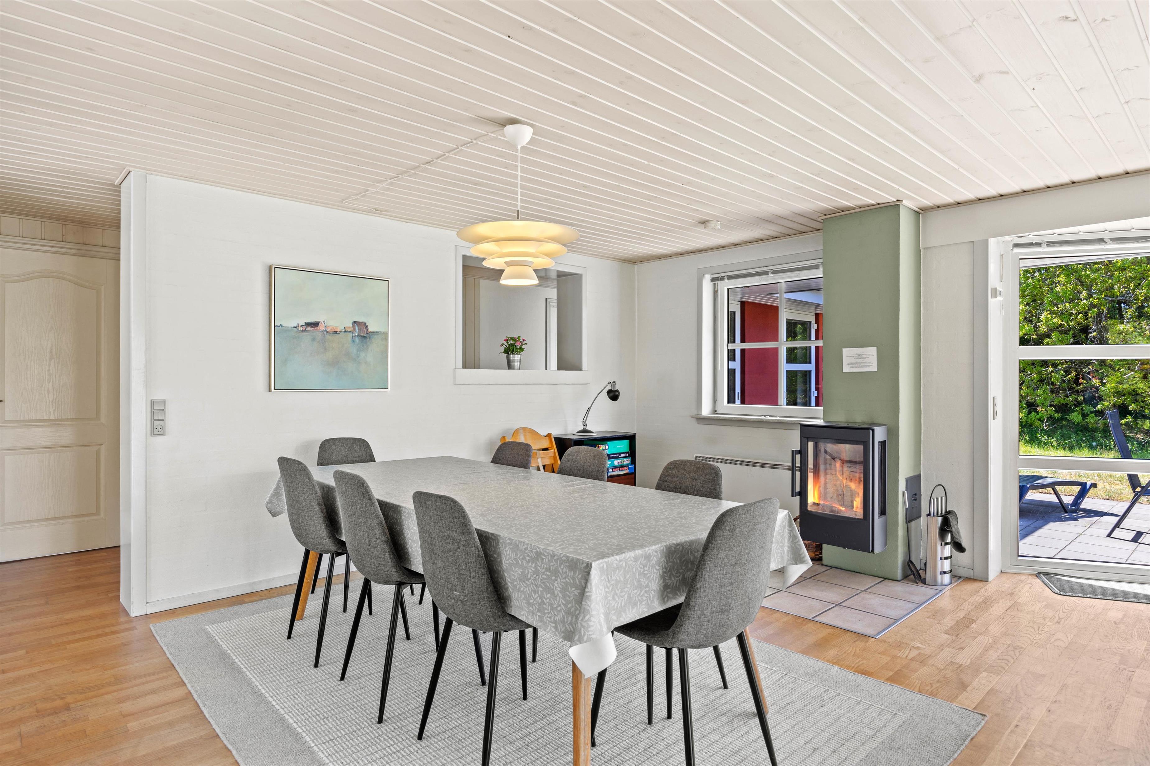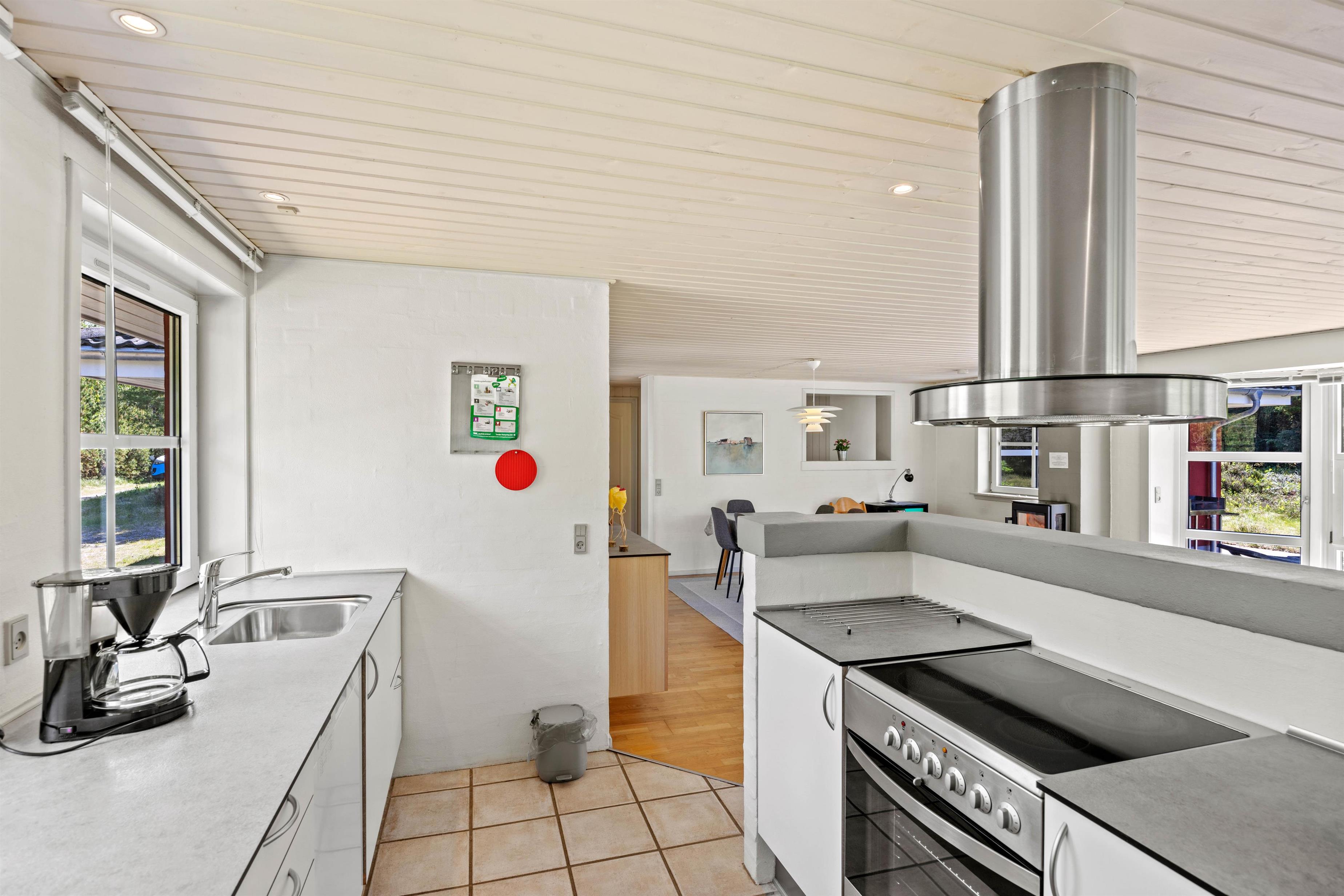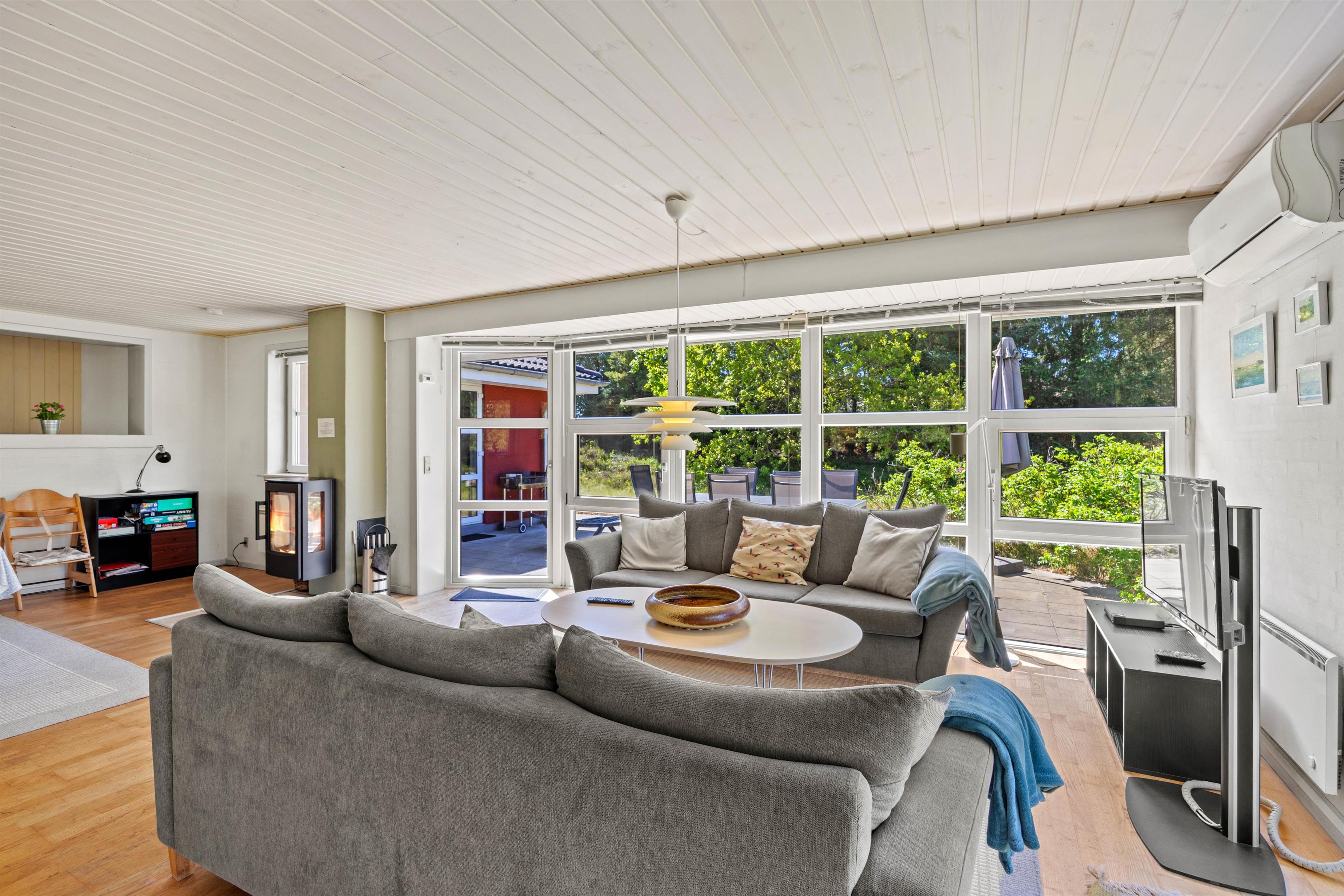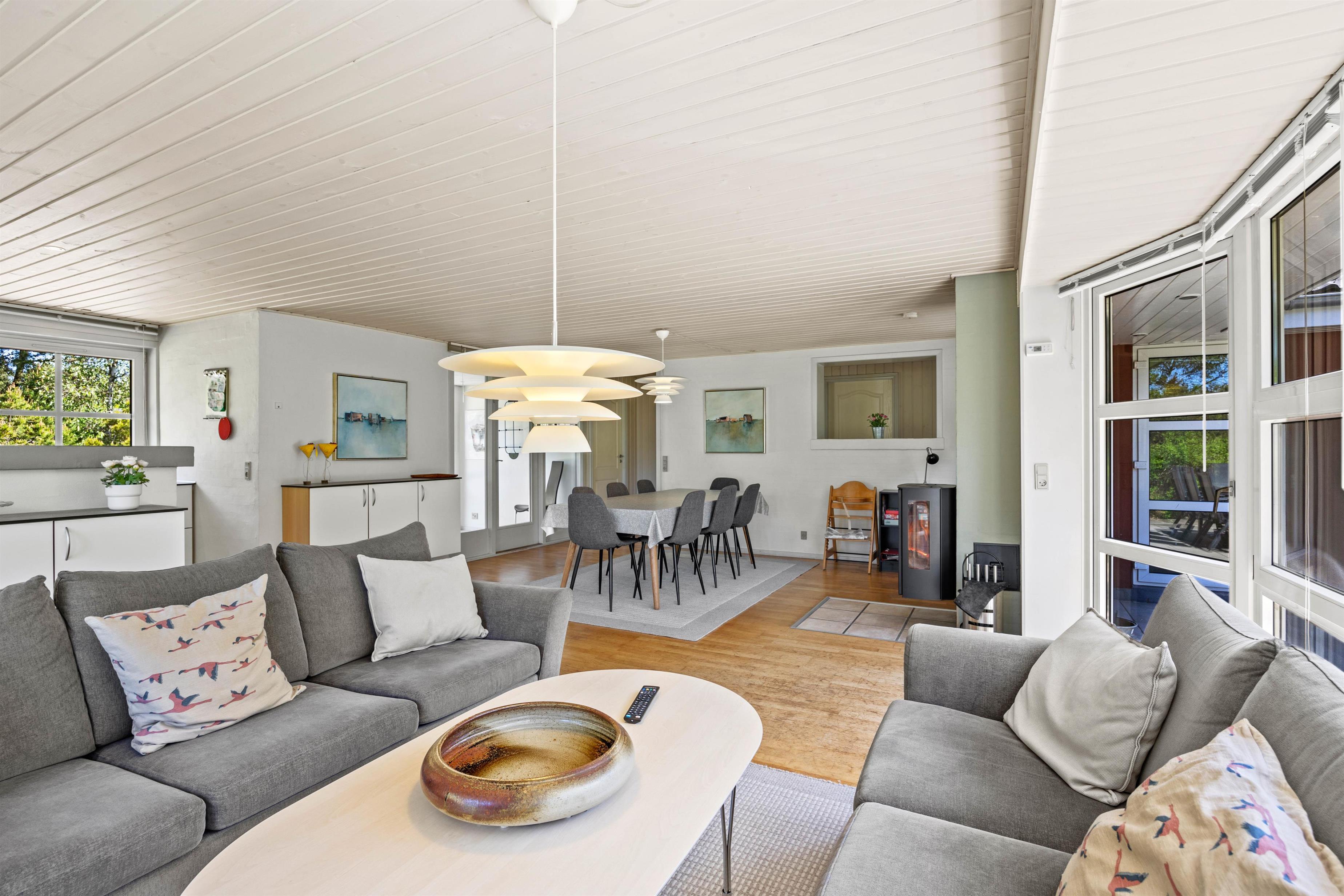 Den lyse stue fungerer som sommerhusets hjerte, hvor store vinduespartier lukker naturens skiftende lys ind og inviterer til stille morgener med kaffe eller rolige aftener med familiehygge. Her kan I samles om brætspil eller en god bog med udsigt til haven, mens brændeovnen i stuen sørger for varme og stemning, når vejret er køligt. Den private sauna inviterer også til velvære efter en dag fuld af aktiviteter. Det tilstødende køkken er fuldt udstyret med opvaskemaskine, mikroovn, køleskab med integreret frostboks og el-komfur med ovn, så I nemt kan tilberede lækre måltider, som I kan nyde sammen om aftenen i den hjemlige ro.