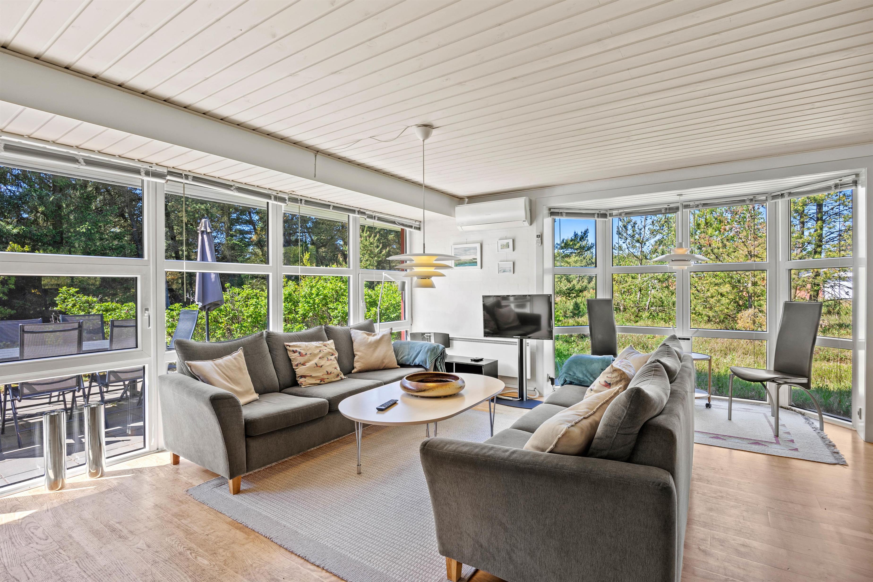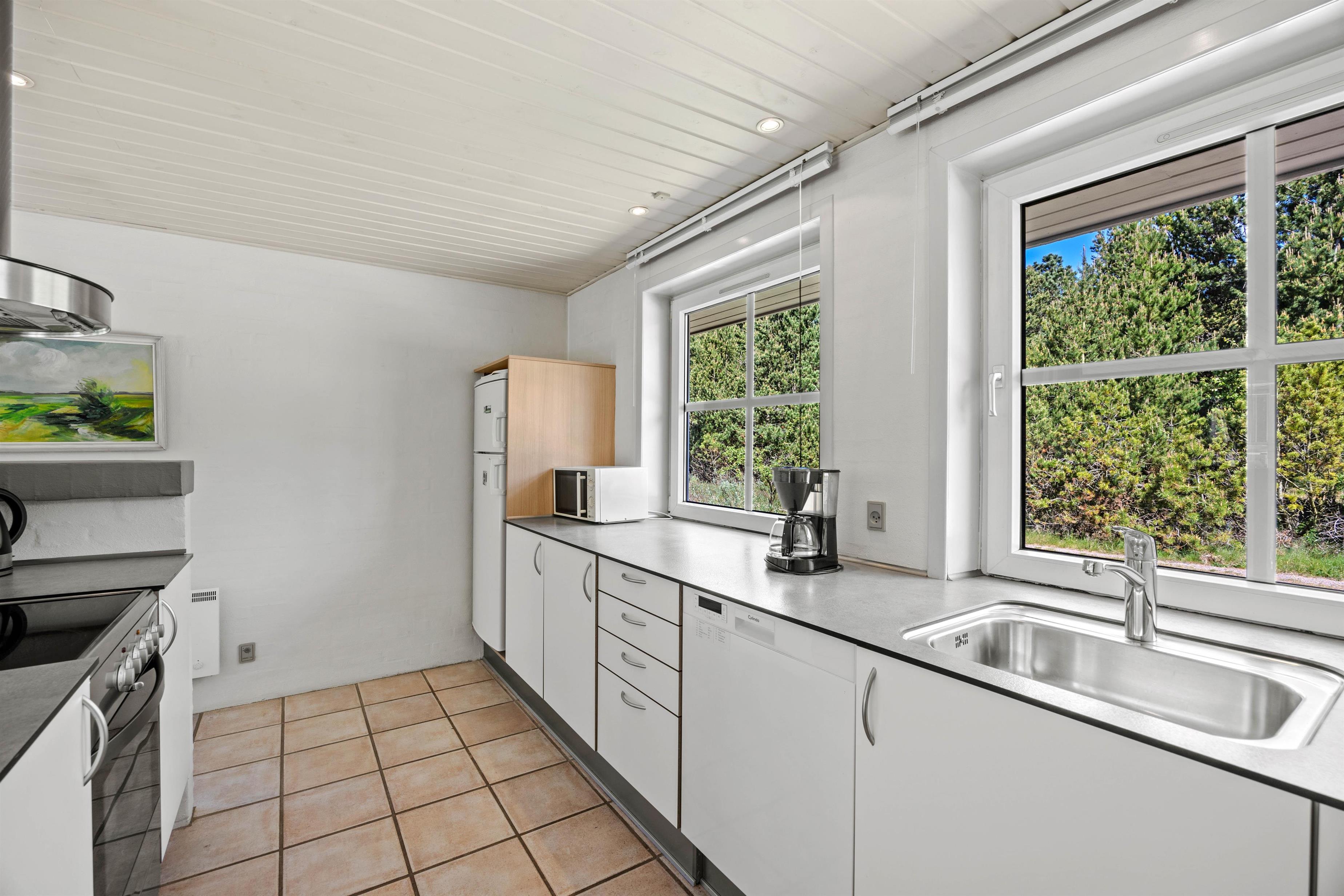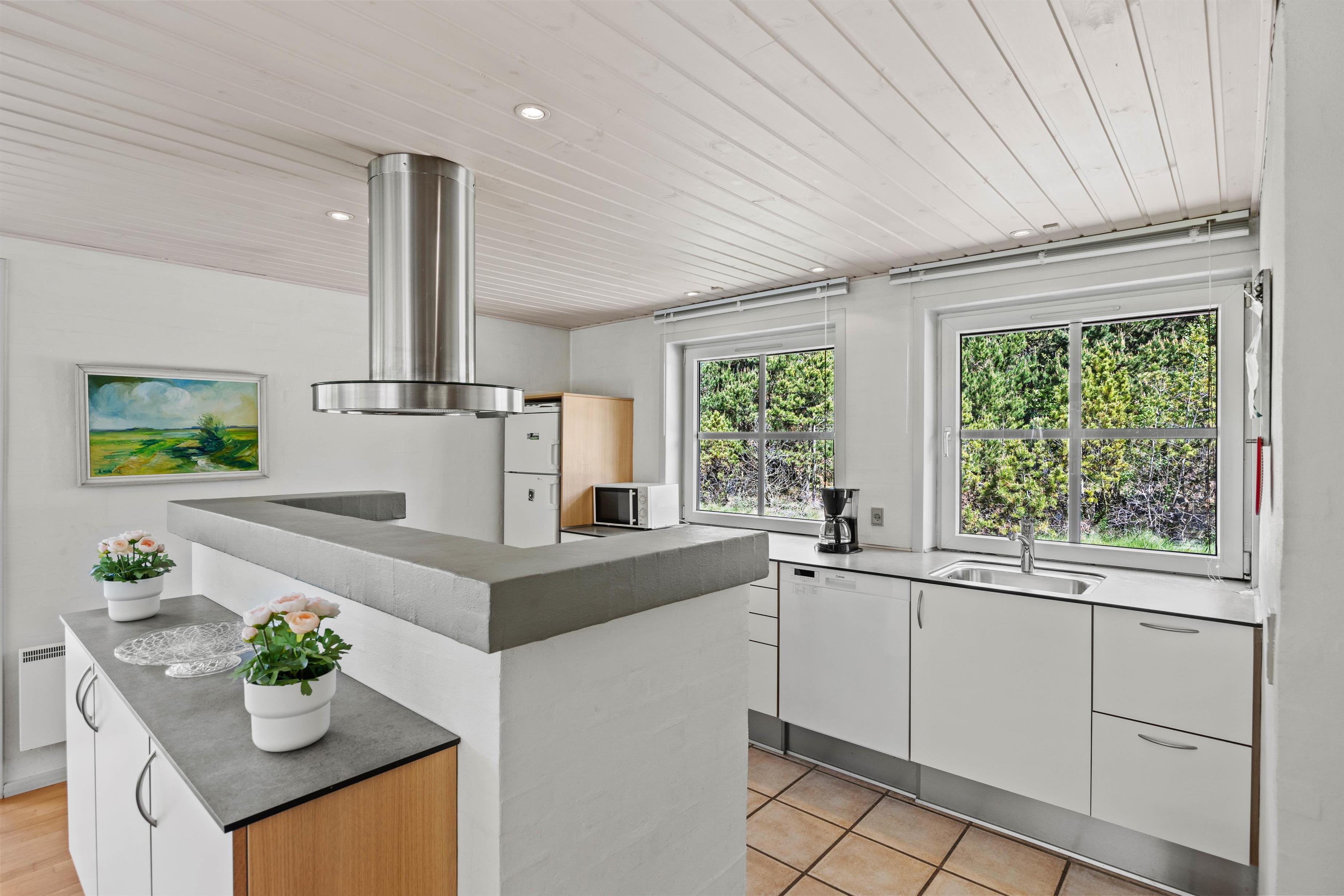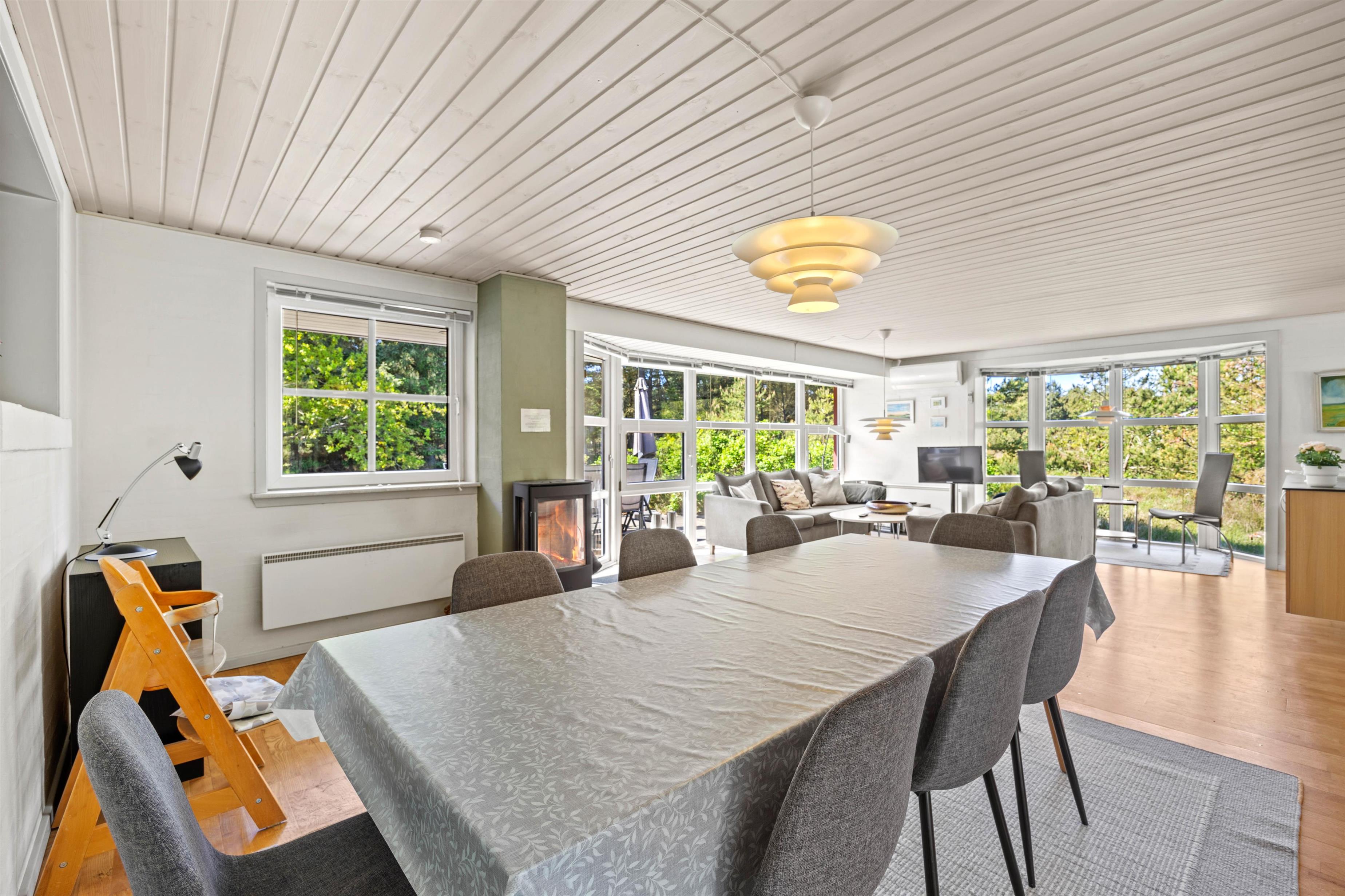 Den lyse stue fungerer som sommerhusets hjerte, hvor store vinduespartier lukker naturens skiftende lys ind og inviterer til stille morgener med kaffe eller rolige aftener med familiehygge. Her kan I samles om brætspil eller en god bog med udsigt til haven, mens brændeovnen i stuen sørger for varme og stemning, når vejret er køligt. Den private sauna inviterer også til velvære efter en dag fuld af aktiviteter. Det tilstødende køkken er fuldt udstyret med opvaskemaskine, mikroovn, køleskab med integreret frostboks og el-komfur med ovn, så I nemt kan tilberede lækre måltider, som I kan nyde sammen om aftenen i den hjemlige ro.