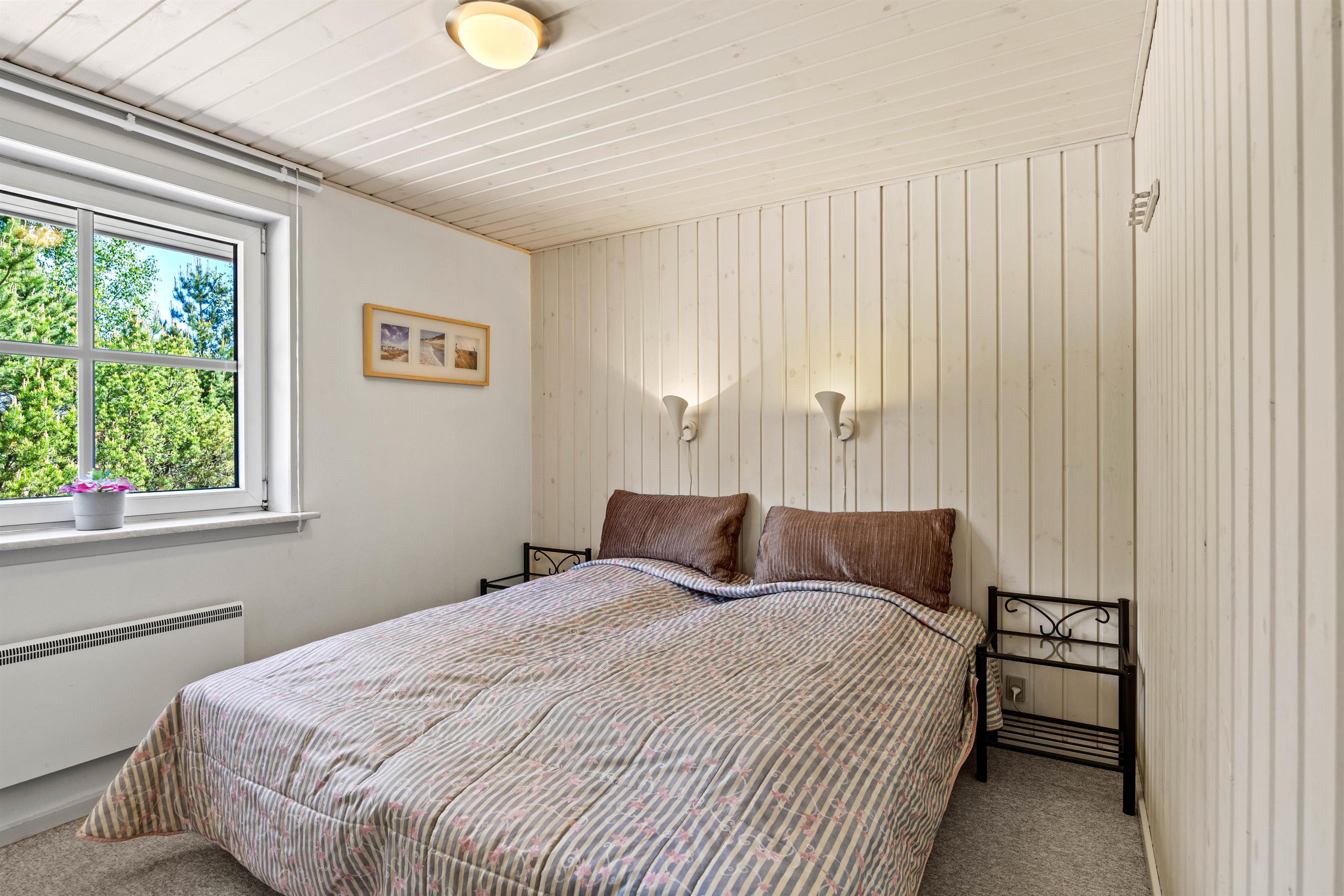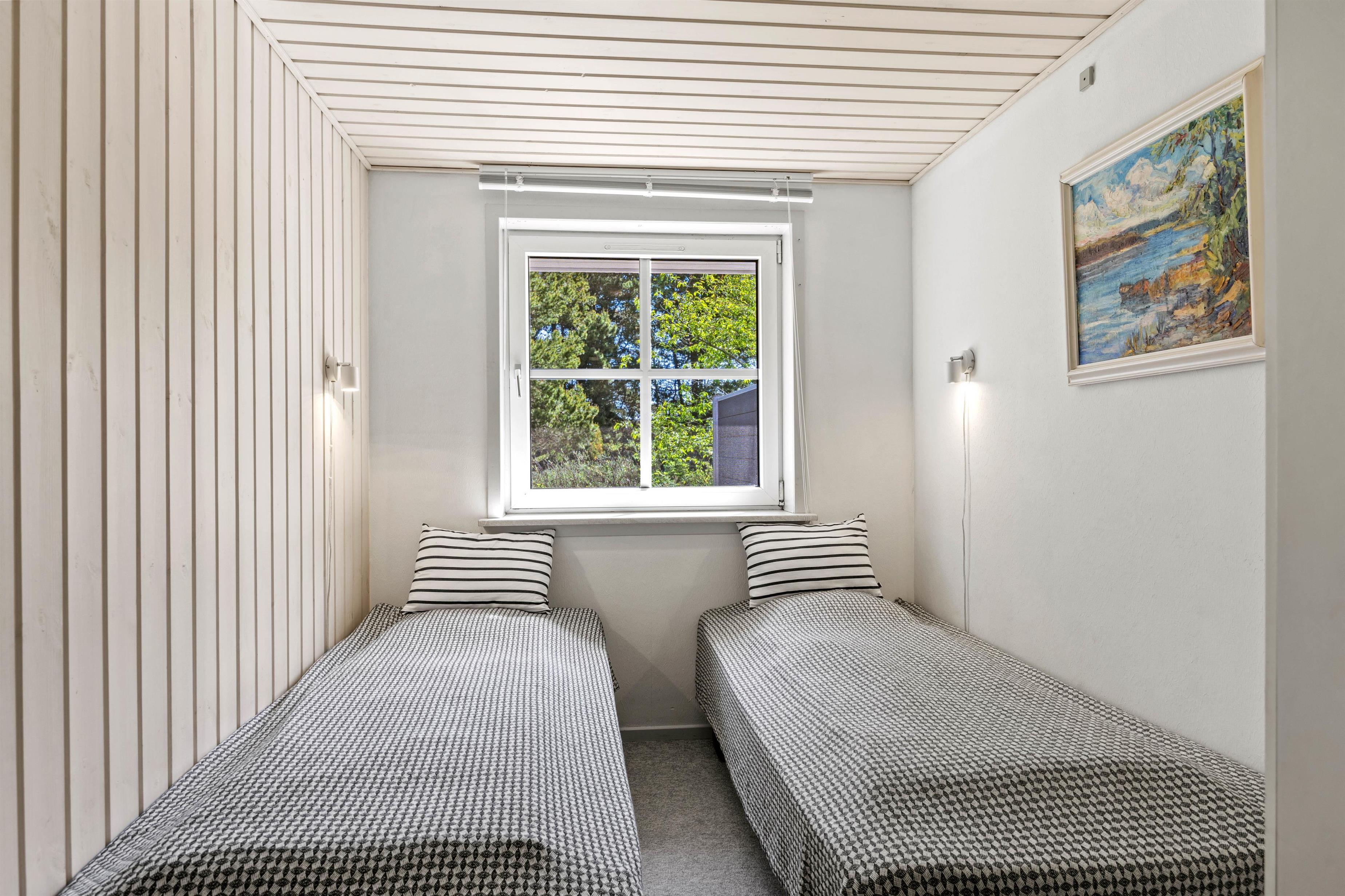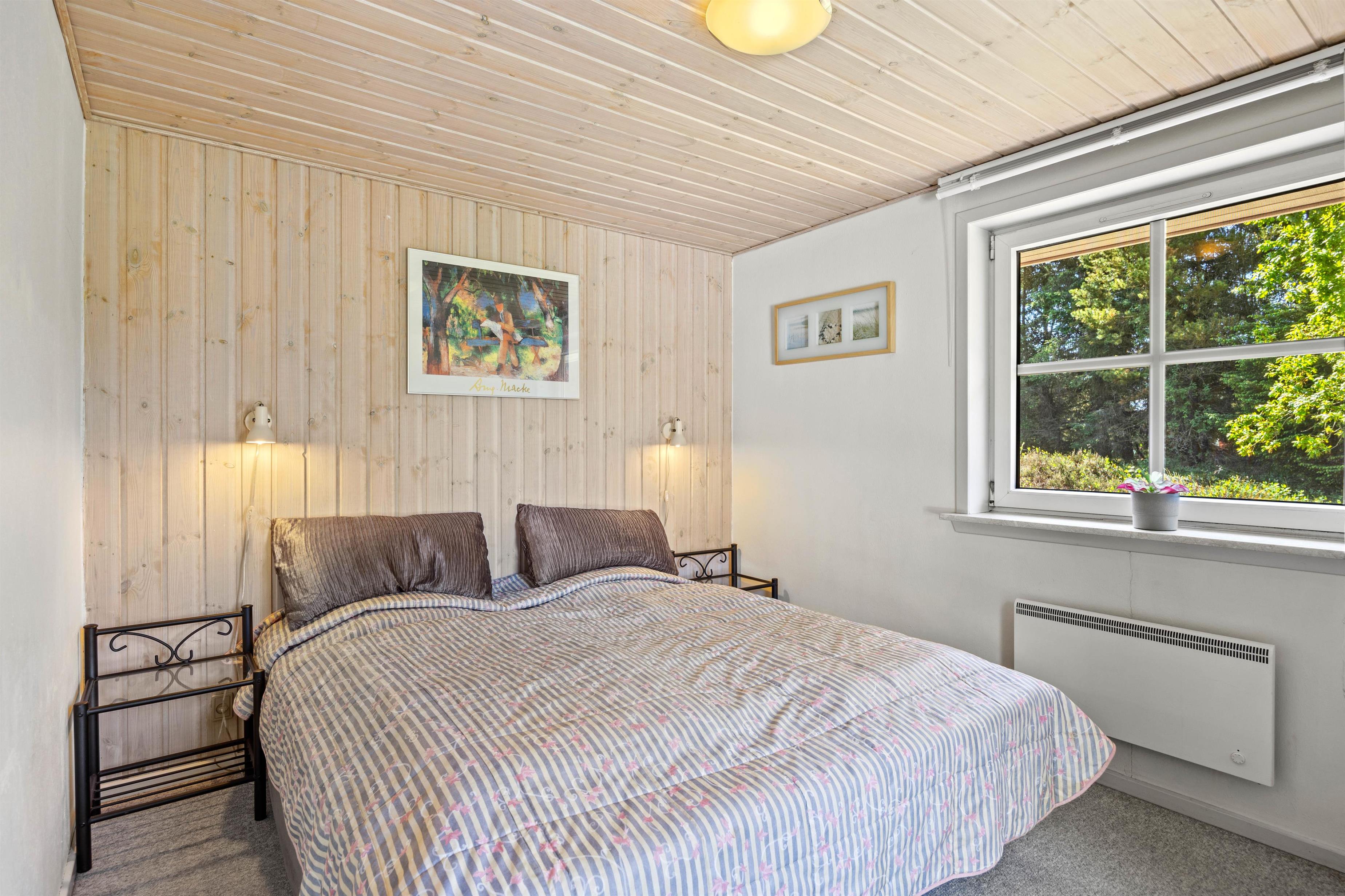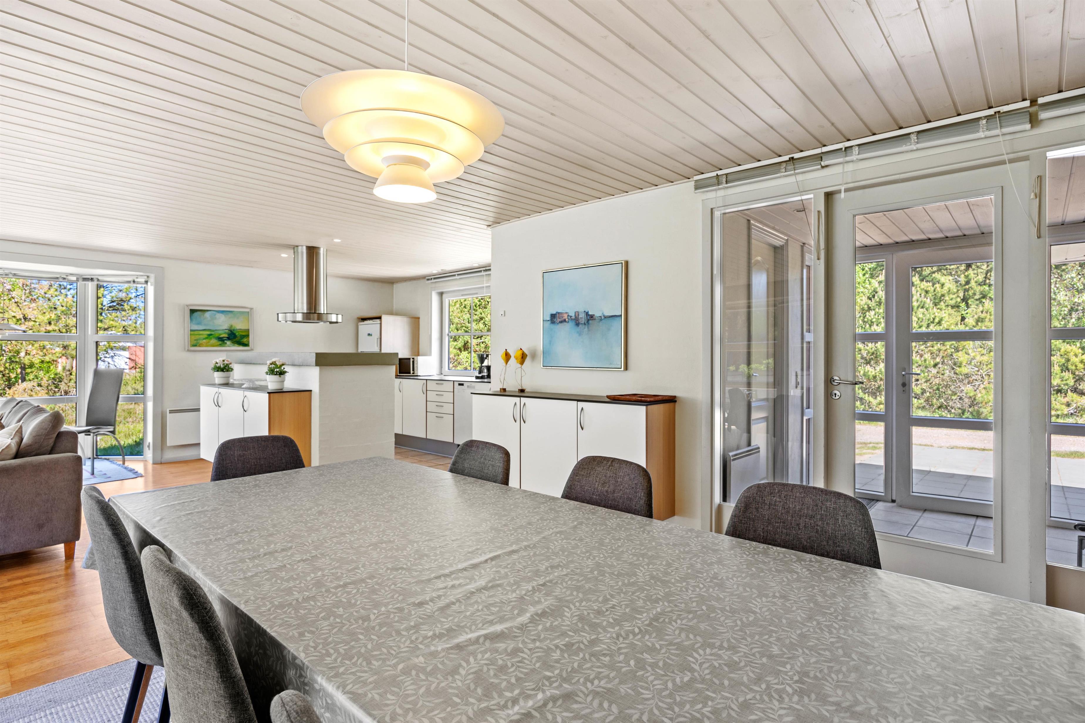 Den lyse stue fungerer som sommerhusets hjerte, hvor store vinduespartier lukker naturens skiftende lys ind og inviterer til stille morgener med kaffe eller rolige aftener med familiehygge. Her kan I samles om brætspil eller en god bog med udsigt til haven, mens brændeovnen i stuen sørger for varme og stemning, når vejret er køligt. Den private sauna inviterer også til velvære efter en dag fuld af aktiviteter. Det tilstødende køkken er fuldt udstyret med opvaskemaskine, mikroovn, køleskab med integreret frostboks og el-komfur med ovn, så I nemt kan tilberede lækre måltider, som I kan nyde sammen om aftenen i den hjemlige ro.