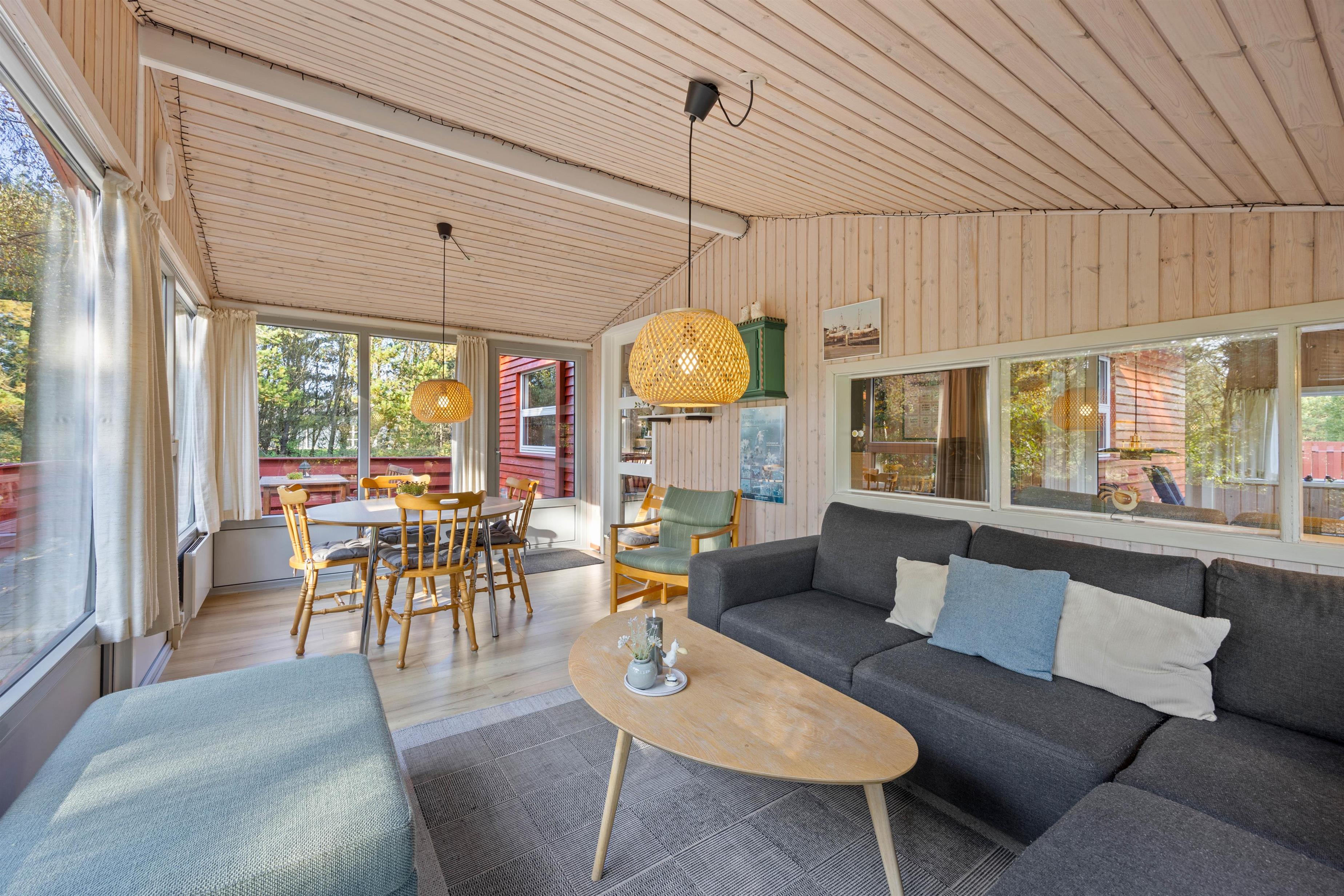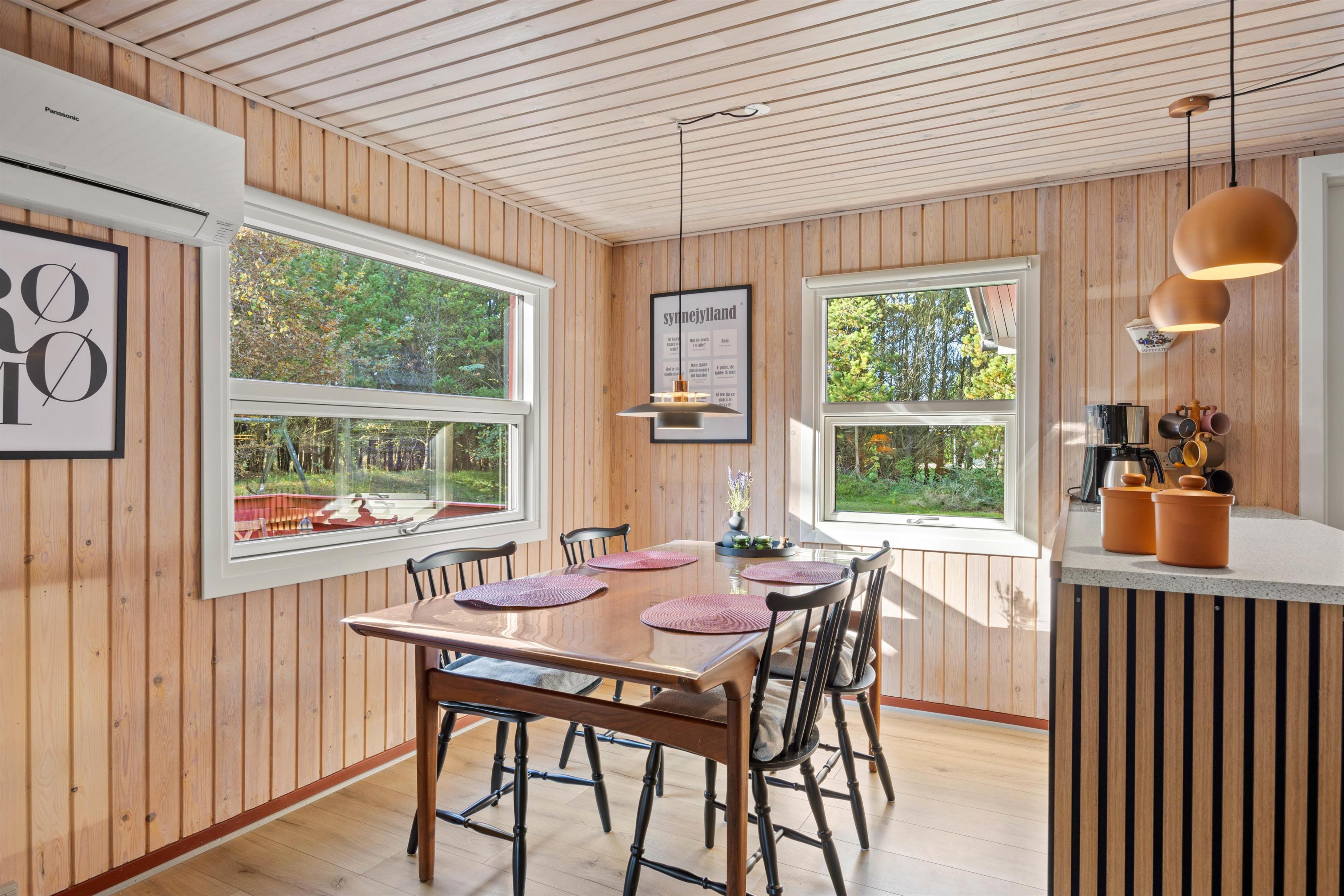 På Dyssebjergvej 3 vil du straks fornemme feriestemningen, når du træder ind ad døren. Stuen er indrettet med åbent plan i forbindelse med det åbne køkken og spiseplads. Slæng dig i sofaen og nyd ildens knitren i brændeovnen i baggrunden, eller se en film sammen. Der er en energibesparende varmepumpe, som hurtigt og effektivt sørger for et behageligt indeklima og en god temperatur. Tv'et er udrustet med Chromecast.