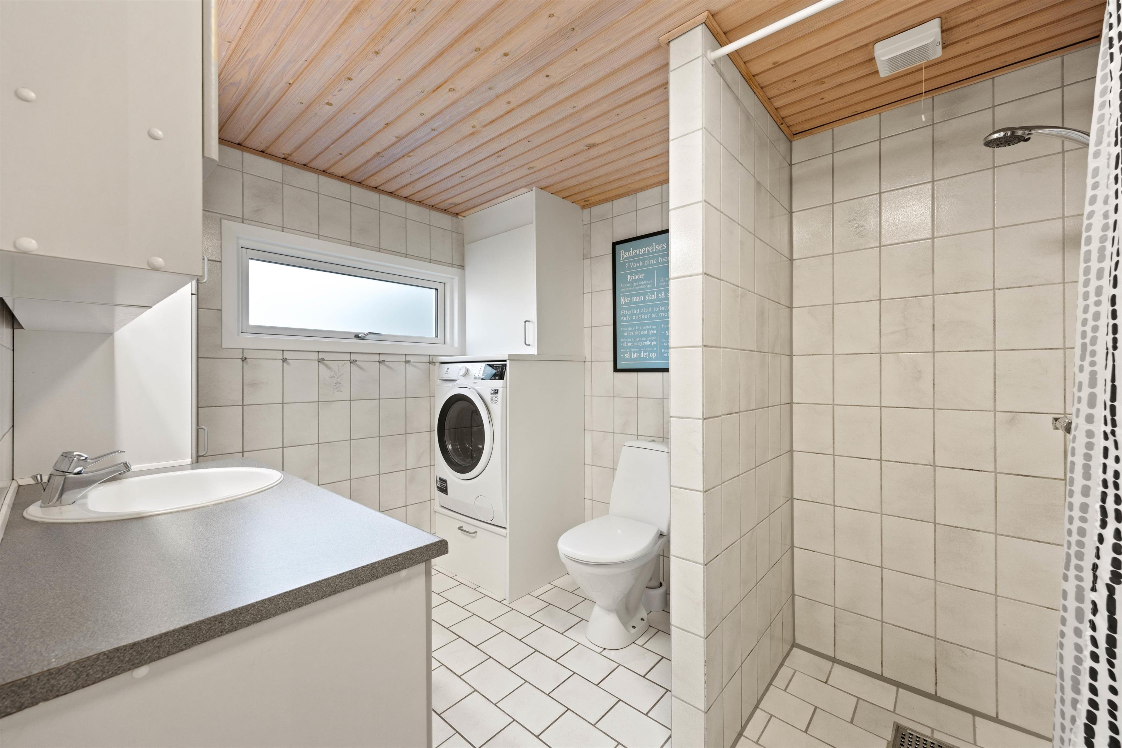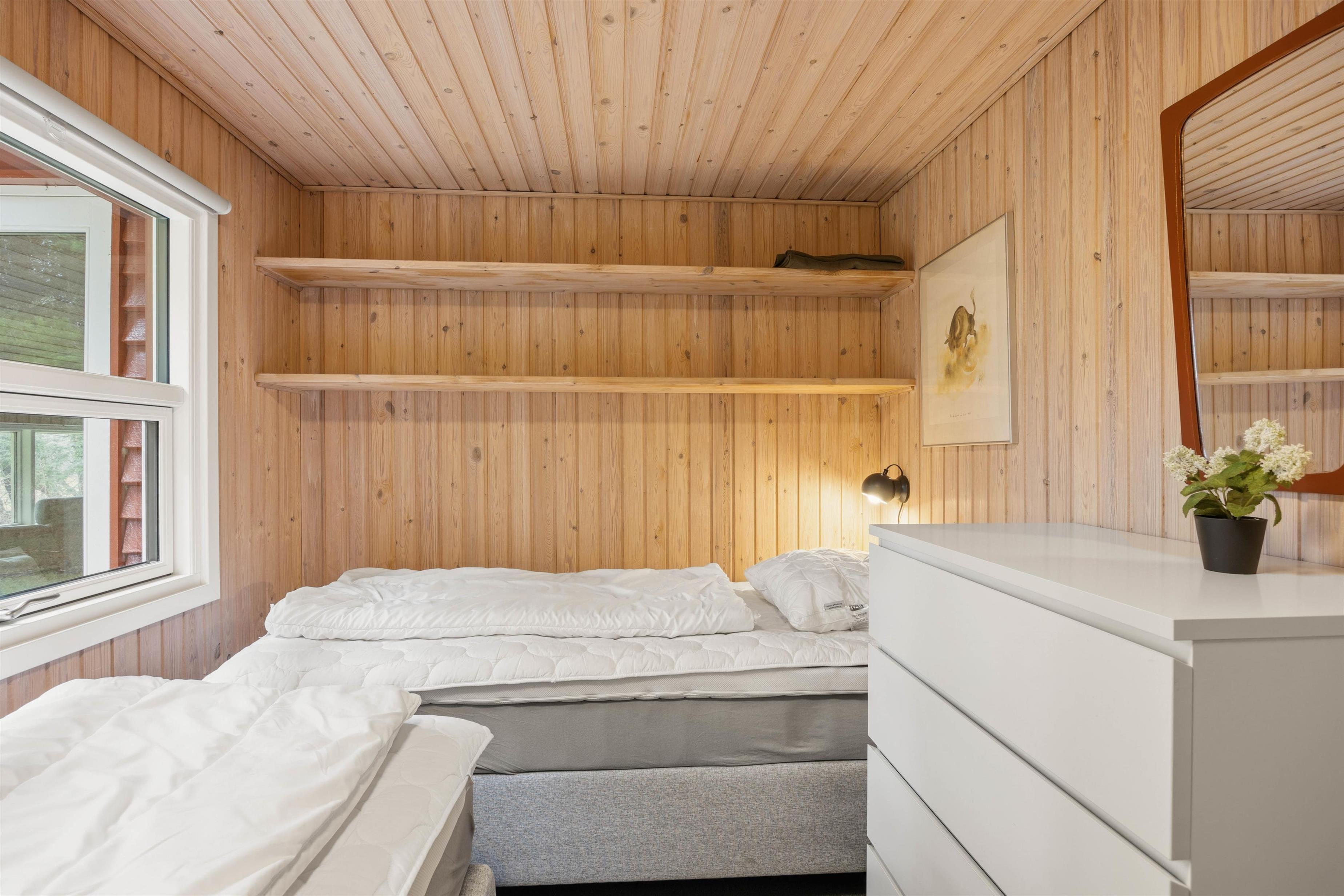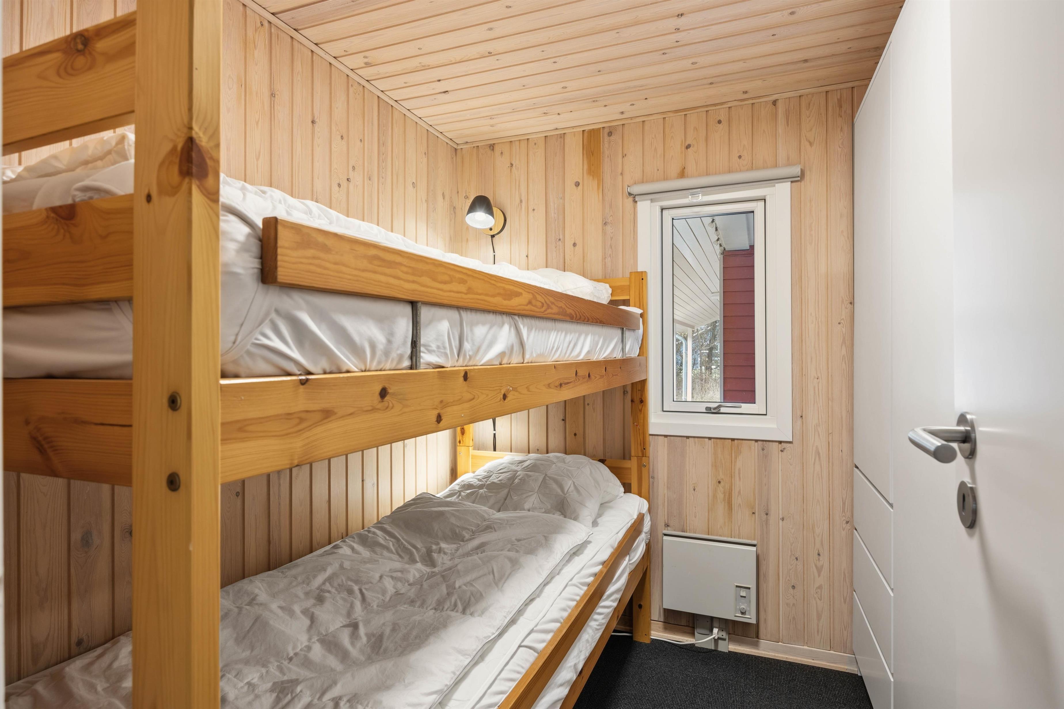 Badeværelset med dagslys er udstyret med en praktisk bruser og gulvvarme. Når dagen går på hæld, er der 3 hyggelige soveværelser til en god nats søvn i feriehuset. Det ene er indrettet med 1 dobbeltseng, det næste med 2 enkeltsenge og det tredje med 1 køjeseng - så I kan fordele jer, som det passer jer bedst hver især.