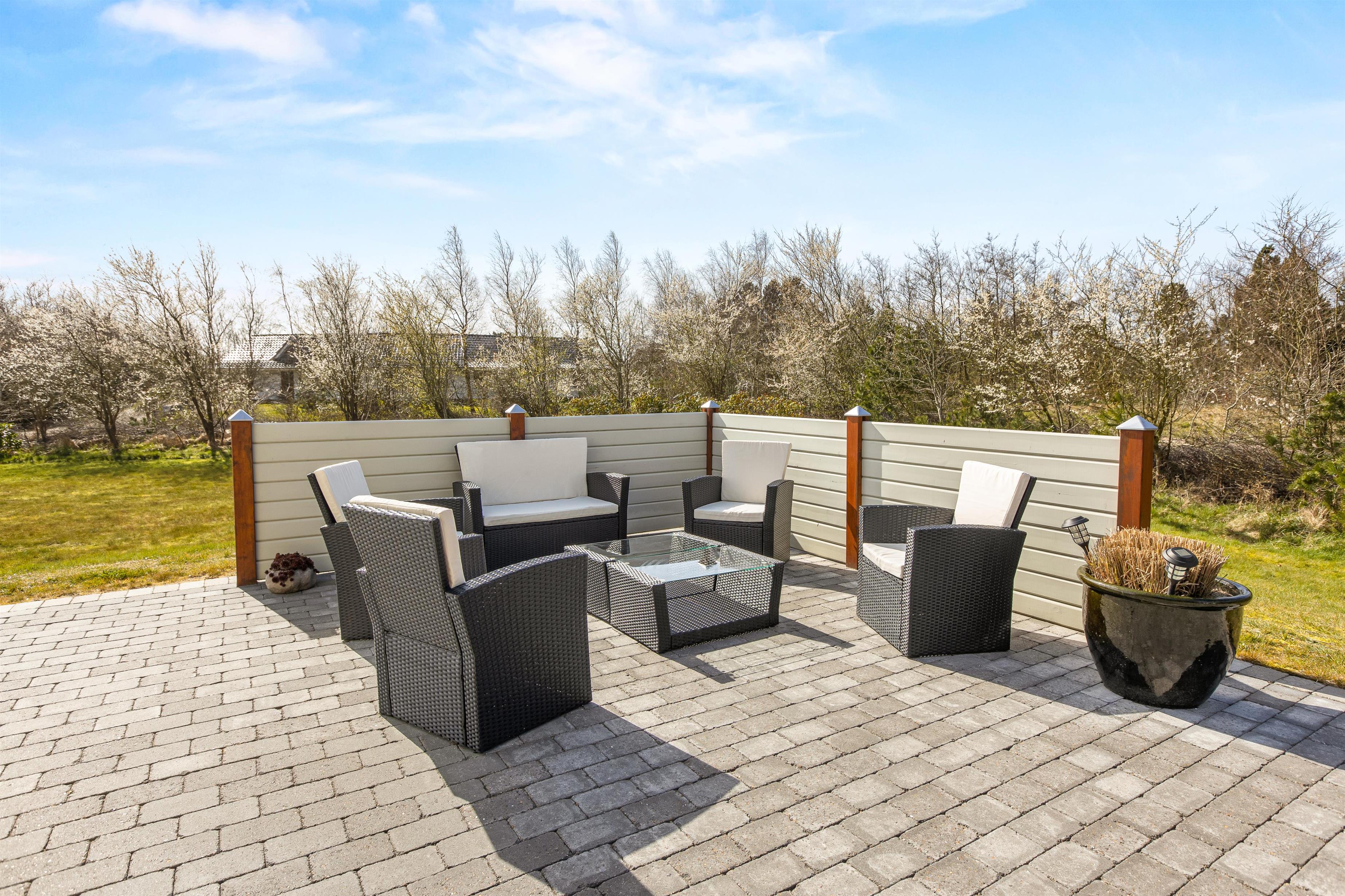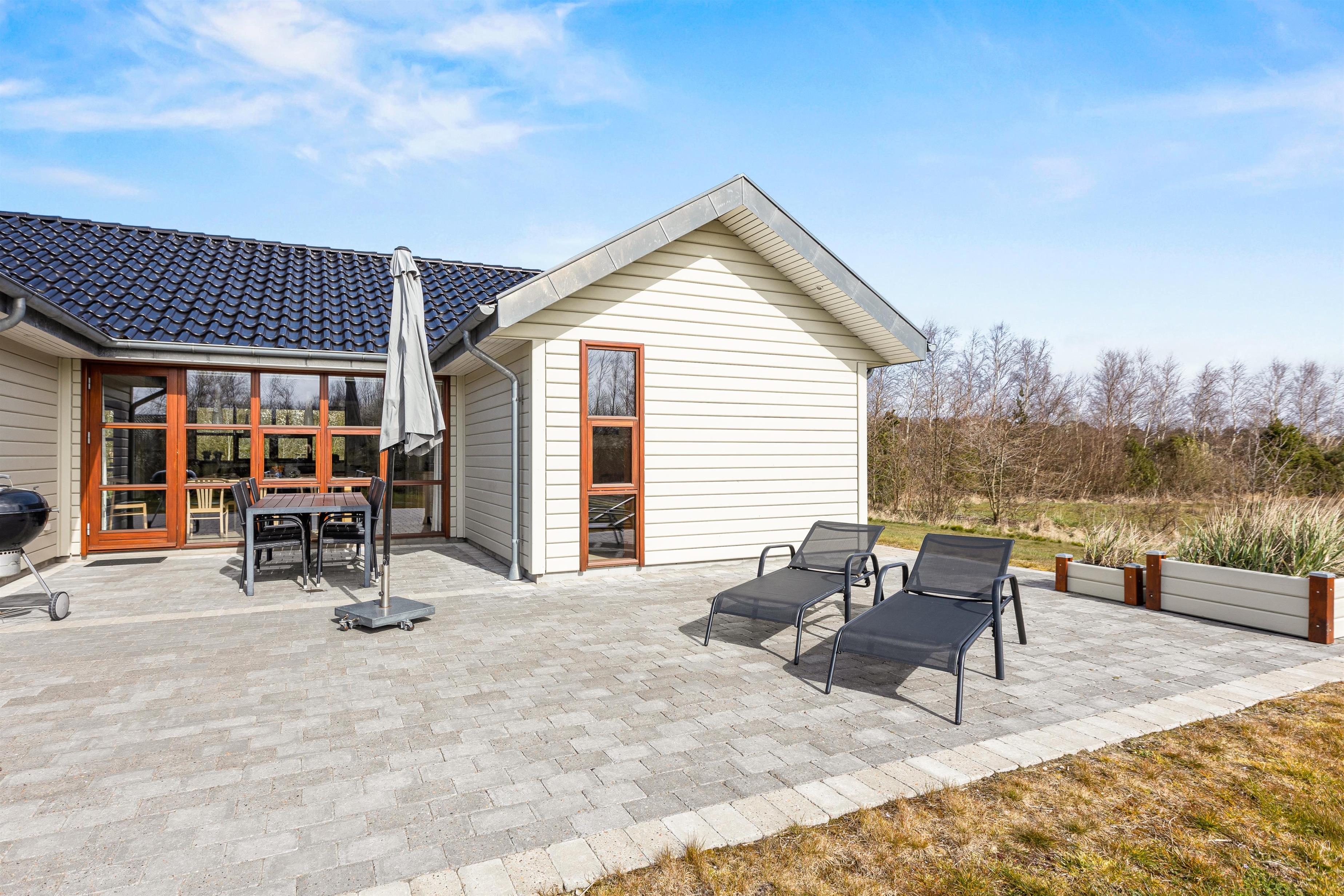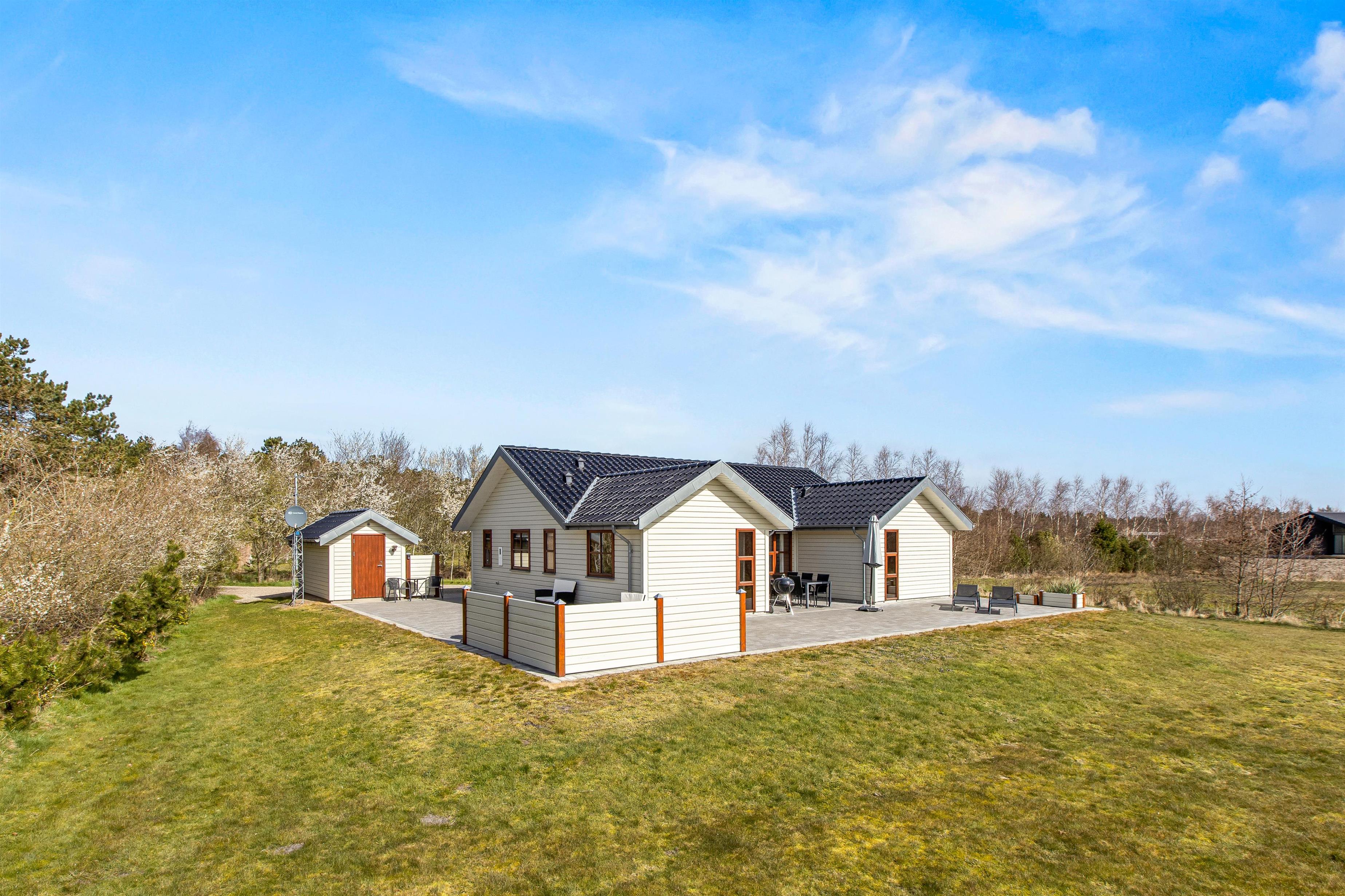 Fra stuen er der udgang til feriehusets åbne terrasse. Her er der både havemøbler, solsenge og parasol til rådighed, så I altid kan finde en plads, hvor I kan læne jer tilbage med en dejlig kop kaffe og slappe af. På sommerhusets grill kan I også lave en dejlig middag. Den store plænegrund byder til en masse leg og boldspil for de mindste, og her kan jeres firbenede venner også løbe frit.