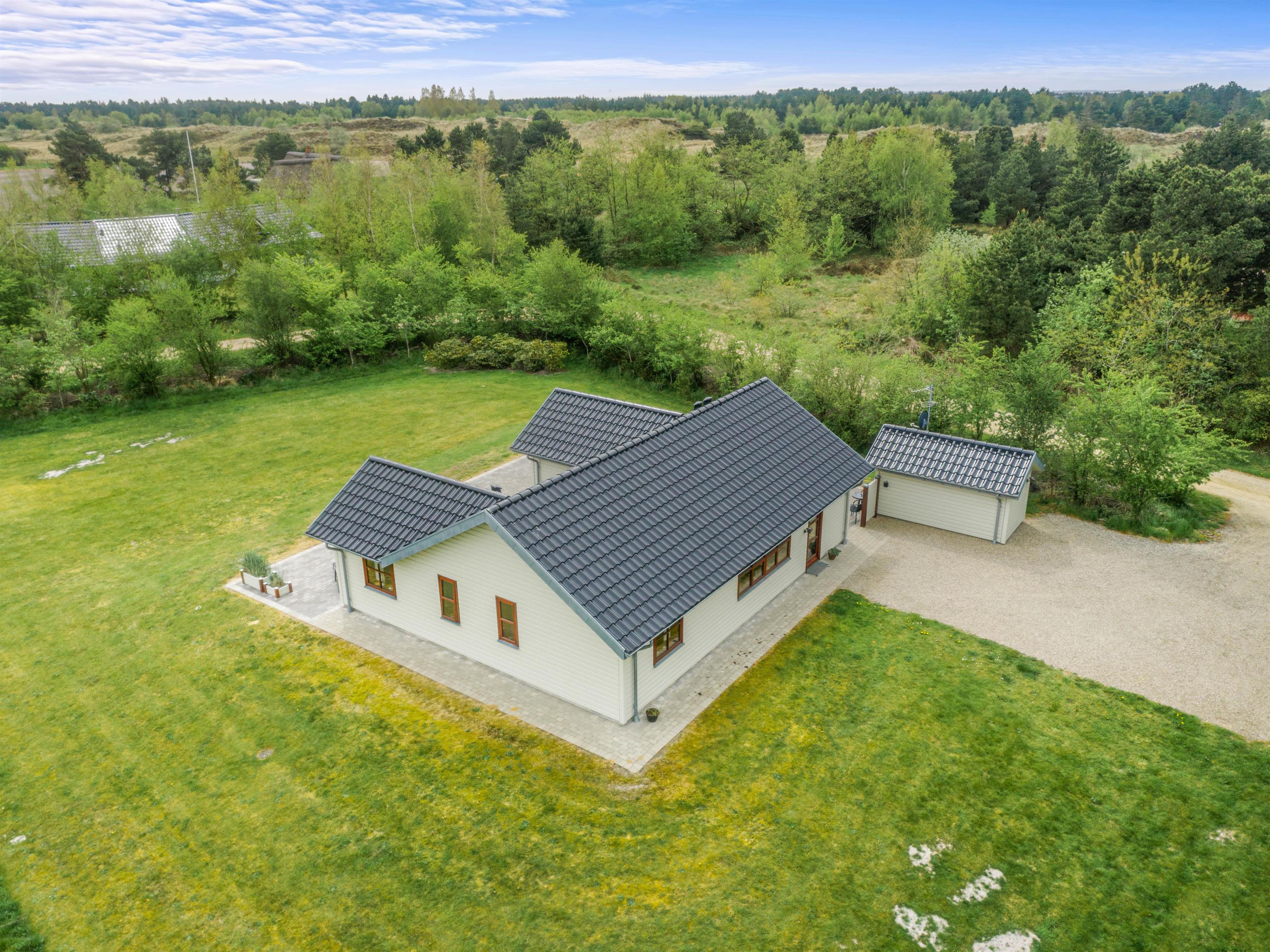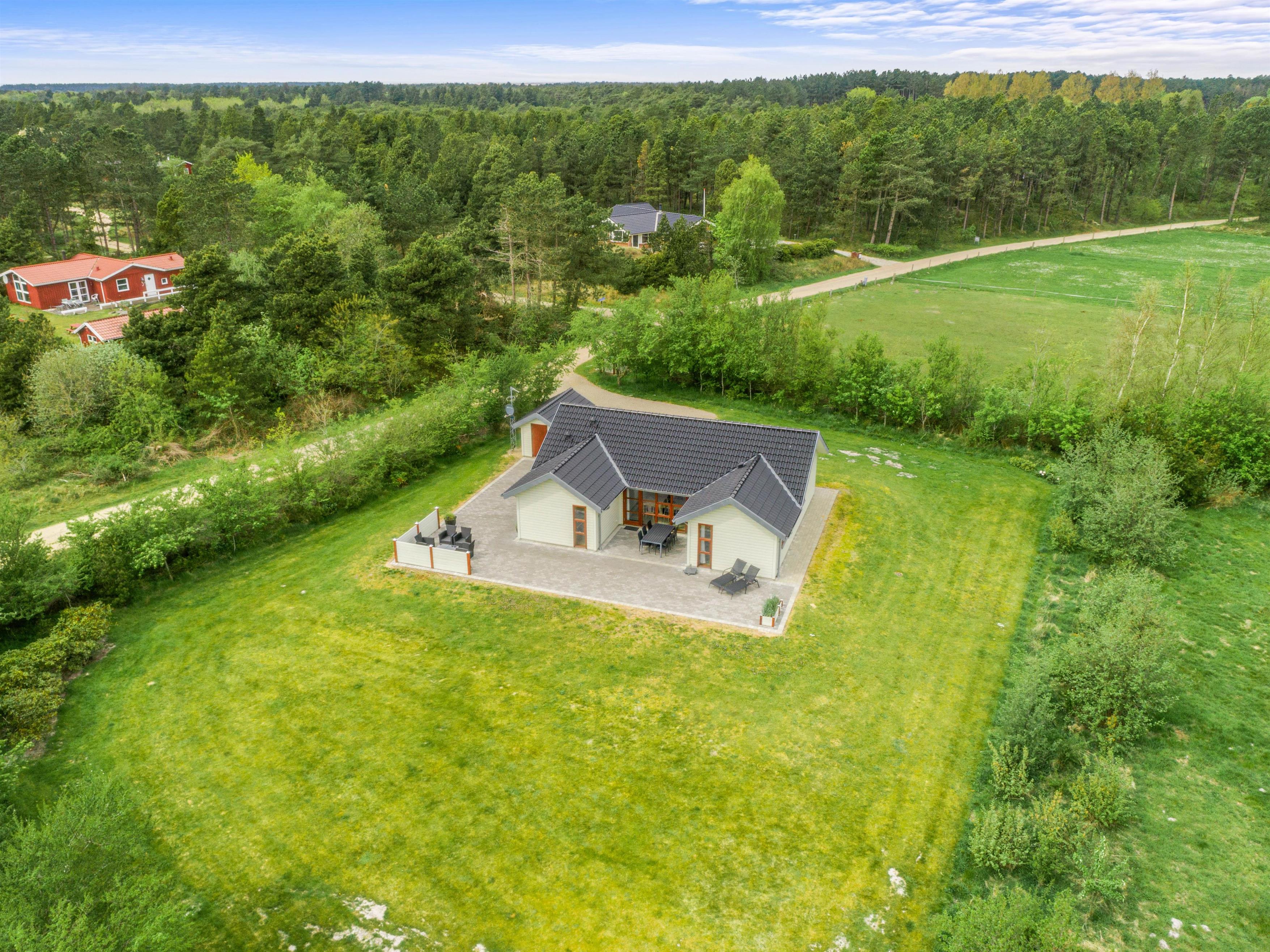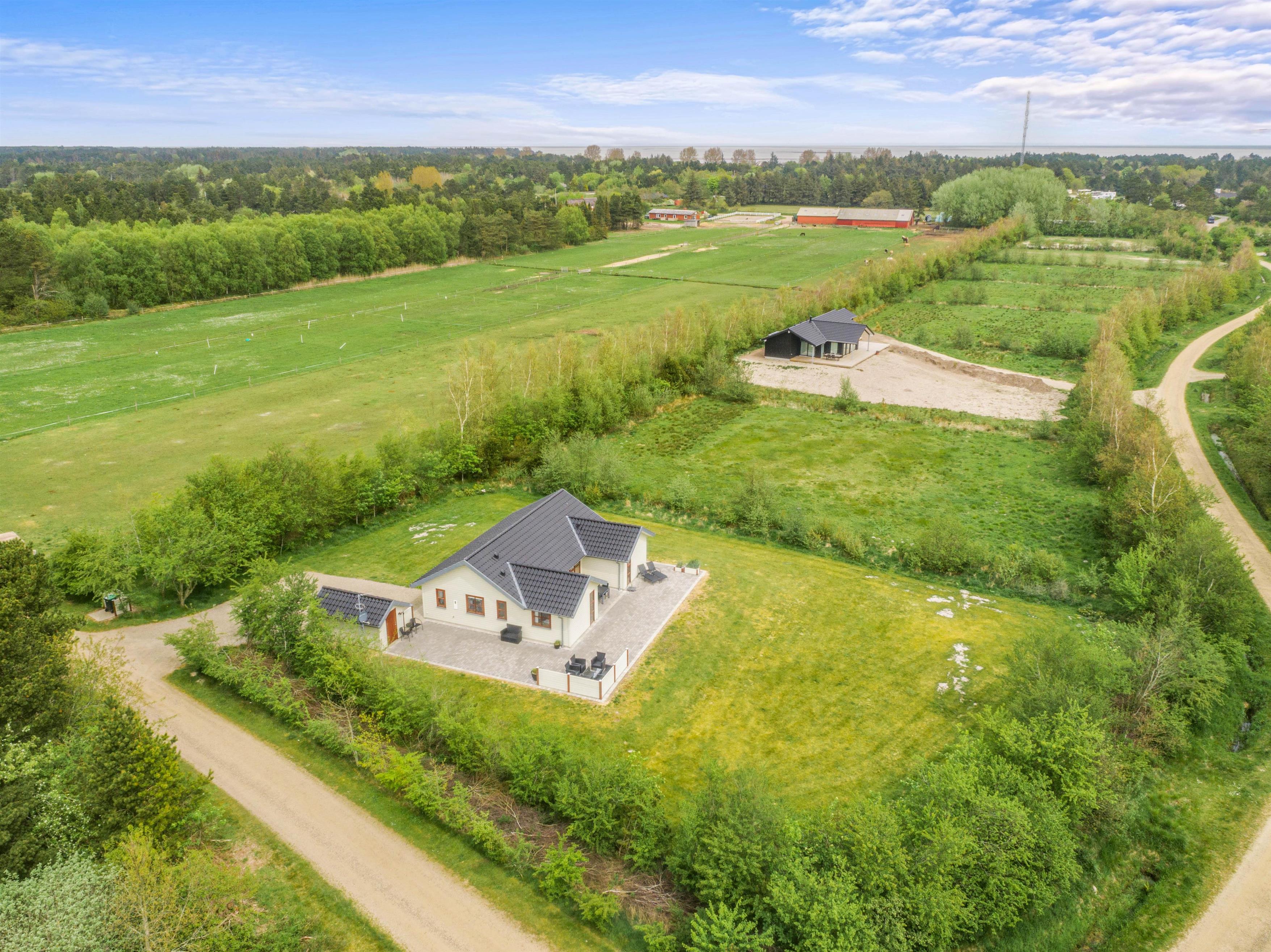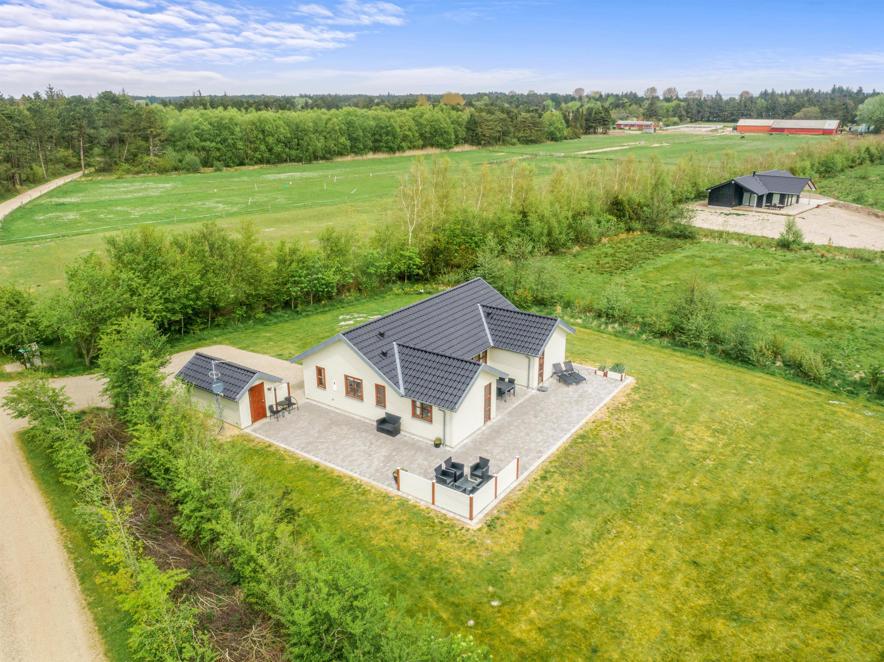 Fra stuen er der udgang til feriehusets åbne terrasse. Her er der både havemøbler, solsenge og parasol til rådighed, så I altid kan finde en plads, hvor I kan læne jer tilbage med en dejlig kop kaffe og slappe af. På sommerhusets grill kan I også lave en dejlig middag. Den store plænegrund byder til en masse leg og boldspil for de mindste, og her kan jeres firbenede venner også løbe frit.