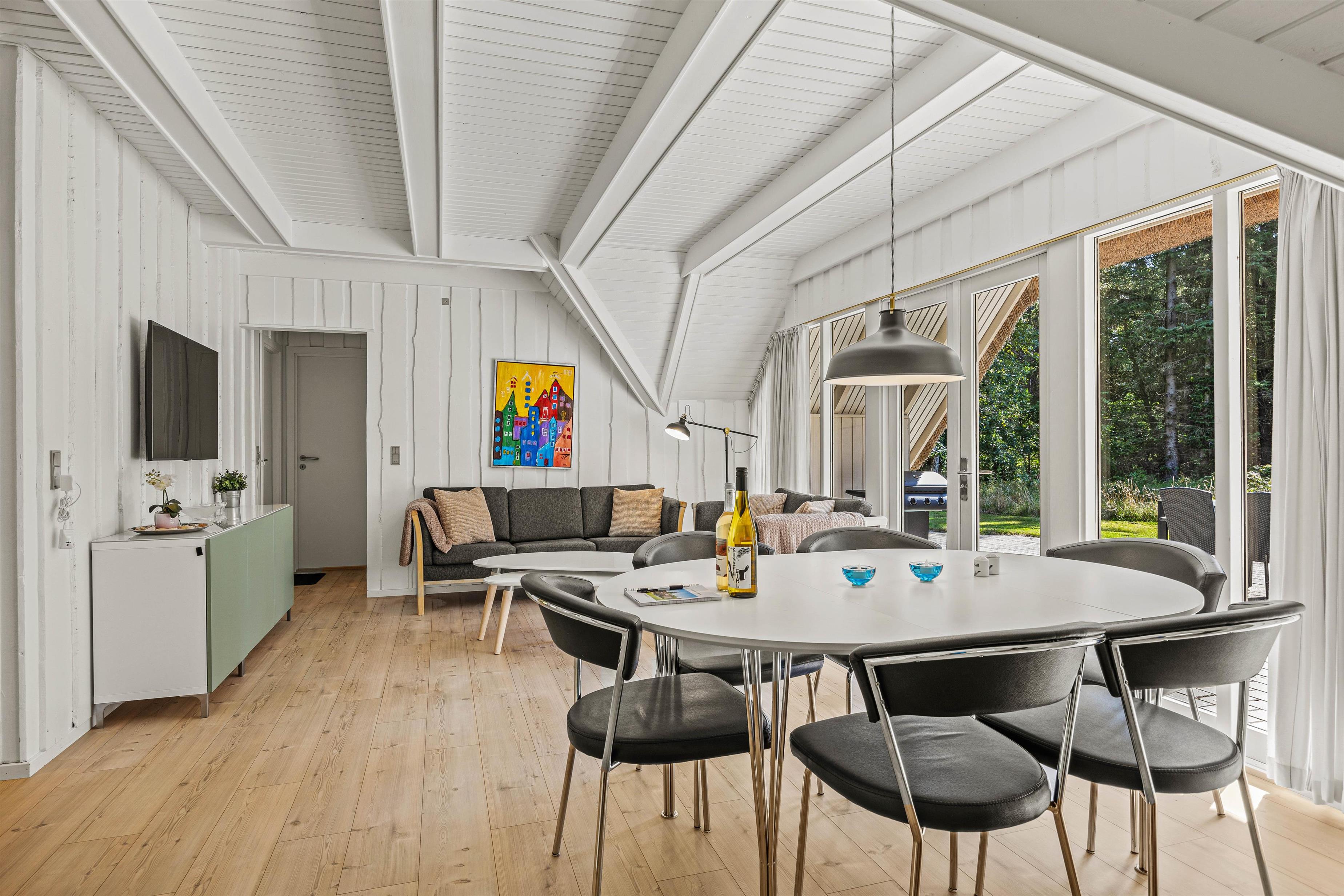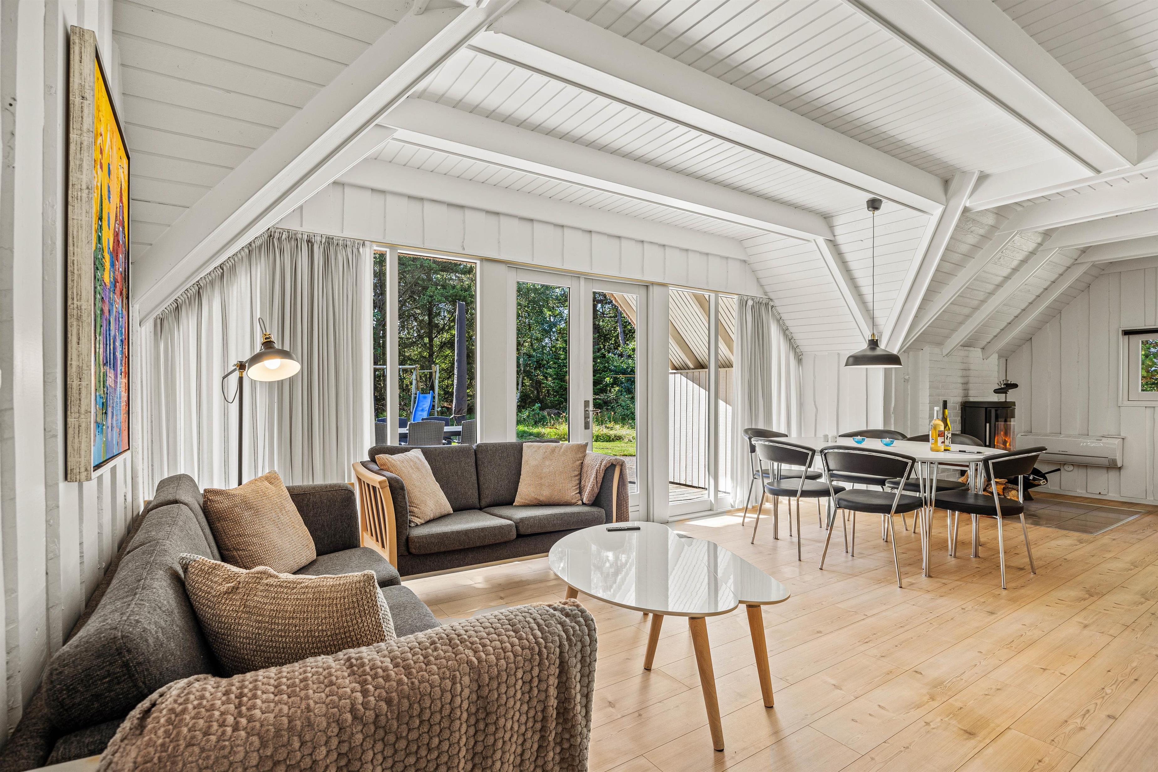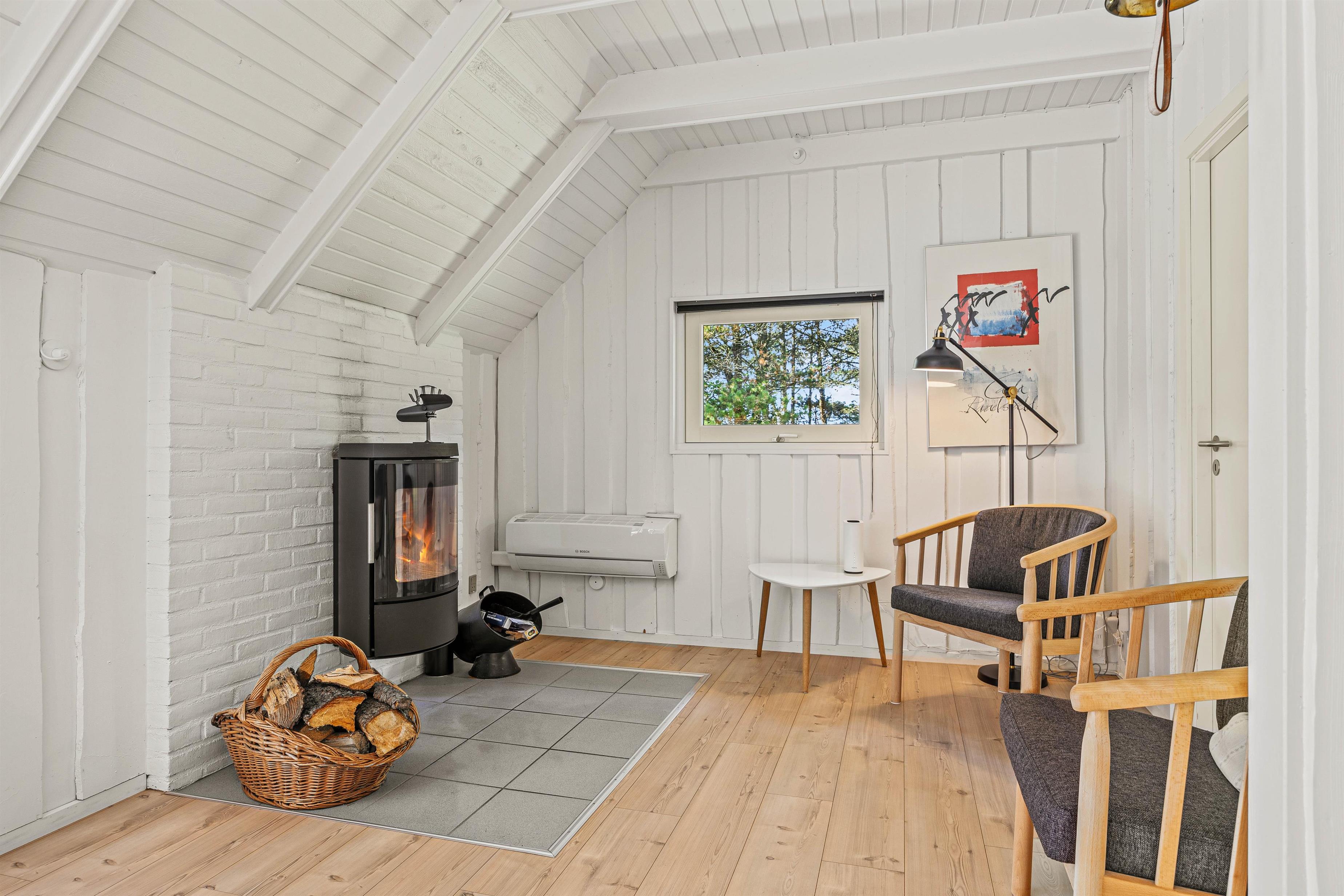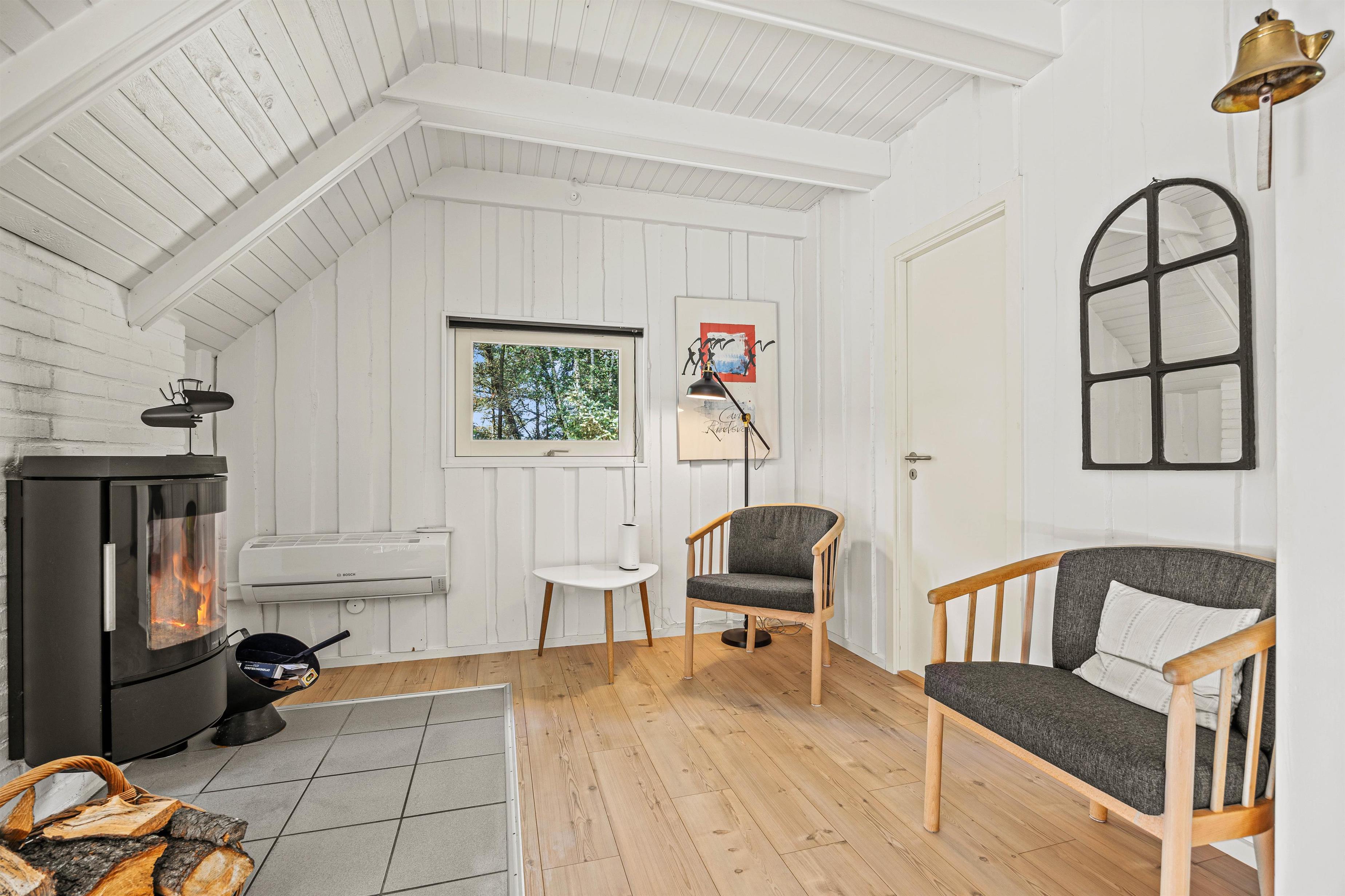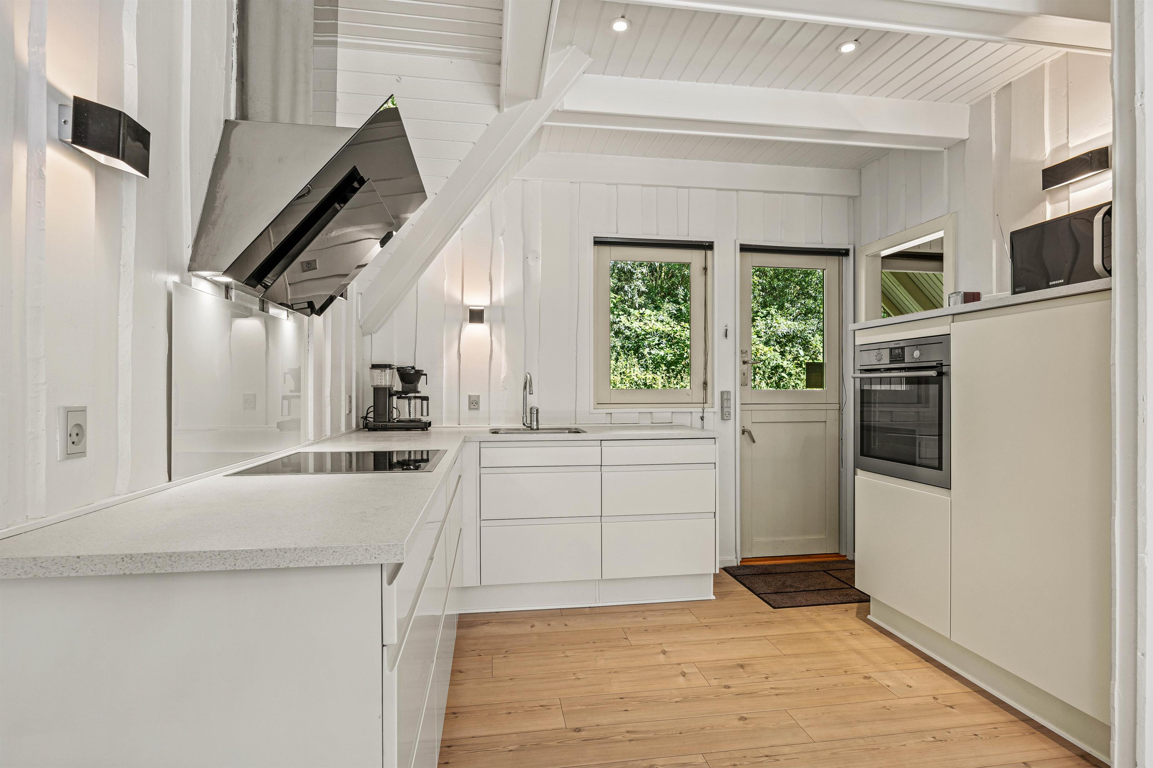 sommerhuset har en åben planløsning, hvor stue og køkken smelter sammen i et lyst, træbeklædt miljø. I stuen kan I samles om aftenen ved den knitrende brændeovn og nyde hinandens selskab. Det moderne køkken-alrum er indrettet med alle nødvendige hårde hvidevarer – herunder opvaskemaskine til de praktiske opgaver – så I nemt kan tilberede lækre måltider og spise sammen. Varmepumpen sørger for behagelig varme, mens gratis fibernet holder jer online under opholdet. Der er også vaskemaskine og tørretumbler, så I kan klare vasketøjet nemt under opholdet