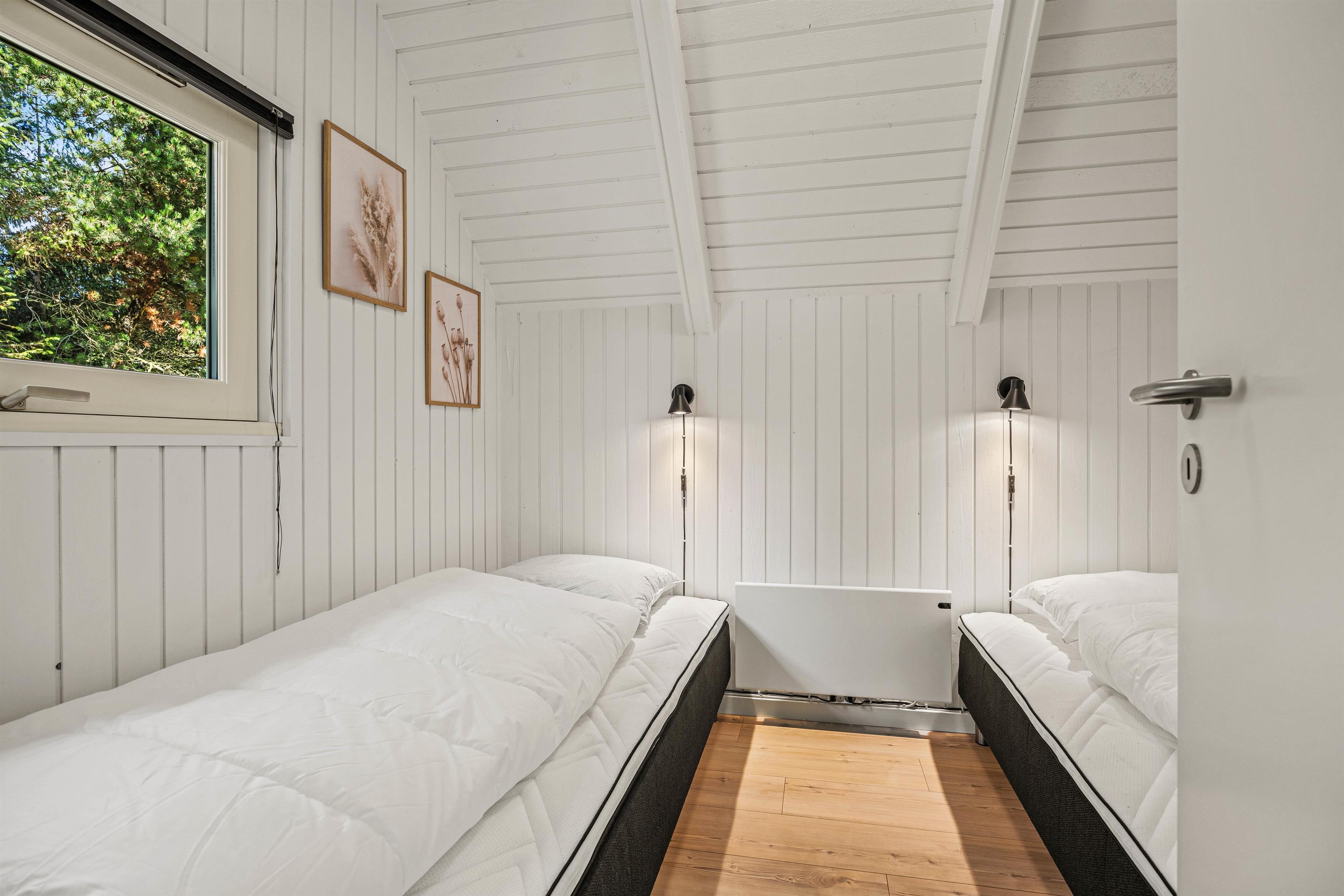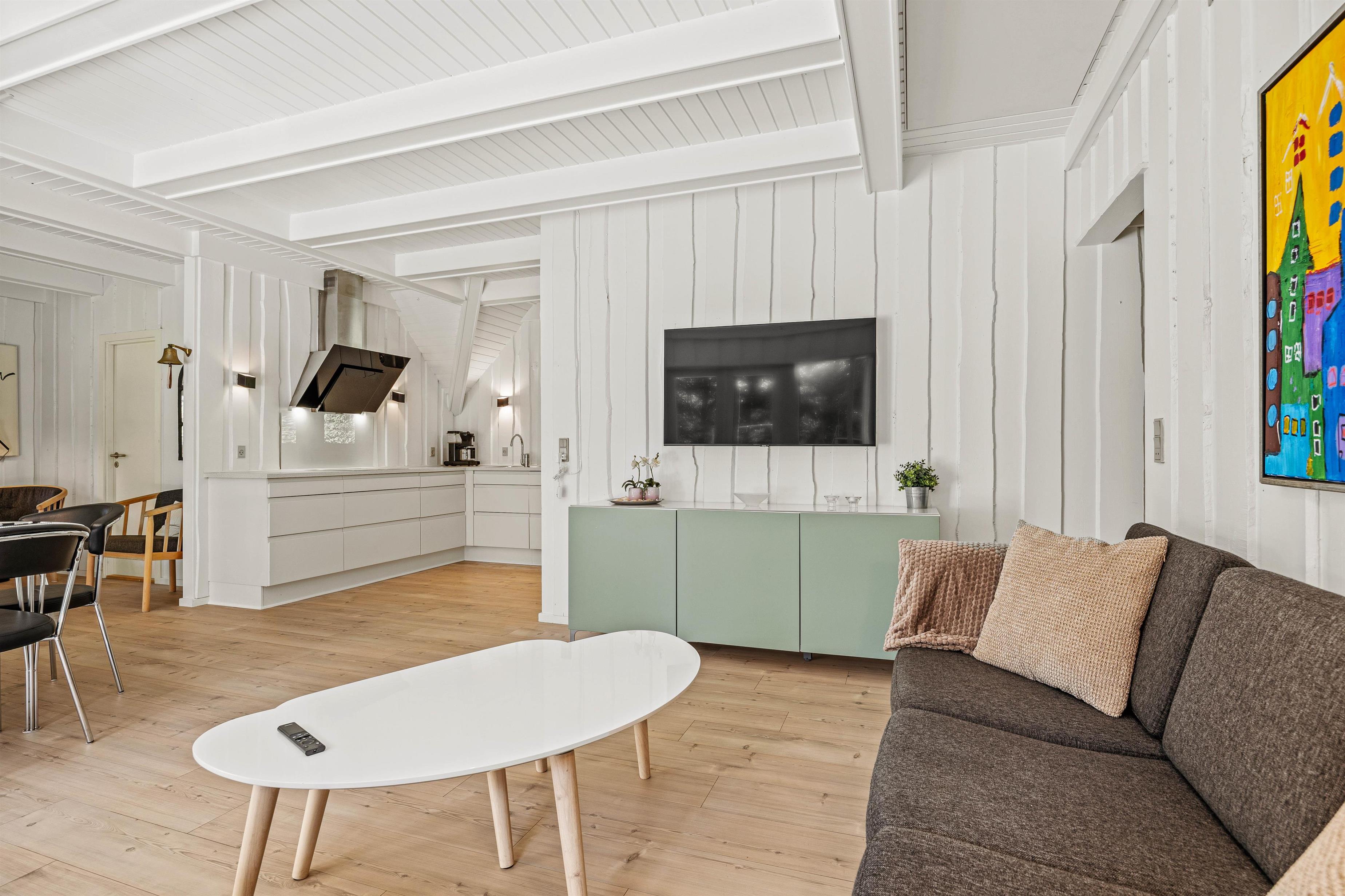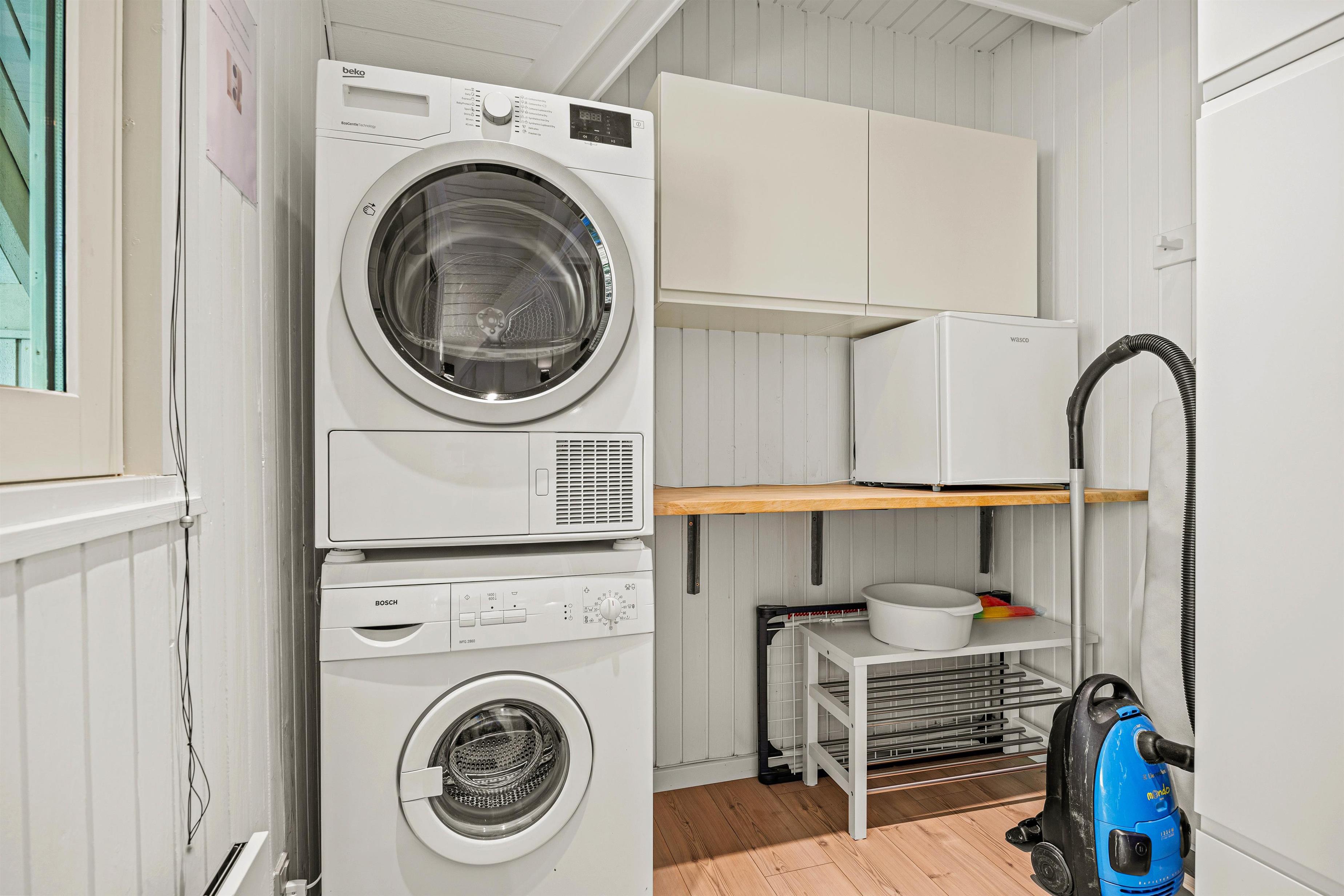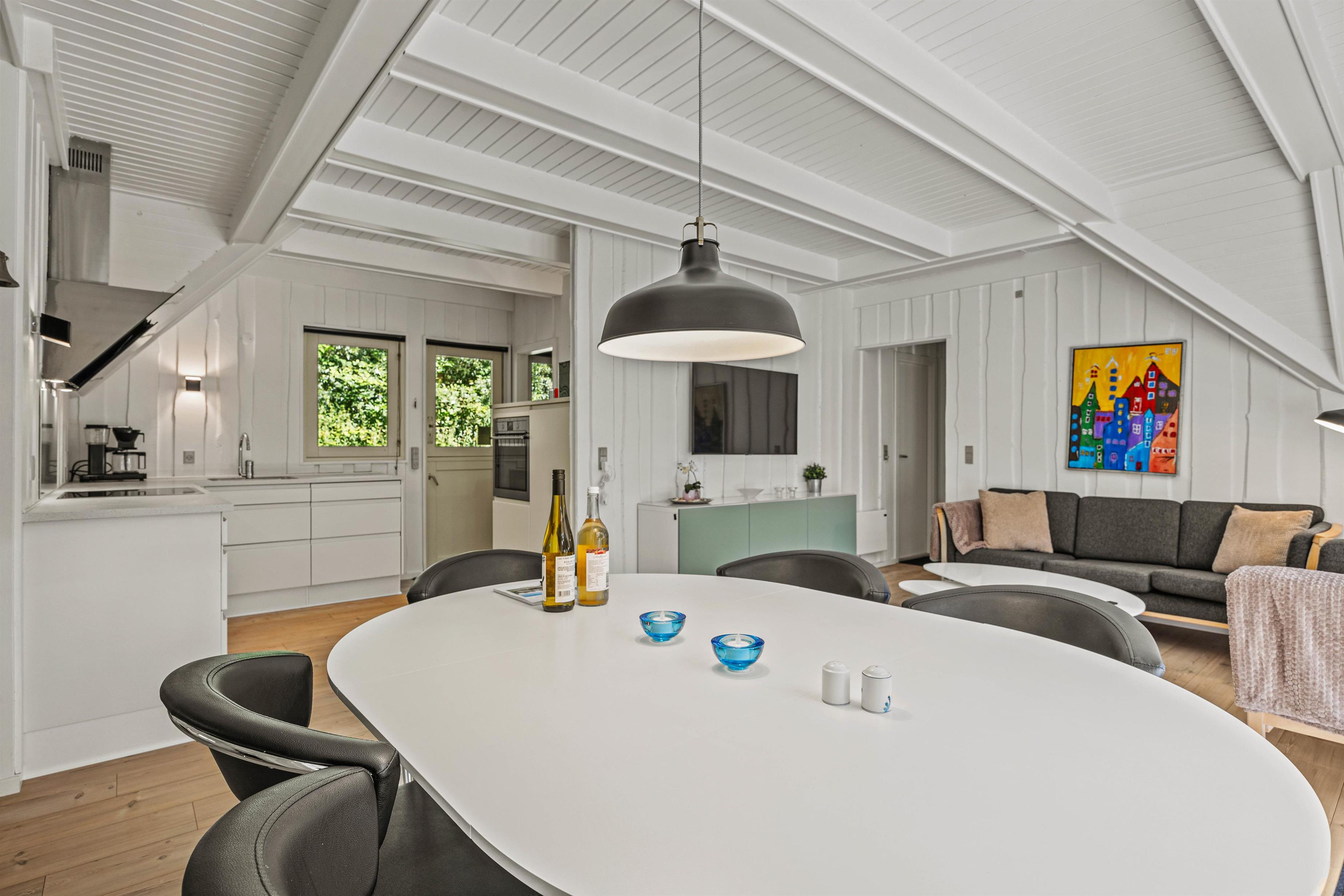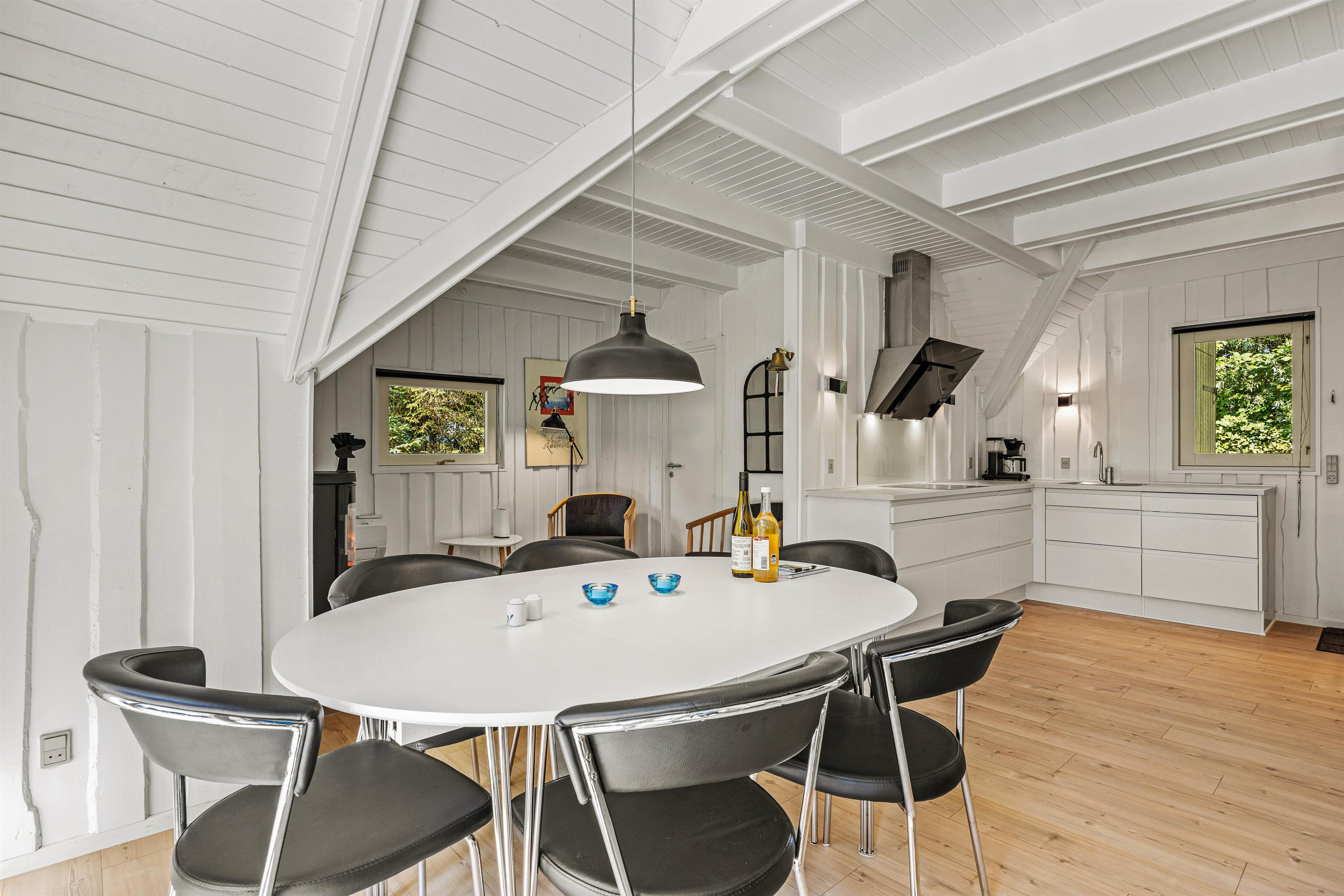 sommerhuset har en åben planløsning, hvor stue og køkken smelter sammen i et lyst, træbeklædt miljø. I stuen kan I samles om aftenen ved den knitrende brændeovn og nyde hinandens selskab. Det moderne køkken-alrum er indrettet med alle nødvendige hårde hvidevarer – herunder opvaskemaskine til de praktiske opgaver – så I nemt kan tilberede lækre måltider og spise sammen. Varmepumpen sørger for behagelig varme, mens gratis fibernet holder jer online under opholdet. Der er også vaskemaskine og tørretumbler, så I kan klare vasketøjet nemt under opholdet
