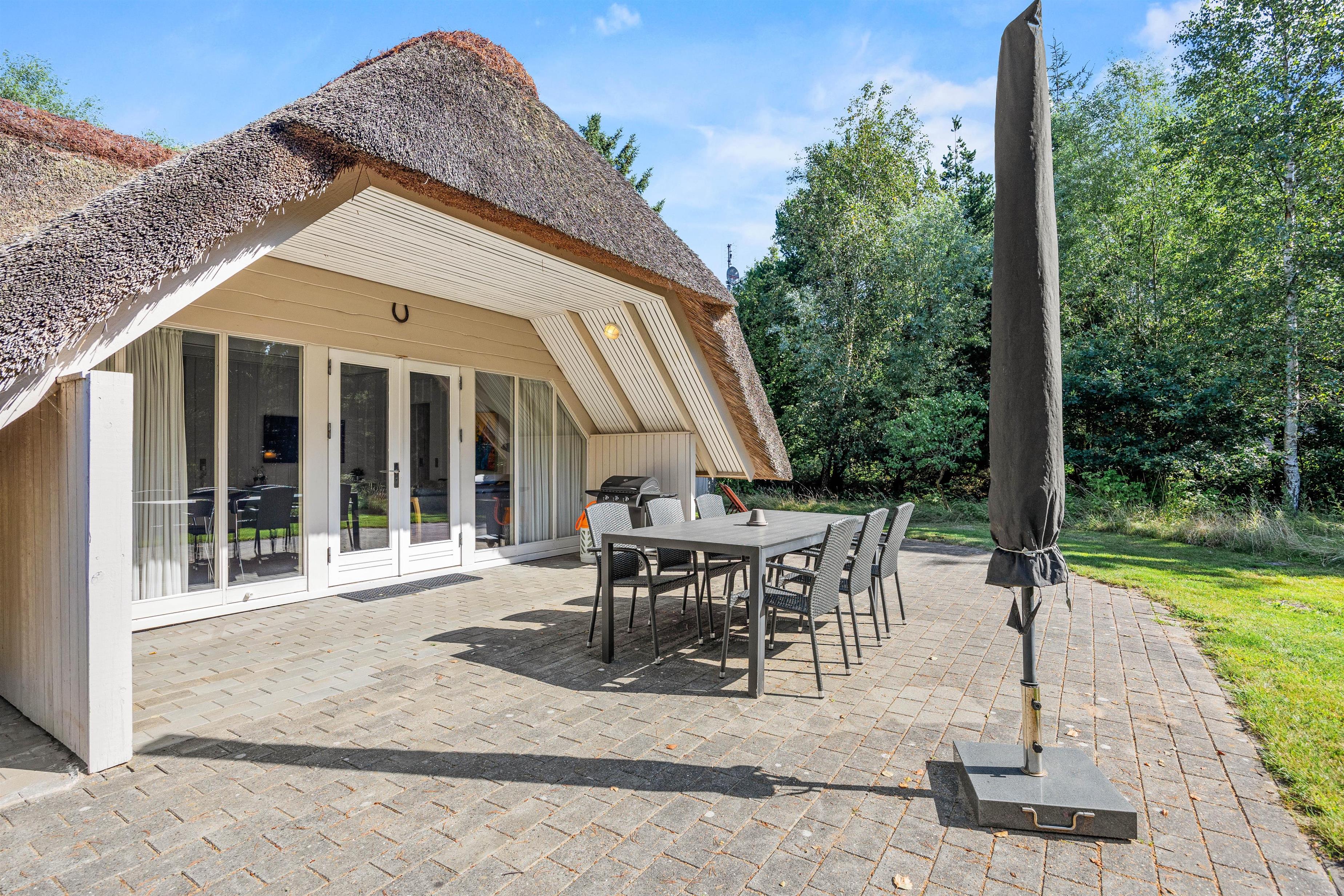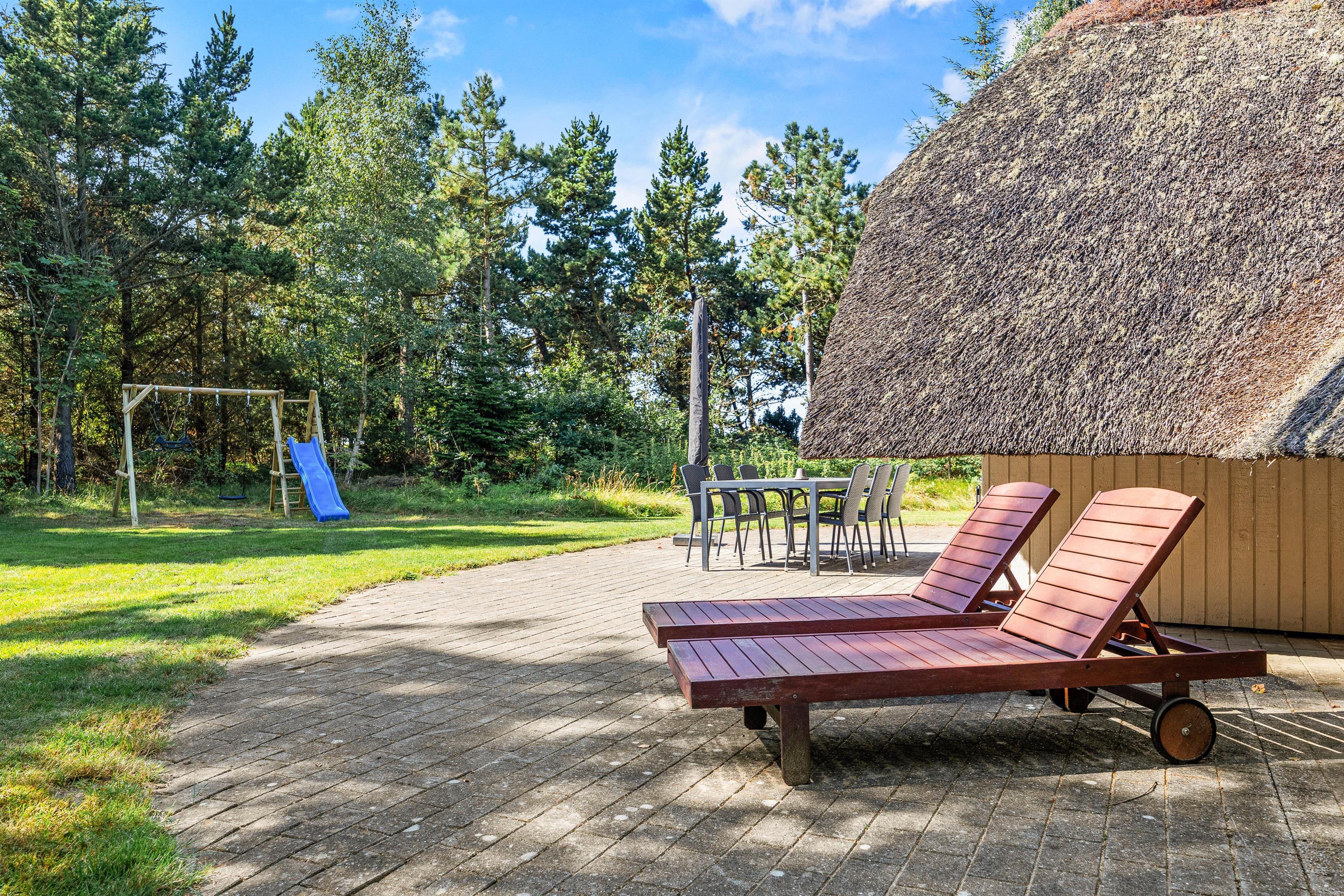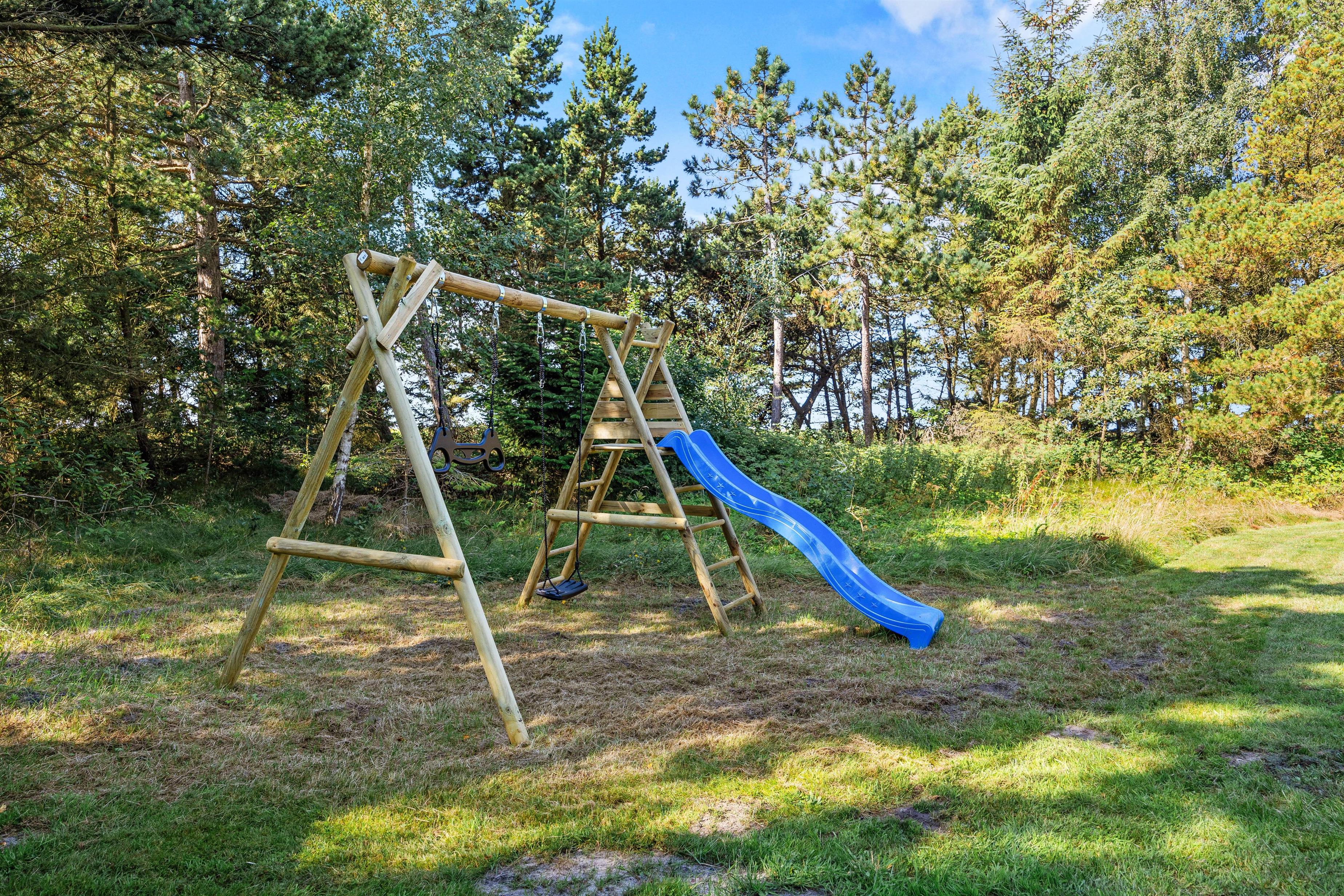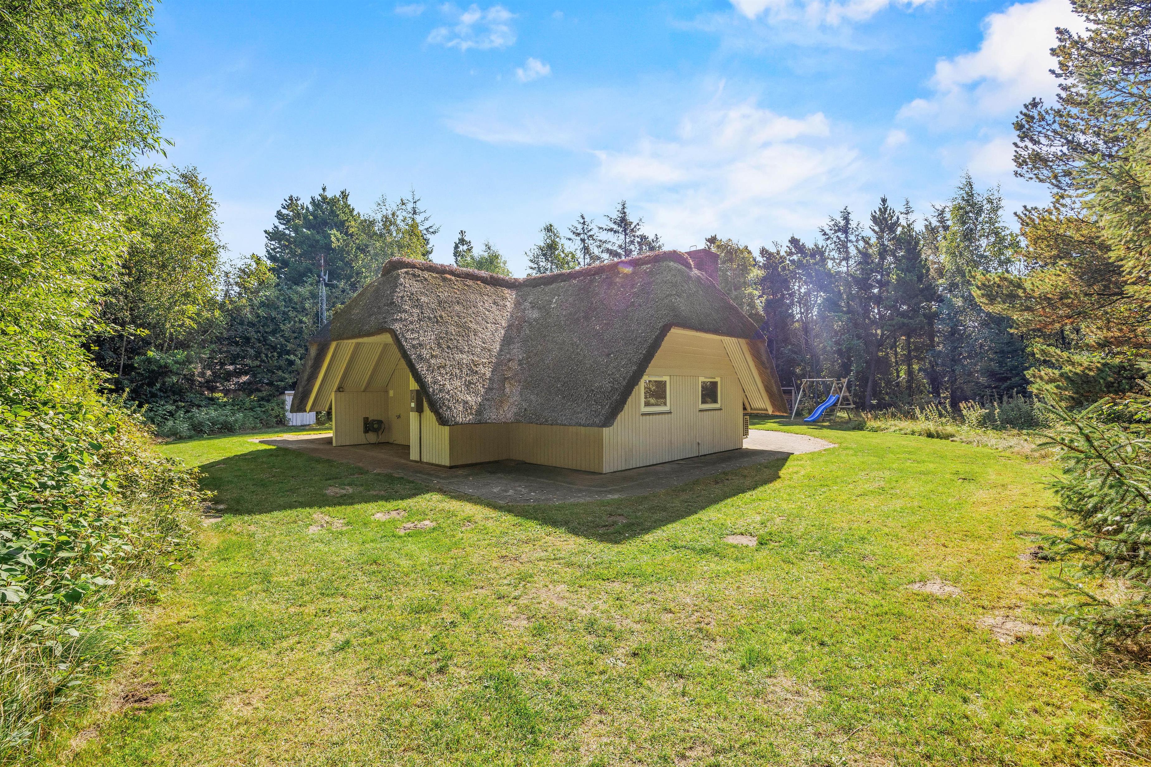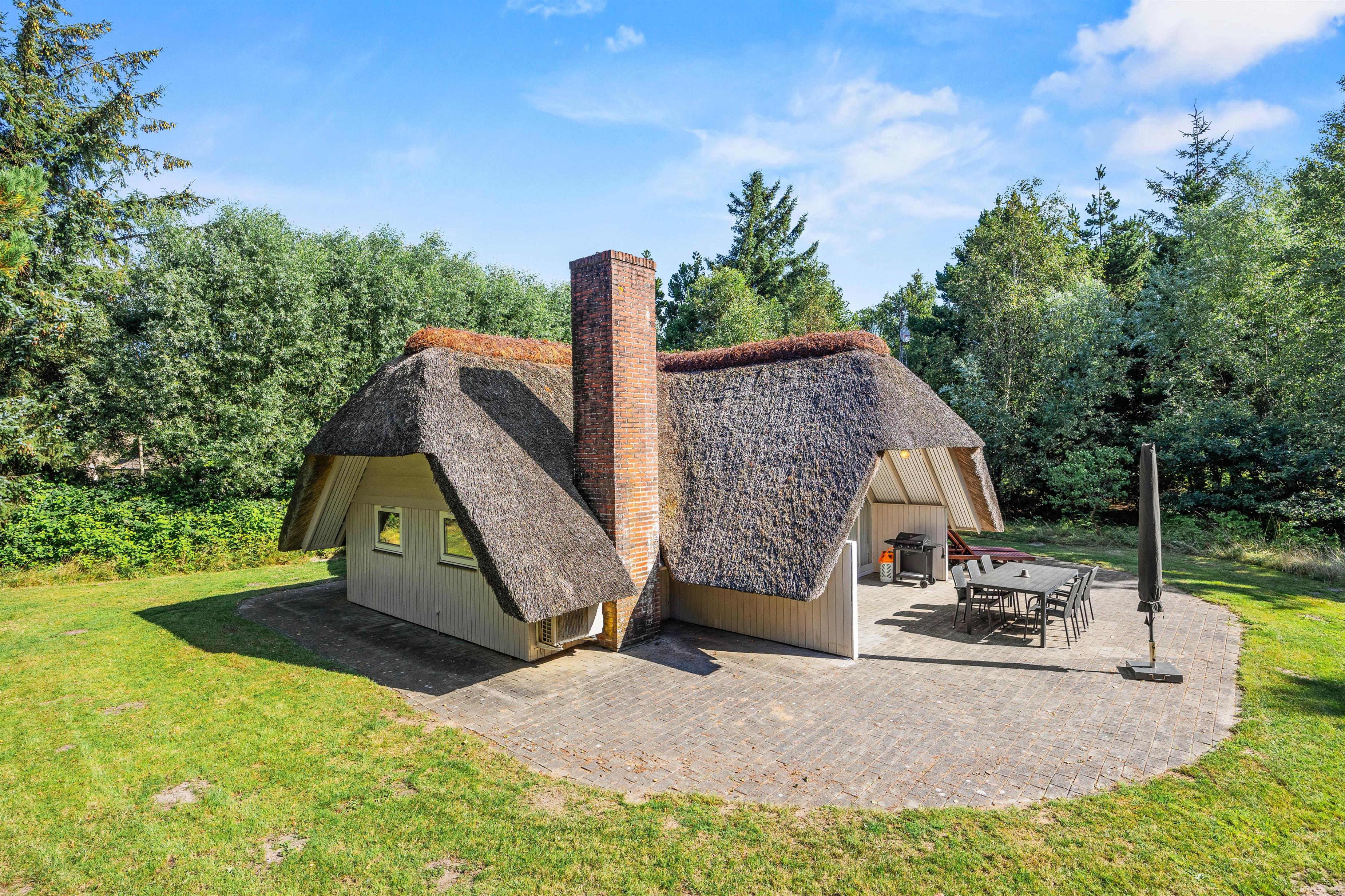 På Rimmevej 7 ligger dette hyggelige sommerhus omgivet af skov og lyng. Med sin skønne beliggenhed falder sommerhuset naturligt ind i de grønne omgivelser, hvor der er højt til himlen og plads til både leg og ro. Naturgrunden er ca. 2.500 m² stor, og her kan I nyde solens lune stråler, mens børnene leger og hunden løber frit omkring (max en hund tilladt ). Sommerhuset har en solrig, åben terrasse med komfortable havemøbler og grill, hvor I kan nyde udelivet i det gode vejr. Fra terrassen er der udsigt til den store, ugenerte have med masser af plads til fri leg. Et gyngestativ står klar til familiens mindste,