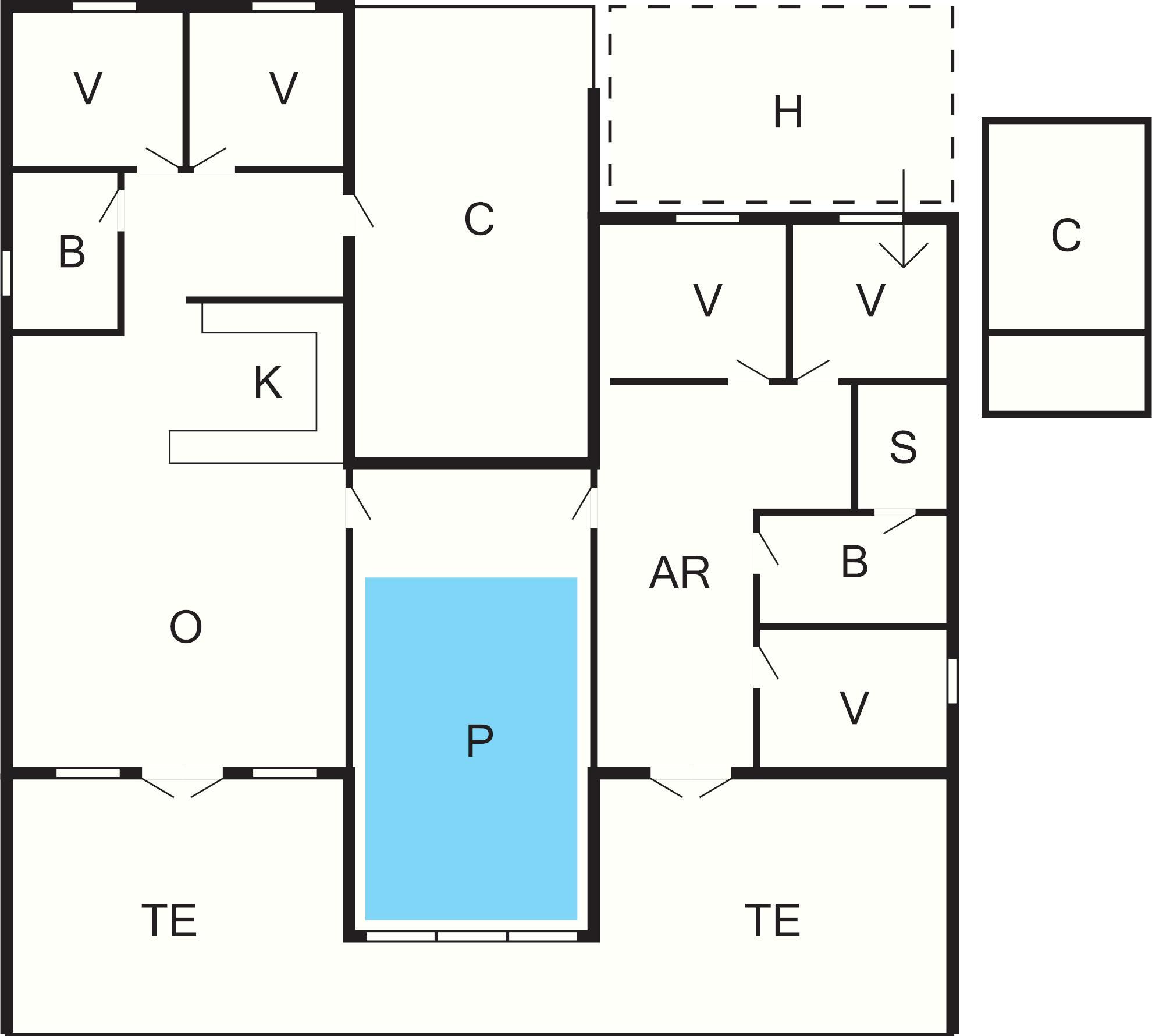 Husets samlingspunkt er den 18 m² store swimmingpool med hejs til kørestolsbrugere. Opvarmning af swimmingpoolen med varmepumpe gør dette hus til et økonomisk hus med lave forbrugsomkostninger for lejeren.
