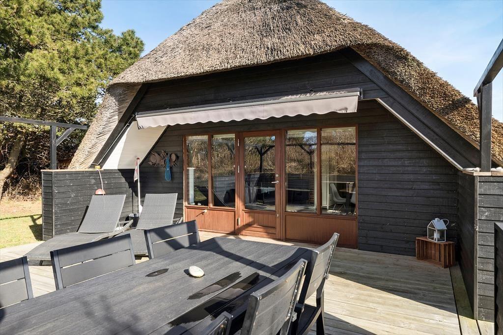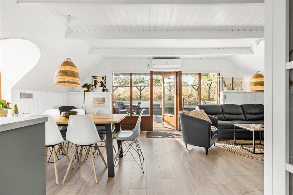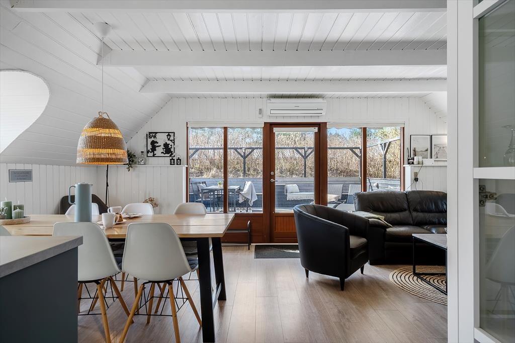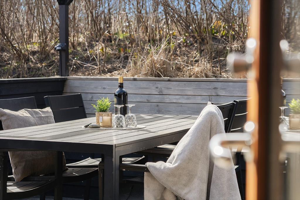 I sommerhuset er der varmepumpe med køleeffekt – men I kan også åbne havedøren op på vid gab, når det er sommerligt i vejret. Det giver jer også mulighed for frit at bevæge jer mellem stuen og terrassen, der med delvis afskærmning, en indbygget bænk og gode havemøbler fungerer som en skøn oase på solrige dage.