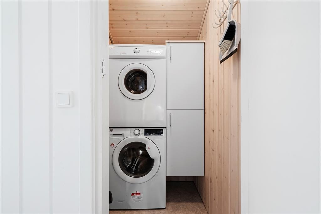 Indenfor møder I et lyst og venligt sommerhus, hvor de store vinduespartier lukker masser af dagslys ind og giver et skønt kig til naturen udenfor. Stue, spiseplads og køkken går op i en hyggelig helhed, som gør det nemt at være sammen, uanset om der laves mad eller slappes af med en god film. Vi kan især godt lide, hvordan de lyse materialer og den åbne indretning skaber en rar atmosfære, der straks får skuldrene til at sænke sig. Derudover finder I et praktisk lille rum med vaskemaskine og tørretumbler – en detalje, der gør det let at klare hverdagens små gøremål, så I kan bruge tiden på det vigtigste: feriehyggen.