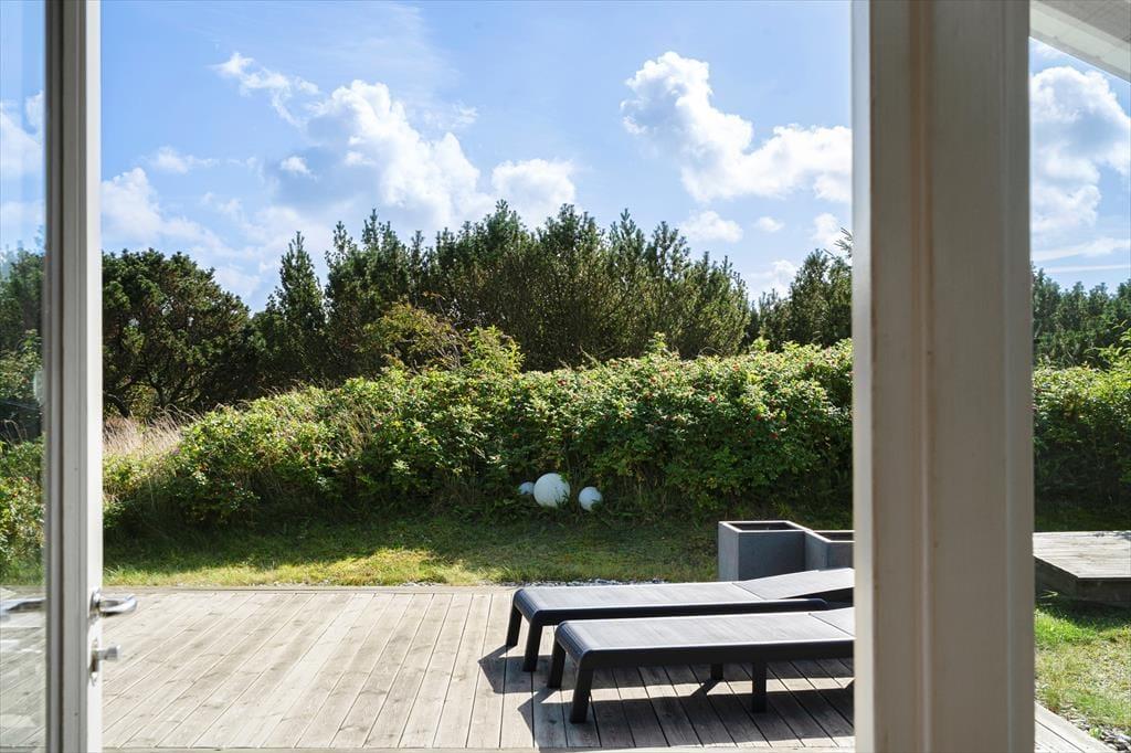 Sommerhuset har flere skønne udeområder, som indbyder til afslapning fra morgen til aften. Den nybyggede overdækkede terrasse giver jer læ og ly, så I kan nyde ferien uanset vejret. Her kan I dække op til aftensmad, mens børnene leger i sandkassen tæt ved. Den åbne træterrasse er perfekt til solrige timer, og i det lille shelter kan I skabe uforglemmelige aftener under stjernehimlen. Den omkransende beplantning giver både privatliv og læ, så I kan finde ro midt i naturen.