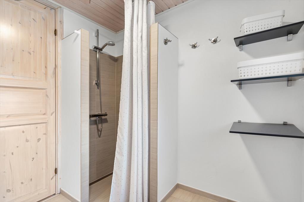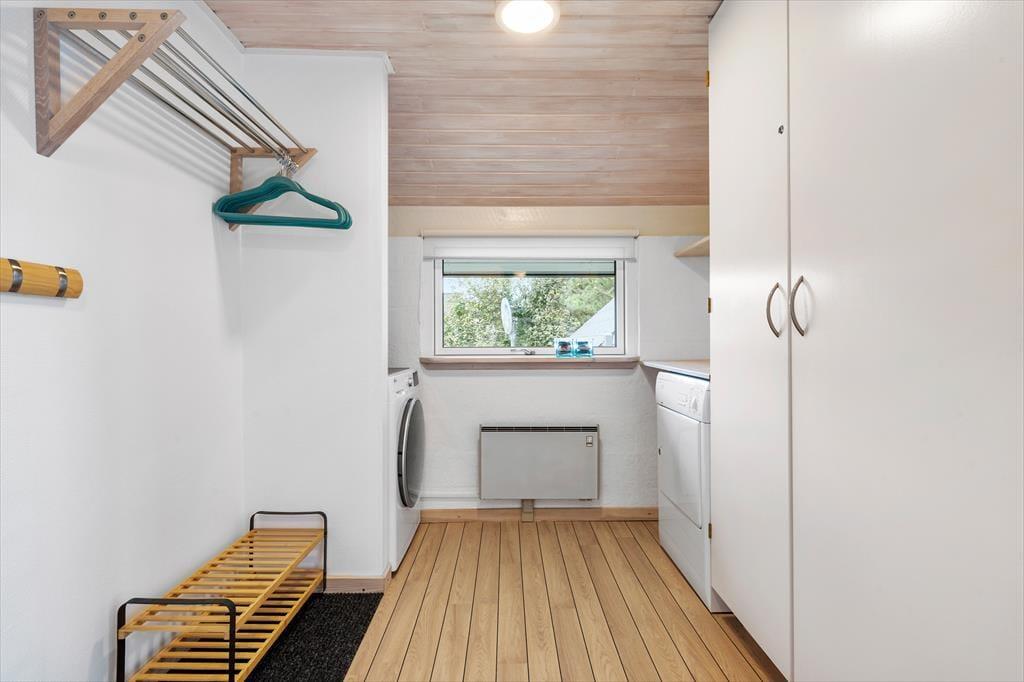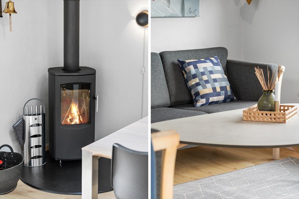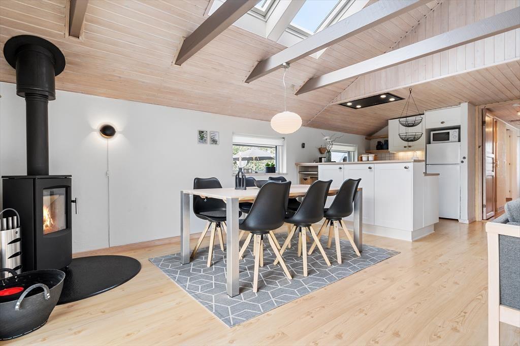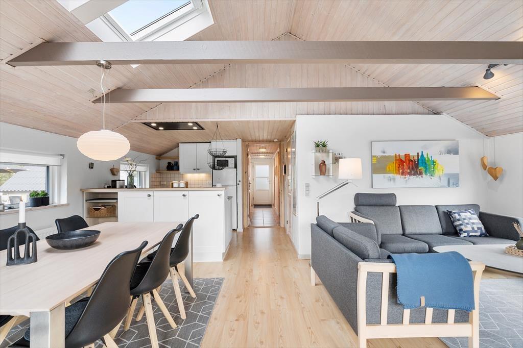 Når vejret indbyder til indendørs hygge, kan I se frem til at tilbringe tiden i lyse og indbydende rammer. I stuen er der loft til kip med fritlagte hanebjælker og ovenlysvinduer, der lukker ekstra dagslys ind og giver kig til stjernehimlen om aftenen. Skæret fra brændeovnens flammer kan lyse op i hjørnet, og varmen kan sprede sig – også fra varmepumpen, der bidrager til en behagelig temperatur. I det åbne køkken har I gode arbejdsforhold, når der skal kokkereres, og hvis I får brug for at vaske tøj, er der vaskemaskine og tørretumbler ved entréen. Et badeværelse og to soveværelser hører også med til planløsningen, og alle rum fremstår pæne og velholdte.