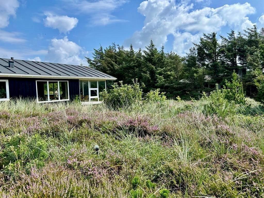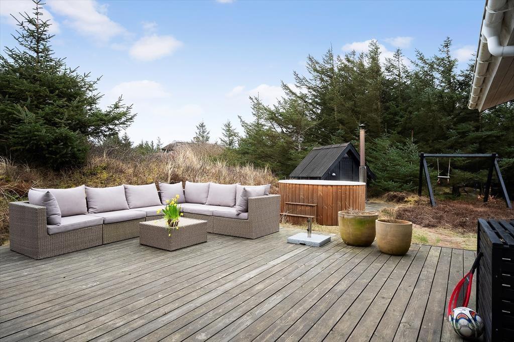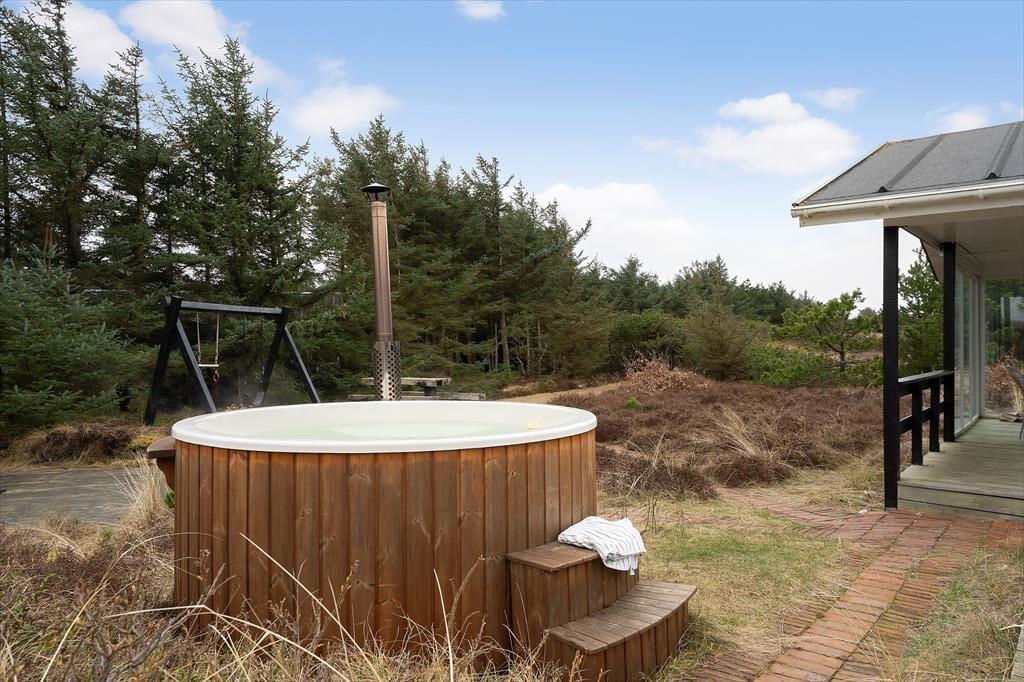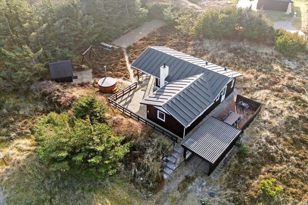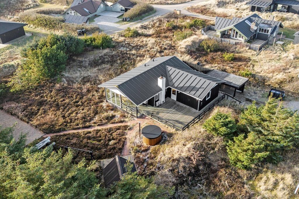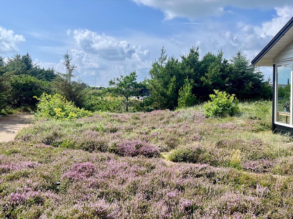 Rundt om sommerhuset venter de skønneste udearealer: Lyng og marehalm breder sig på naturgrunden, og i den sydlige ende breder en petanquebane sig langs med randbeplantningens høje træer. Der er flere dejlige terrasser at vælge imellem – blandt andet en overdækket terrasse med glasafskærmning – og til livsnyderne er der vildmarksbad.
