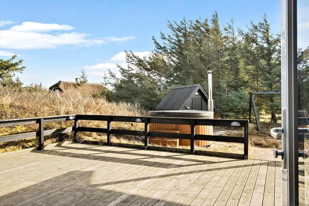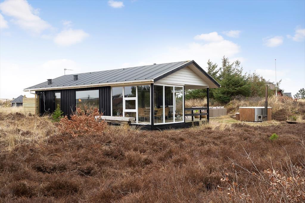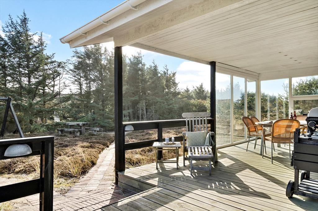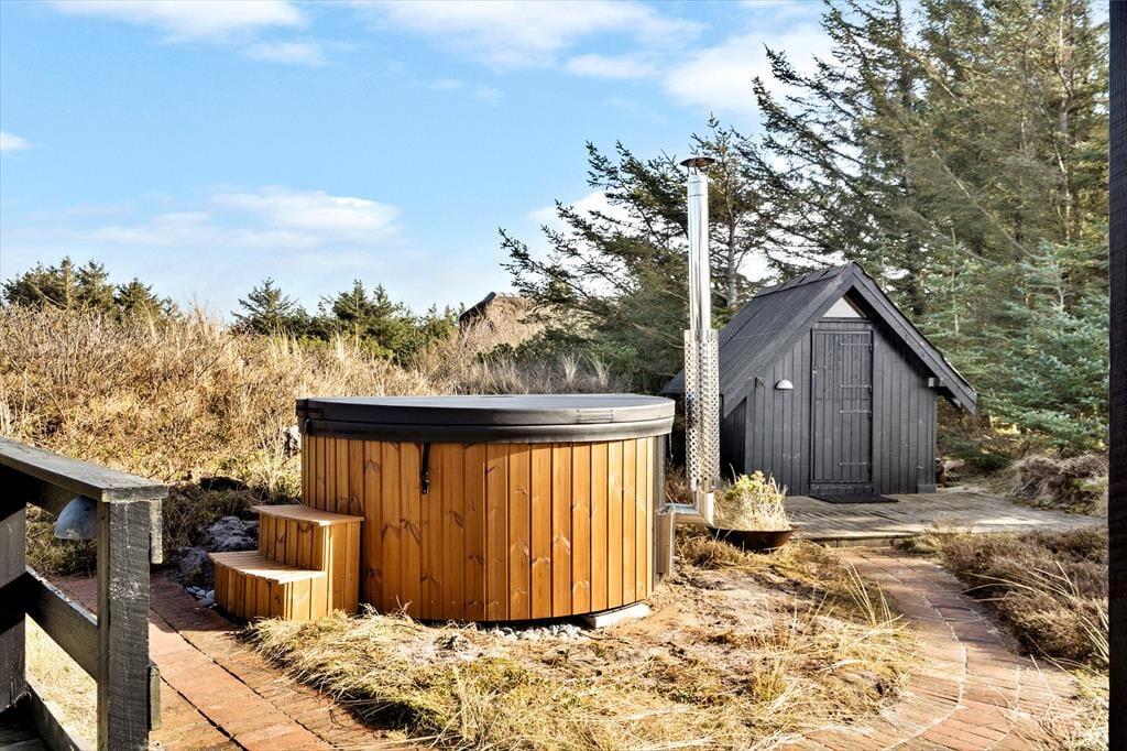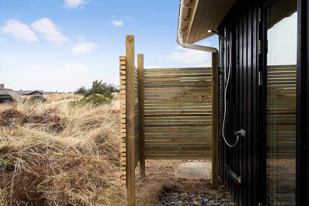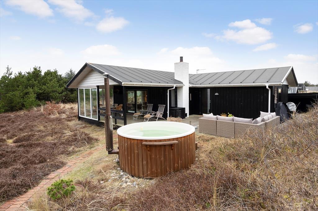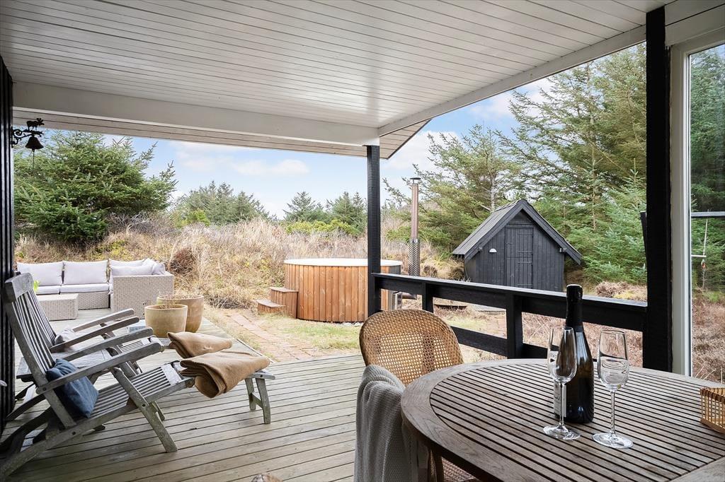 Rundt om sommerhuset venter de skønneste udearealer: Lyng og marehalm breder sig på naturgrunden, og i den sydlige ende breder en petanquebane sig langs med randbeplantningens høje træer. Der er flere dejlige terrasser at vælge imellem – blandt andet en overdækket terrasse med glasafskærmning – og til livsnyderne er der vildmarksbad.