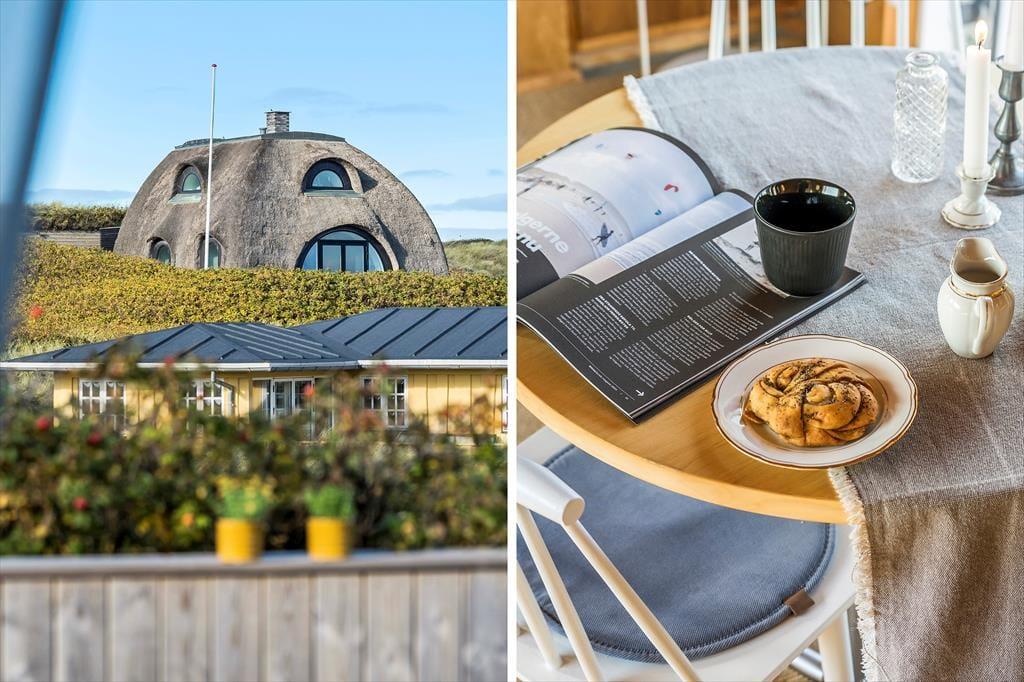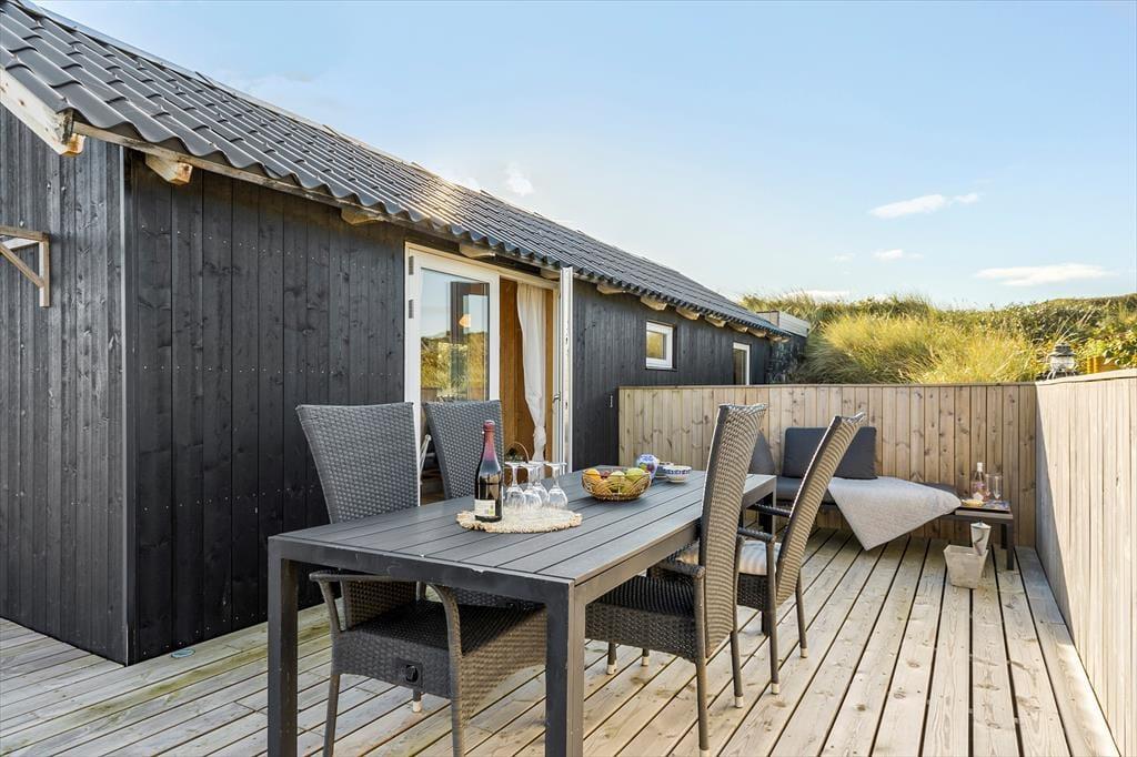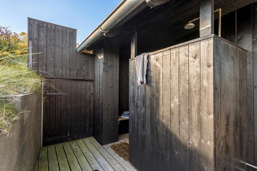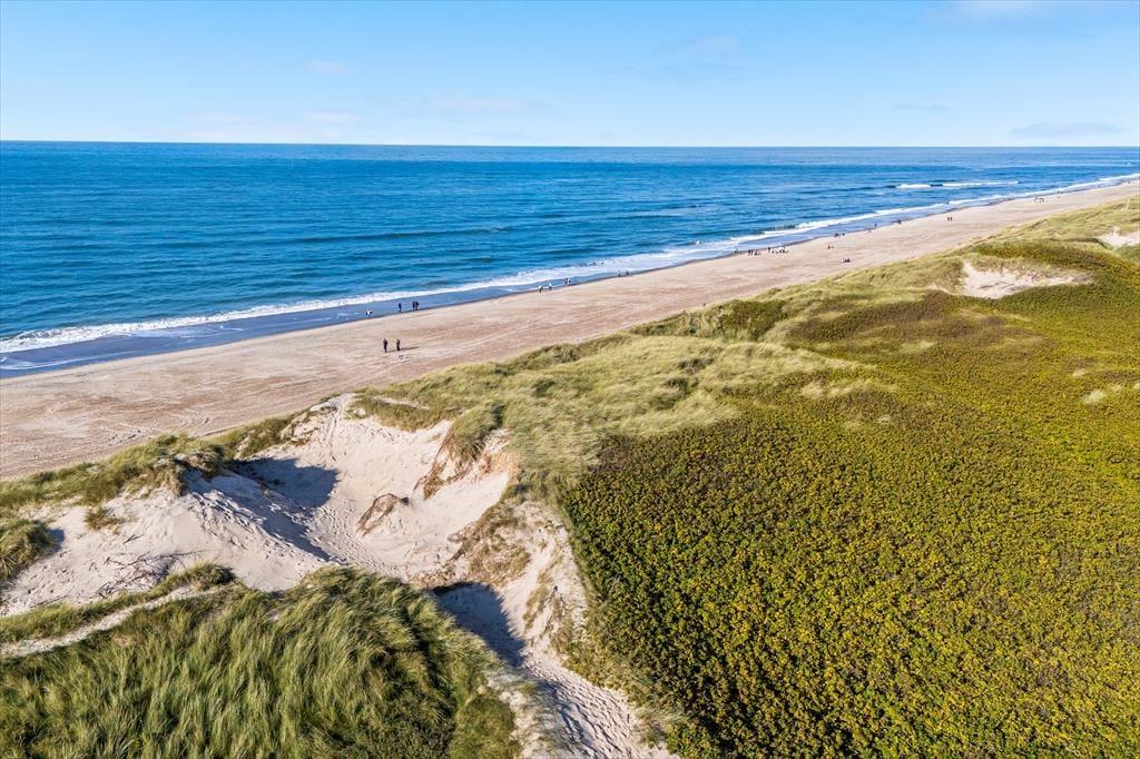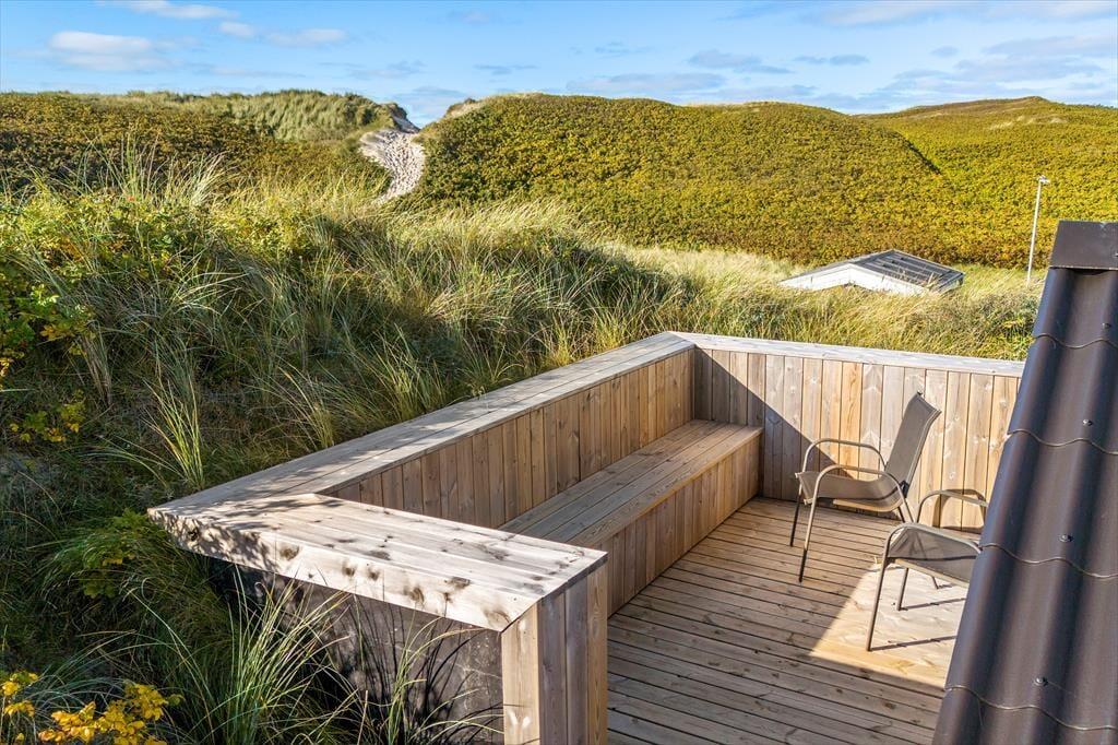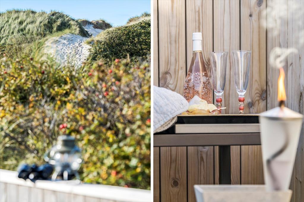 Udenfor finder du to dejlige terrasser, hvorfra du kan nyde udsigten til klitterne, der rejser sig mod himlen. Her kan du lade morgensolen varme dig, mens du nyder dagens første kop kaffe, eller samle familien til måltider under åben himmel. Når dagen er ved at være slut, og solen begynder at gå ned, kan I tage et friskt bad under den udendørs bruser – helt i pagt med naturen. Den korte afstand til havet gør det nemt at tage en tur ned til stranden, hvor børnene kan bygge sandslotte, og de voksne kan slentre barfodet i vandkanten.