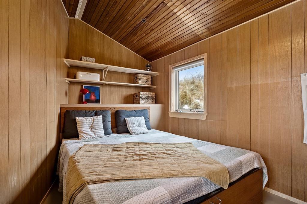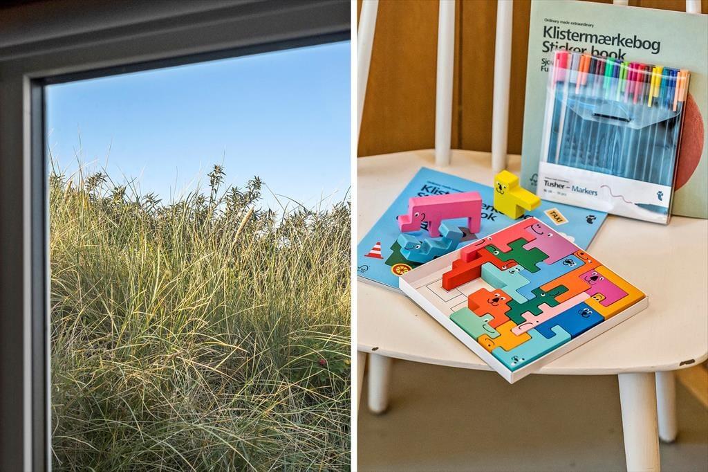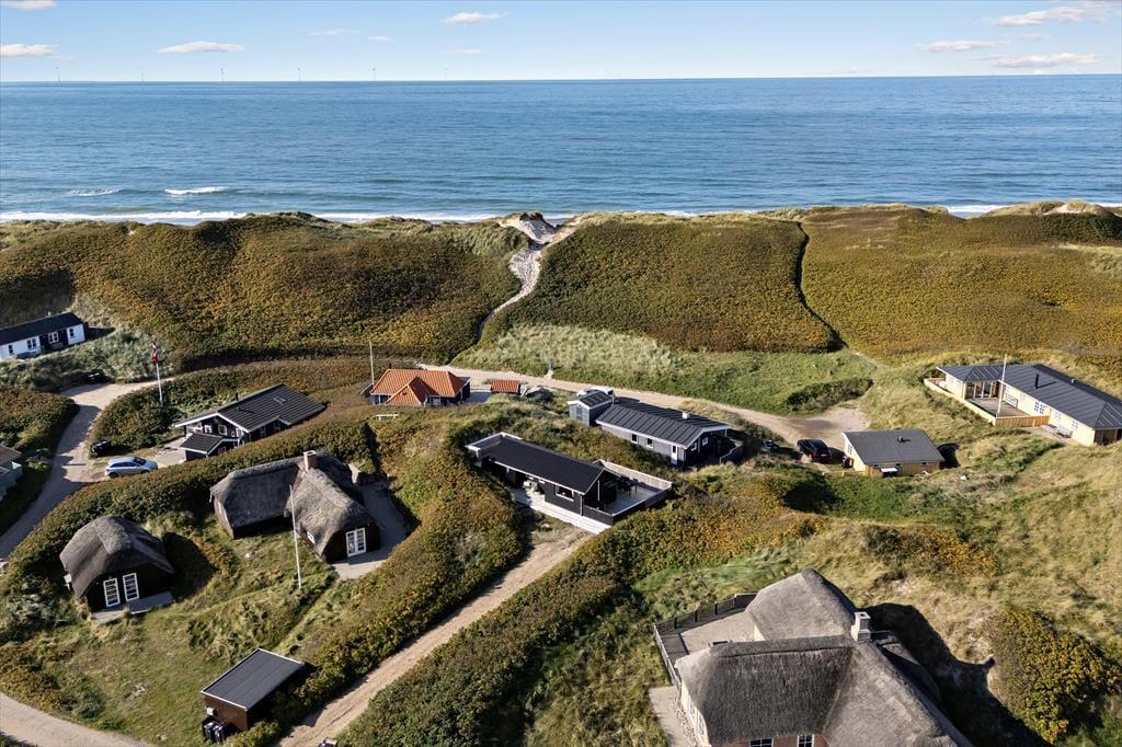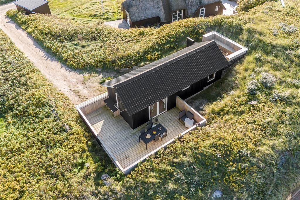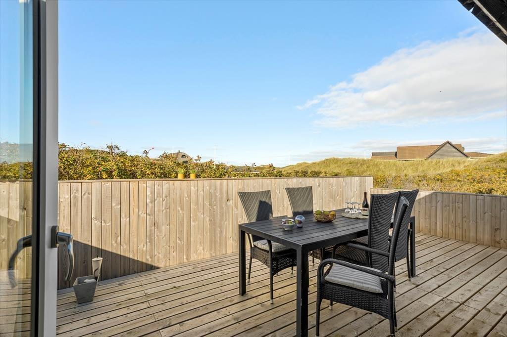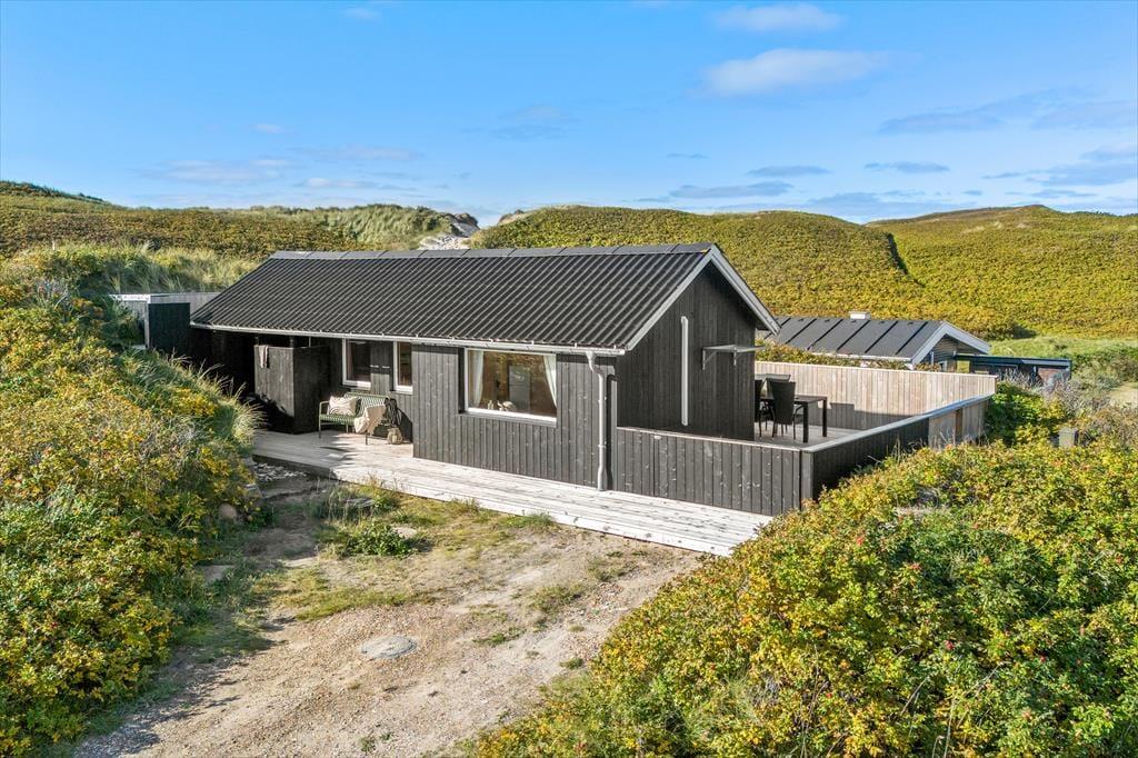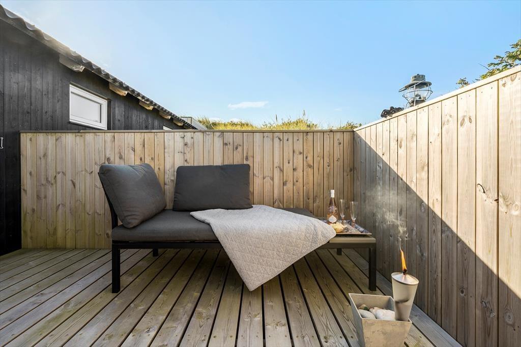 Udenfor finder du to dejlige terrasser, hvorfra du kan nyde udsigten til klitterne, der rejser sig mod himlen. Her kan du lade morgensolen varme dig, mens du nyder dagens første kop kaffe, eller samle familien til måltider under åben himmel. Når dagen er ved at være slut, og solen begynder at gå ned, kan I tage et friskt bad under den udendørs bruser – helt i pagt med naturen. Den korte afstand til havet gør det nemt at tage en tur ned til stranden, hvor børnene kan bygge sandslotte, og de voksne kan slentre barfodet i vandkanten.