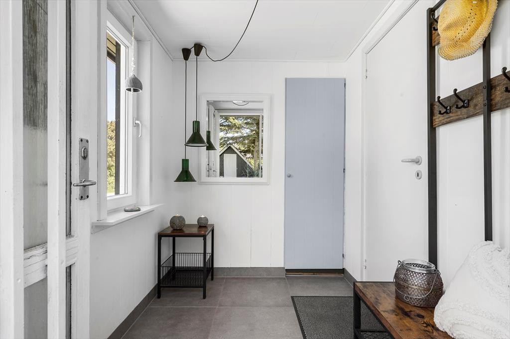 Sommerhuset ligger i rolige omgivelser på en lukket vej, og gennem stuevinduerne kan du ikke bare se ud på naturgrunden, men også videre ud over det åbne marklandskab. Inden døre er indretningen holdt i primært neddæmpede og lyse farvetoner. Møblementet er kønt og komfortabelt, for det skal selvfølgelig være rart, når du læner dig tilbage i stuen med en spændende roman eller en sjov film på fladskærms-tv’et. Spisekrogen med bænke og stole er et hyggeligt sted at samles for hele familien – og den er smart placeret lige ved køkkenet, så du kan sagtens fortsætte hyggesnakken, hvis du skal hen for at brygge mere kaffe eller spejle endnu et æg til brunchen.