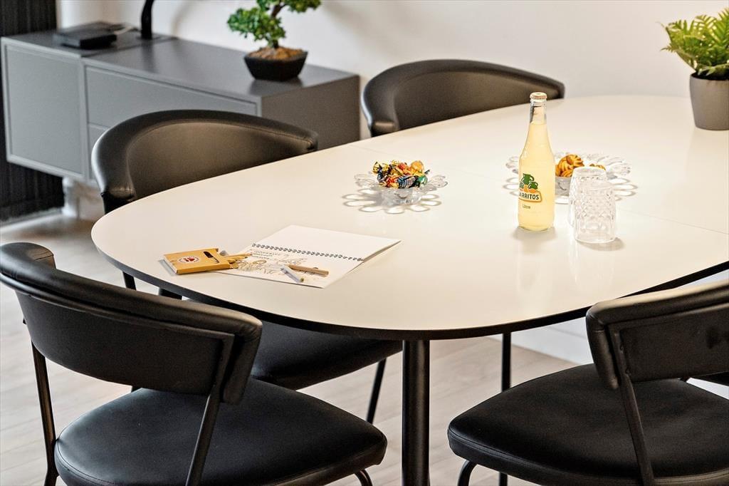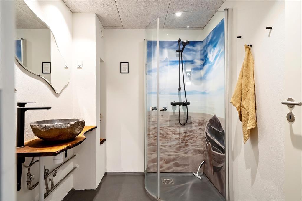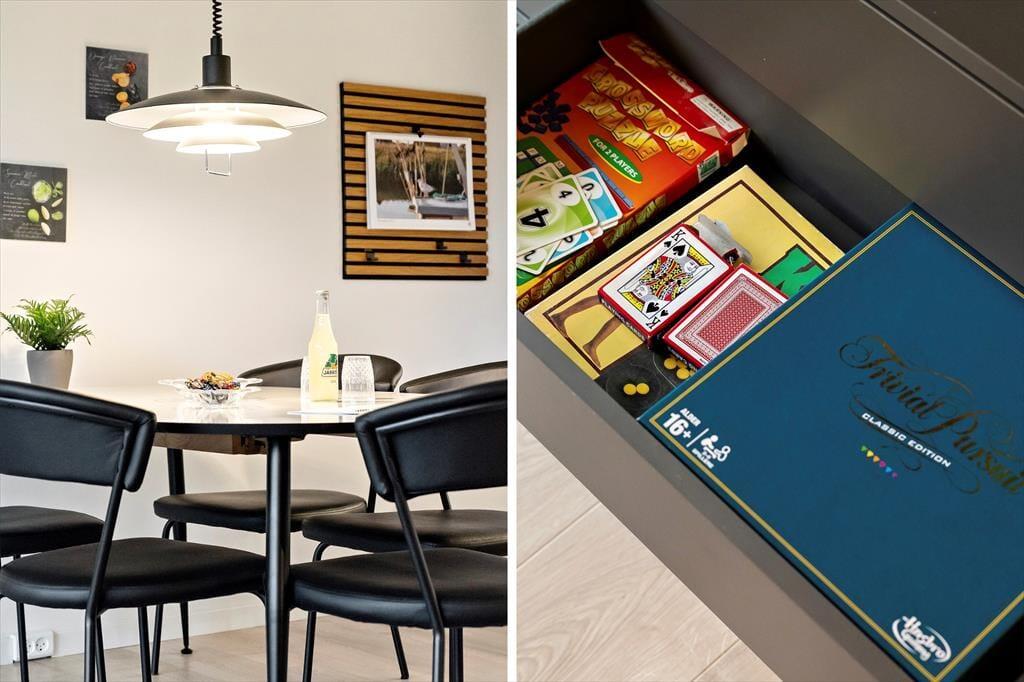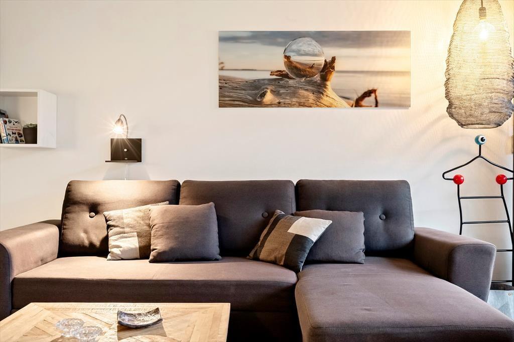 Når du træder indenfor i ferielejligheden, mærker du straks følelsen af ferie roligt sænke sig. Indretningen er lys, enkel og indbydende, og der er skabt et miljø, hvor du hurtigt føler dig hjemme. Stuen er lejlighedens naturlige samlingspunkt med en rummelig dobbelt sovesofa, som gør det nemt at skabe ekstra soveplads til børnene. Vi oplever, at vores gæster sætter stor pris på den fleksibilitet – især når dagen har været lang, og alle bare gerne vil slappe af med en film eller et brætspil.