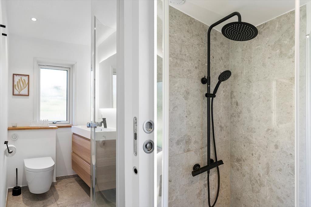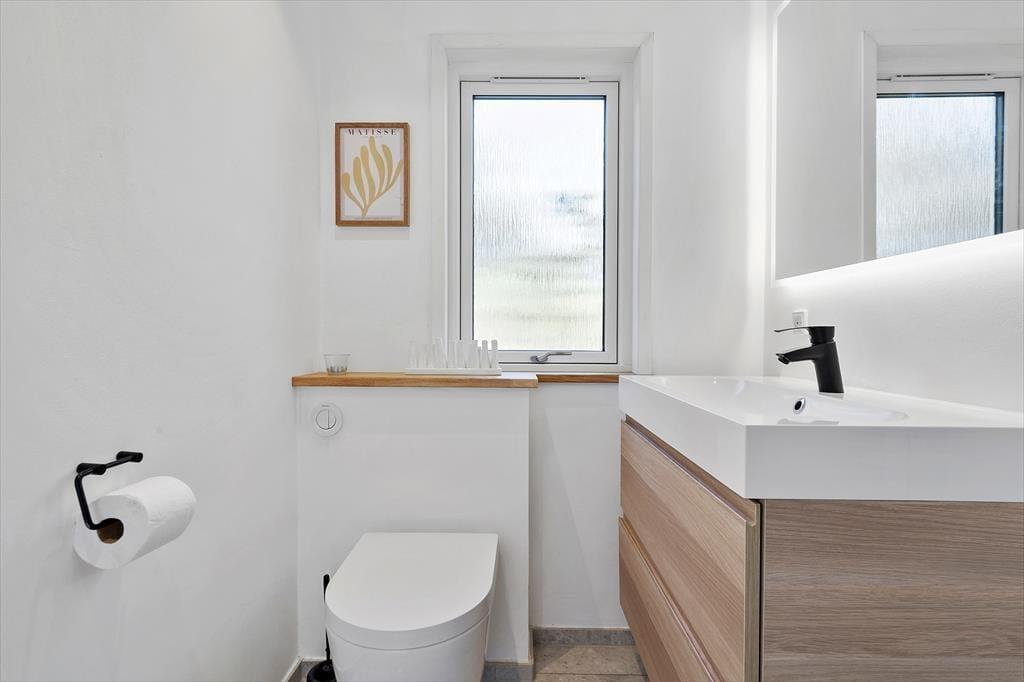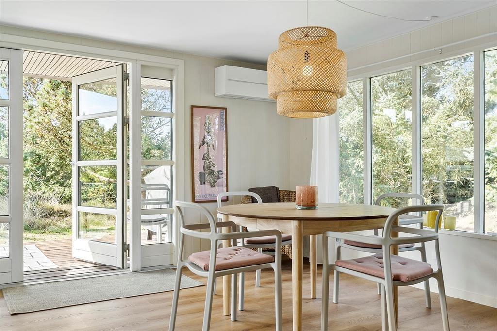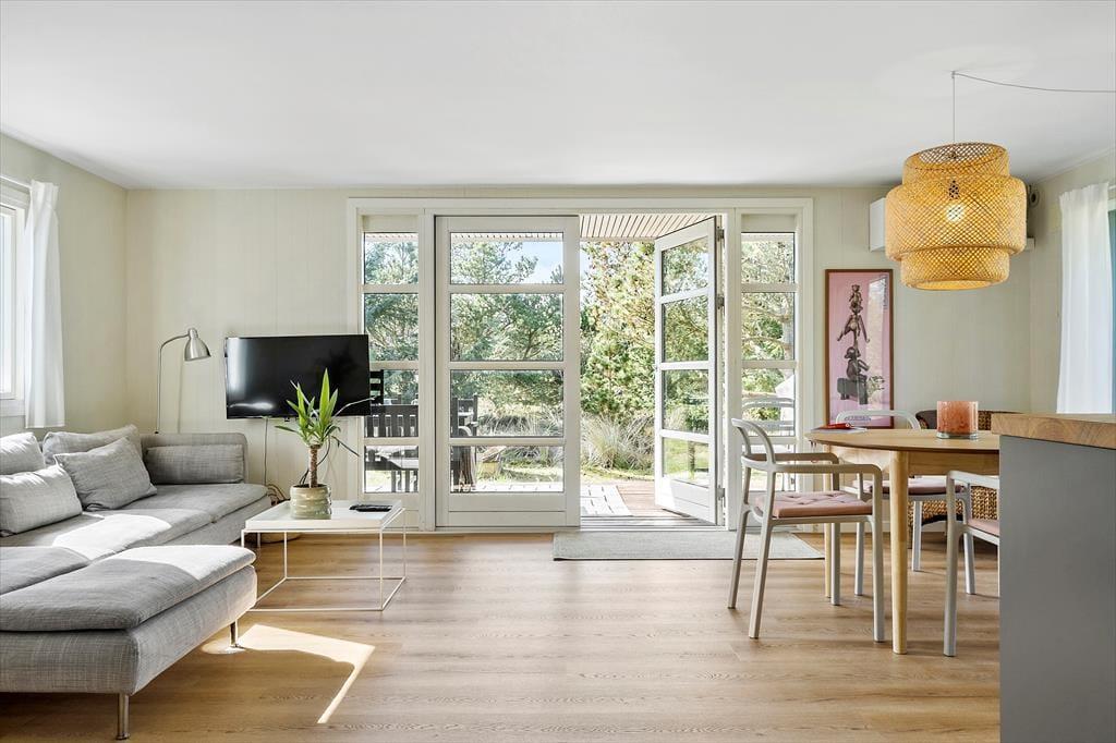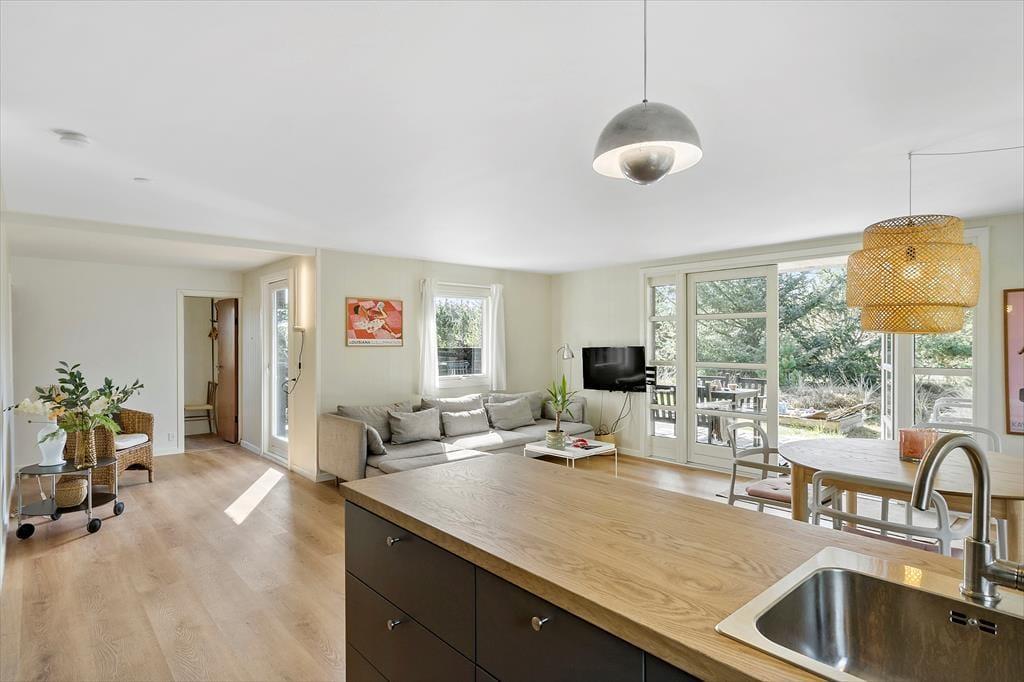 I kan glæde jer til at indtage en skøn feriebolig, hvor det ydre emmer af klassisk sommerhuscharme, mens det indre er lyst og indbydende. Ferieboligens tre hyggelige soveværelser giver sengepladser til fem personer, og badeværelset er lækkert og moderne indrettet med bruseniche og væghængt toilet. Foruden en entré med god plads til vandrestøvler, vinterjakker og sommersandaler består resten af huset af et åbent opholdsrum, hvor køkken og stue glider i ét. Køkkenet er ligesom resten af rummet holdt i lyse nuancer, og store vinduespartier giver et skønt lysindfald og trækker naturens farver ind. Madlavningen går som en leg i det velindrettede køkken, og retterne serveres let ved spisebordet. Tv og wi-fi sikrer underholdningen, og mens I slapper af i sofaerne, sørger varmepumpen for en behagelig temperatur.