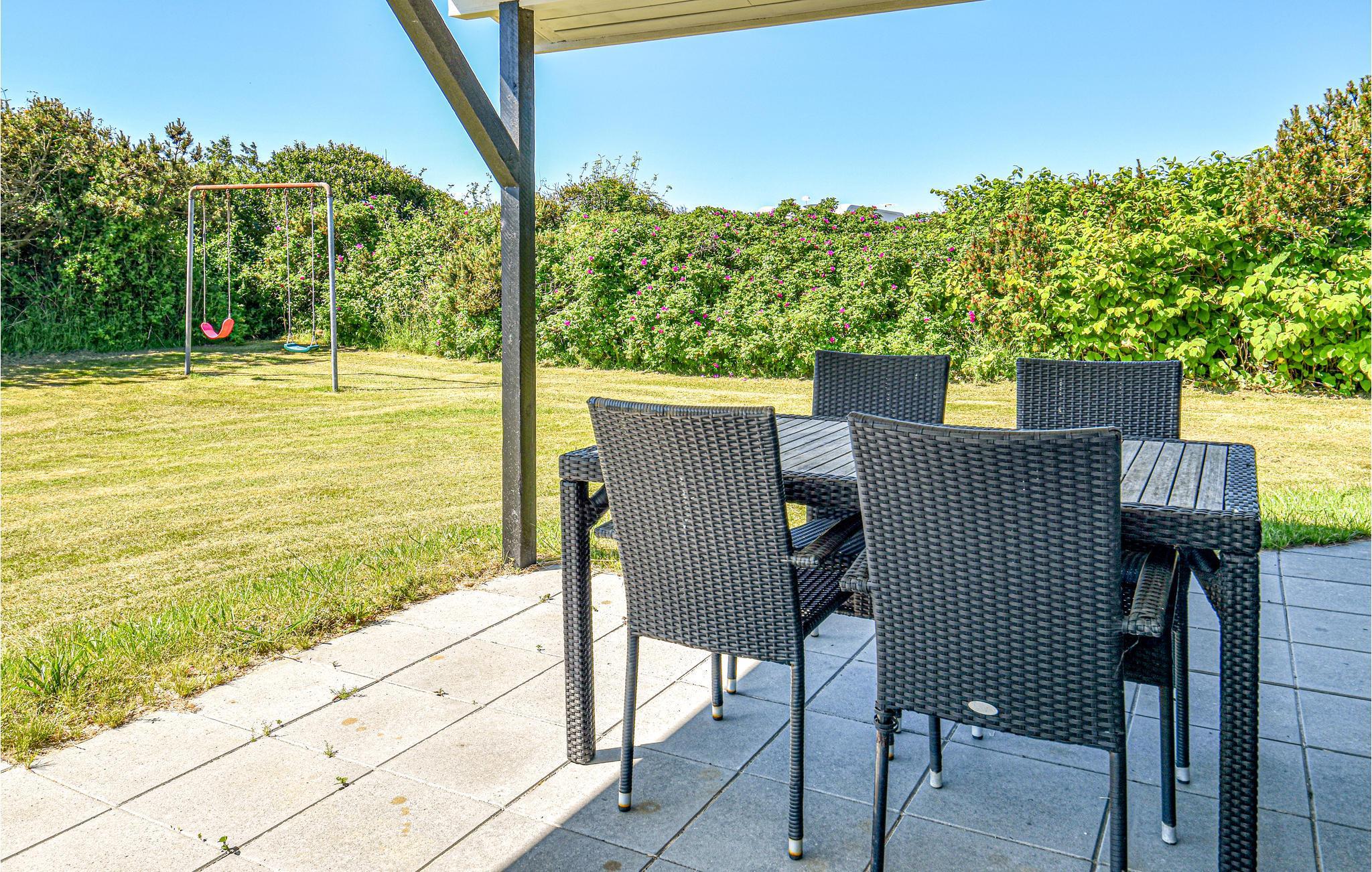 I hjertet af Søndervig ligger dette nydelige sommerhus med en stor skøn terrasse og udsigt til klitter. Huset har en stor lys stue med sofagruppe, fladskærms-tv og udgang til terrassen. I forbindelse med stuen ligger spiseafdelingen med køkken. Mod øst i huset er der soveværelser med gode senge og det samme mod vest. På den store grund er der god mulighed for boldspil og plads til leg. Glem alt om madlavning og kast jer ud i en sjov kamp med børnene, og I kan i stedet spise på en af byens mange restauranter, og forkæle jer selv med en stor is til dessert.