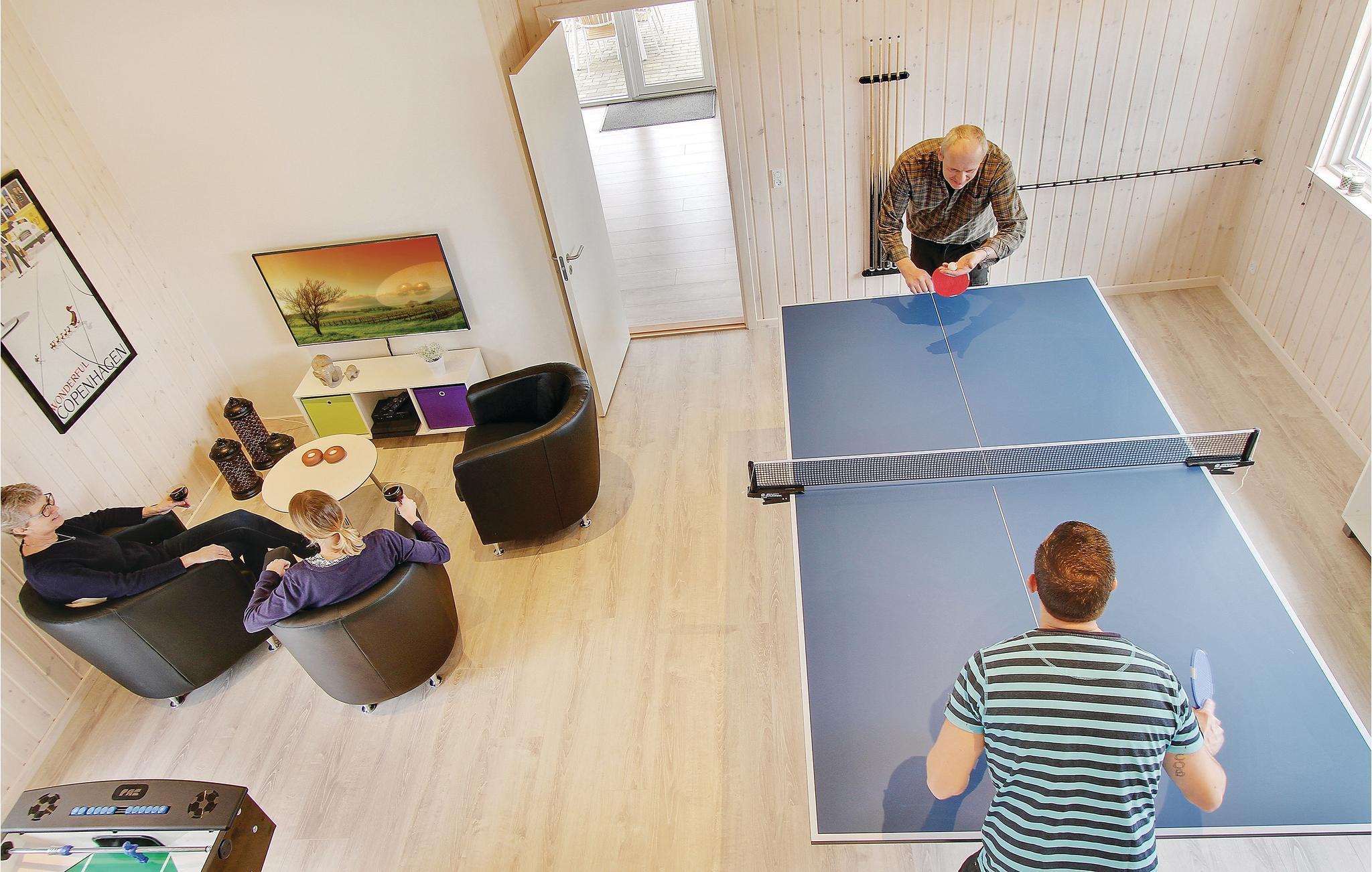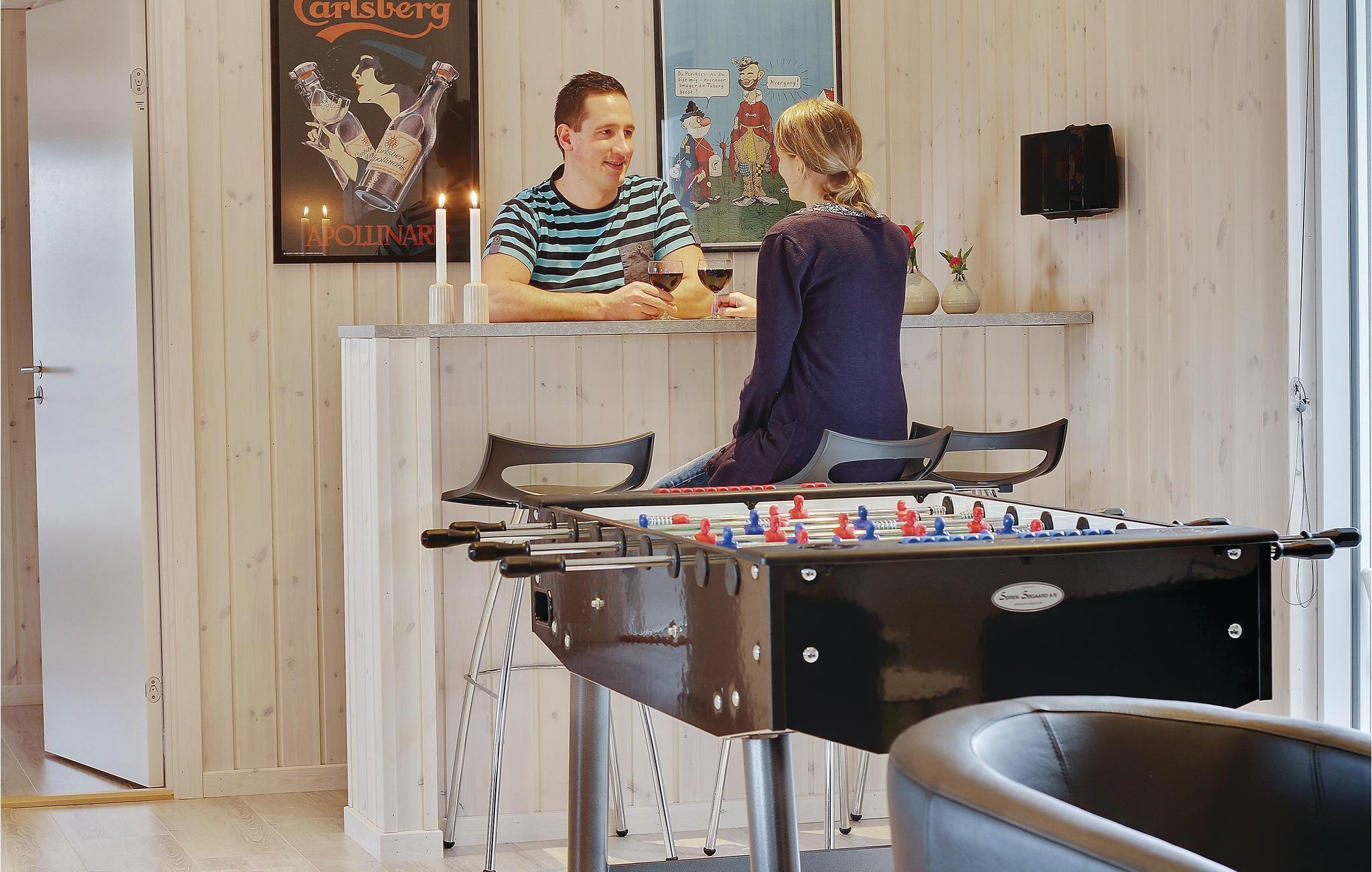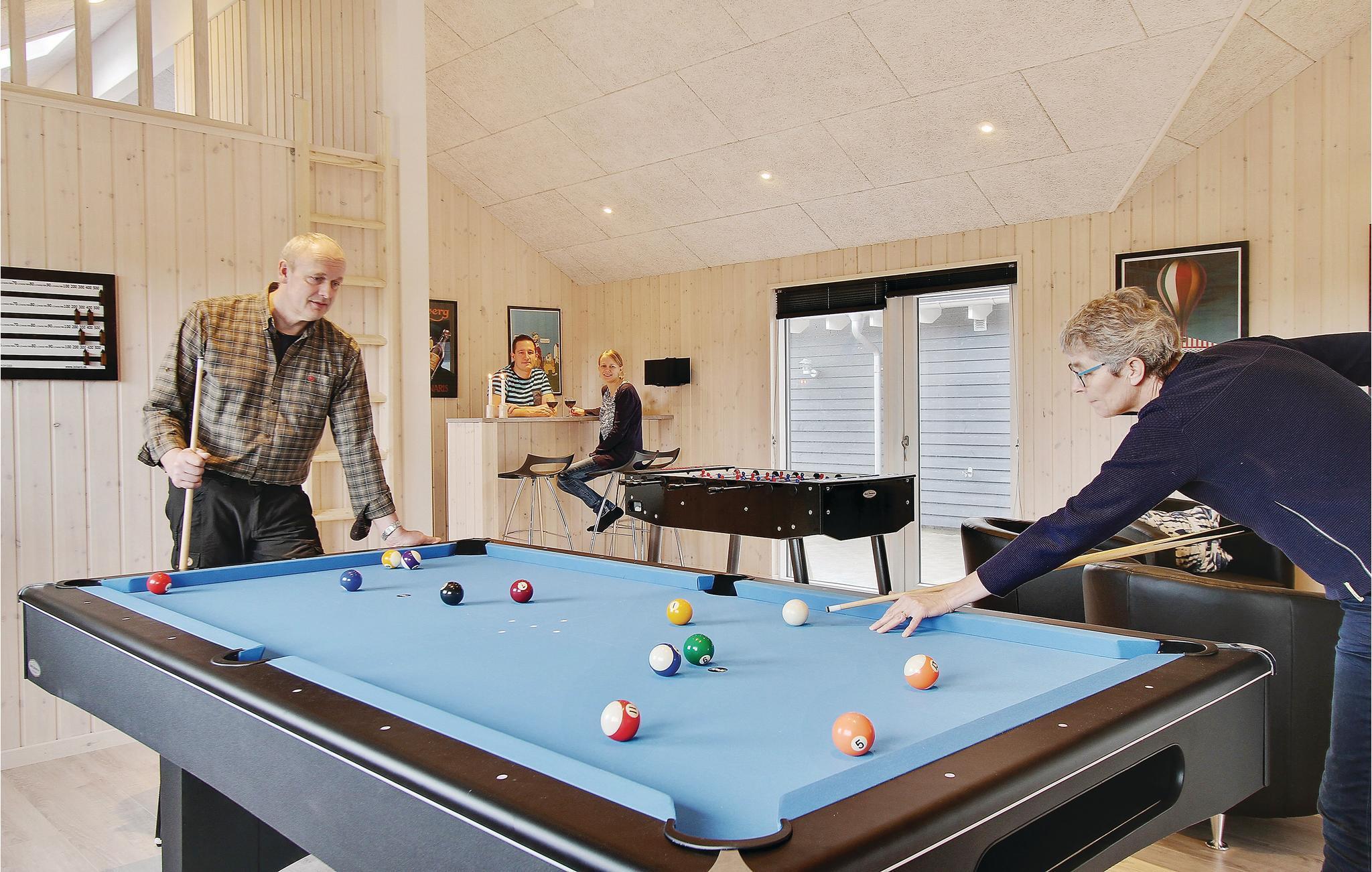 Nær feriebyen Søndervigs mange muligheder og skønne strand ligger dette pragtfulde poolhus, der med sine mange aktivitetsmuligheder er de perfekte rammer for en succesfuld ferie året rundt. Huset byder på al tænkelig komfort, og er bygget op omkring to soveafdelinger med hvert sit badeværelse, hvilket gør det meget velegnet til flere familier, som ønsker at holde ferie sammen. De to store hemse, med plads til 4 personer, vil helt sikkert være et hit hos børnene. Huset er udstyret med lydisolerende lofter, hvilket gør det meget behageligt at færdes i huset. Der er lagt stor vægt på luksus - her tænkes specielt på husets imponerende poolafdeling, som indeholder stor pool med vandrutsjebane og et dejligt fire personers spabad samt en stor sauna. I det store aktivitetsrum kan der spilles både billard/bordtennis, dart, bordfodbold, PS3 og Wii. I baren er der rig mulighed for at mikse spændende drinks, eller servere kolde øl og sodavand fra barens køleskab. Køkkenet er særdeles velindrettet og udstyret med to komfurer og to opvaskemaskiner samt to kølefryseskabe, så der uden problemer kan være mange kokke og køkkenskrivere om den fælles madlavning. Den danske sommer kan nydes på den delvist overdækkede terrasse, mens børnene gynger og leger i sandkassen.