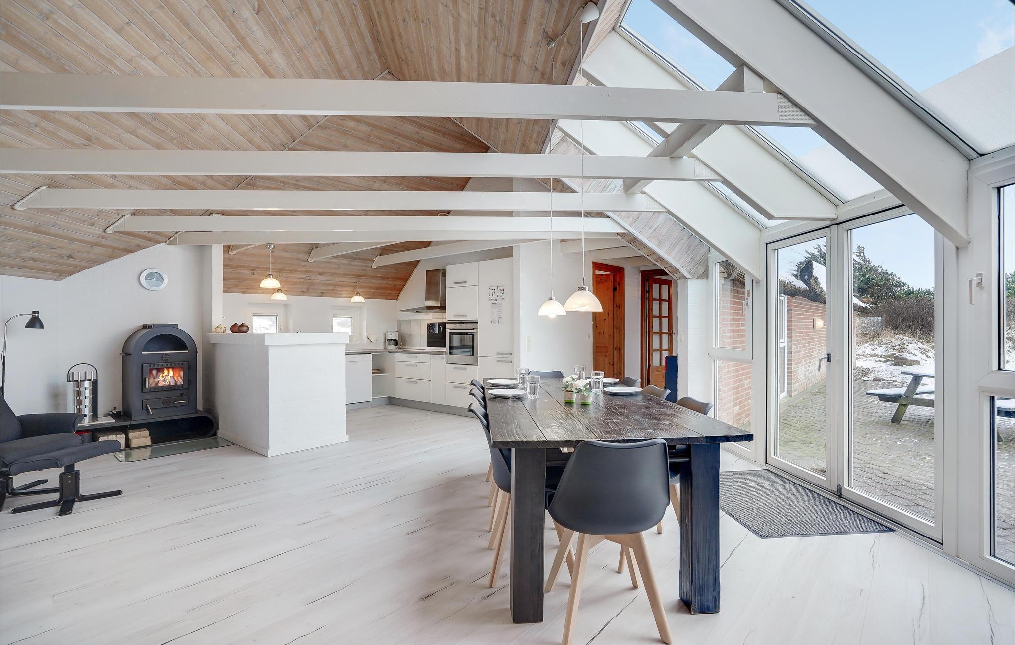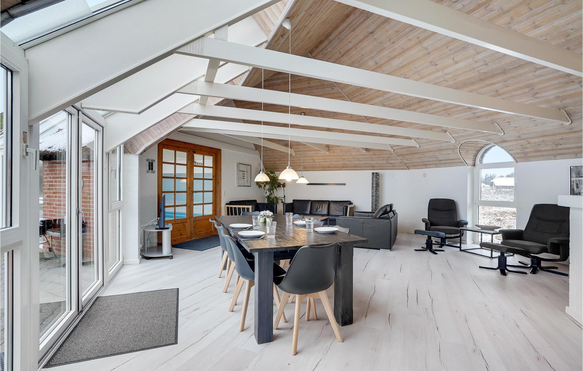 Huset er blevet gennemrenoveret i 2020 og byder jer velkommen med store lyse rum og moderne indretning. Her kan familien samles om brætspil og hygge i opholdsstuen og nyde feriens måltider ved det lange spisebord, hvorfra I har en smuk udsigt til de grønne omgivelser. De mange store vinduespartier sørger for masser af naturligt lys, og fra spise- og opholdsstuen har I adgang til det indendørs wellnessområde med den 18 m2 store pool og spabadet til 2 personer. Her kan I få mange timer til at gå med sjov og afslapning for hele familien.