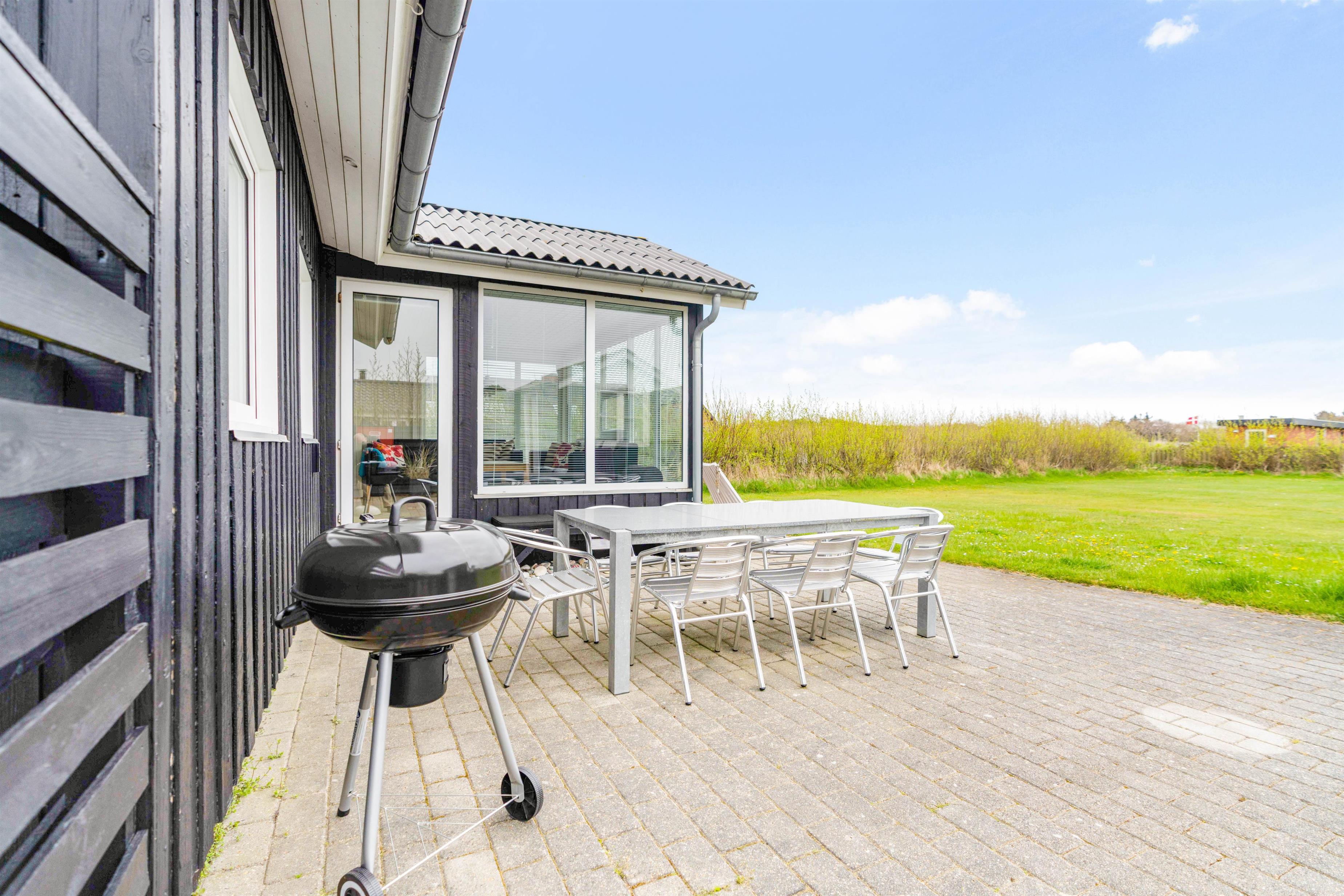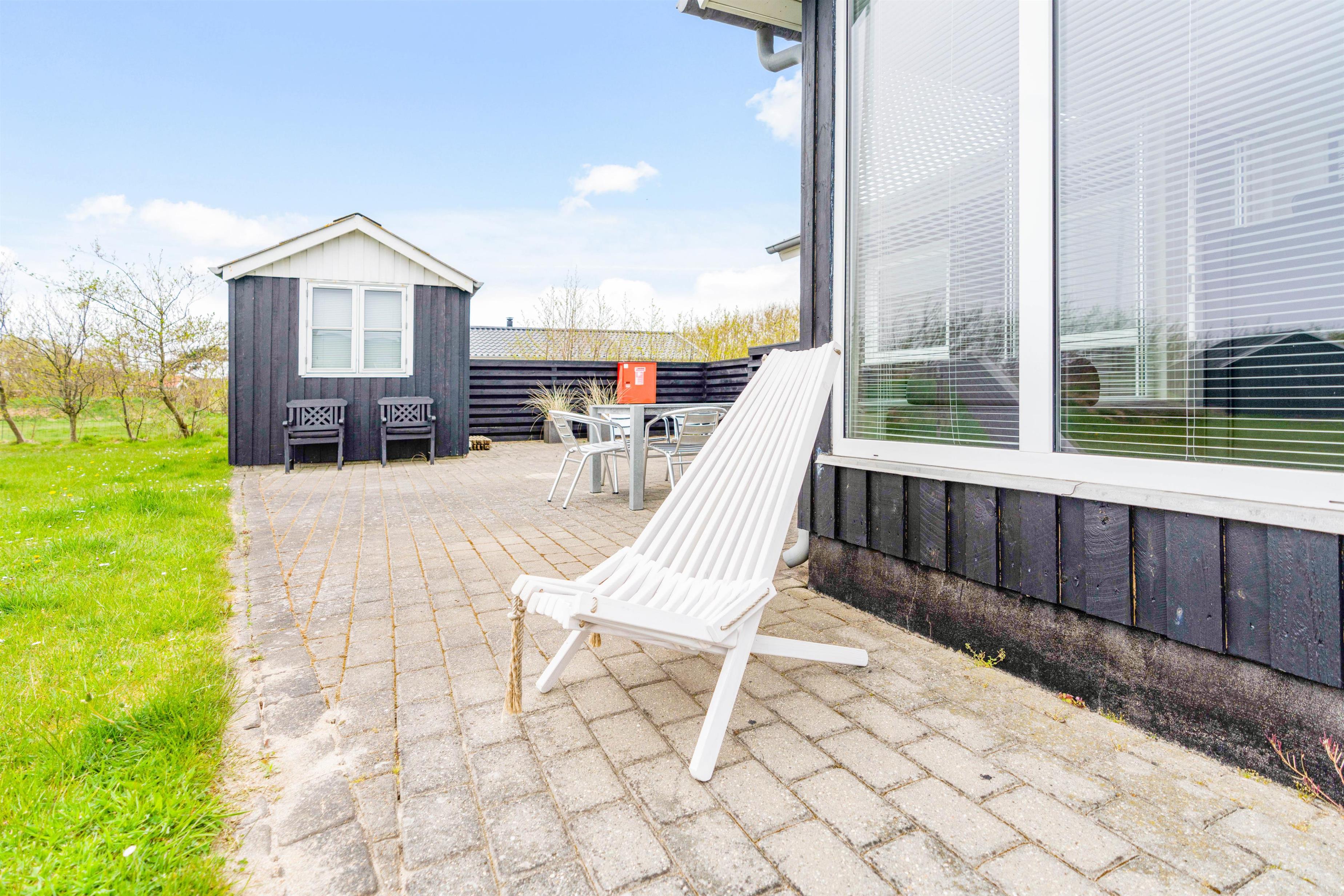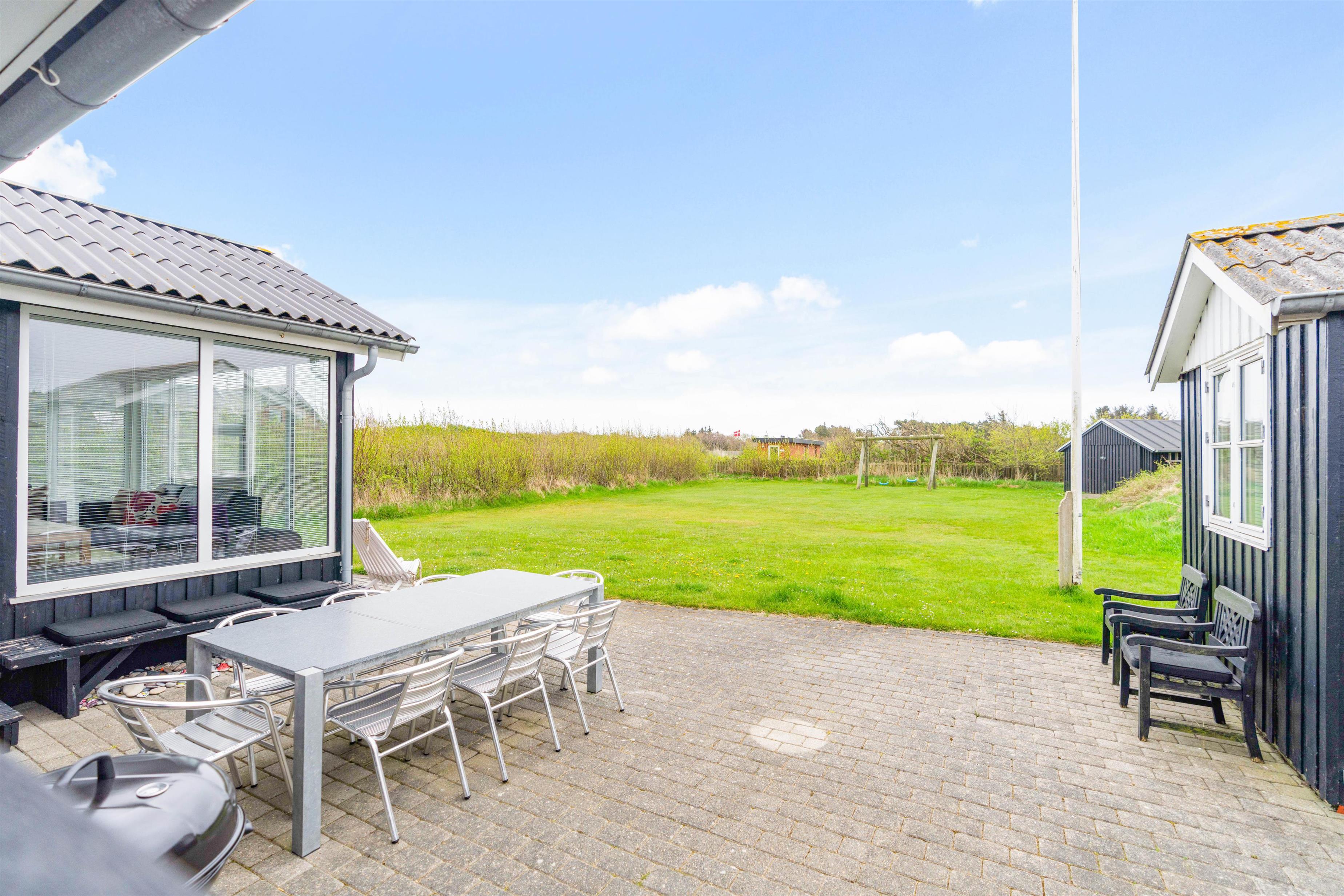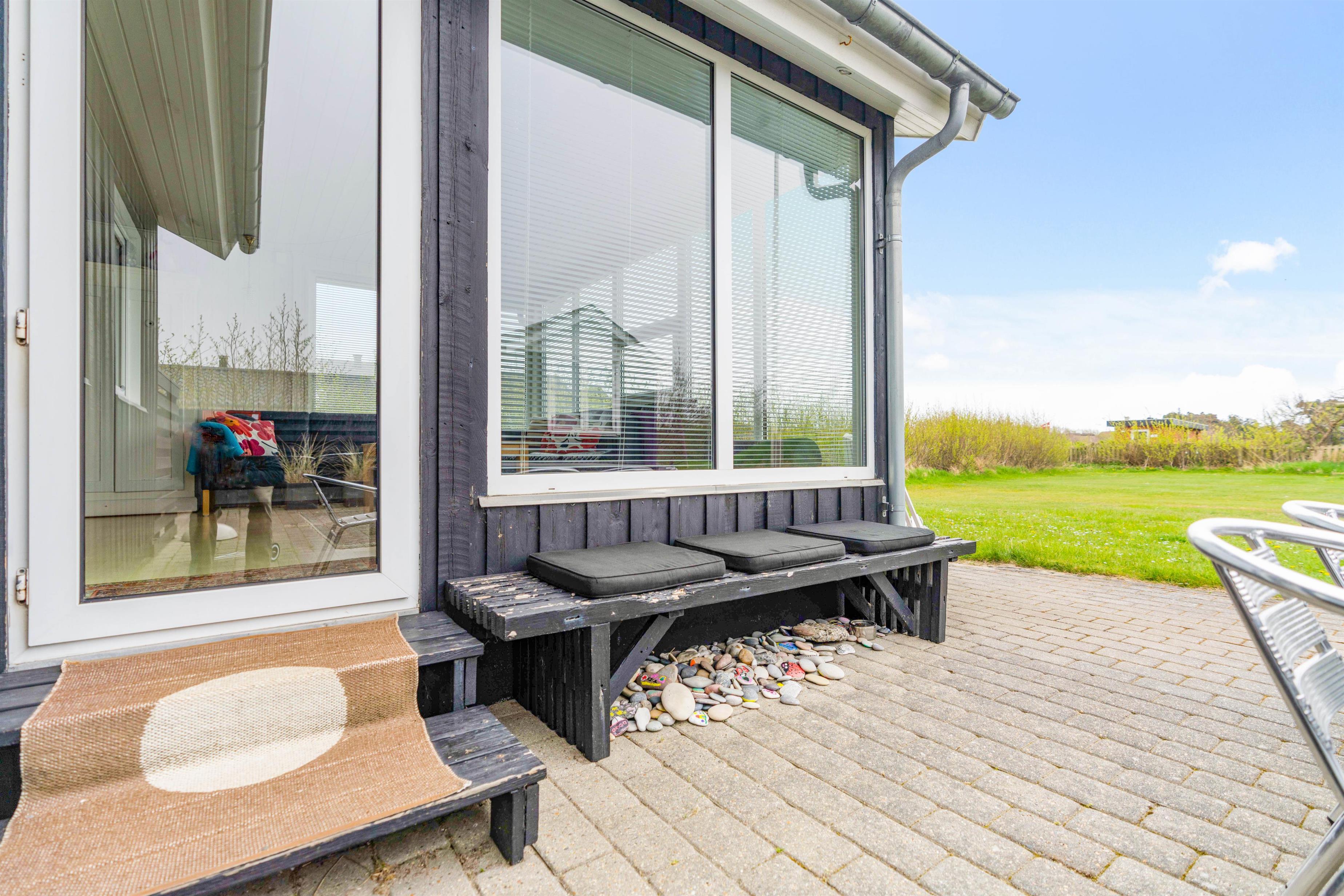 Fra sommerhusets alrum kan I træde direkte ud på den skønne, sydvendte terrasse, der inviterer til mange timer i den friske luft. Sæt jer godt til rette i havemøbler og liggestole og bare slap af. Til aften kan I tænde op i grillen til aftenens grillmiddag. I den dejlige have kan hunde og børn lege i timevis – og til børnene er der også et gyngestativ.