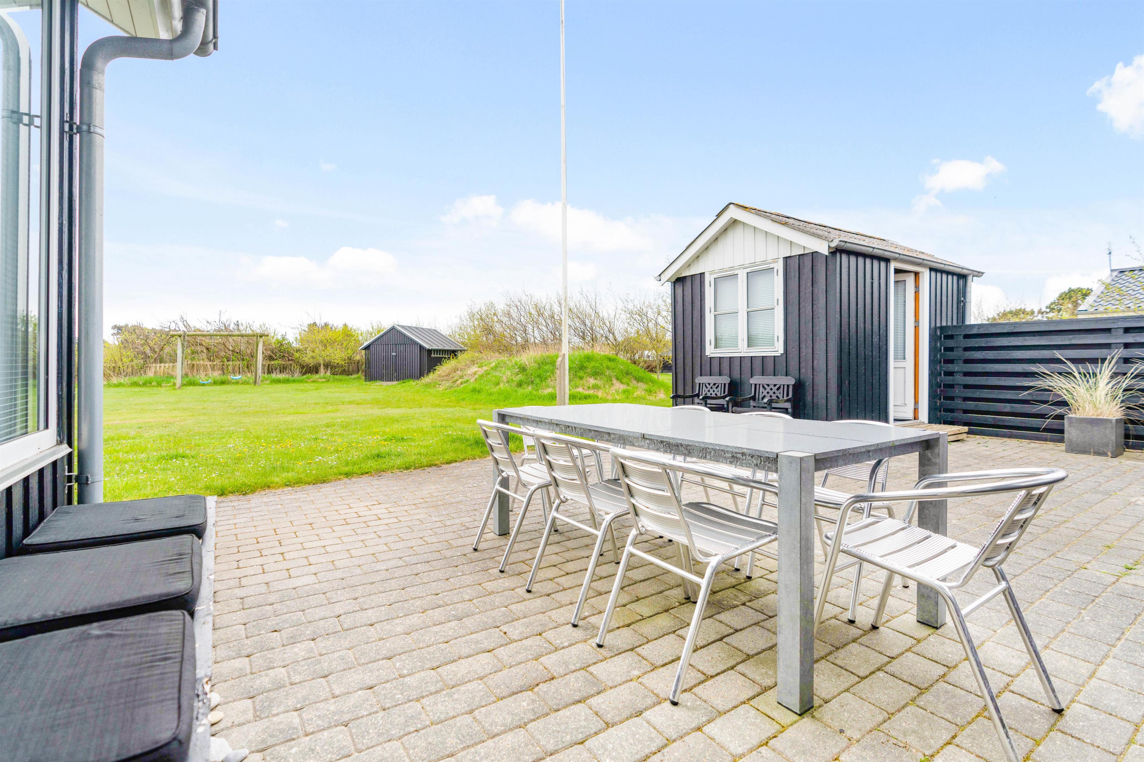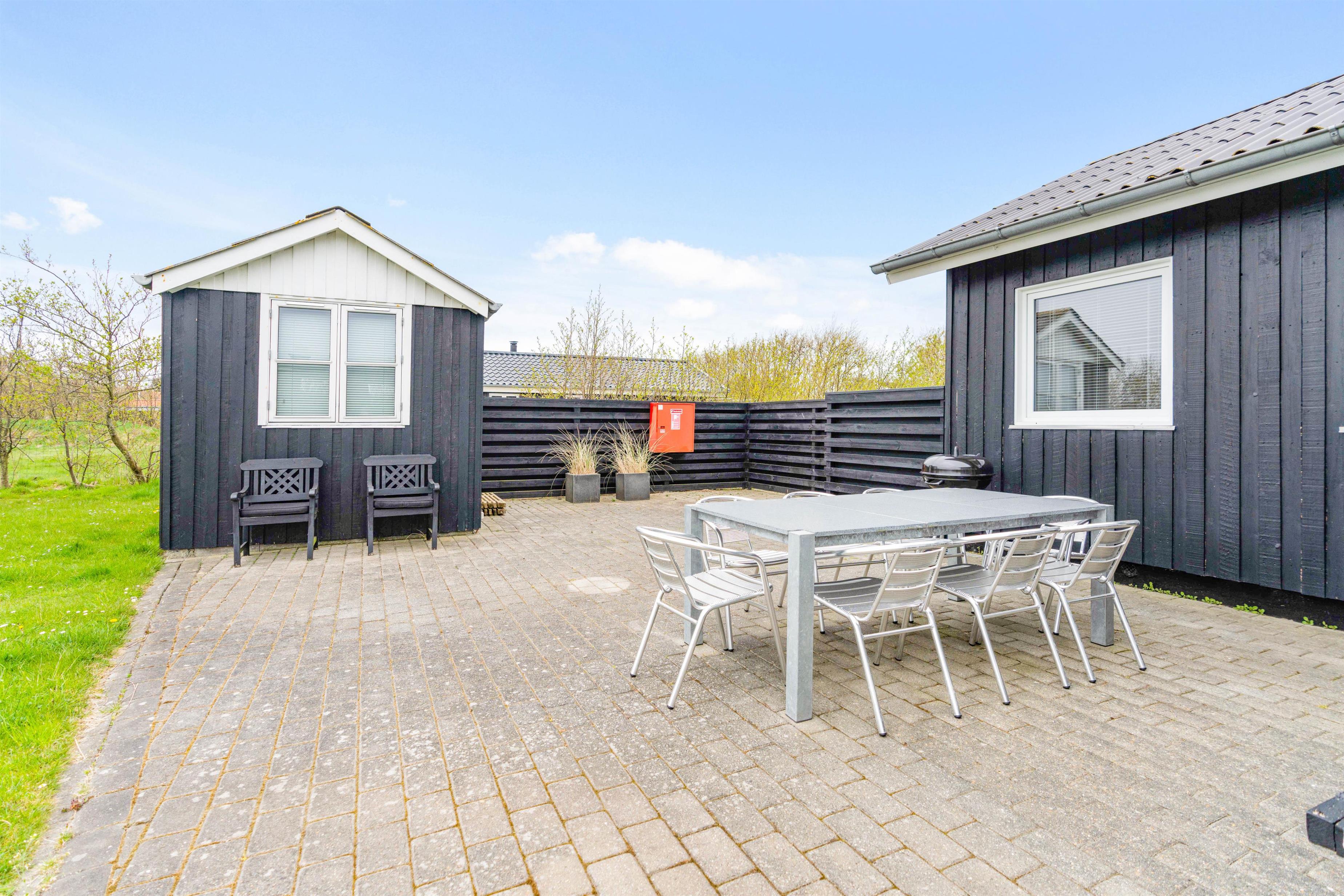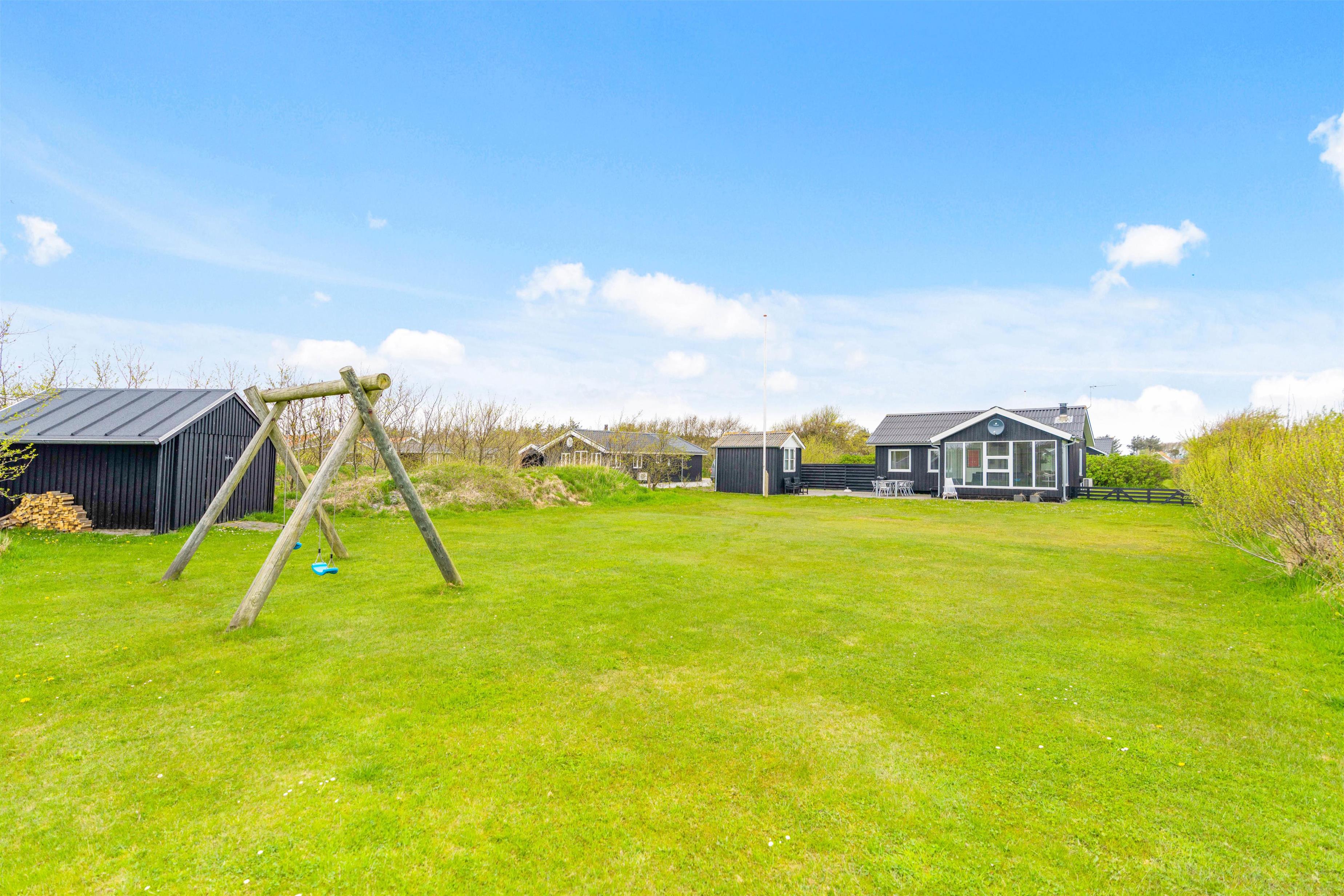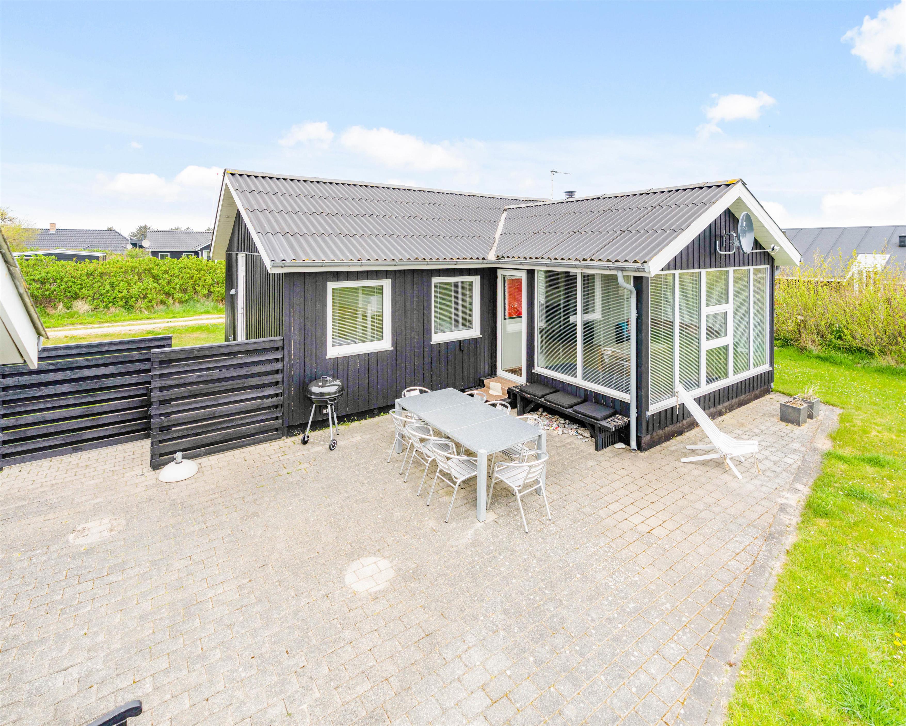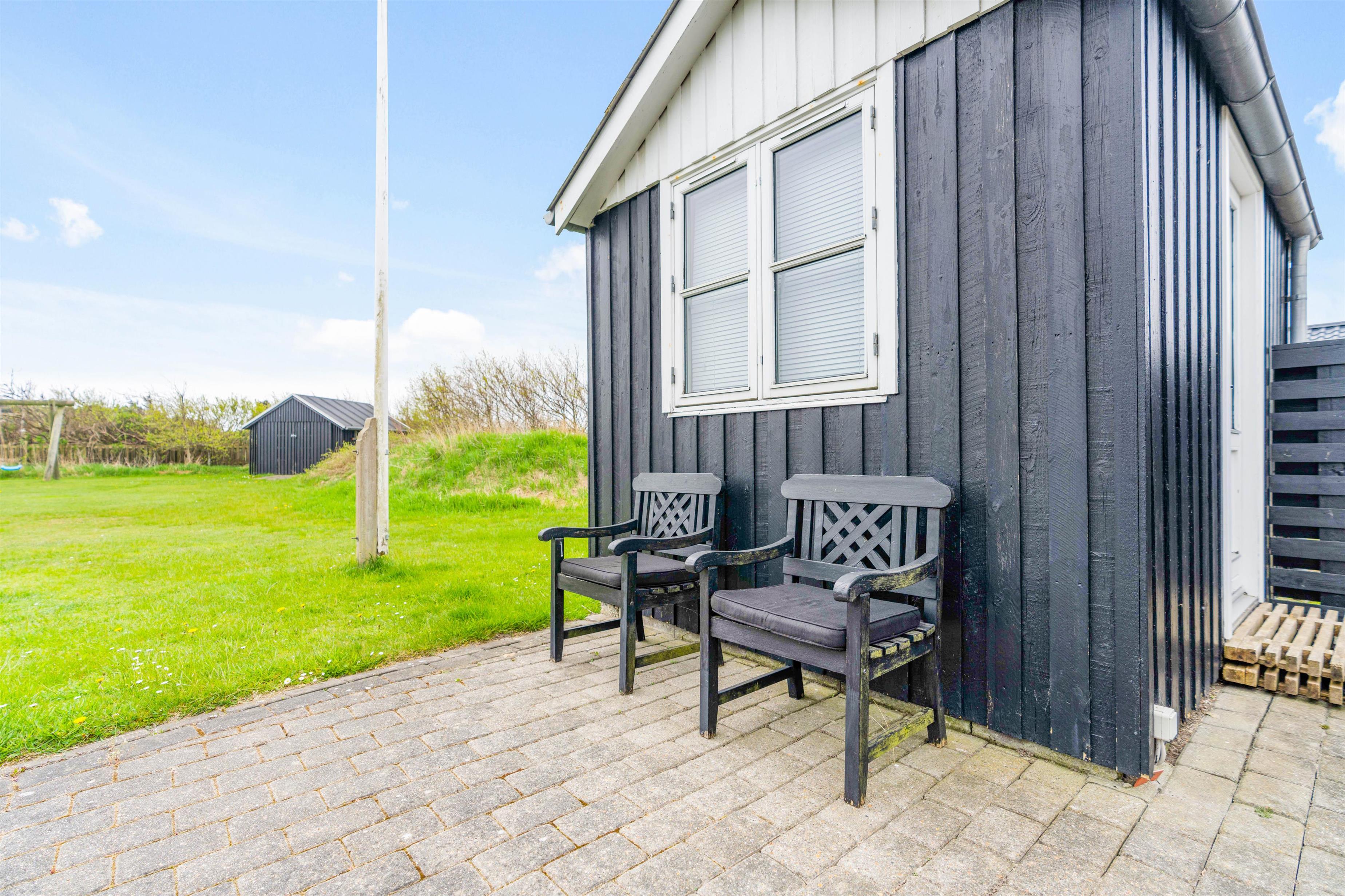 Fra sommerhusets alrum kan I træde direkte ud på den skønne, sydvendte terrasse, der inviterer til mange timer i den friske luft. Sæt jer godt til rette i havemøbler og liggestole og bare slap af. Til aften kan I tænde op i grillen til aftenens grillmiddag. I den dejlige have kan hunde og børn lege i timevis – og til børnene er der også et gyngestativ.