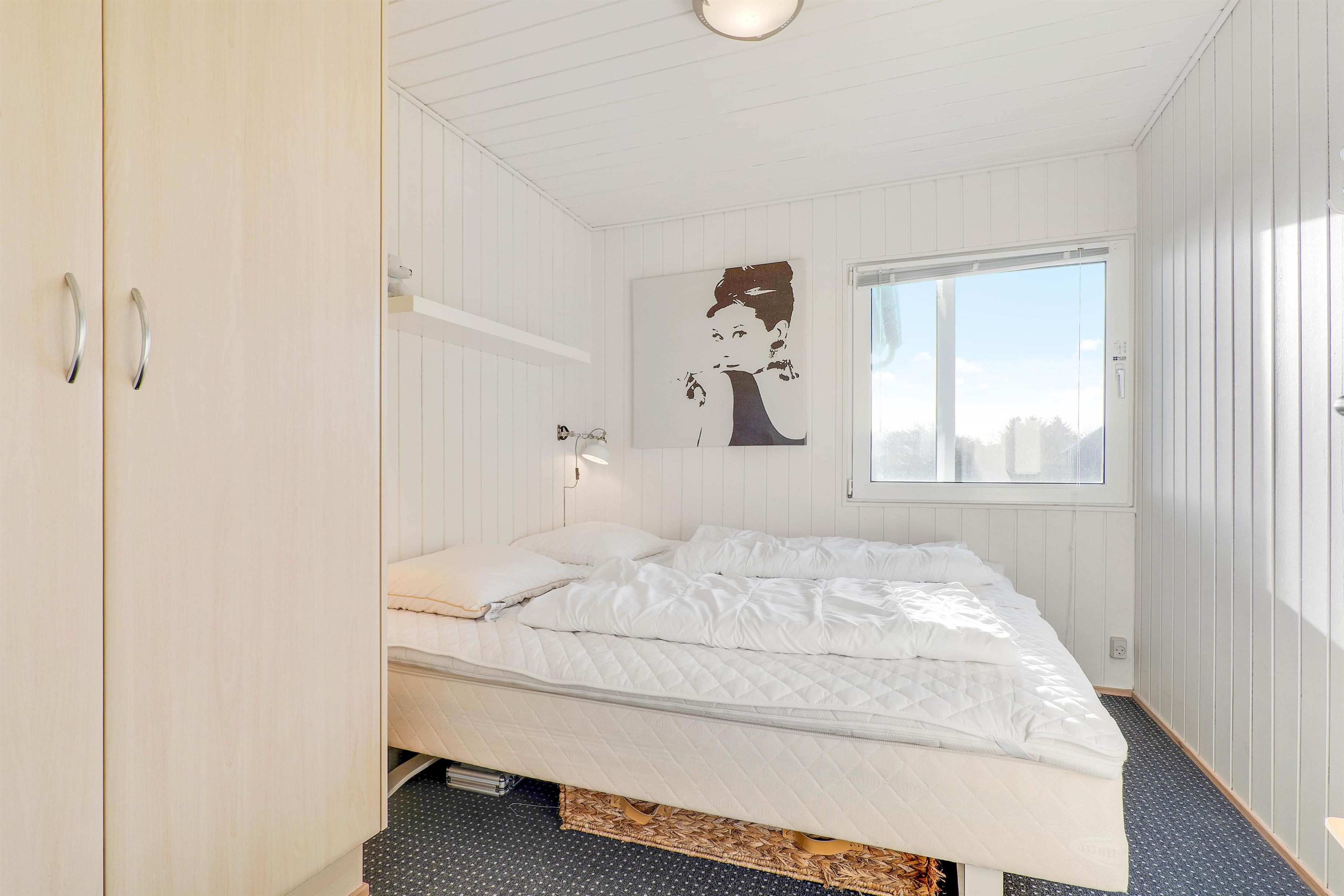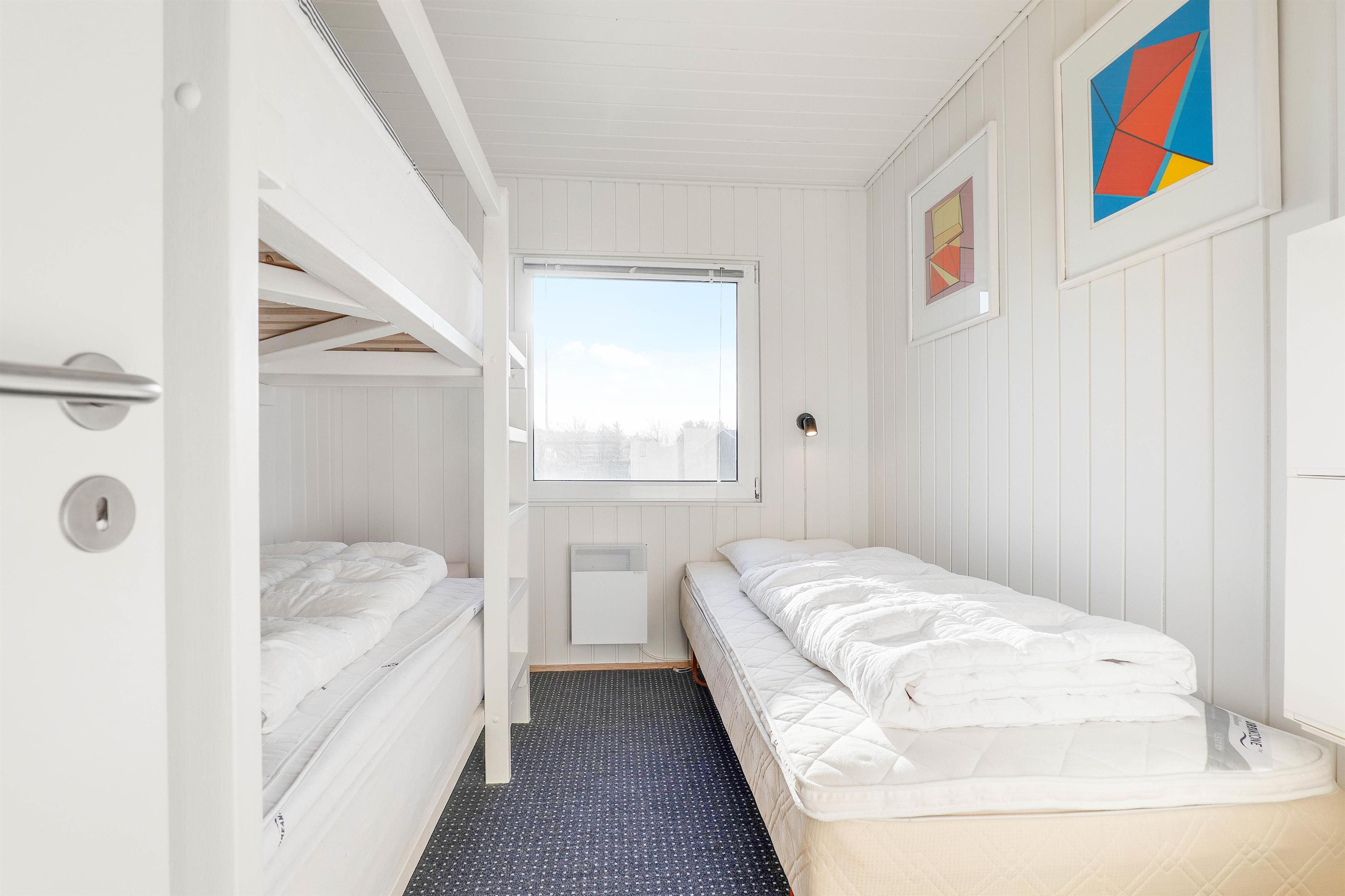 Feriehuset, der er 75 kvadratmeter stort, er indrettet med 2 skønne soveværelser. Det ene er indrettet med en dobbeltseng, og det andet er indrettet med en enkeltseng og en etageseng – det oplagte soveværelse til børnene. Desuden er der 1 badeværelse med gulvvarme i sommerhuset.