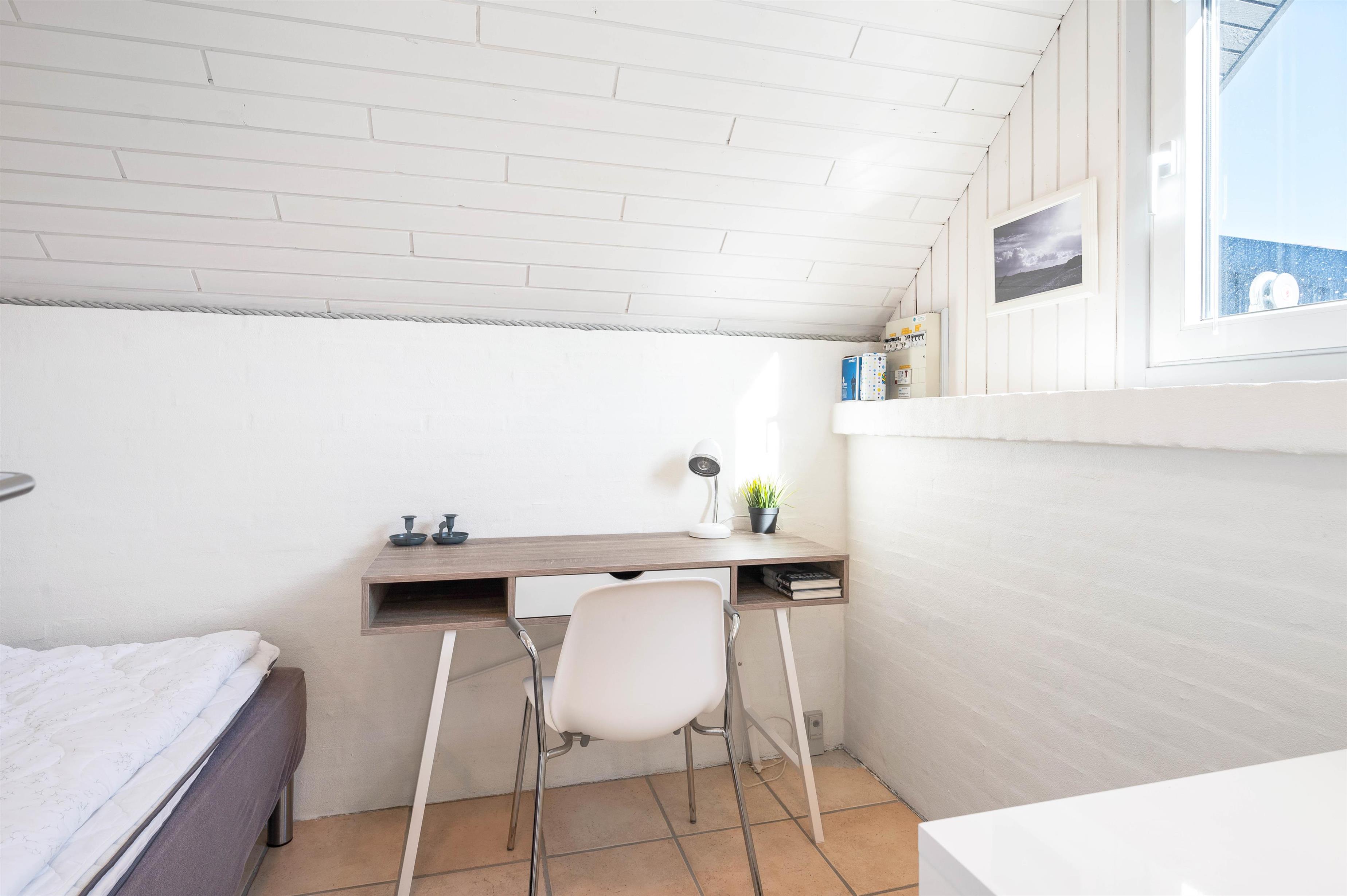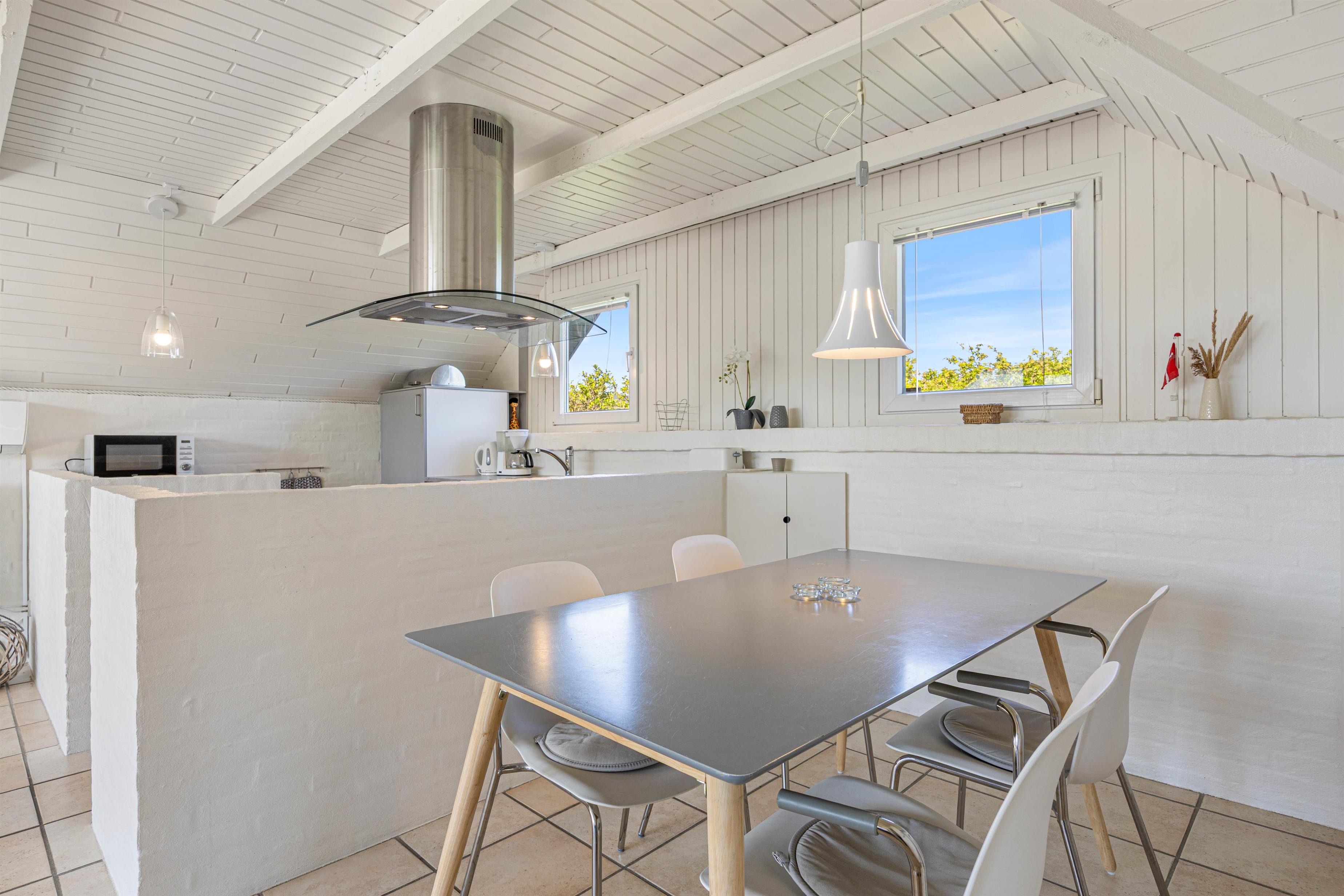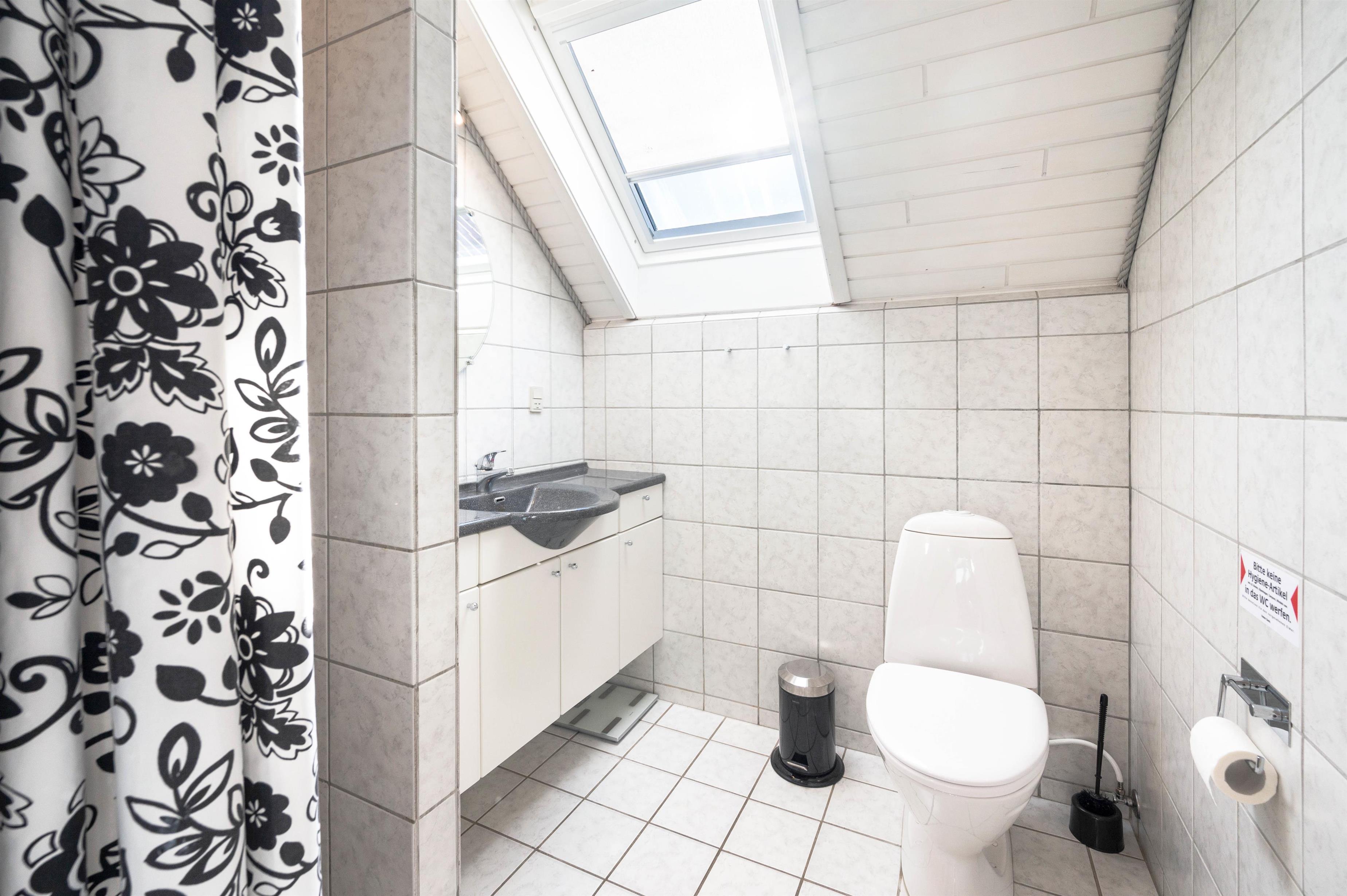 Husets badeværelse har et skønt, naturligt lysindfald gennem ovenlysvinduet. Opholdsrummet ligger i åben forbindelse med det nyrenoverede køkken, som blev moderniseret i 2025. Her kan feriekokken finde alt, hvad der skal bruges for at trylle lækre feriemåltider frem – og der er også god plads til de små hjælpere.