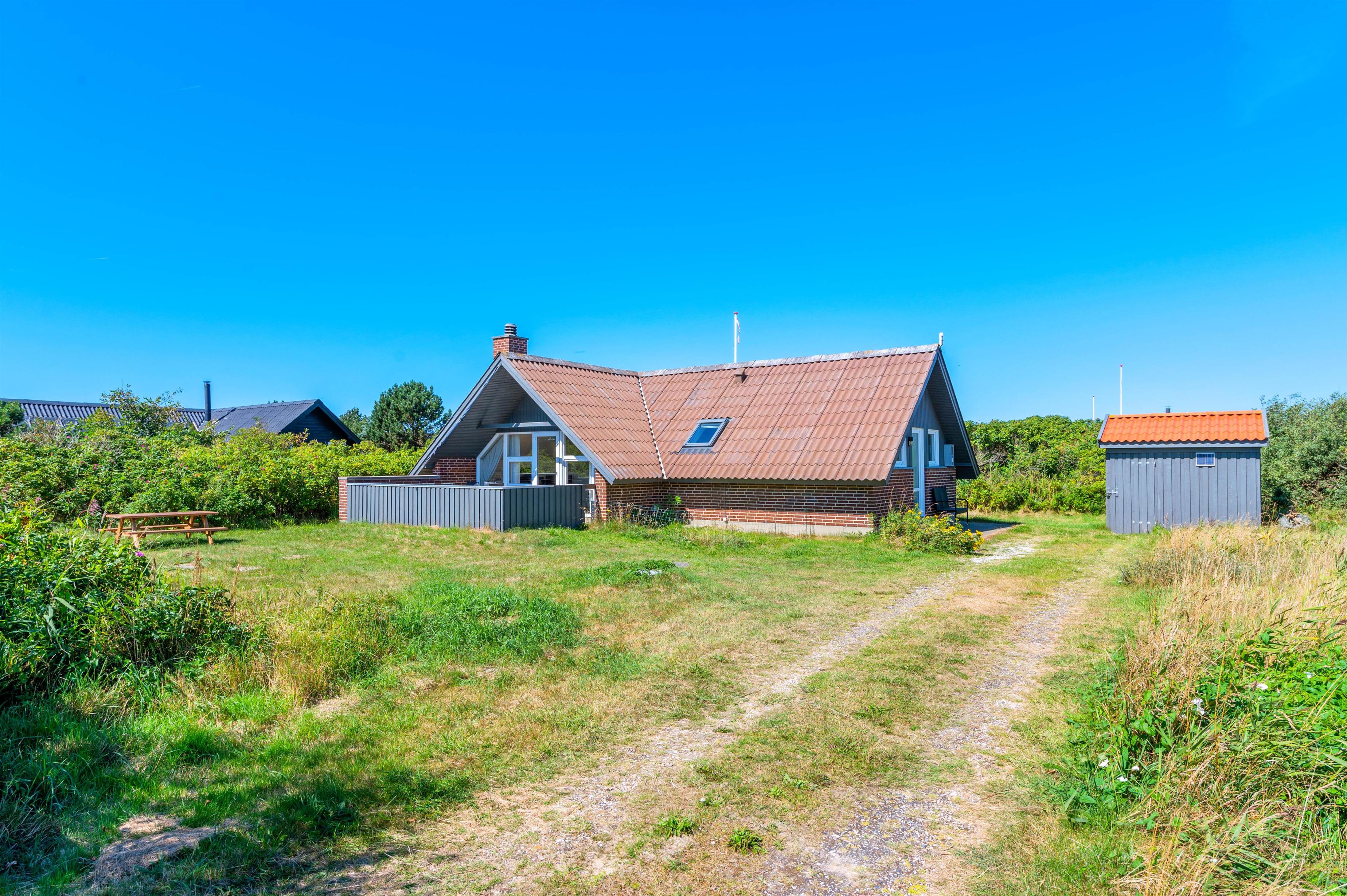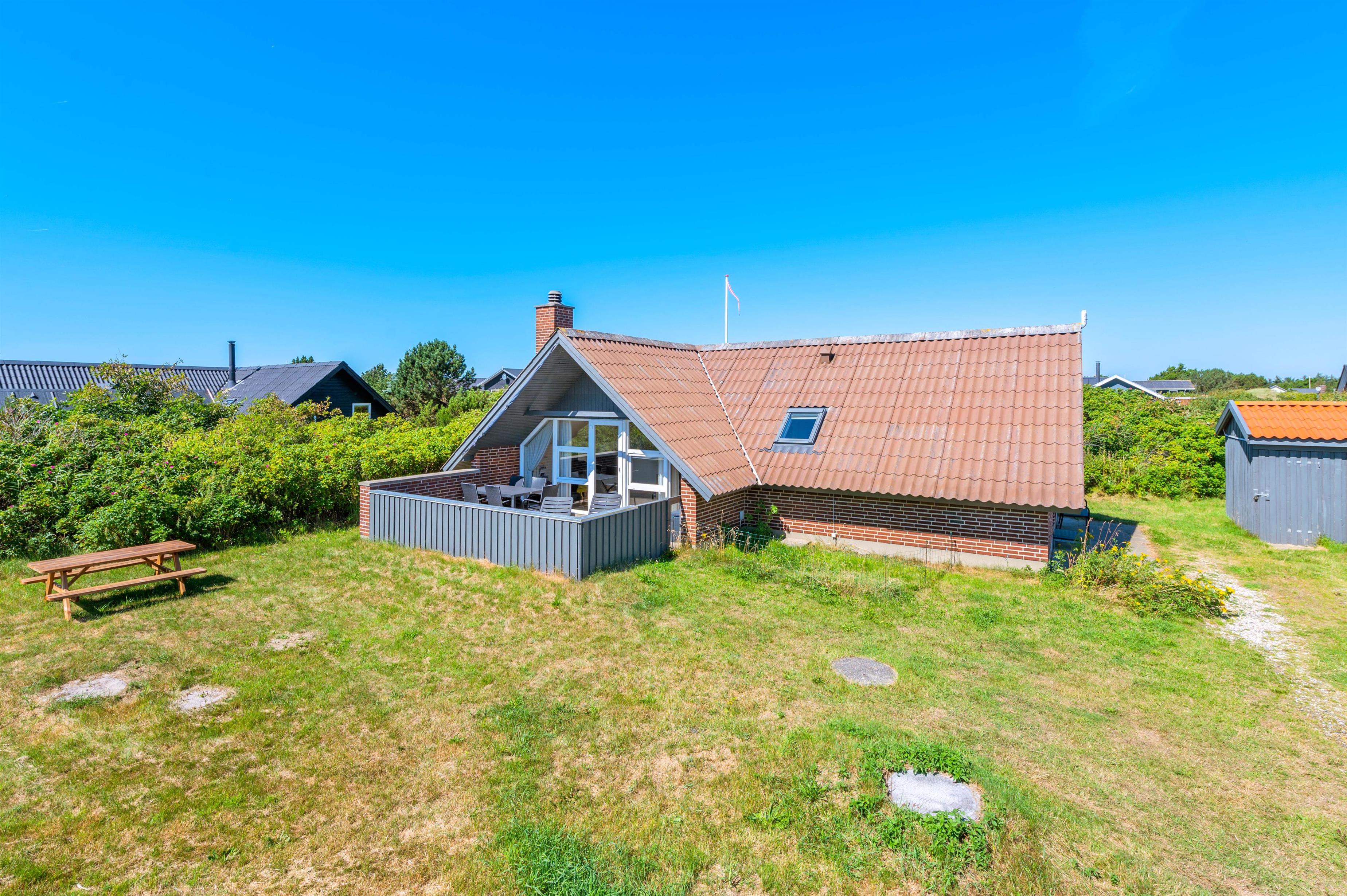 Dette hyggelige sommerhus på 75 kvadratmeter ligger på en stor, naturskøn grund i Søndervig. Her er der plads til 4 personer og 2 hunde. Sommerhuset ligger roligt og ugeneret, omgivet af store hybenbuske, som giver masser af læ og privatliv. Der er gulvvarme i hele huset, så klinkegulvet føles behageligt, nemt og praktisk.